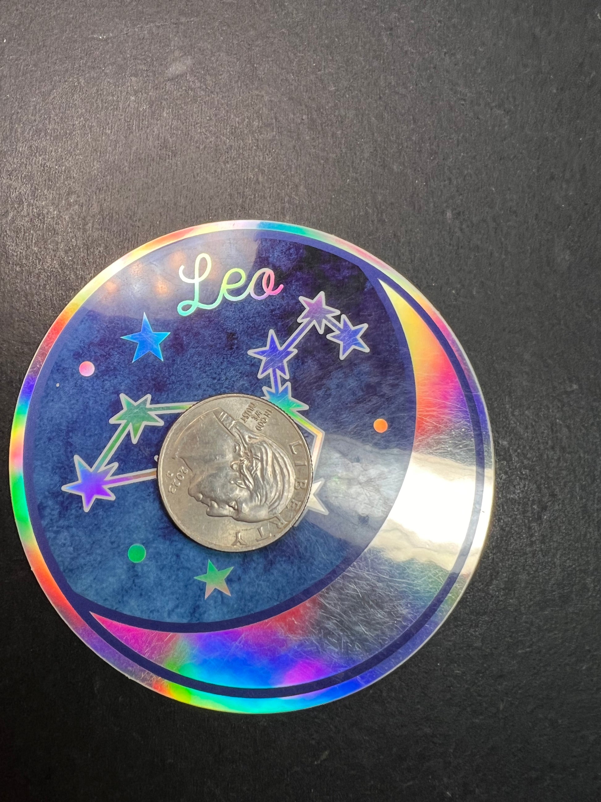 Bold, radiant, and full of fire β this Leo zodiac sticker is made for the natural-born leaders and cosmic creatives. Featuring the Leo constellation in vibrant star tones against a deep night-sky background, this circular sticker glows with a holographic border that shifts with the light. The multicolored cursive βLeoβ adds a playful, celestial flair. Stick it on your laptop, journal, water bottle, or anywhere you want to show off your star sign with pride.