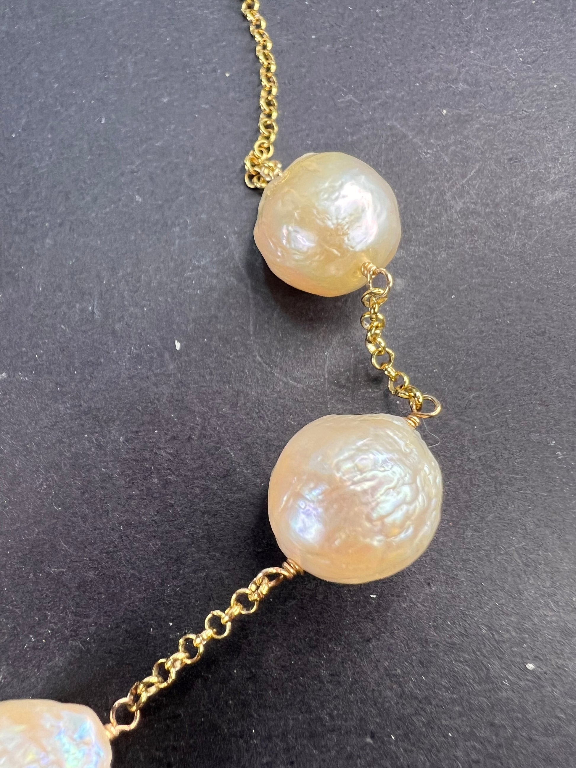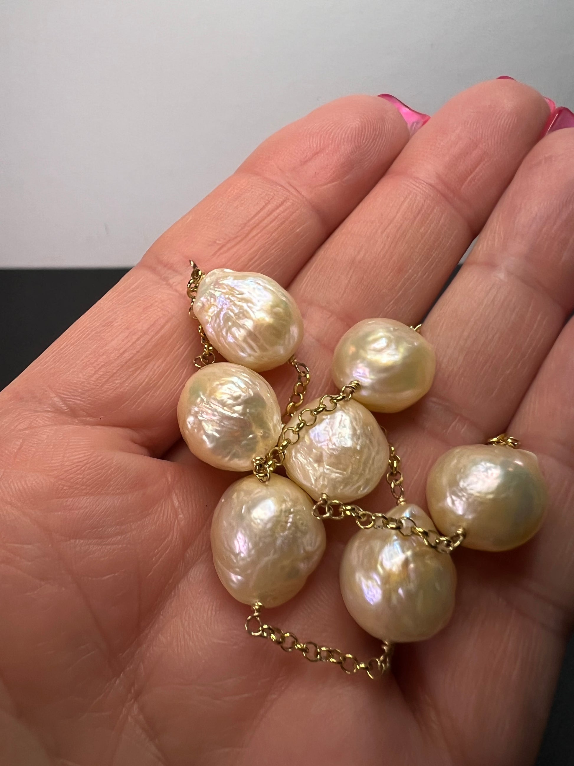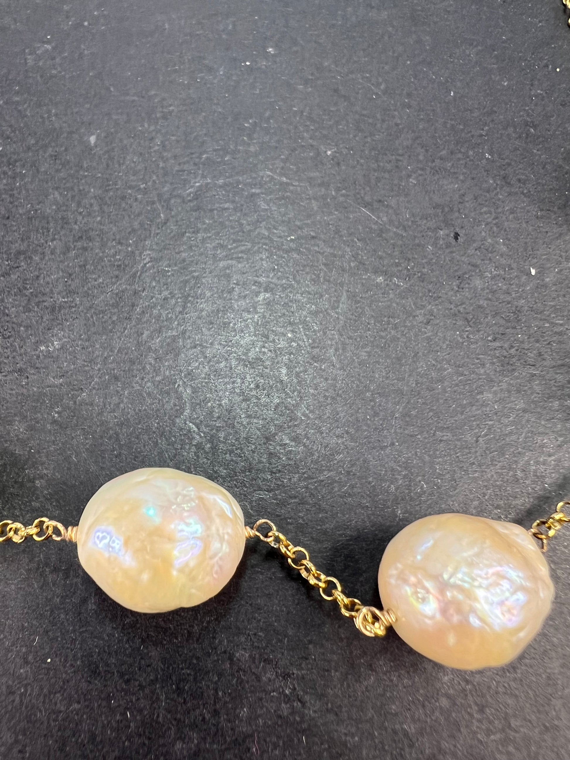 7 baroque cultured pearls measuring about 13-15mm stationed on a chain that’s either vermeil yellow gold over sterling silver or 14-18k gold plated over sterling. Measures about 20 inches in length with two extra rings to shorten .