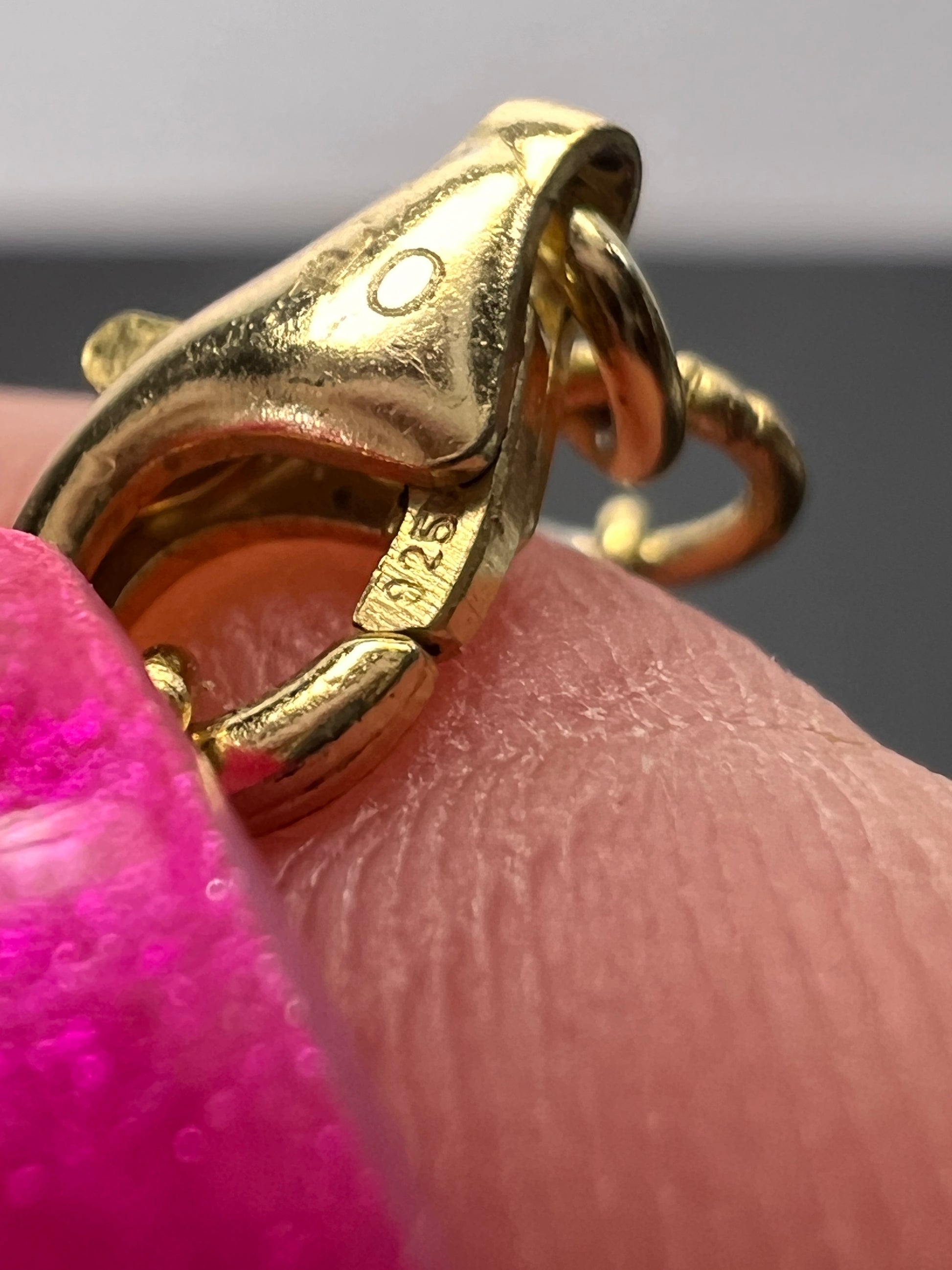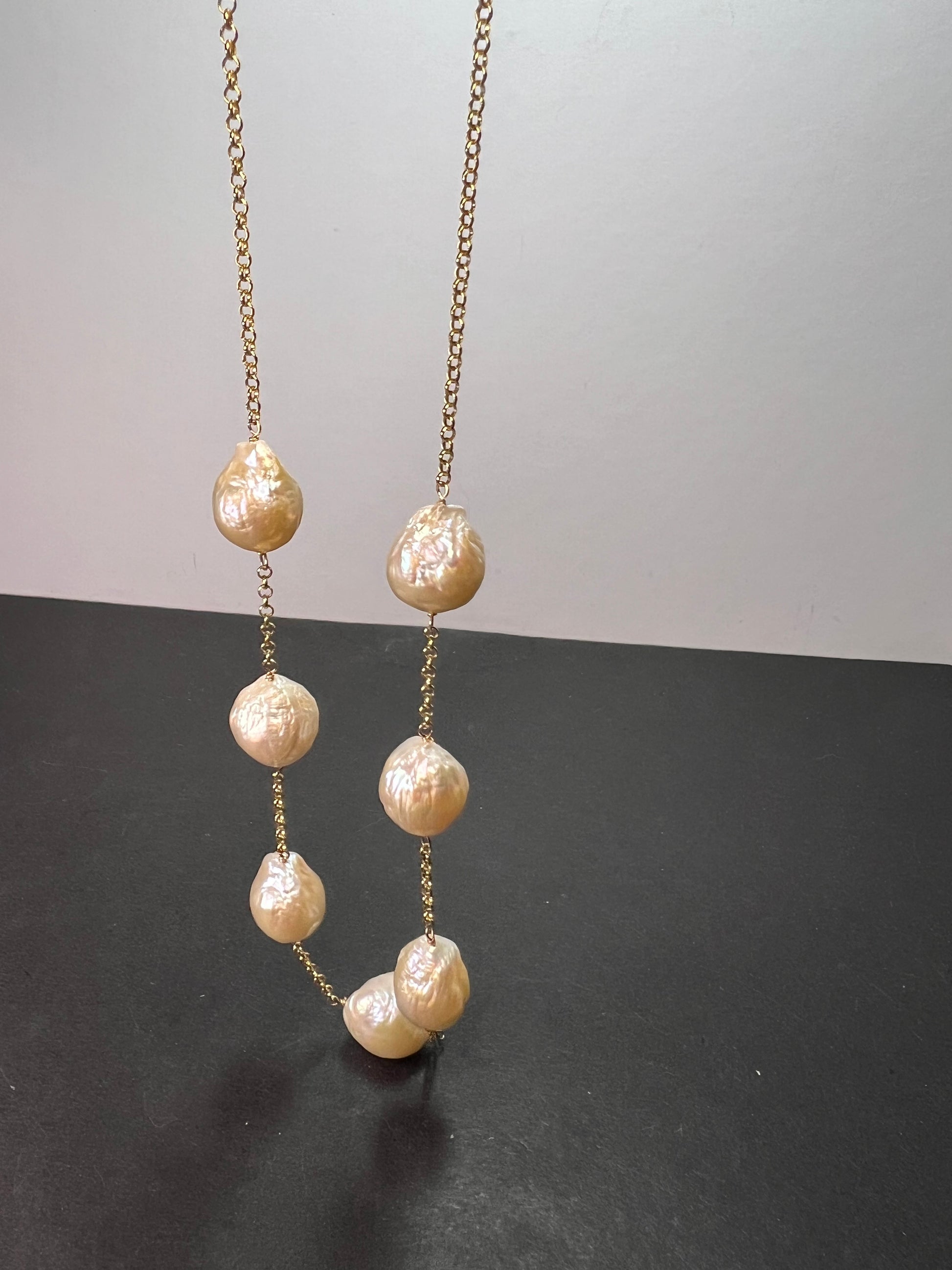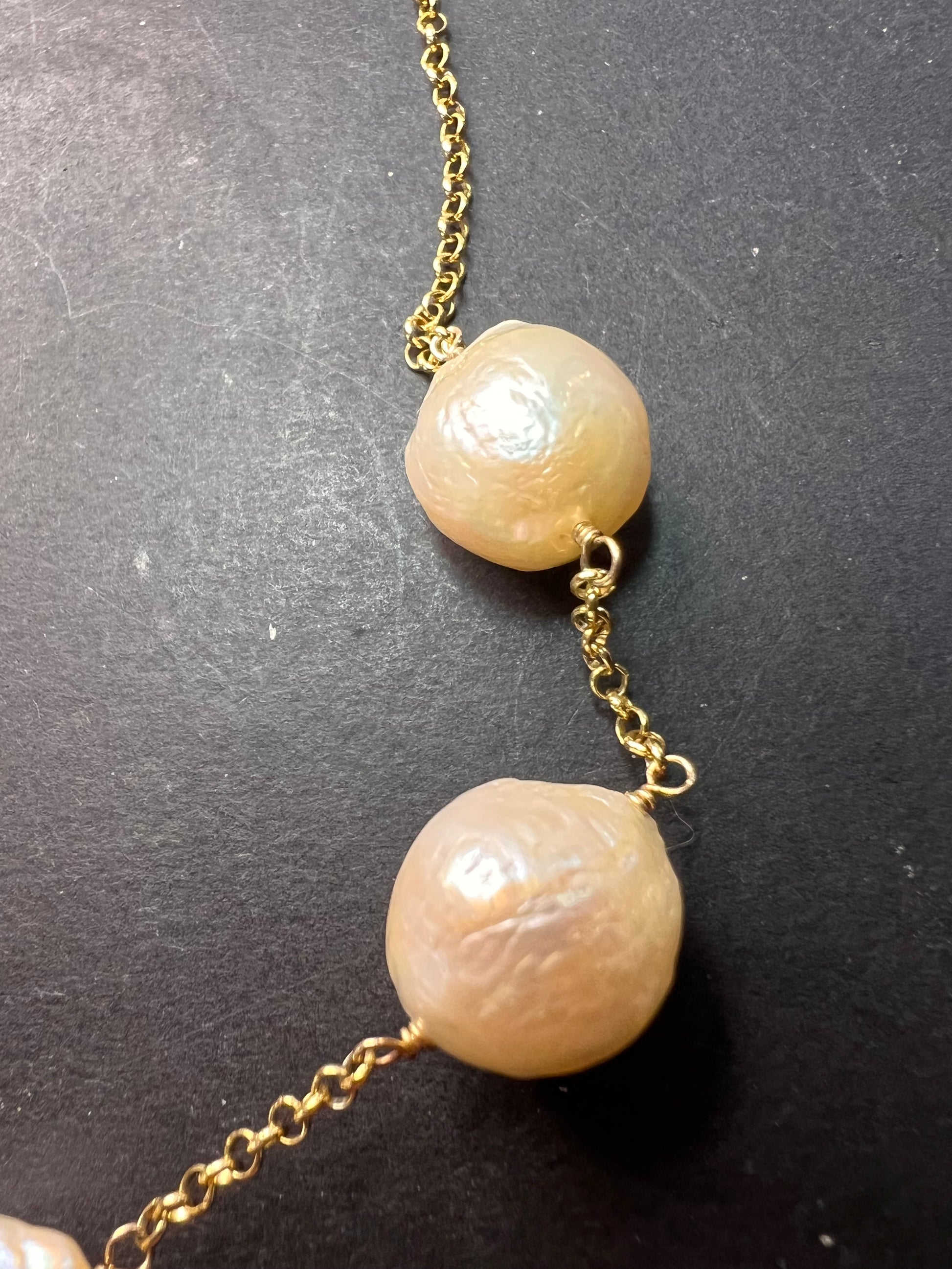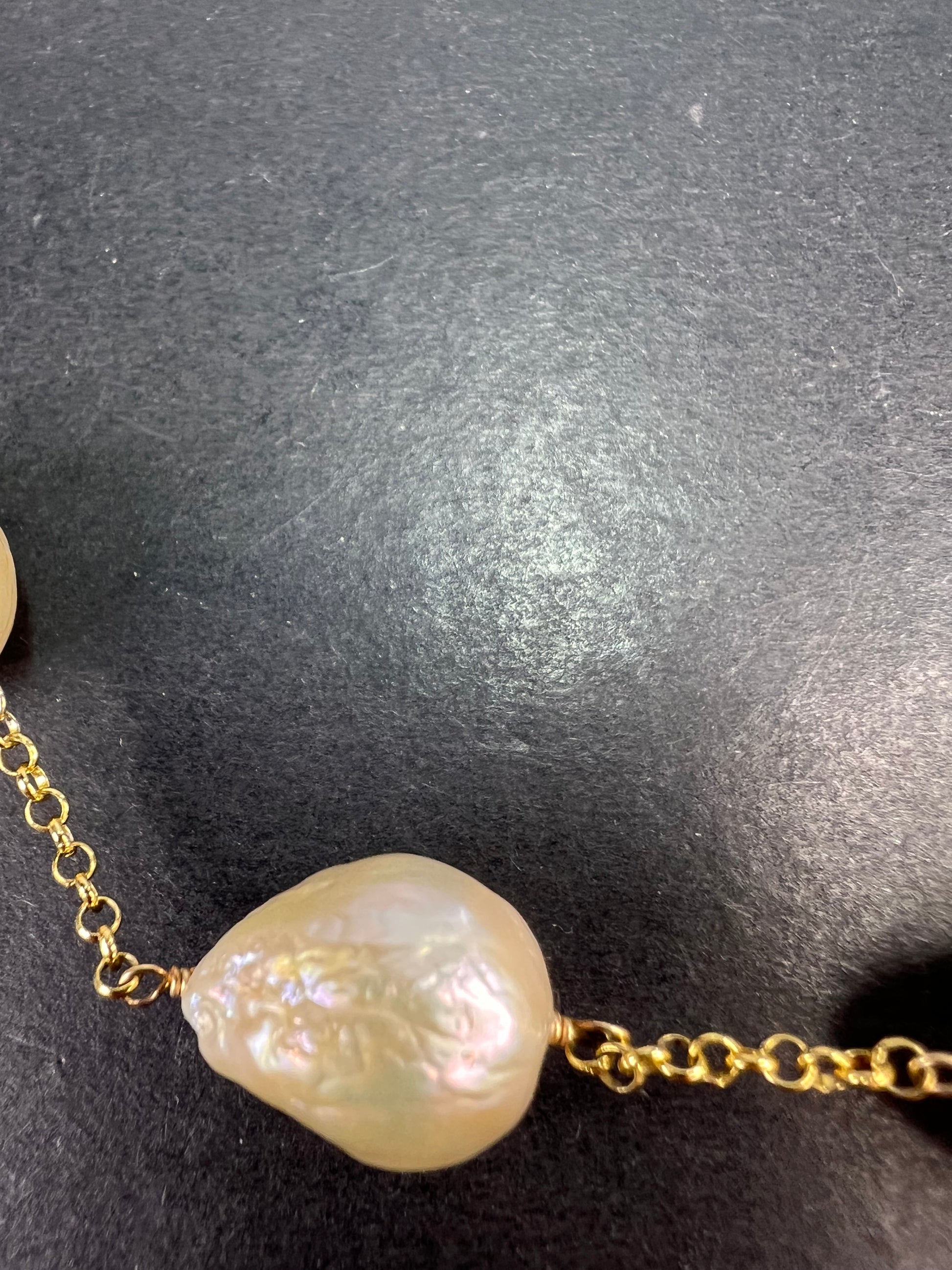 7 baroque cultured pearls measuring about 13-15mm stationed on a chain that’s either vermeil yellow gold over sterling silver or 14-18k gold plated over sterling. Measures about 20 inches in length with two extra rings to shorten .