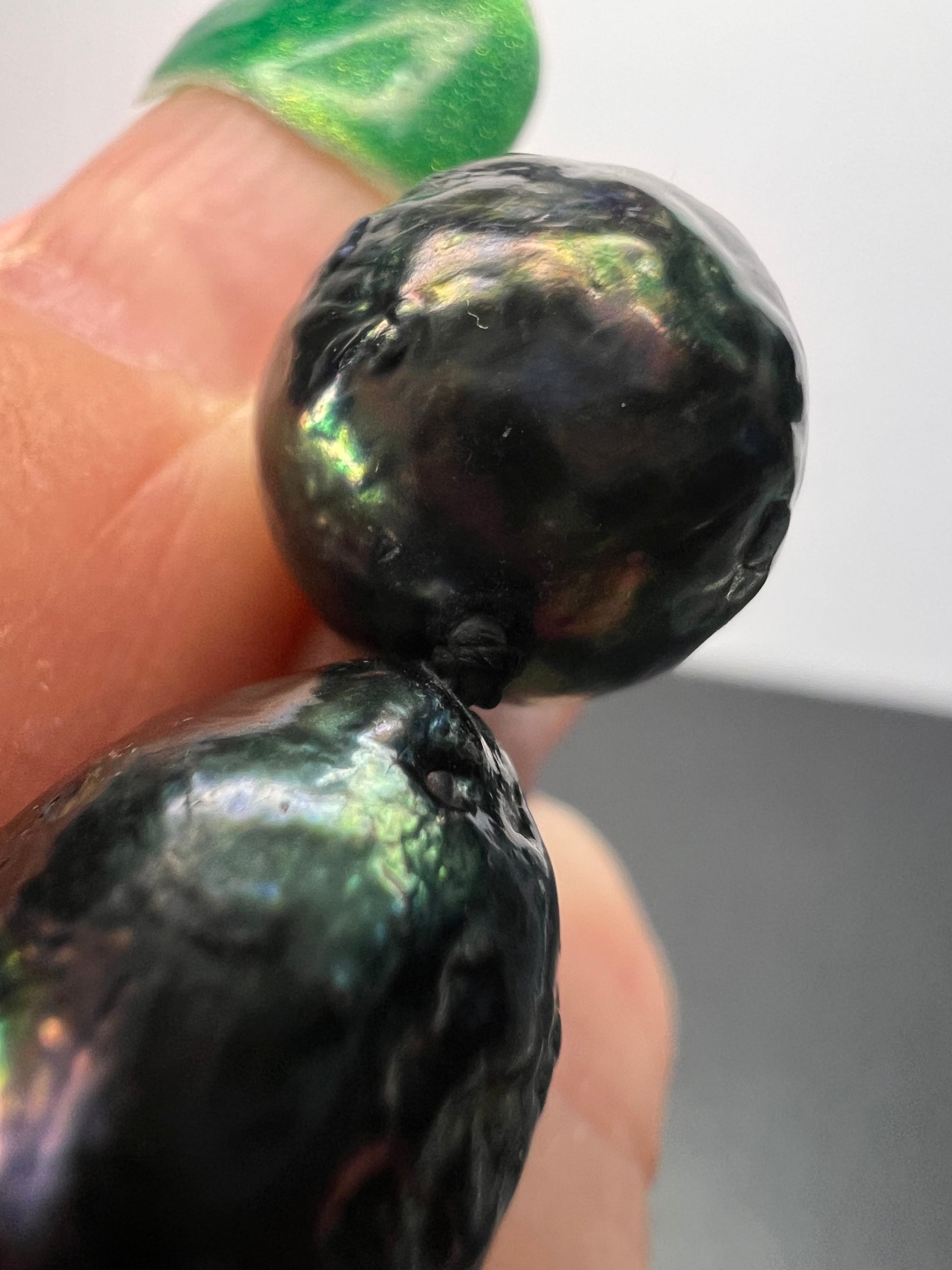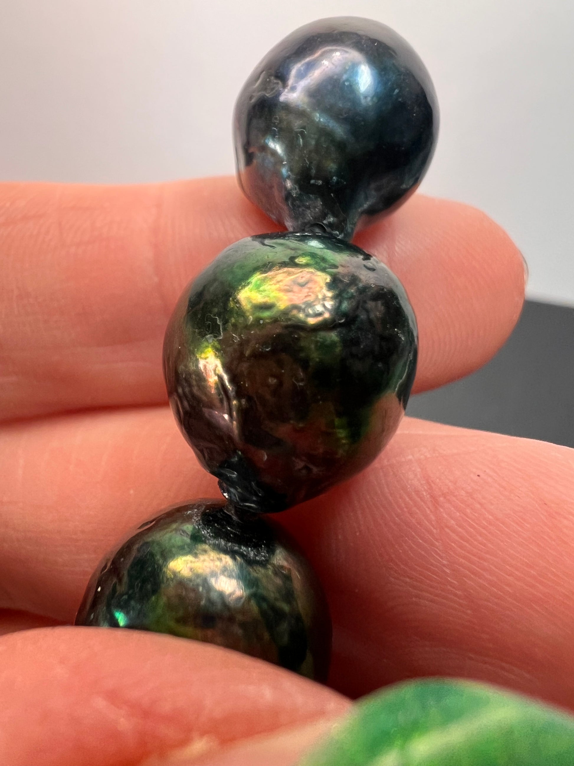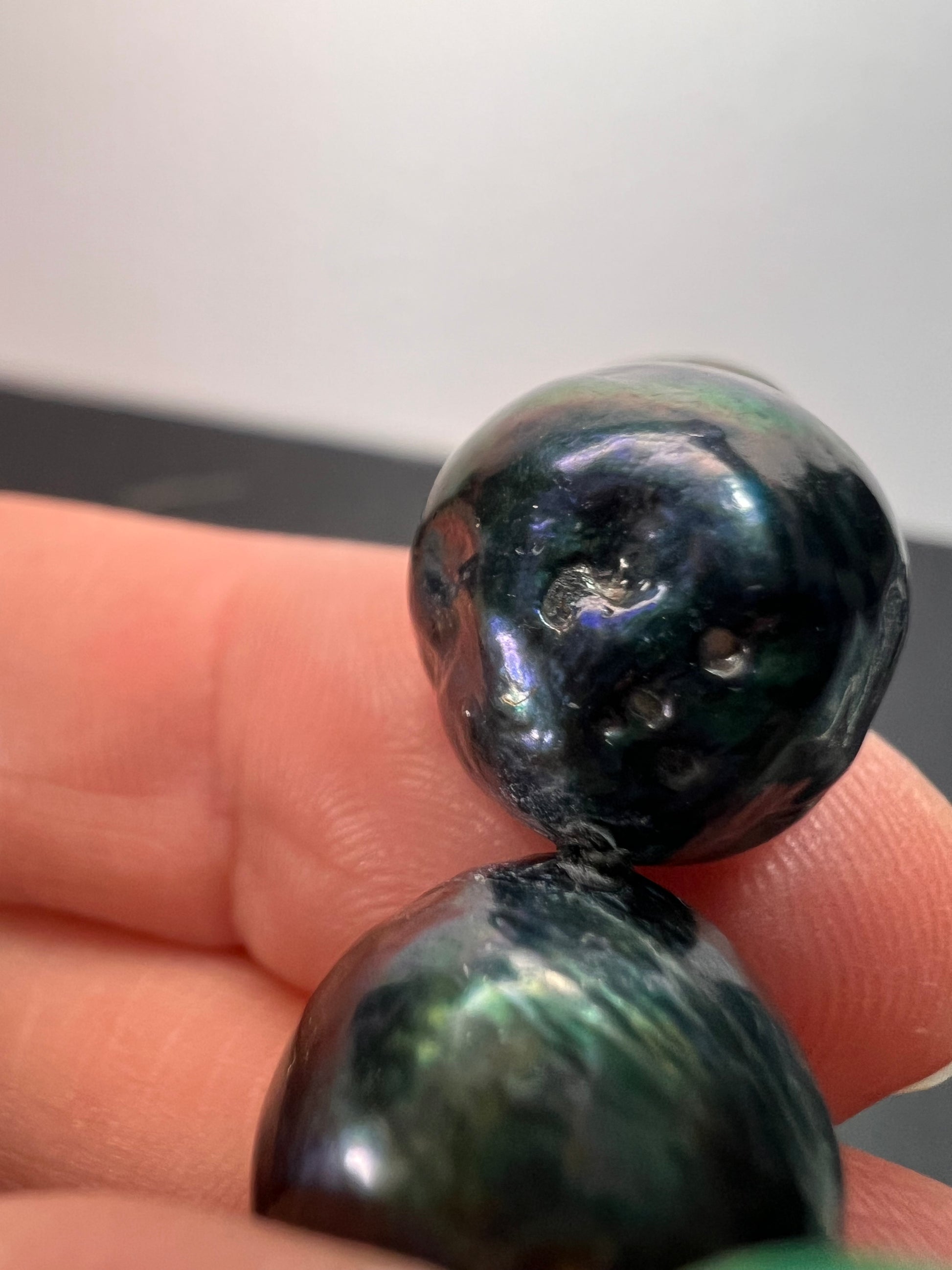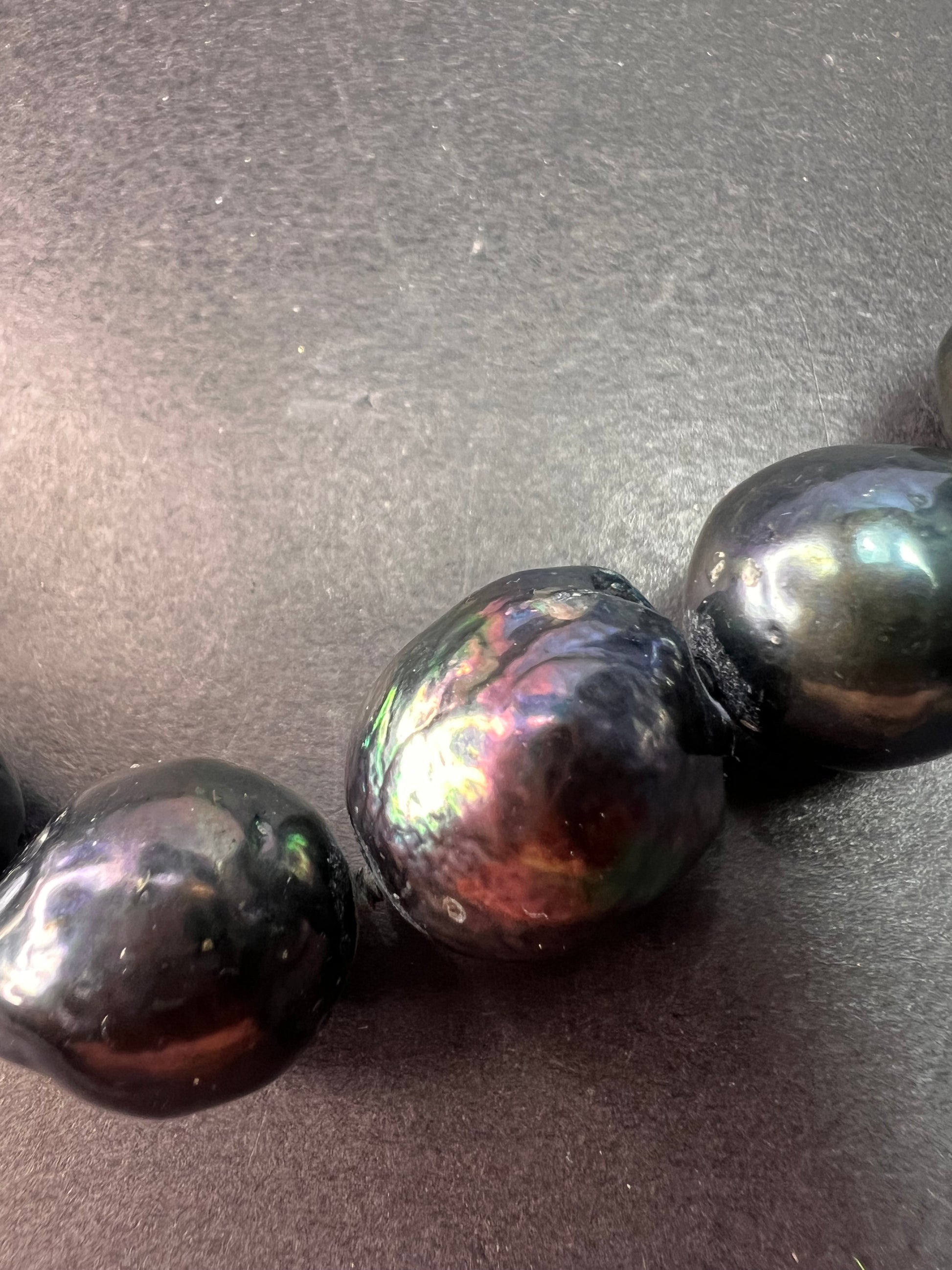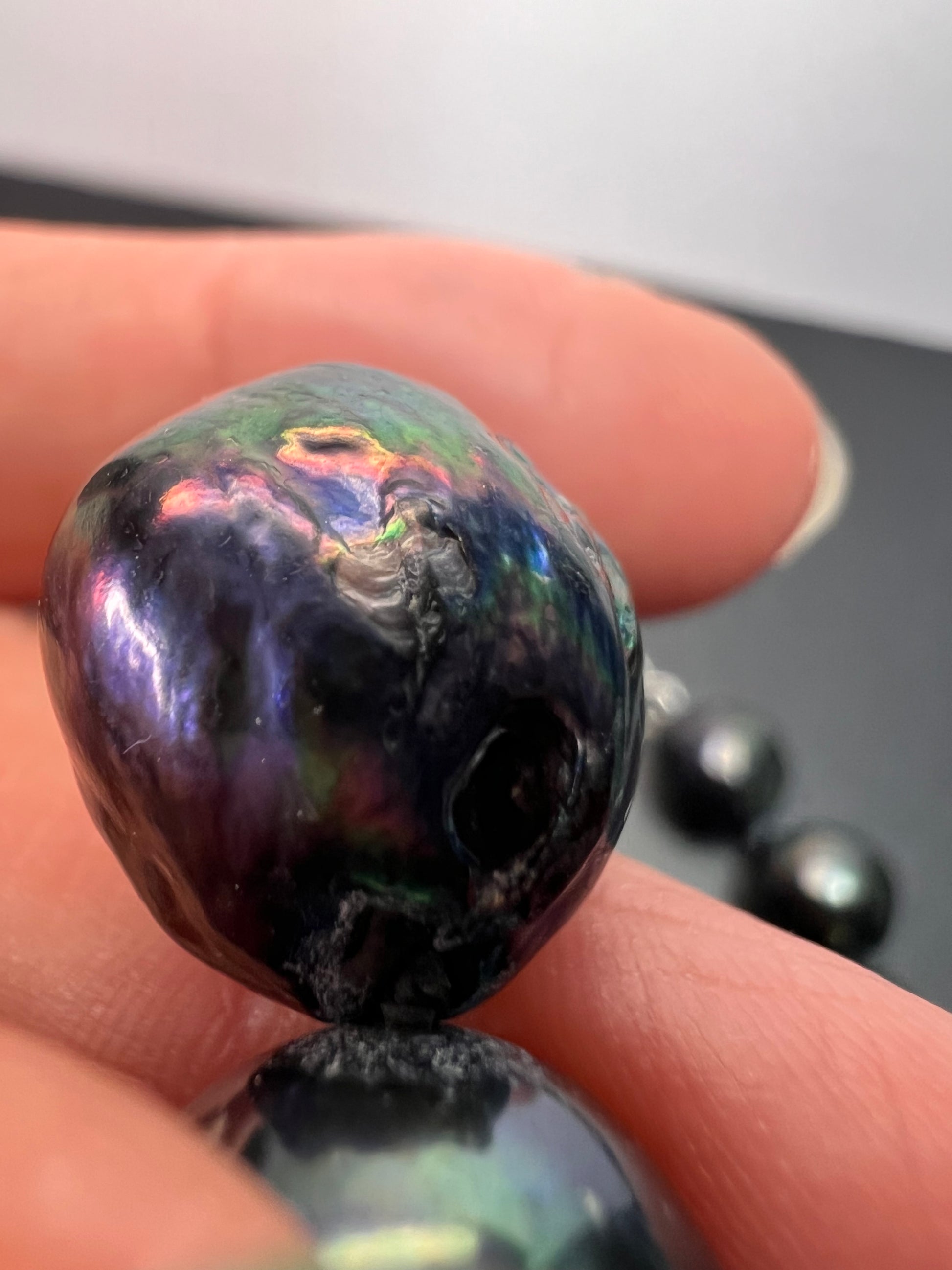 Genuine Tahitian pearls that I have been reassured by someone extremely versed in Tahitian pearls that these are indeed Tahitian pearls with a highly sought after peacock overtone. Pearls measure about 13mm in diameter, with a 22 inch length. Knotted in between 35 pearl count, finished with a sterling silver jumbo spring ring clasp stamped 925 and OP.
