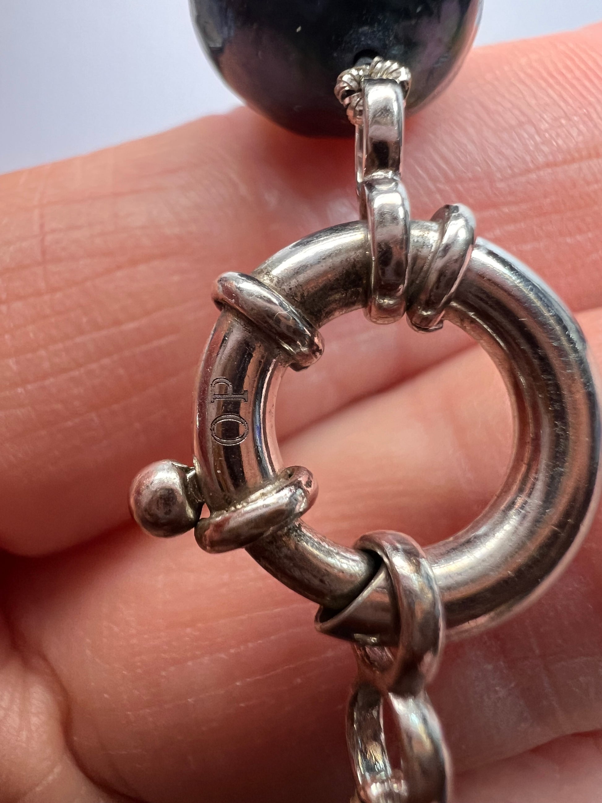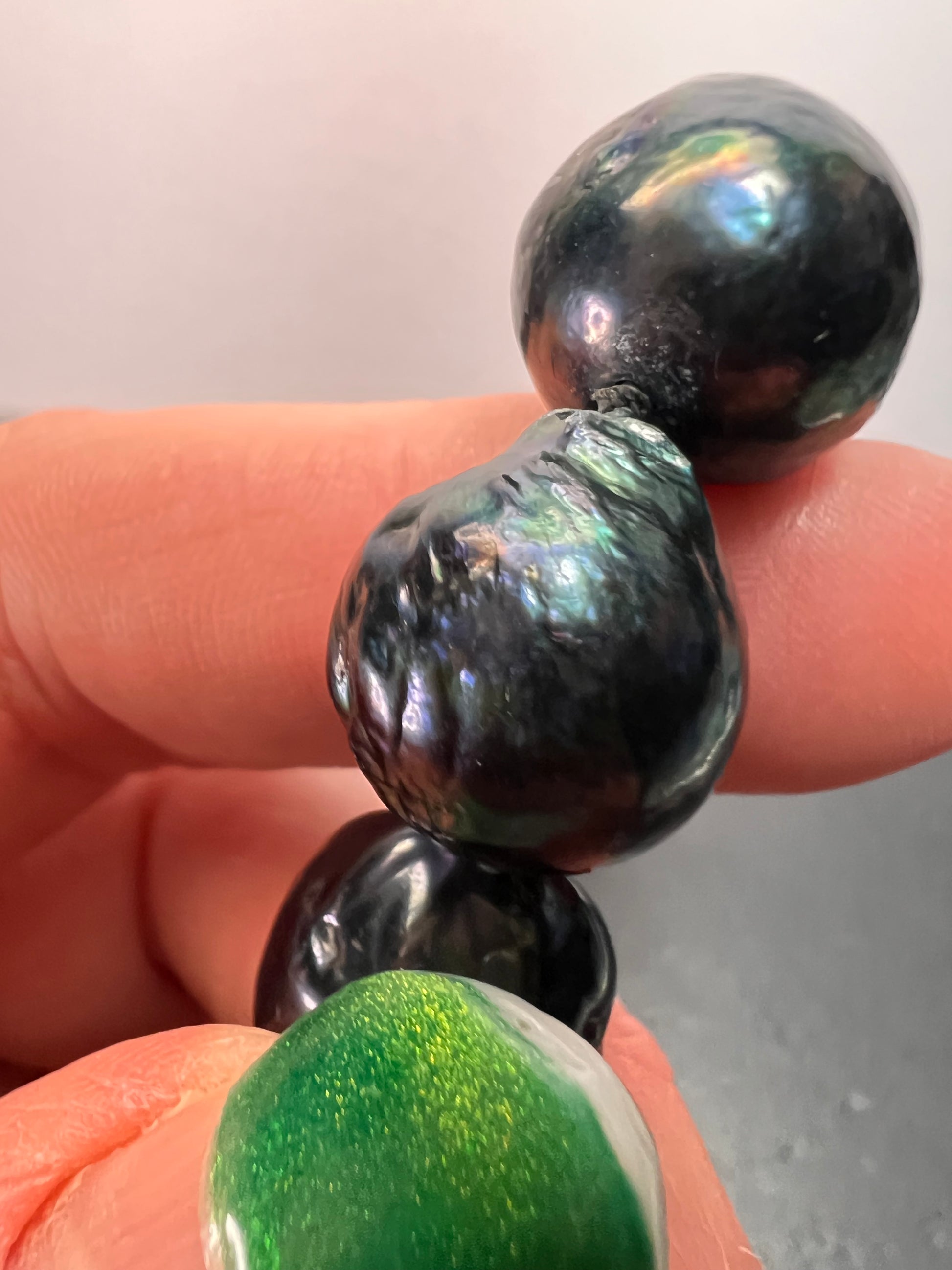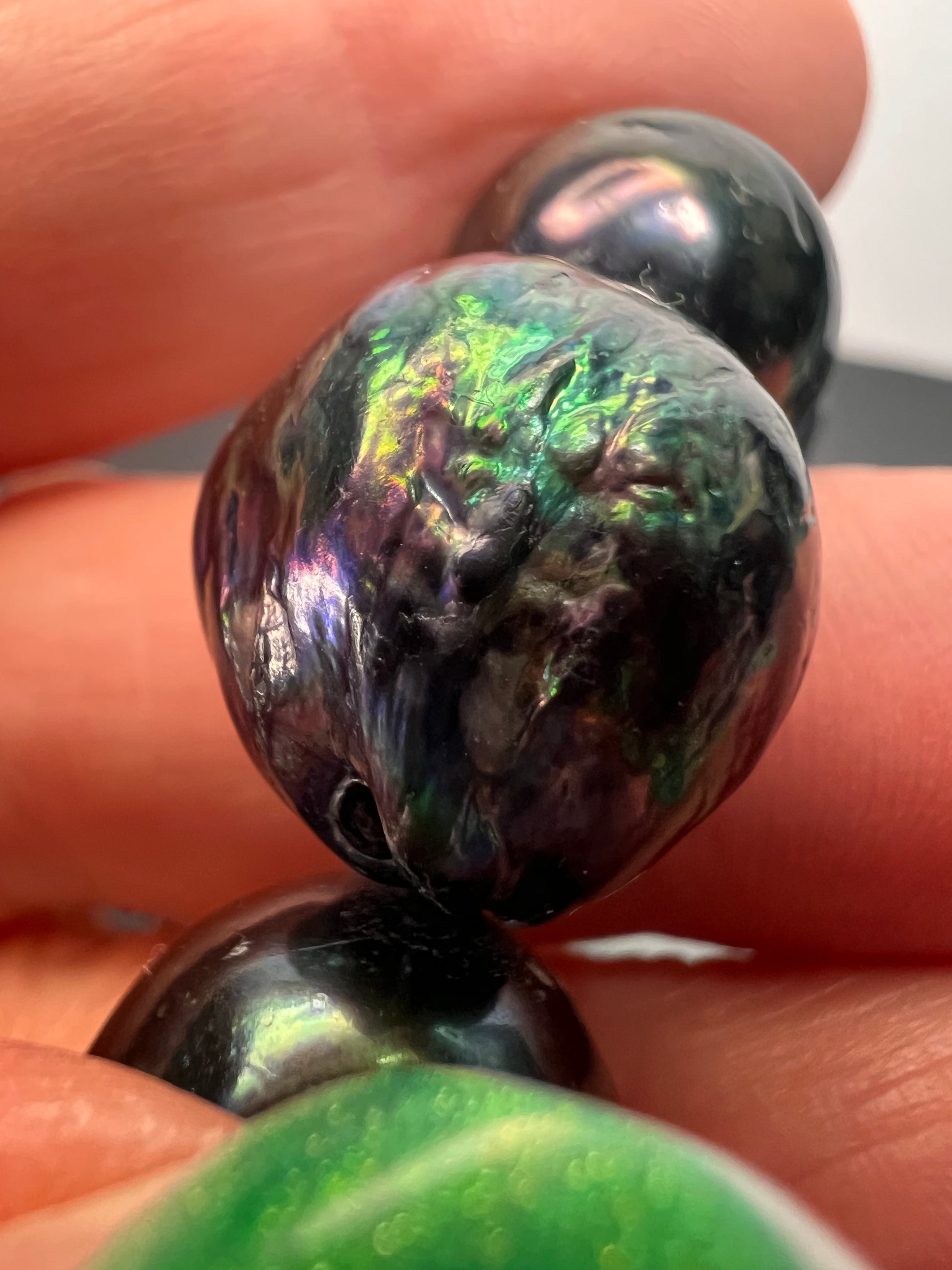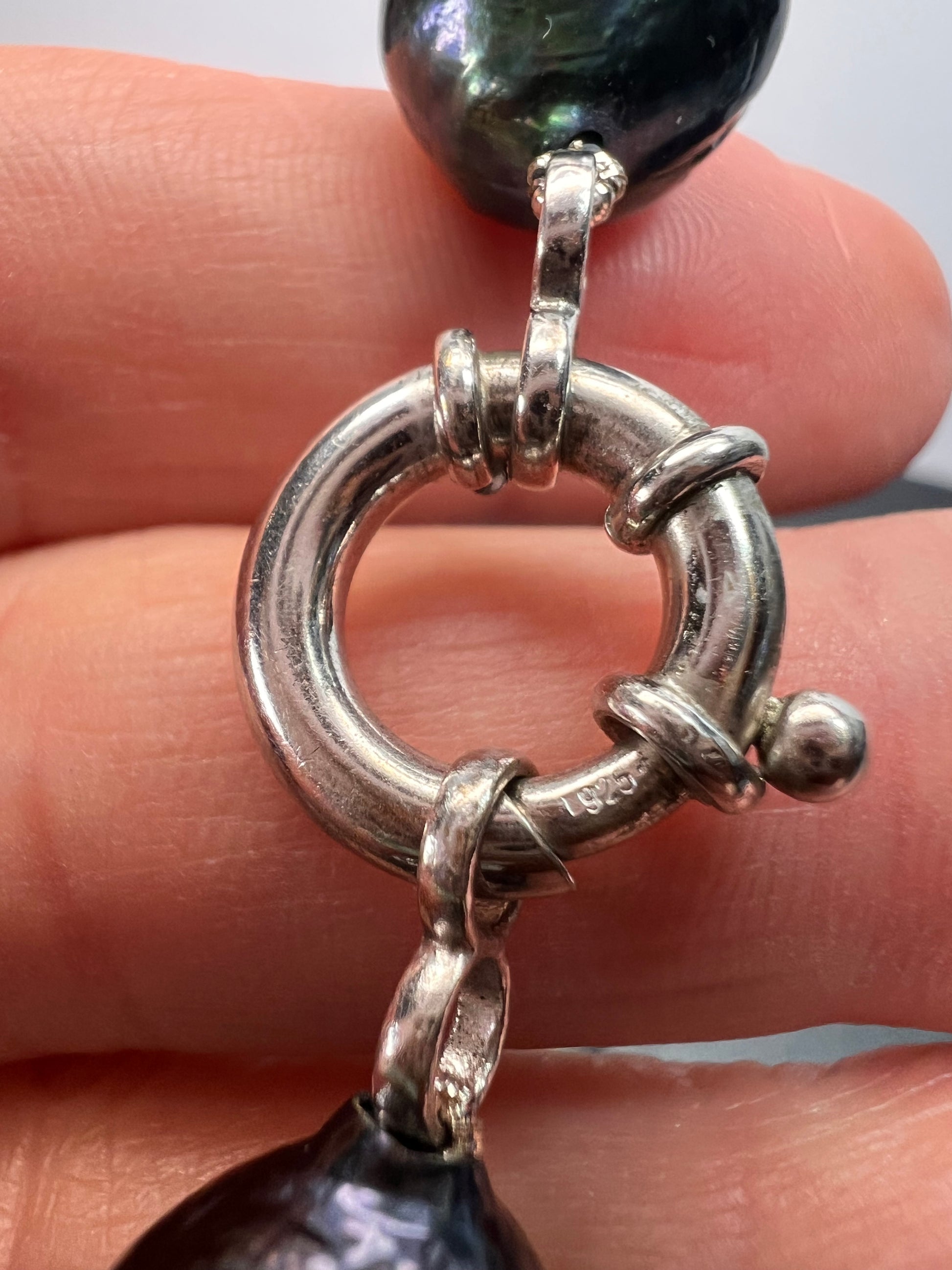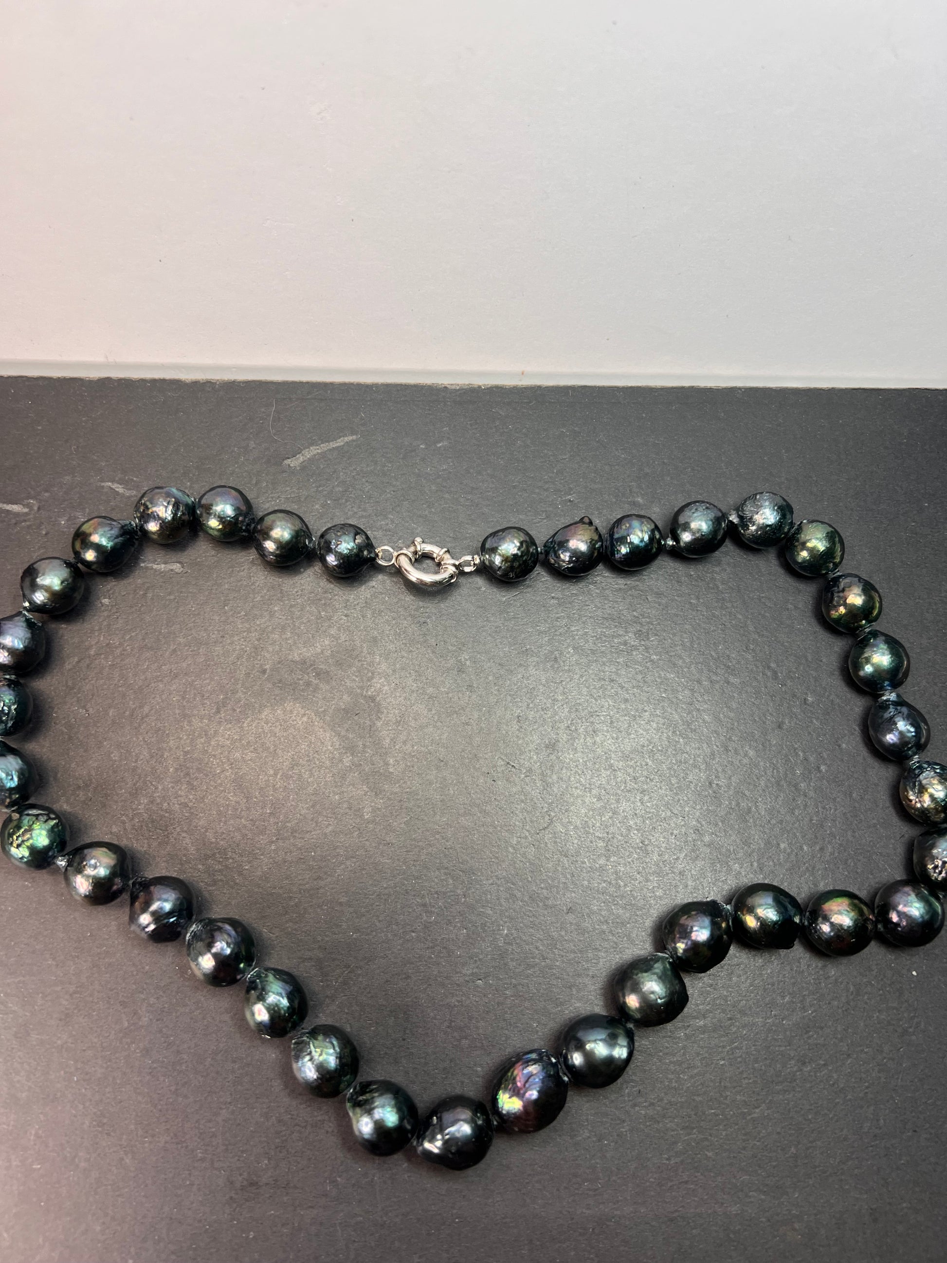 Genuine Tahitian pearls that I have been reassured by someone extremely versed in Tahitian pearls that these are indeed Tahitian pearls with a highly sought after peacock overtone. Pearls measure about 13mm in diameter, with a 22 inch length. Knotted in between 35 pearl count, finished with a sterling silver jumbo spring ring clasp stamped 925 and OP.