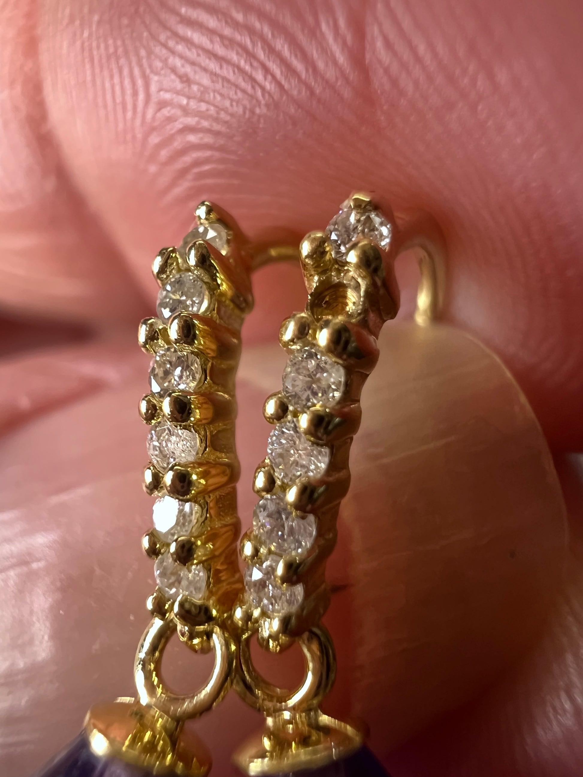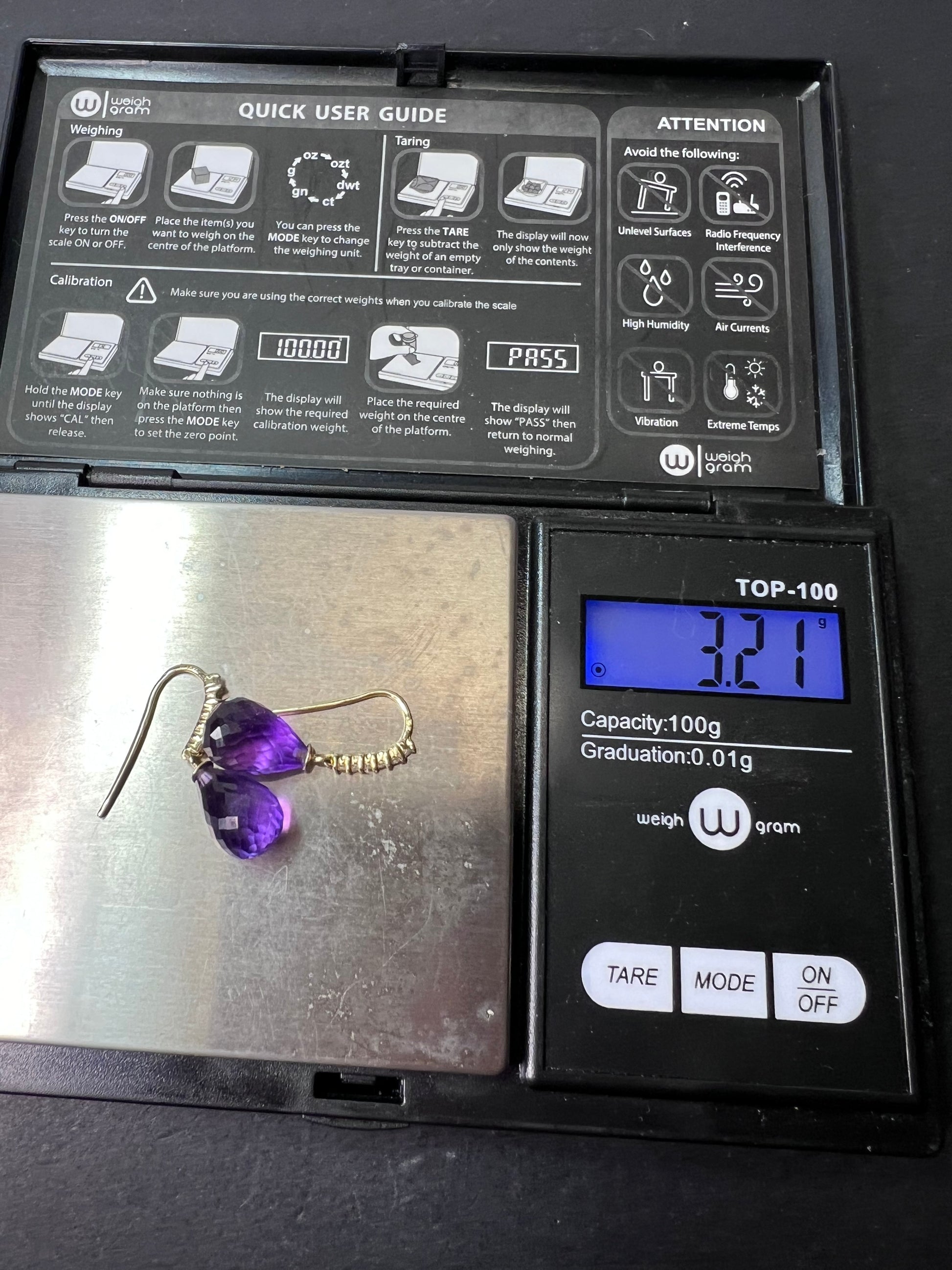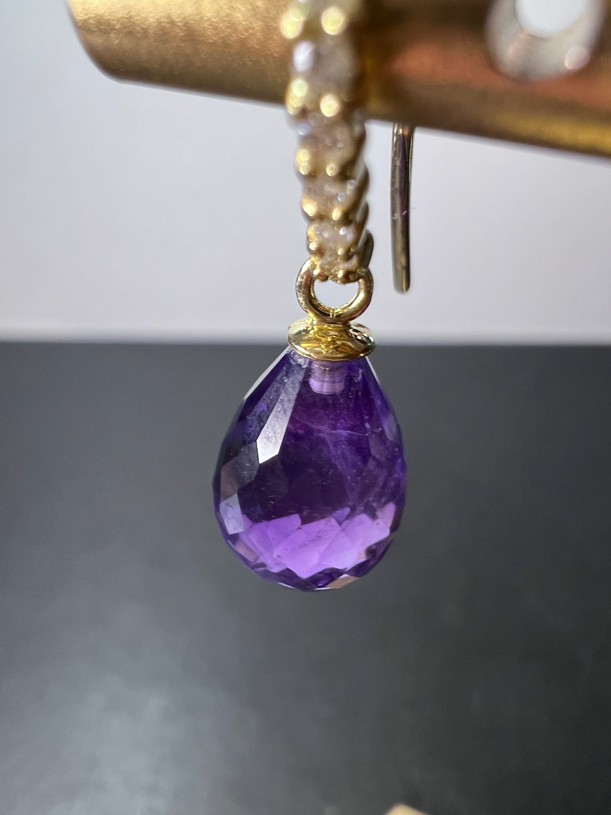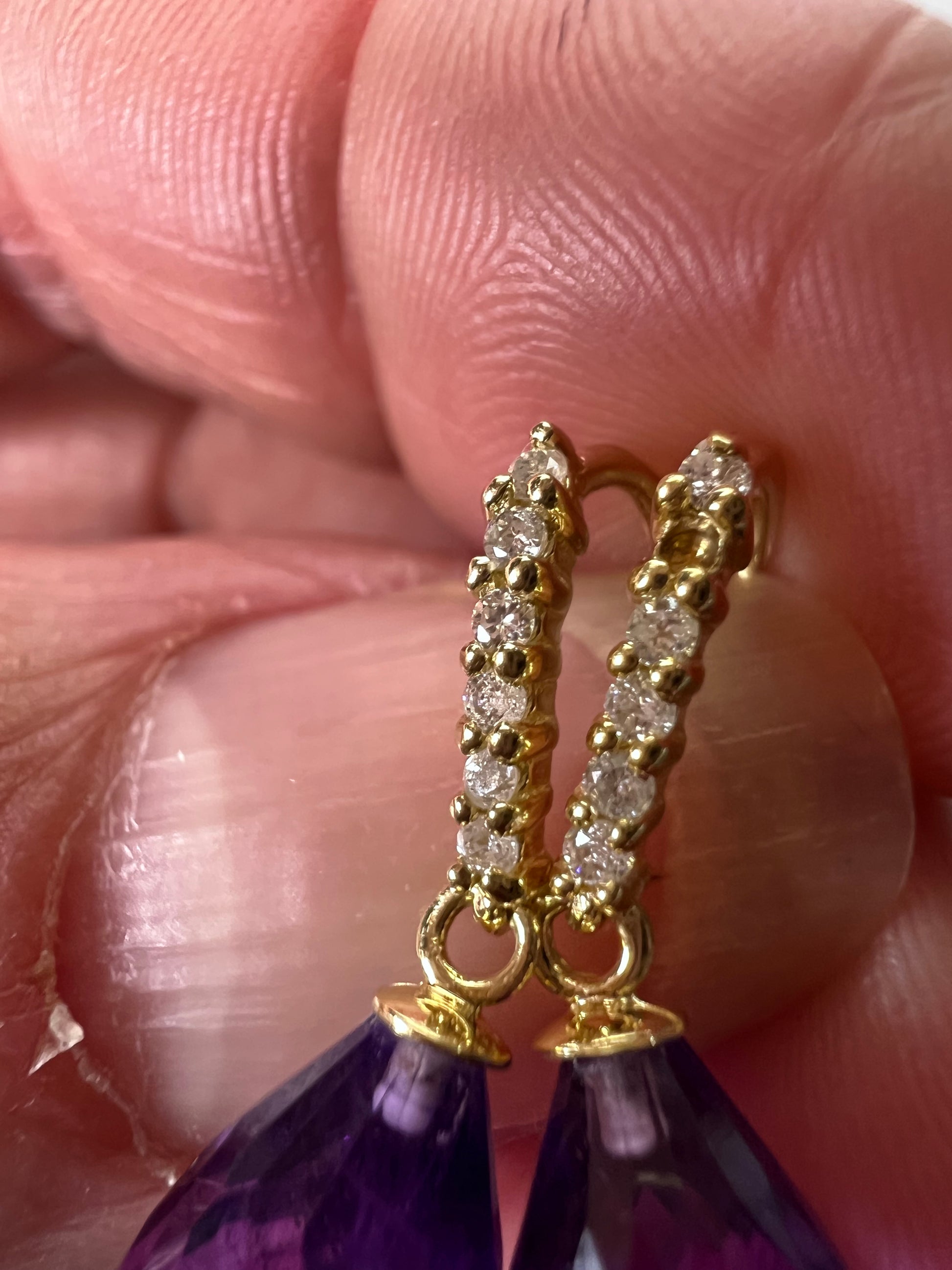 Genuine amethyst briolettes dangling off of a 14k yellow gold wire with accent diamonds . Total of 9 diamonds as is. Total weight is 3.21 grams.