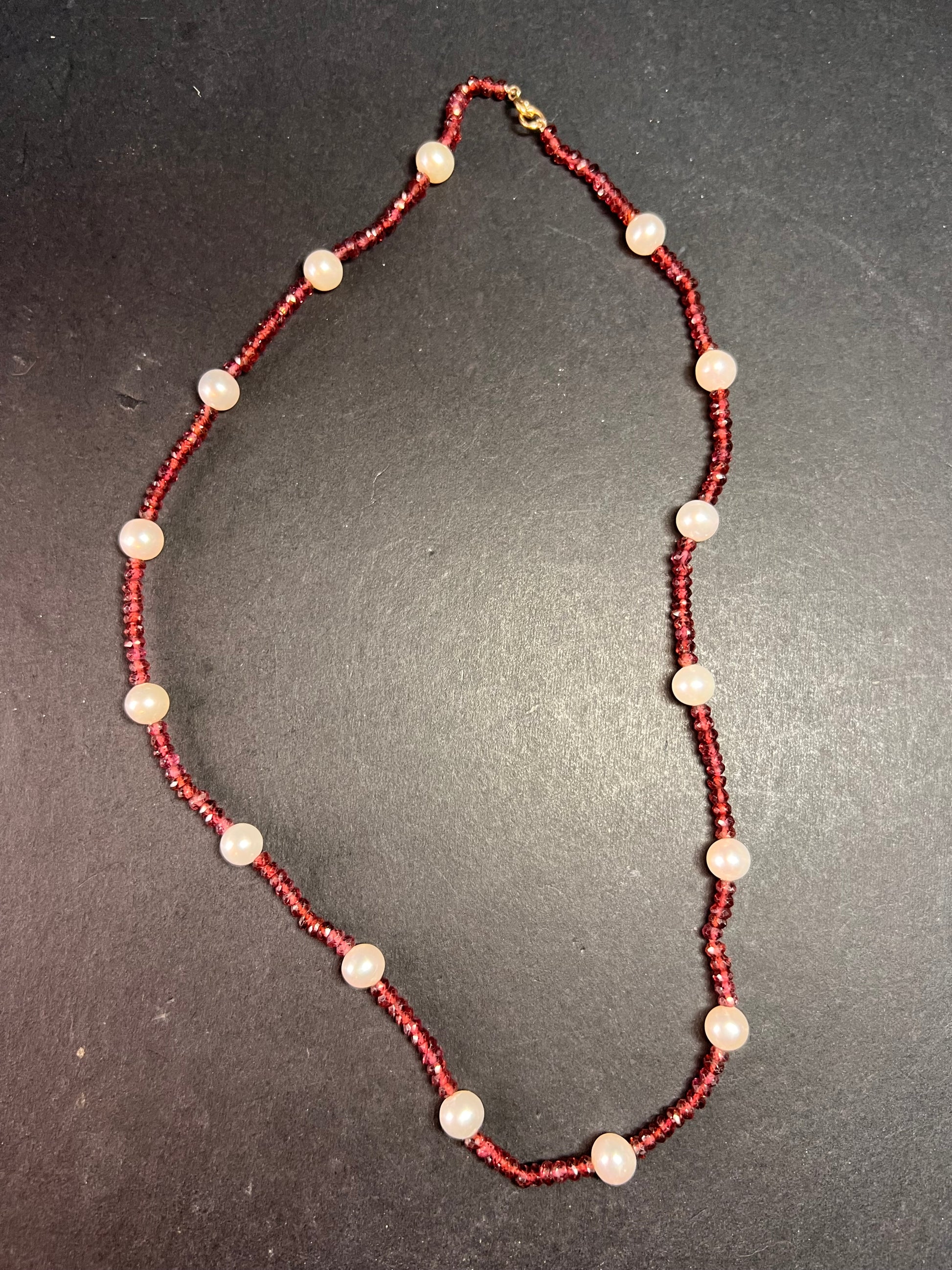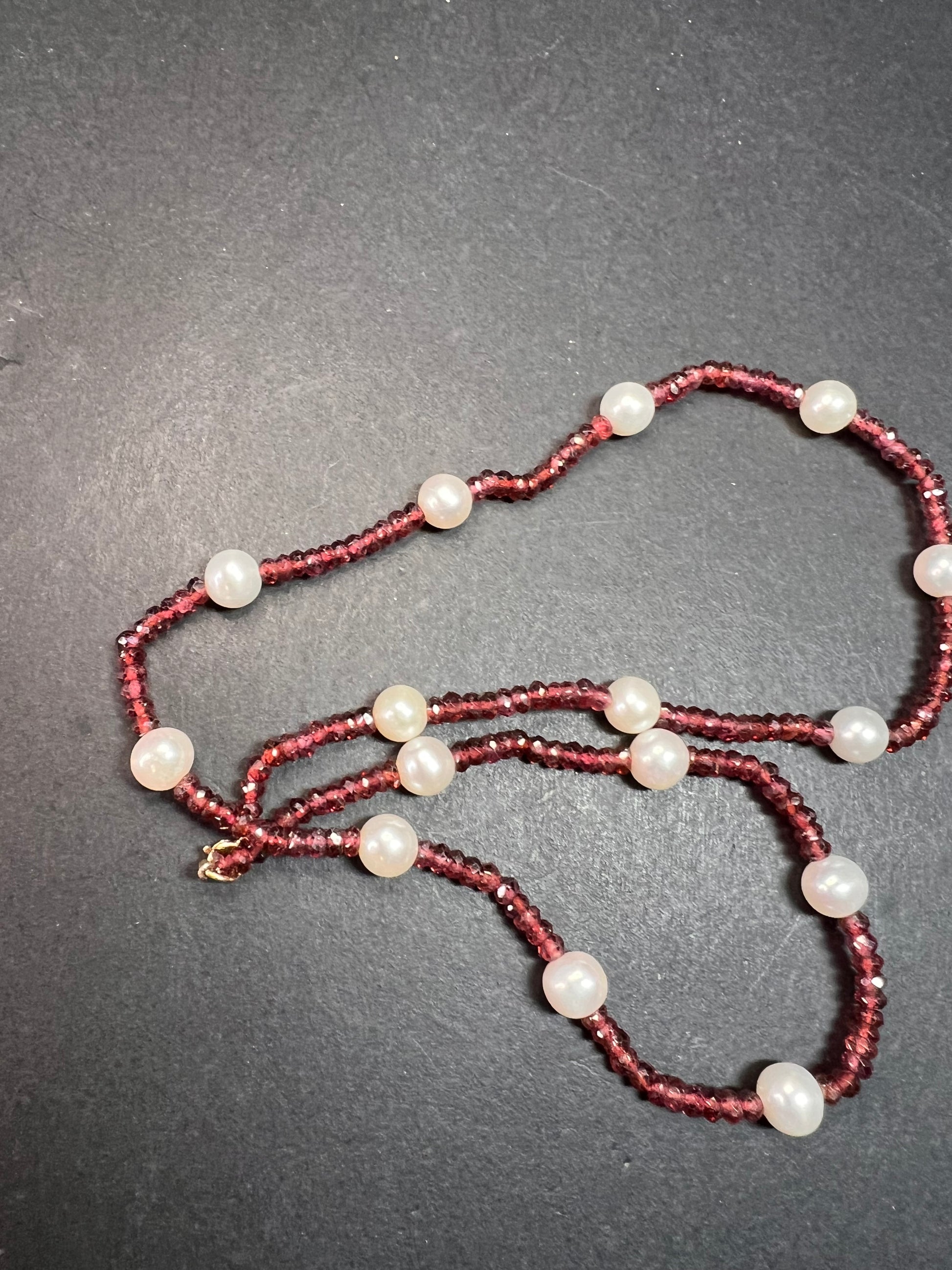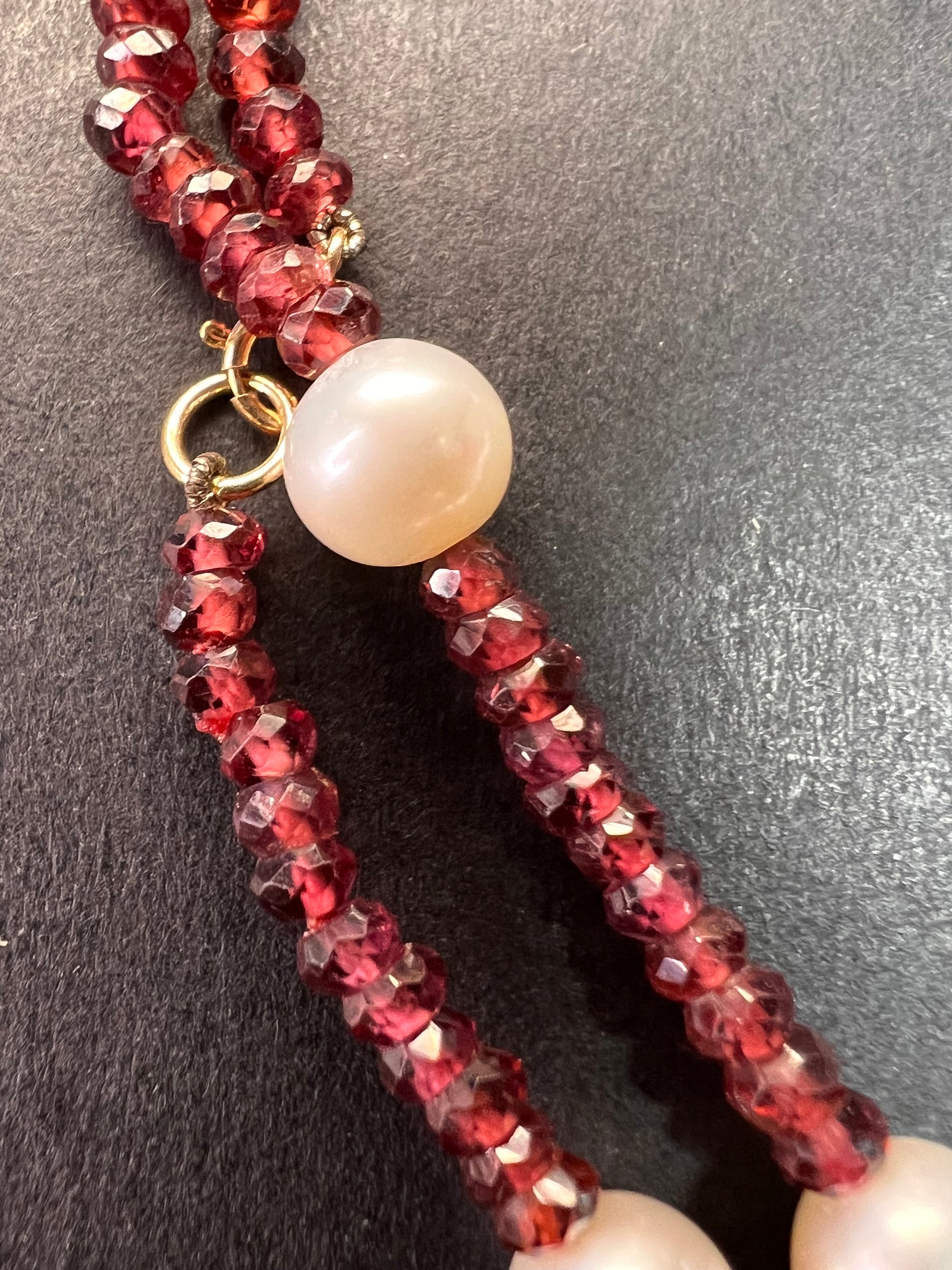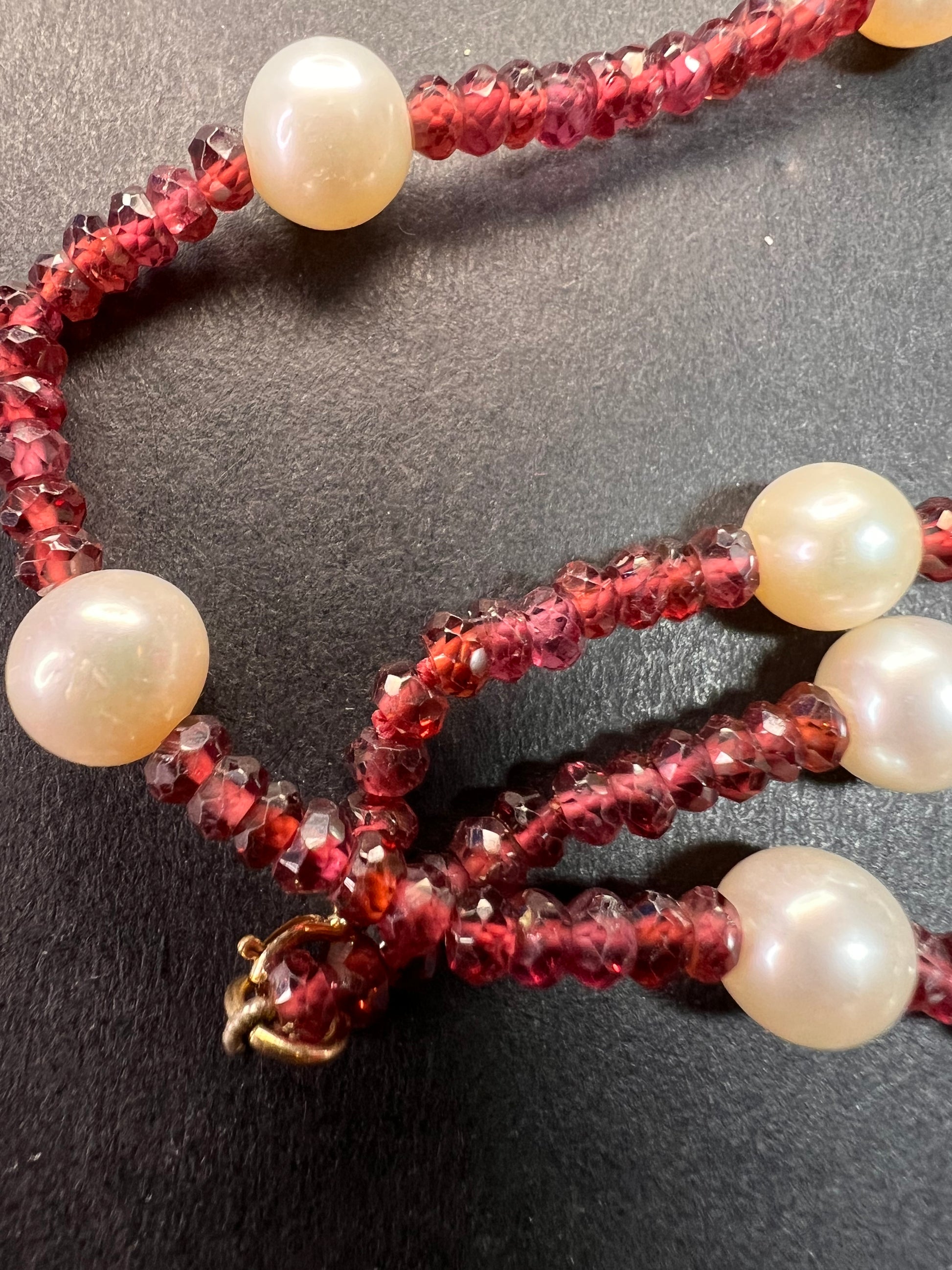 Genuine 3-4mm faceted rondelle gemmy rhodolite red garnet beads strung on an 18 inch strand , stationed with 15 7 mm white cultured pearls and finished with a 14k yellow gold spring ring clasp. No hallmark found. Clasp is stamped 585 for 14k gold.