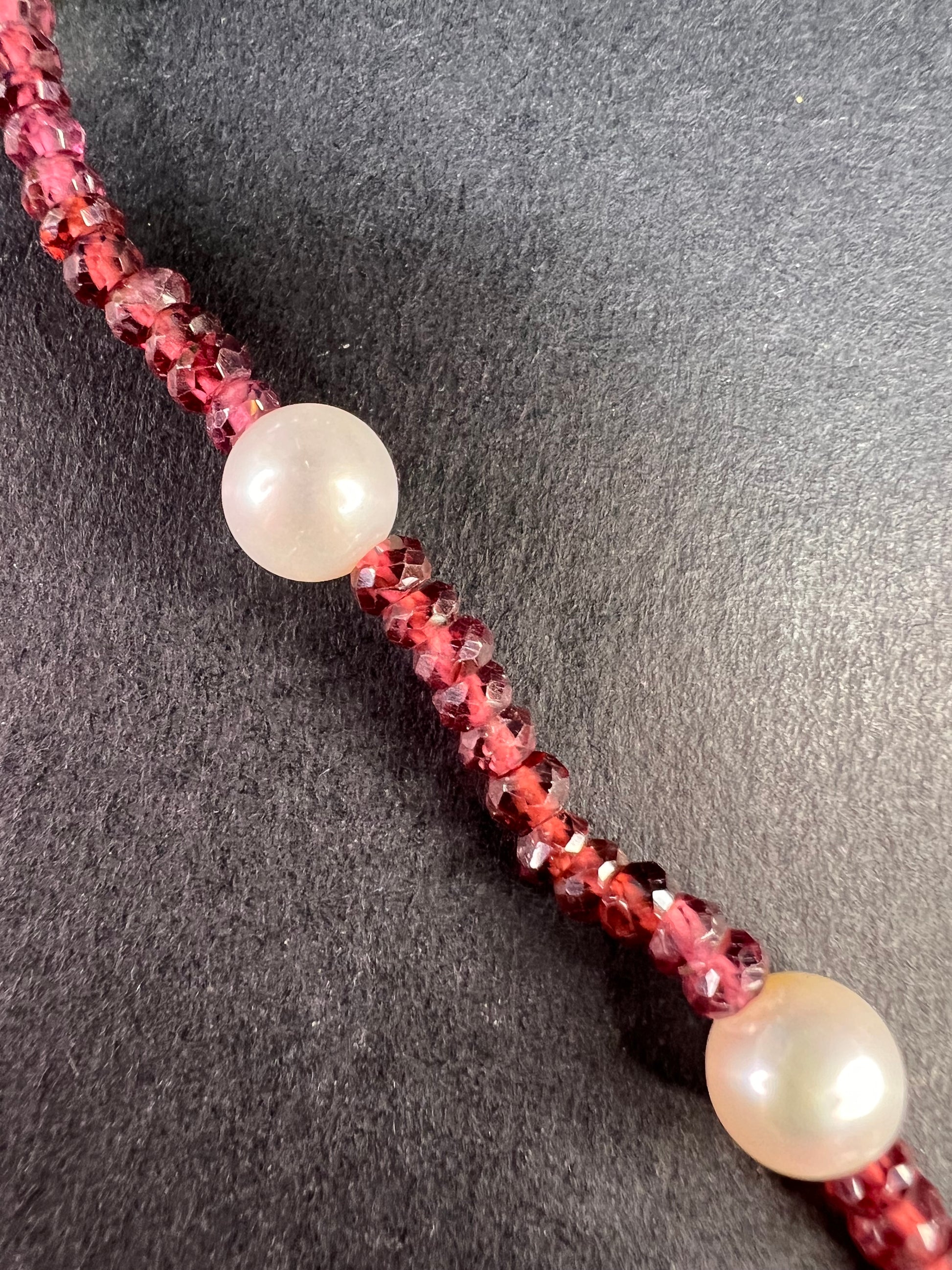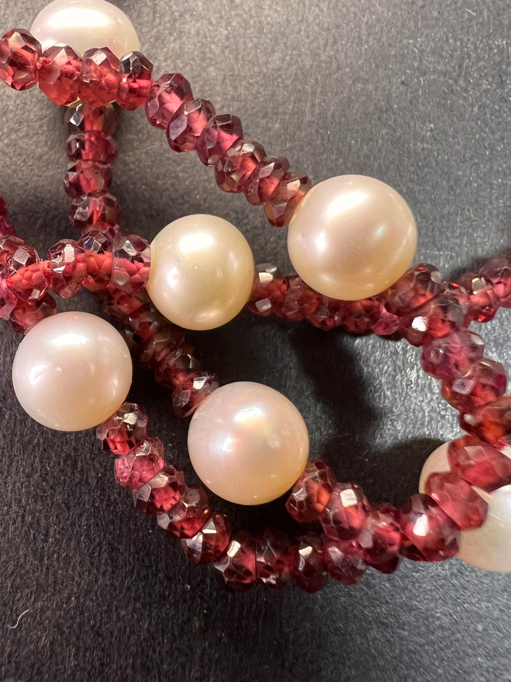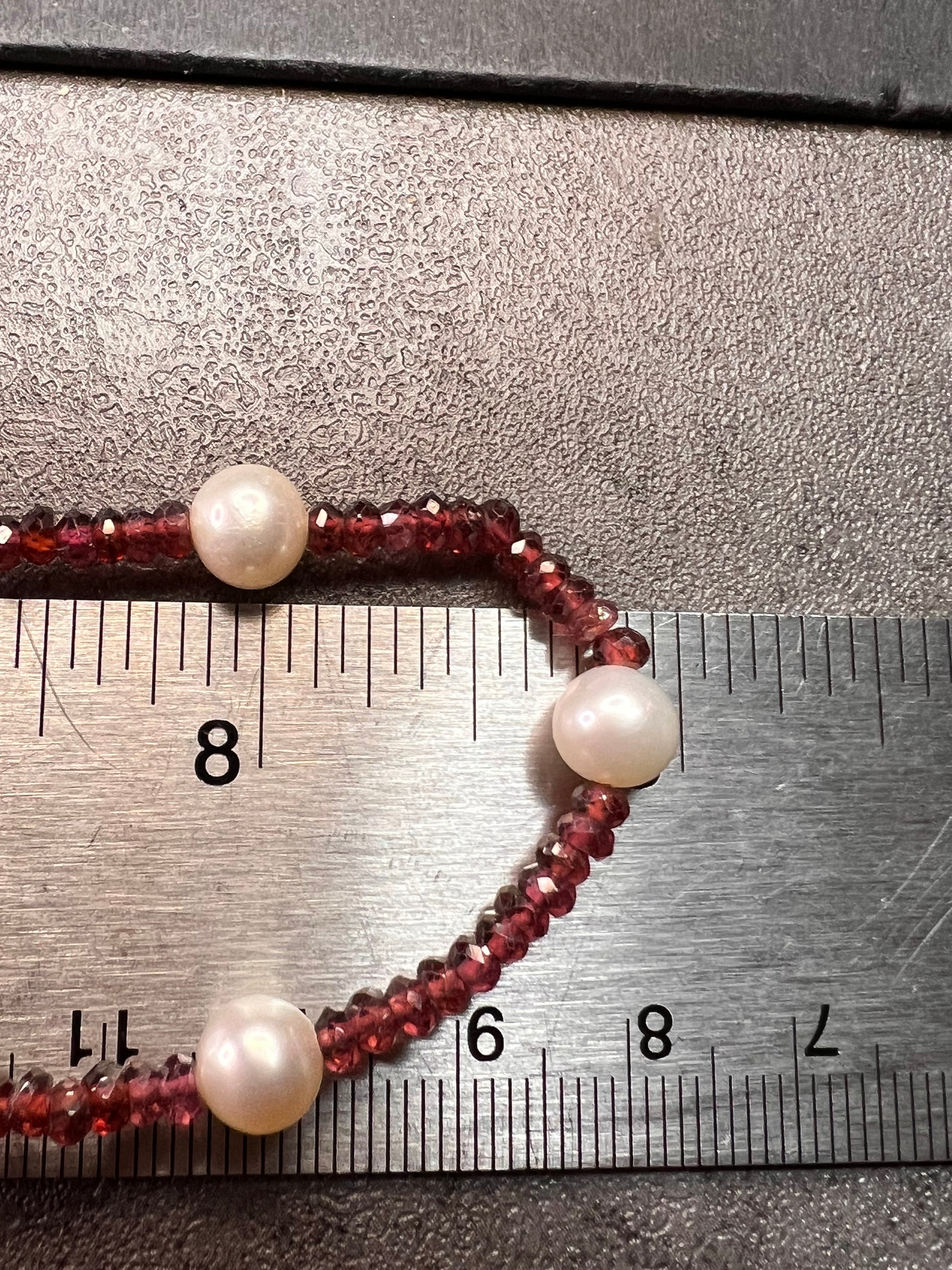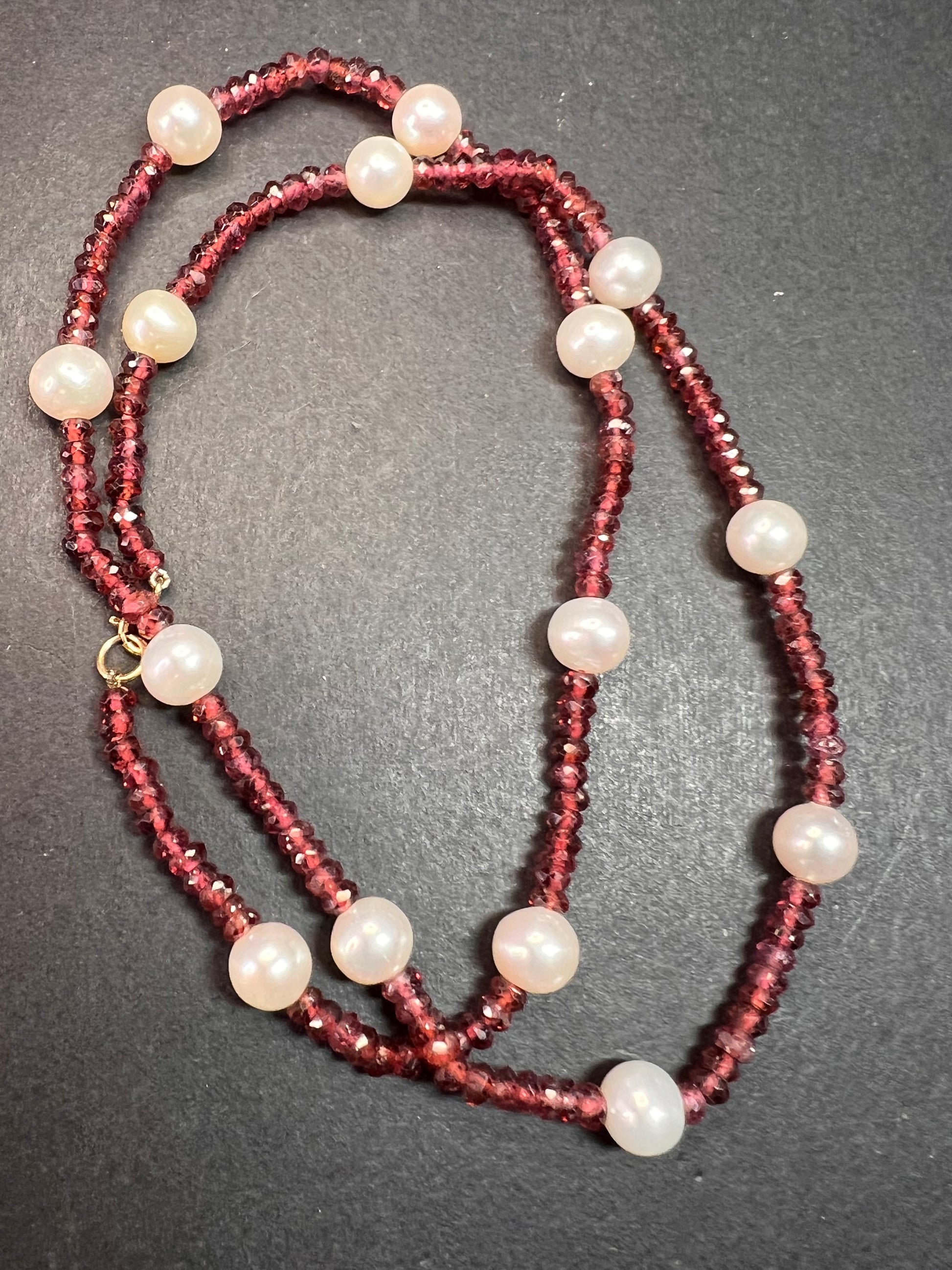 Genuine 3-4mm faceted rondelle gemmy rhodolite red garnet beads strung on an 18 inch strand , stationed with 15 7 mm white cultured pearls and finished with a 14k yellow gold spring ring clasp. No hallmark found. Clasp is stamped 585 for 14k gold.