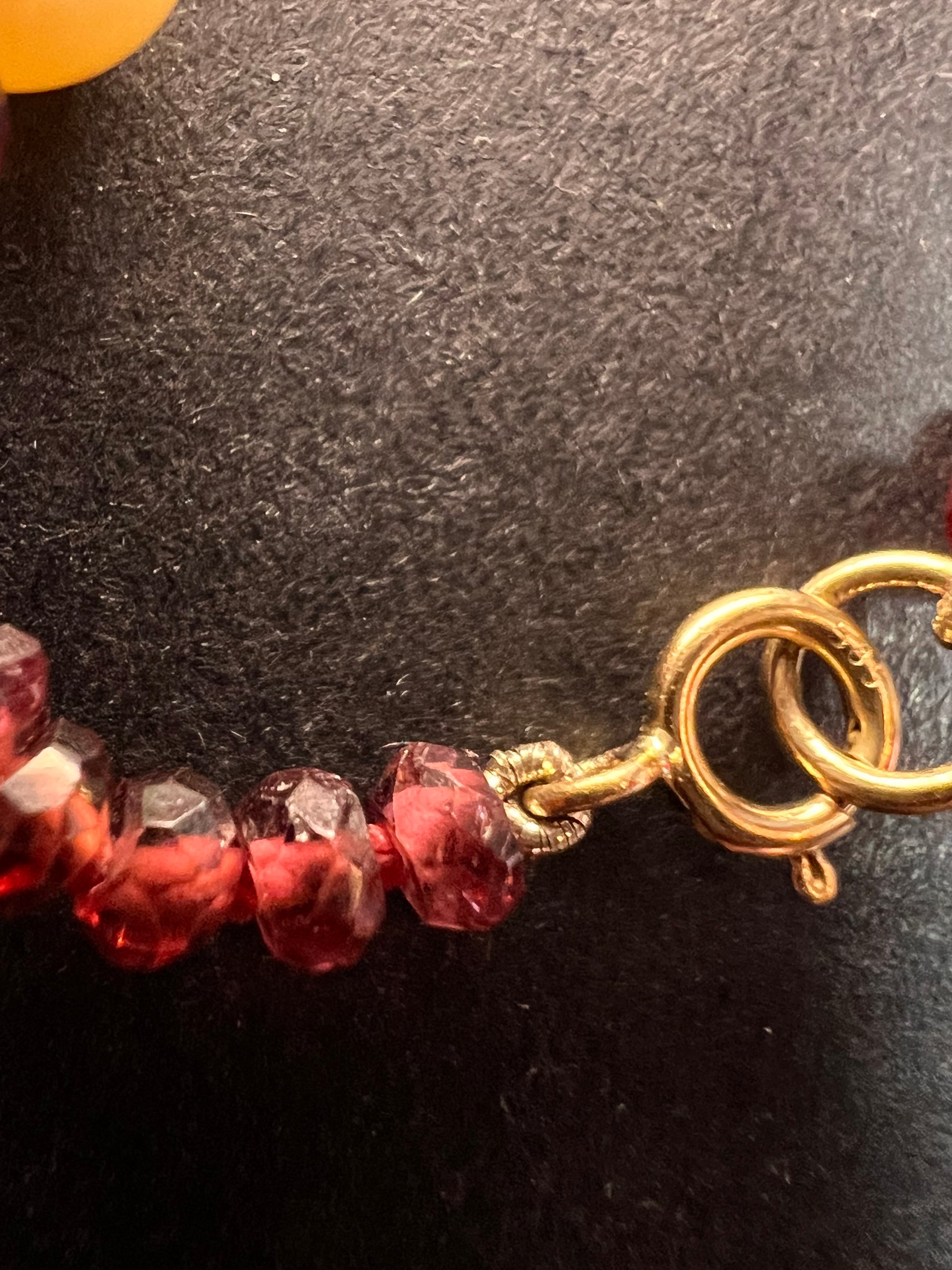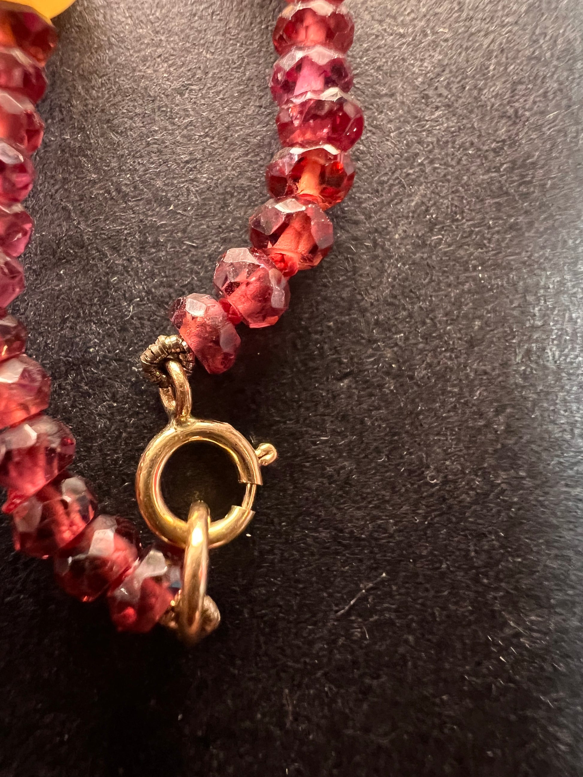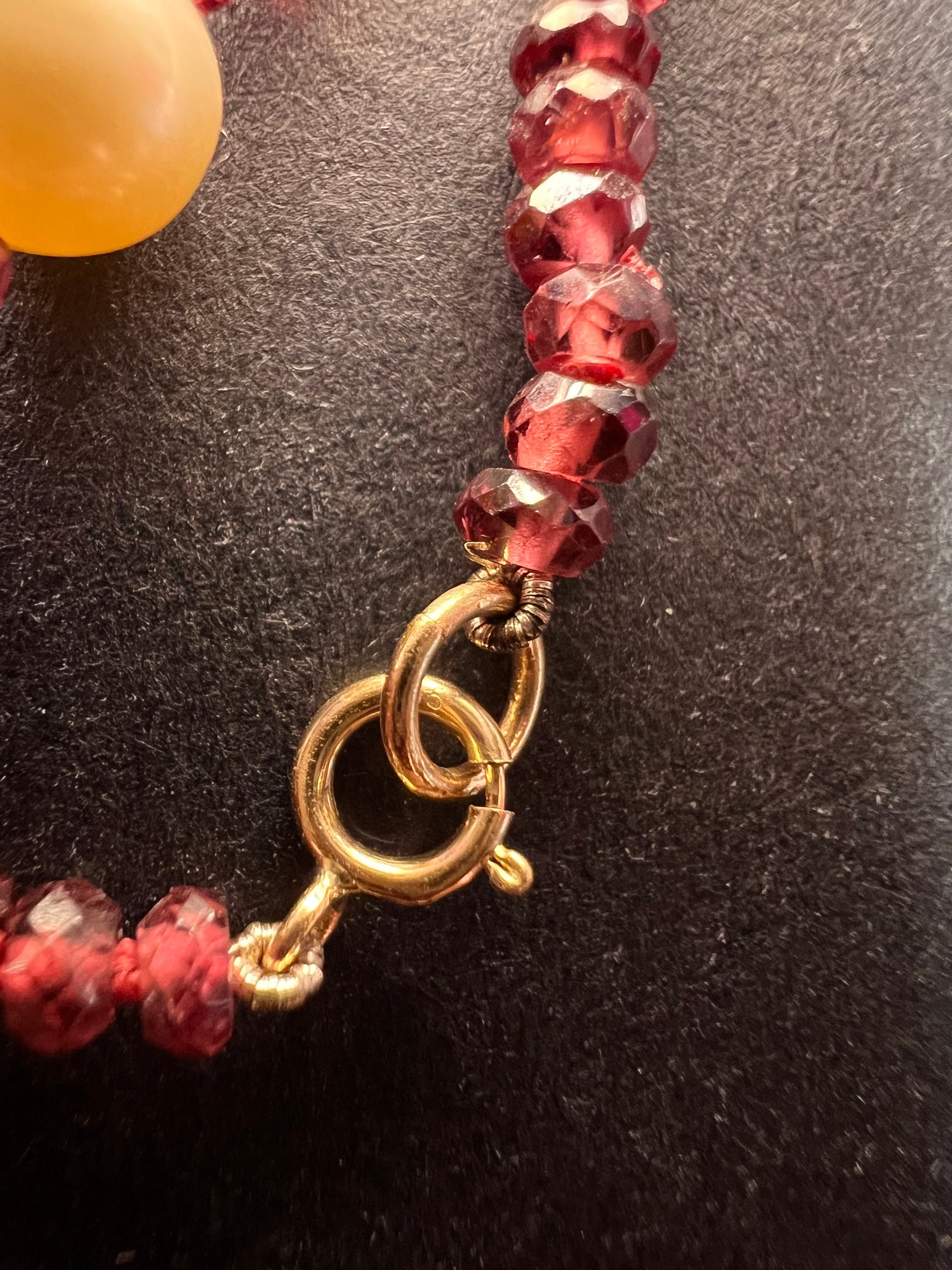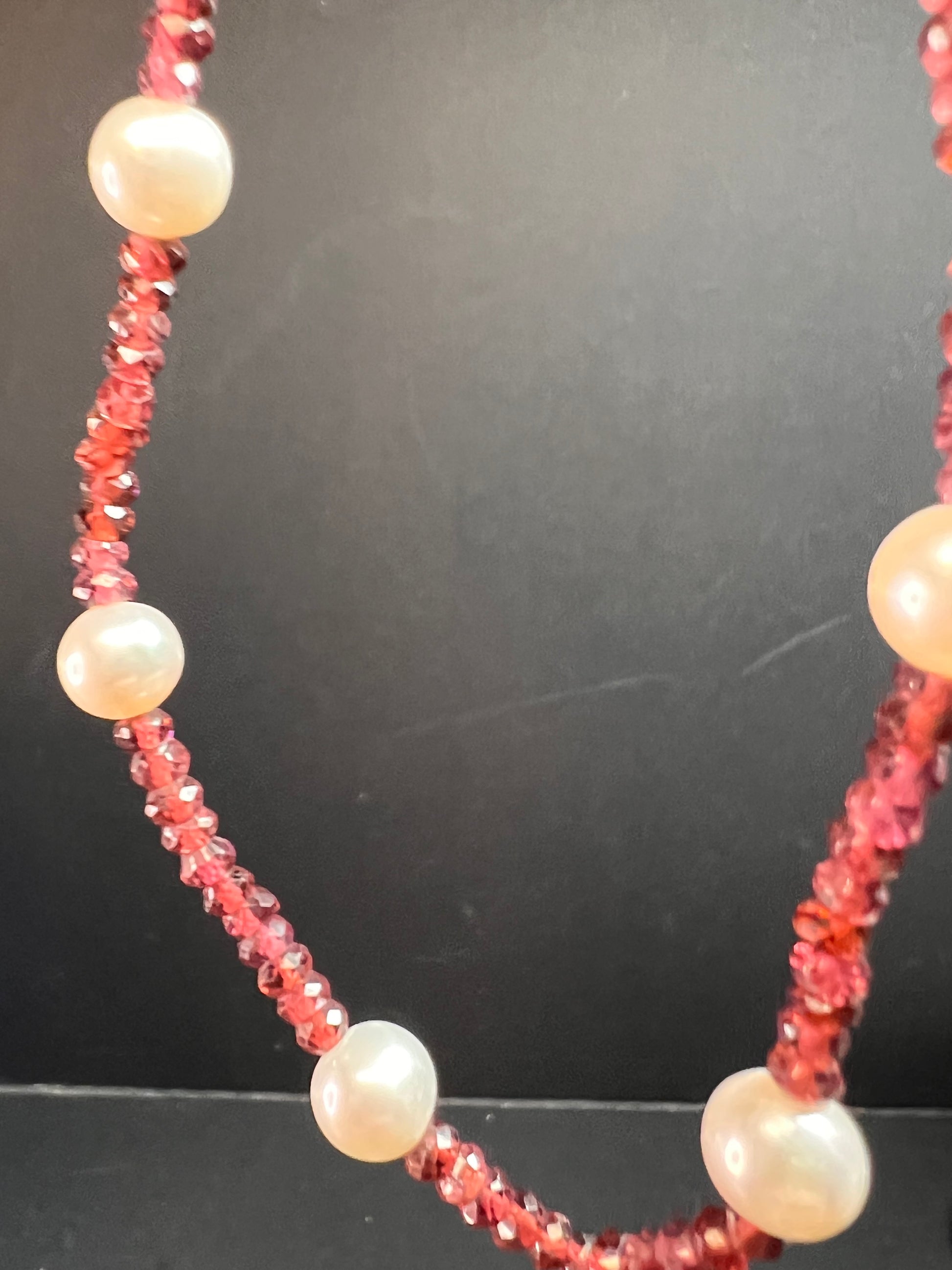 Genuine 3-4mm faceted rondelle gemmy rhodolite red garnet beads strung on an 18 inch strand , stationed with 15 7 mm white cultured pearls and finished with a 14k yellow gold spring ring clasp. No hallmark found. Clasp is stamped 585 for 14k gold.