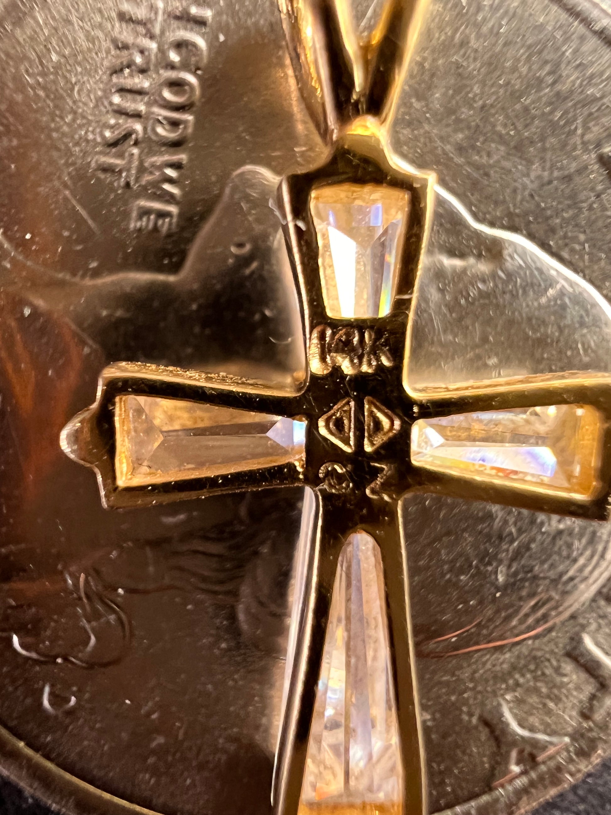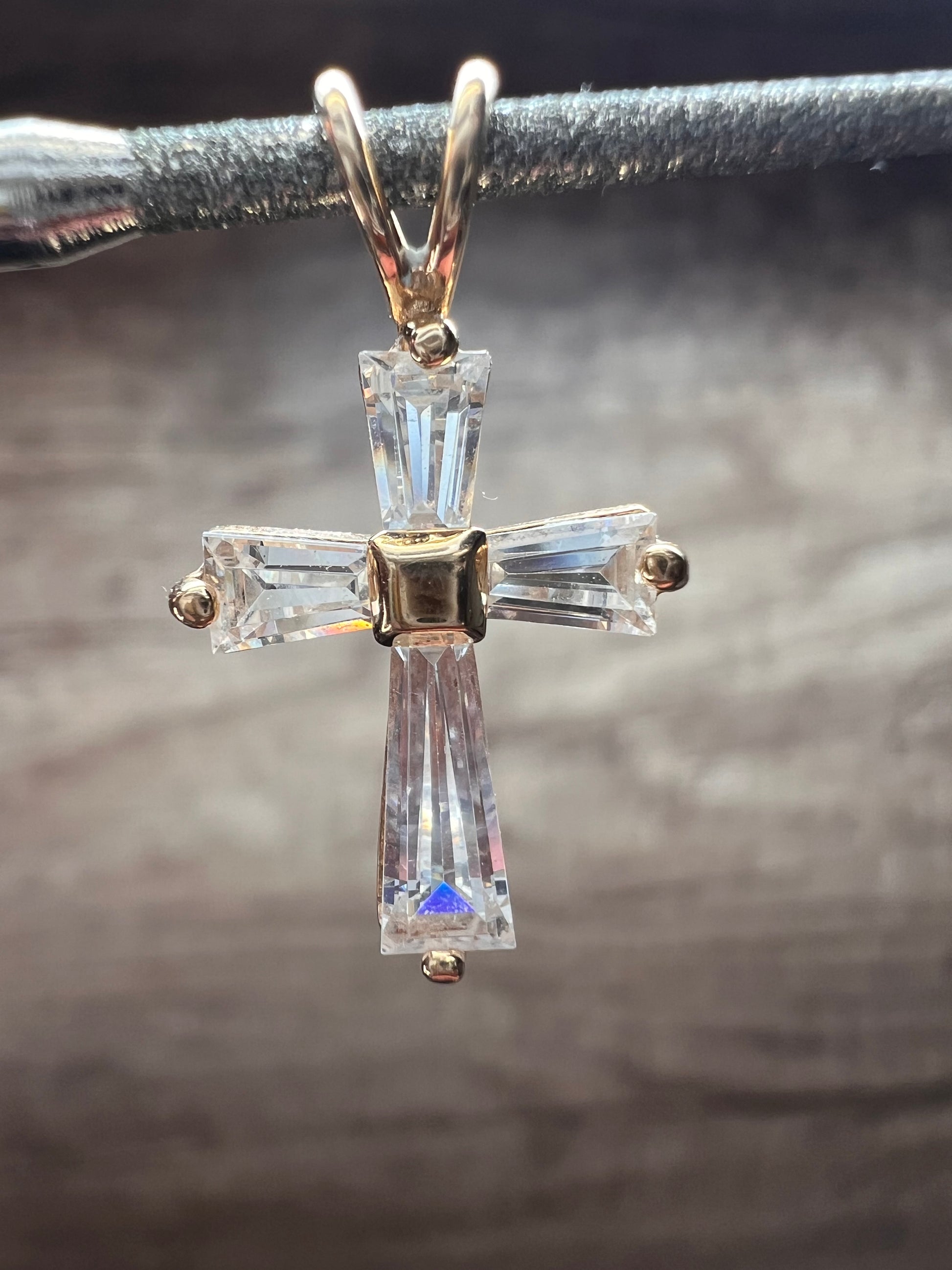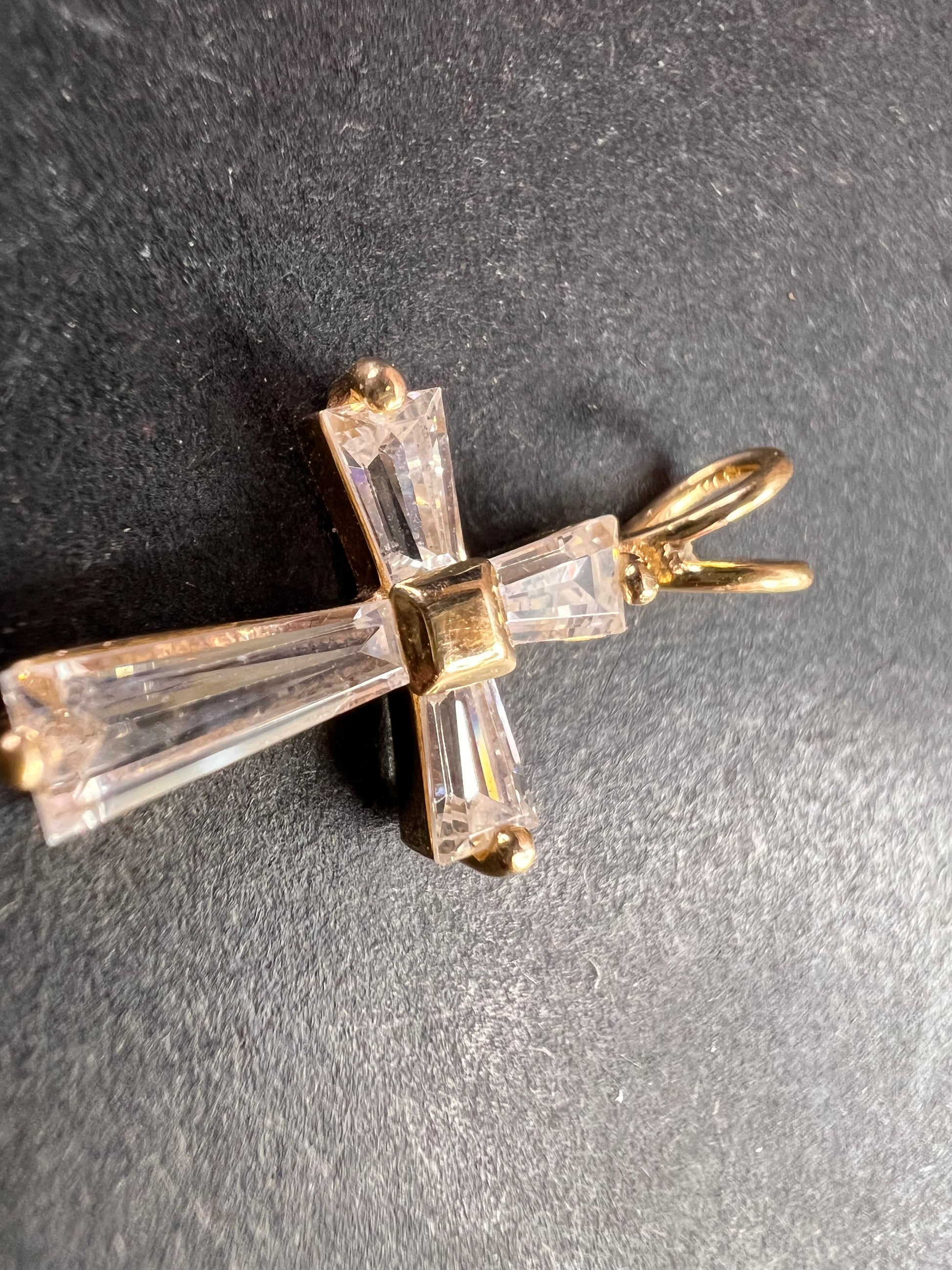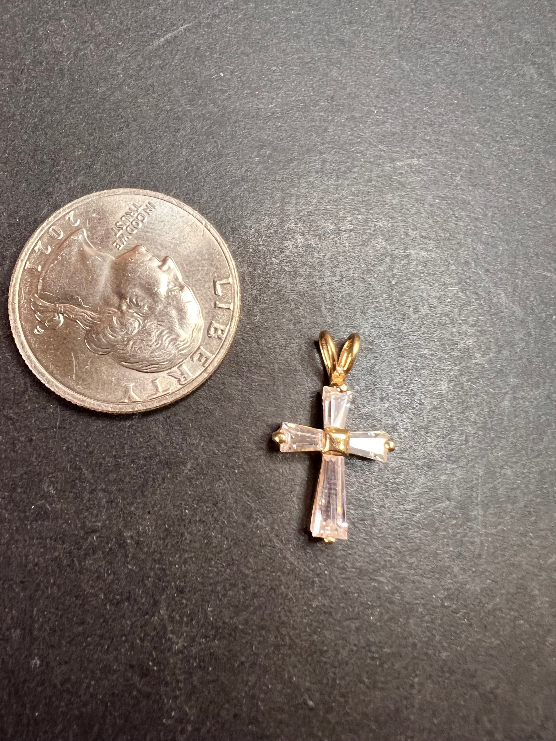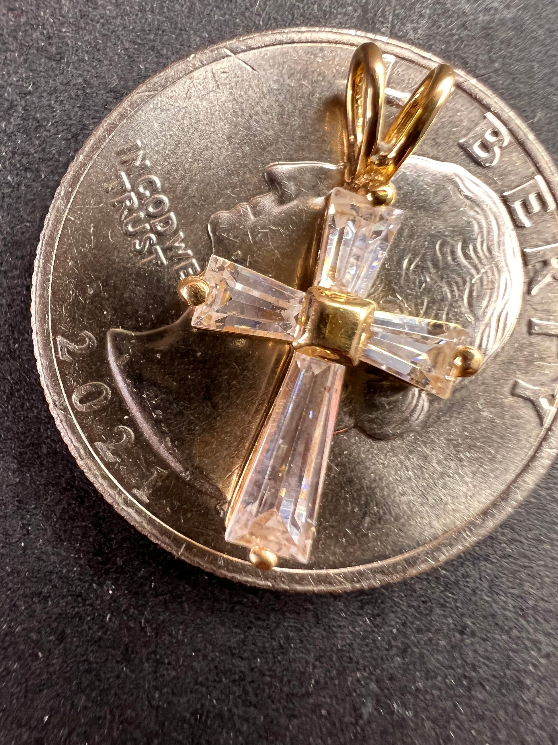Genuine 14k yellow gold cross pendant with white / colorless cubic zirconia prong set baguette gemstones. Total weight is 1.17 grams. Measures about 20x11.6 mm. Purity stamp on back. Unknown hallmark.