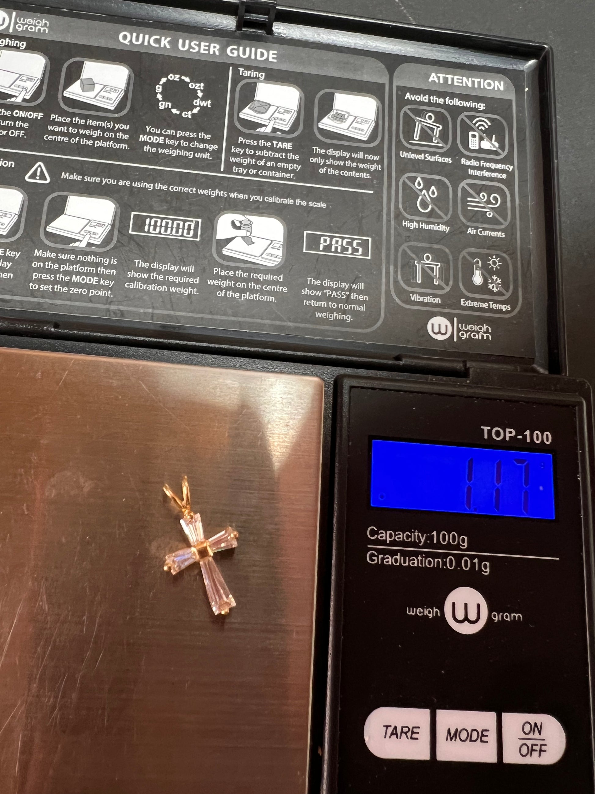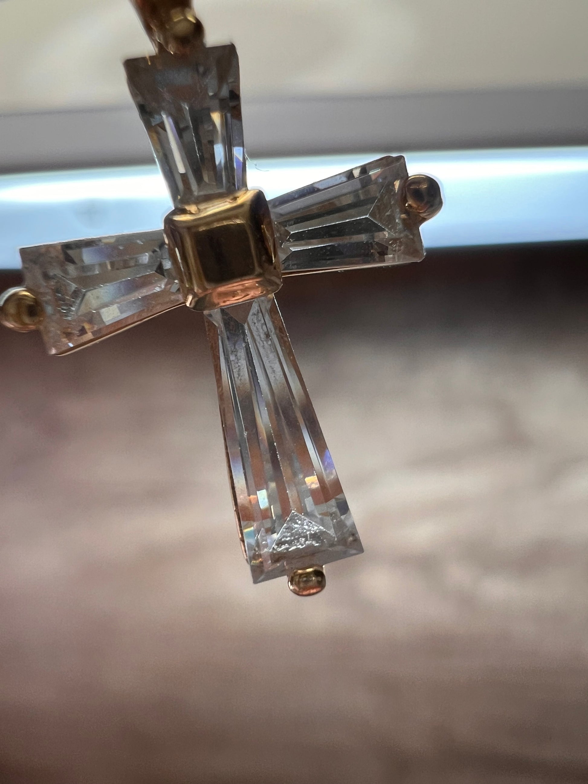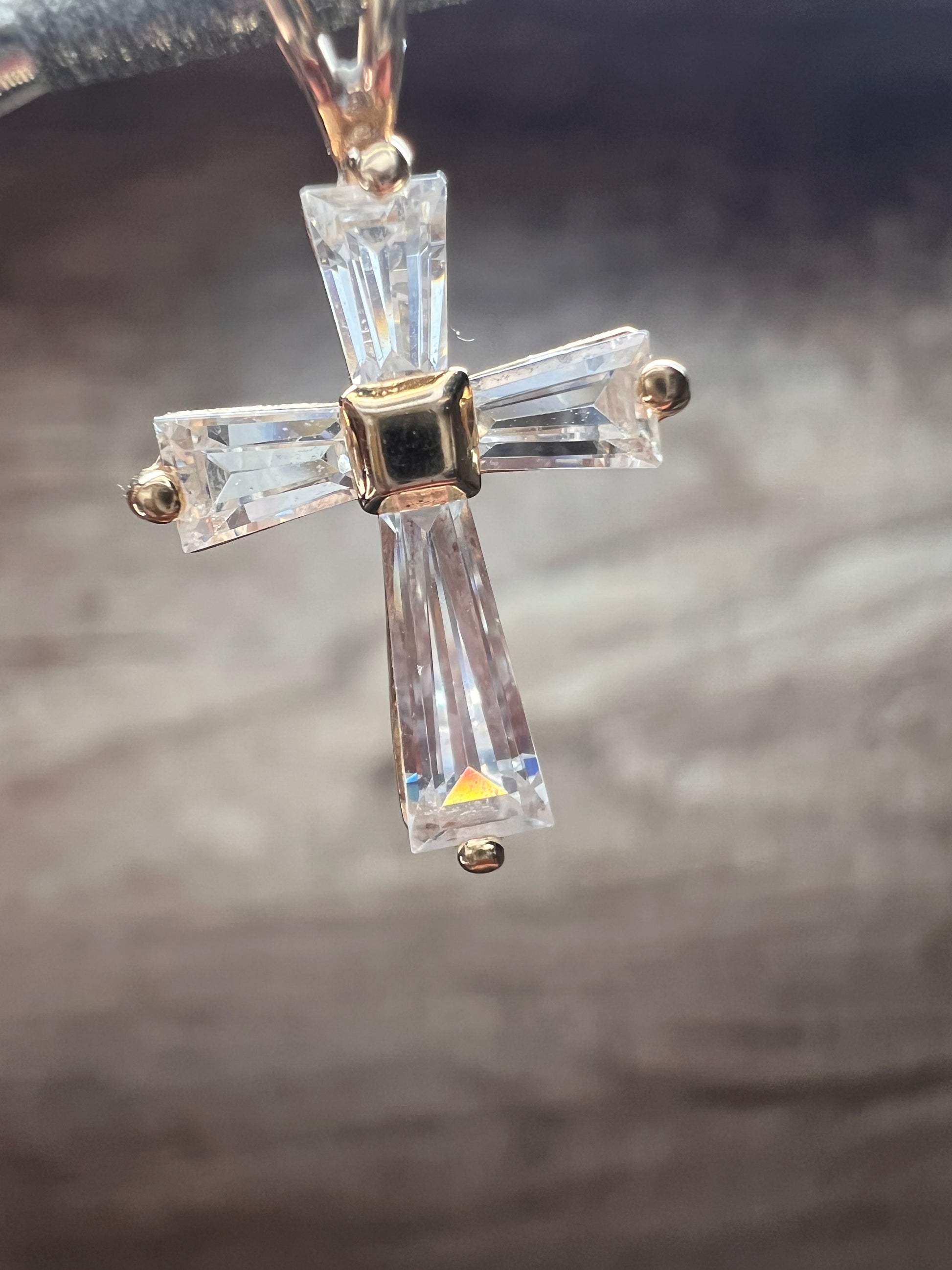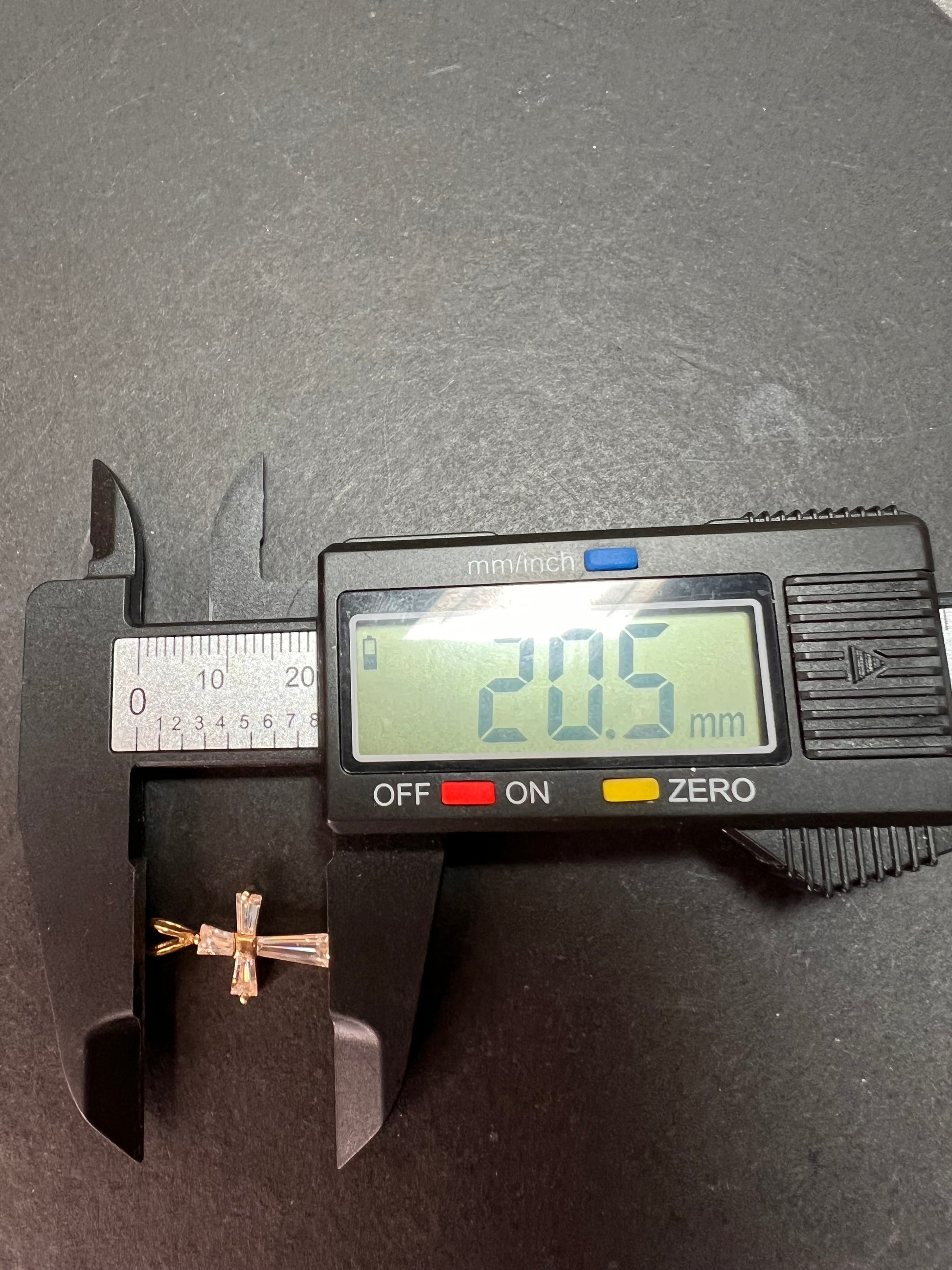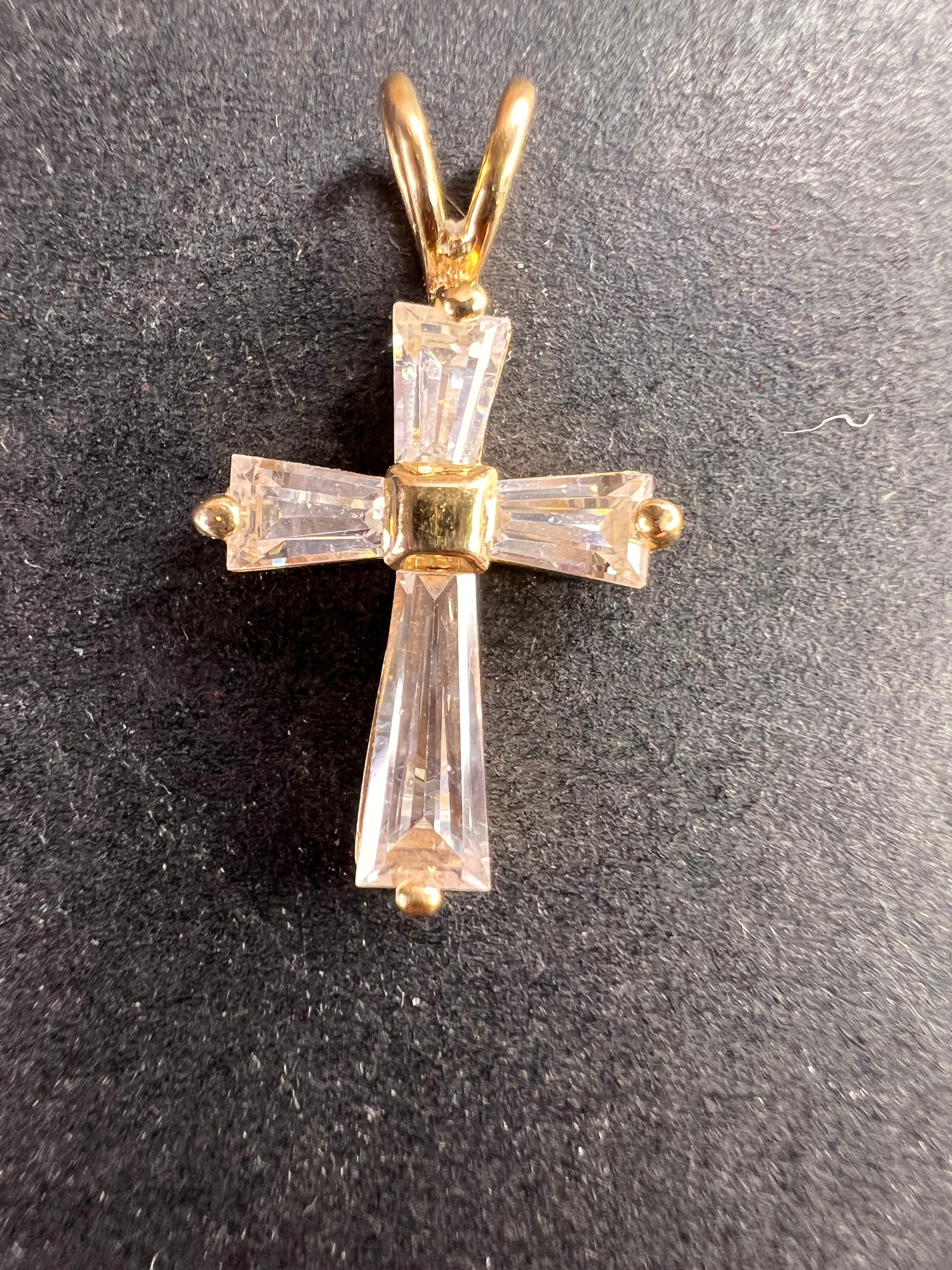 Genuine 14k yellow gold cross pendant with white / colorless cubic zirconia prong set baguette gemstones. Total weight is 1.17 grams. Measures about 20x11.6 mm. Purity stamp on back. Unknown hallmark.