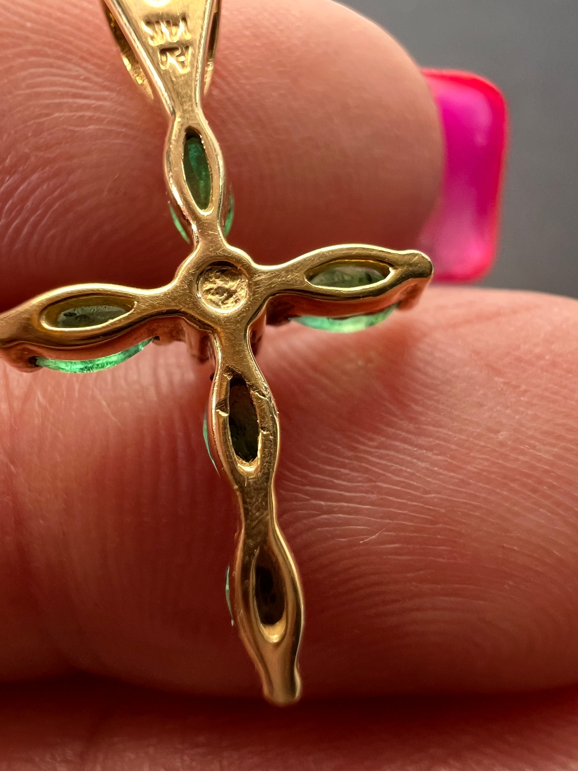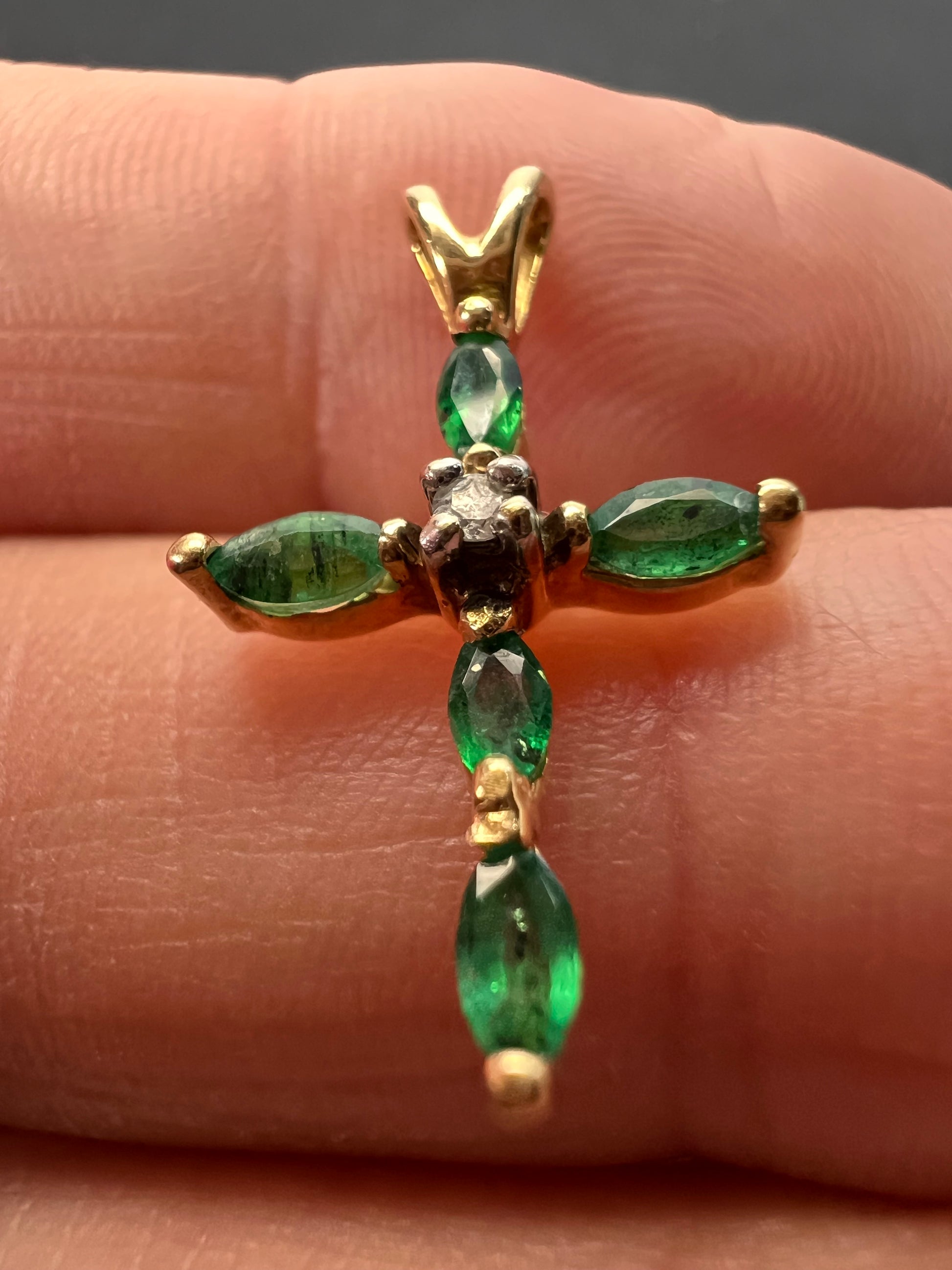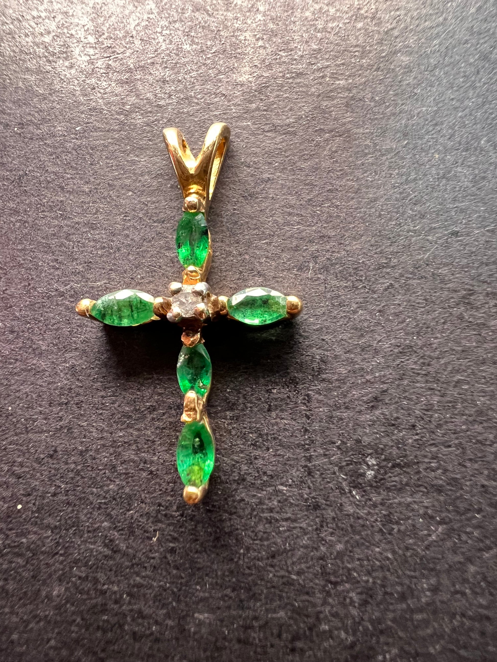 14k yellow gold cross pendant with emeralds and a diamond in the center. Stones have been tested for authenticity . Gold has been acid tested for purity. Total weight is 1.18 grams