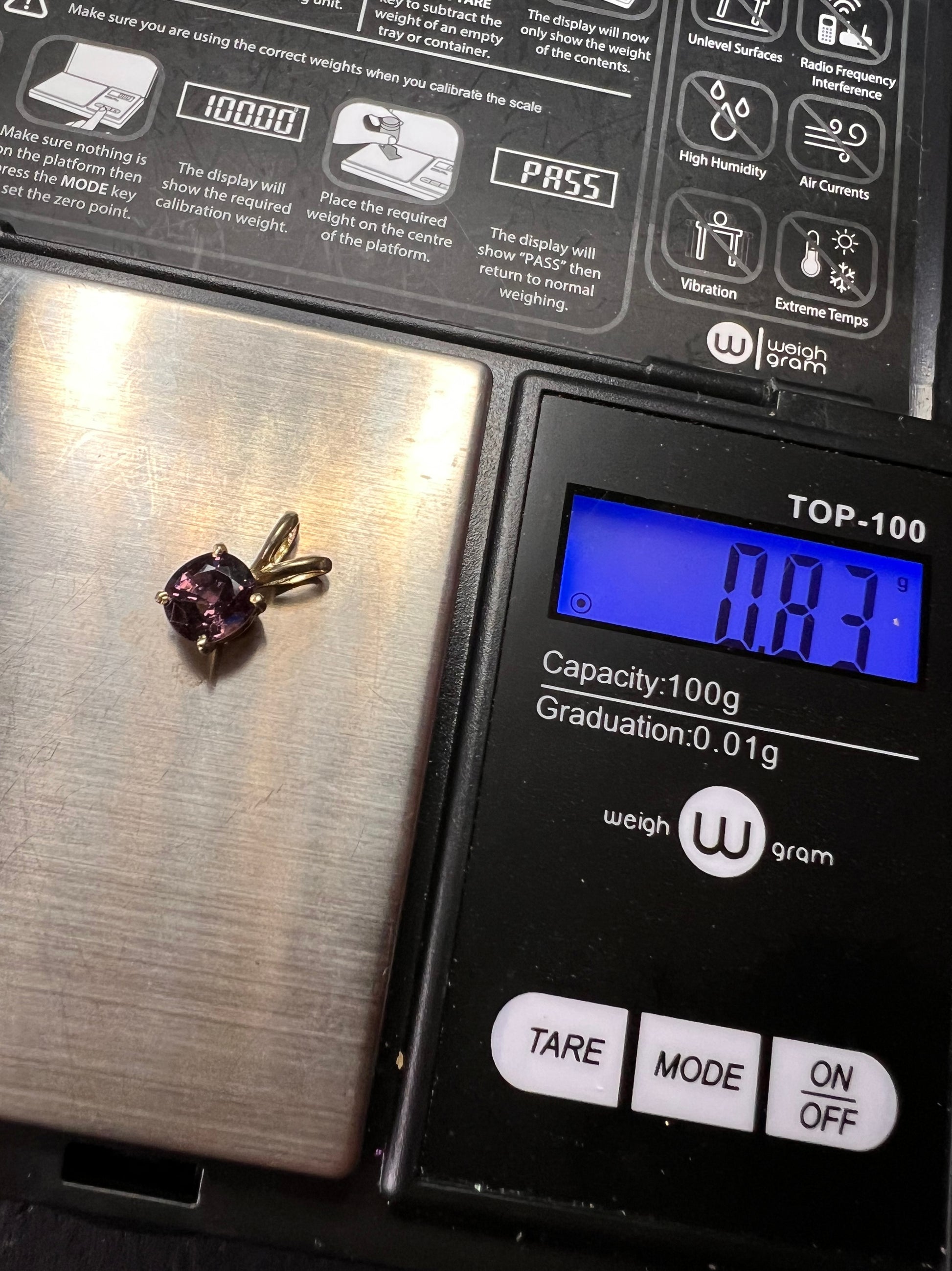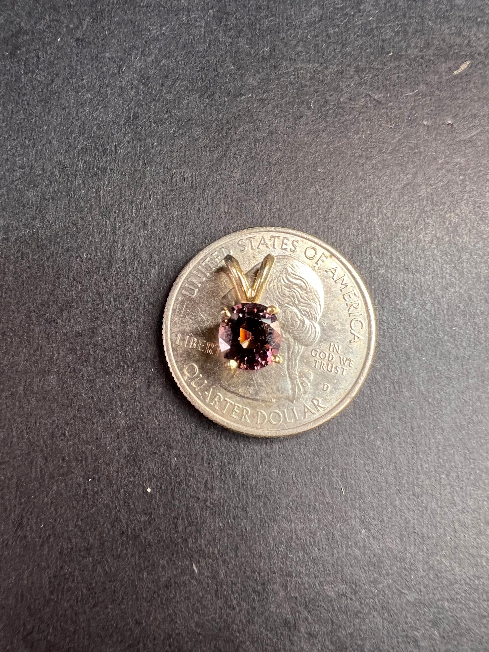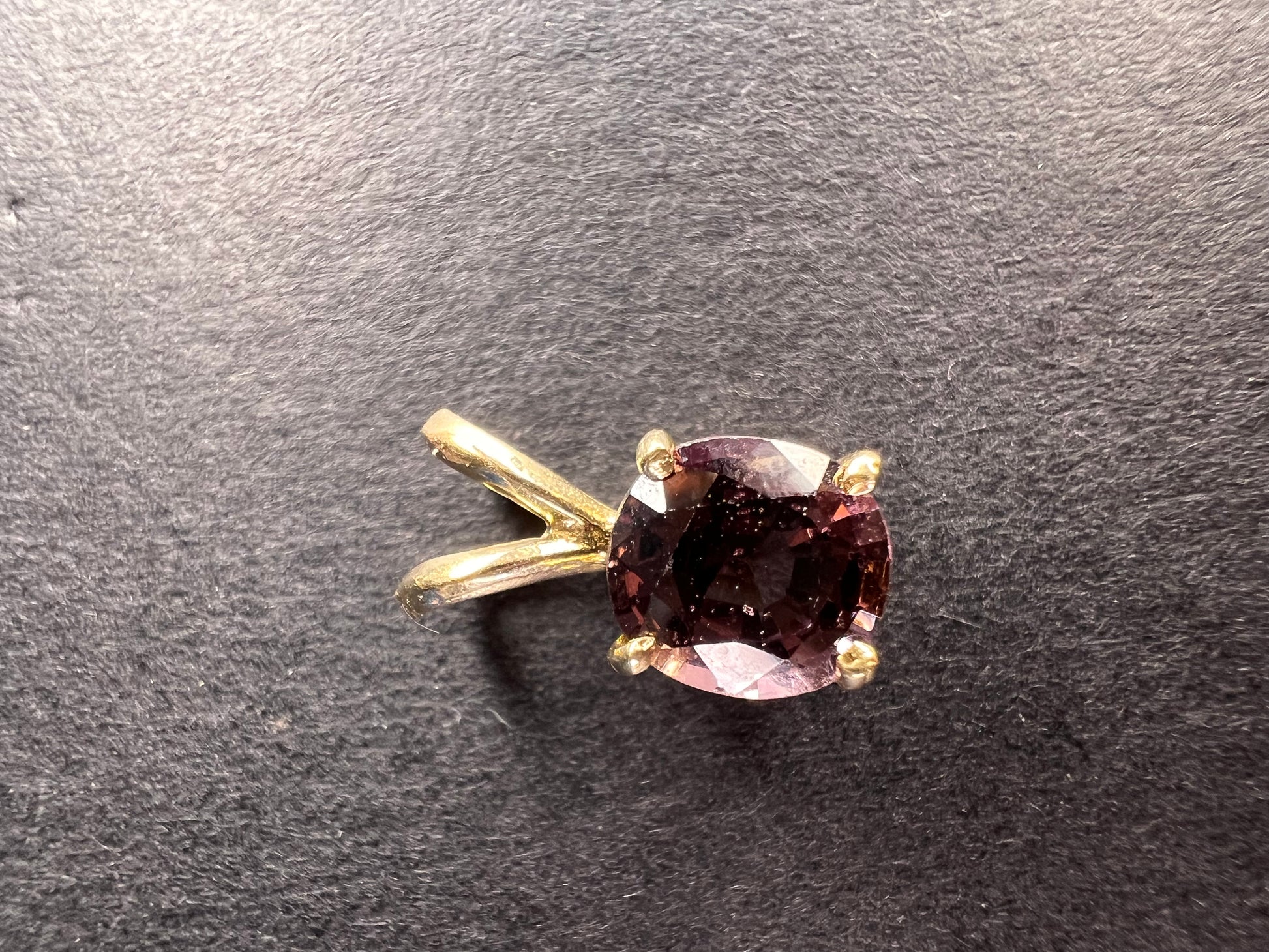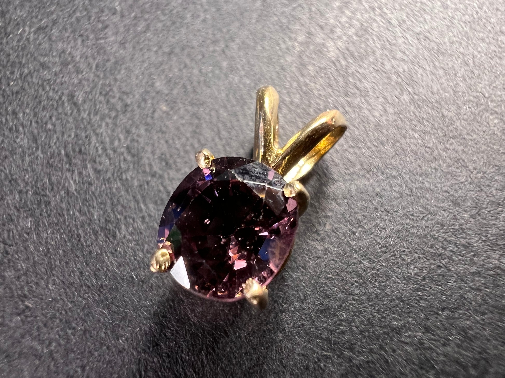 Purple spinel gemstone prong set in authentic 14k yellow gold. Stones measures roughly 6.5mm x 7mm. No purity stamp found on pendant but it has been acid tested , tested with a Kee gold tester as well as my local refinery. (See photos). Gemstone has been tested with a presidium gem tester as well as viewed under magnification and verified through a jeweler but no papers as that’s an extra costly expense. Spinel had lots of natural inclusions and glows bright red under UV light and has a total weight of .83 grams. This is for the pendant only. Chain not included.