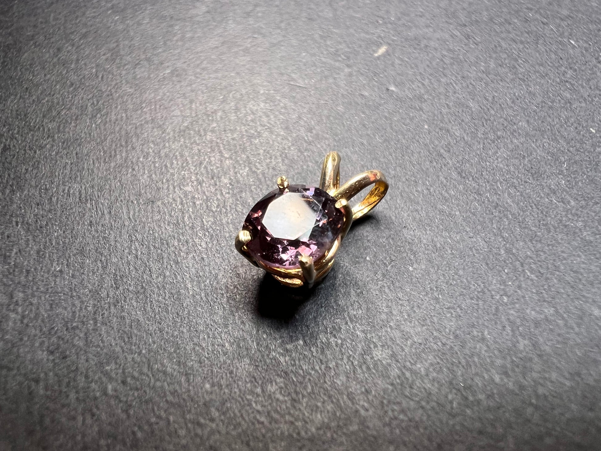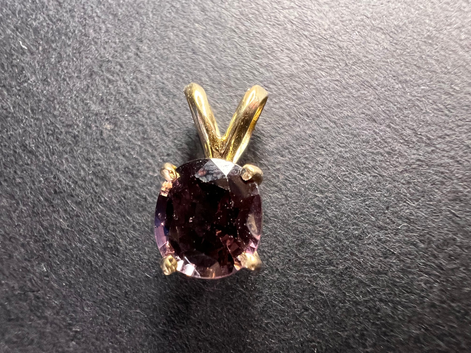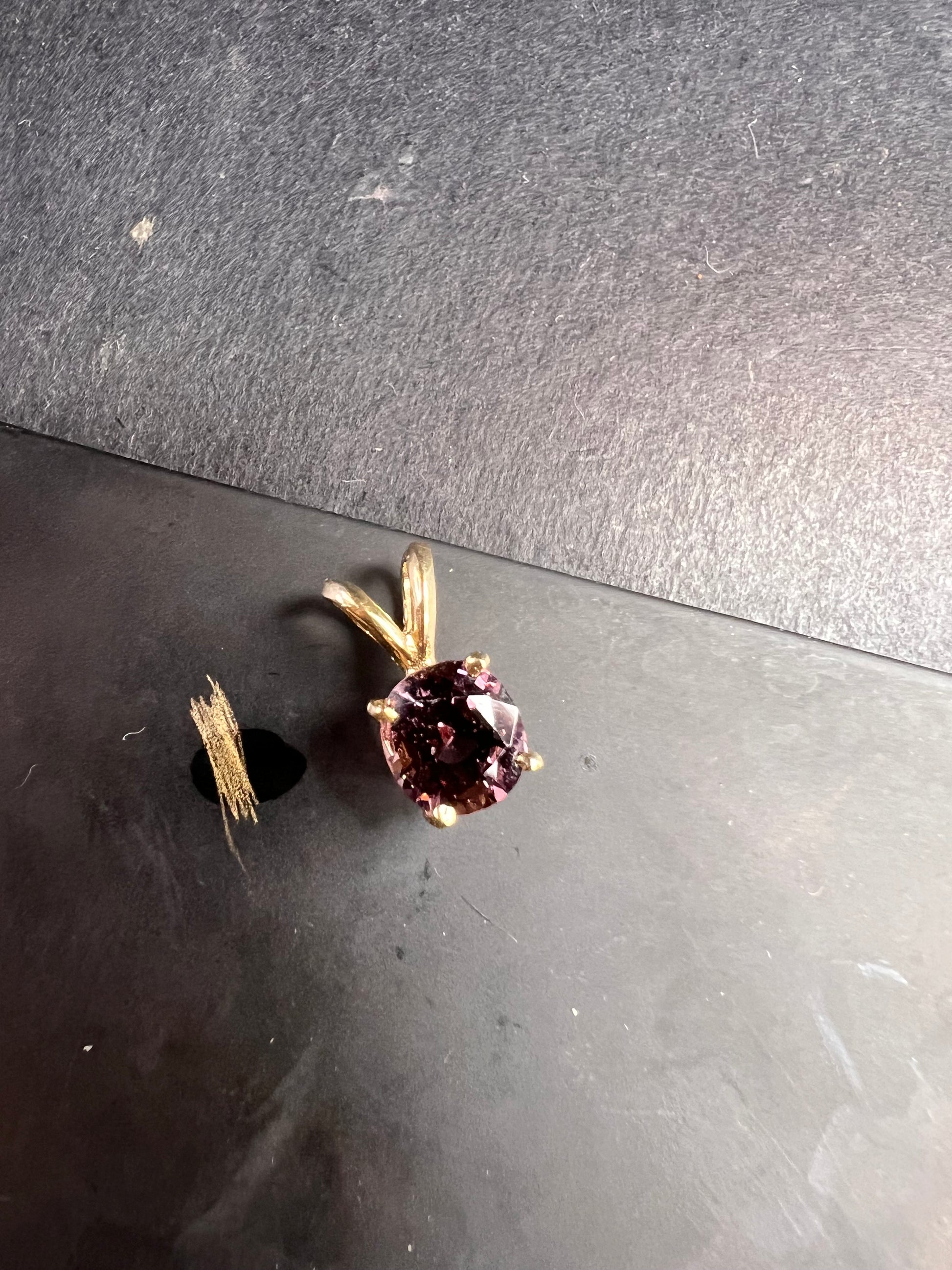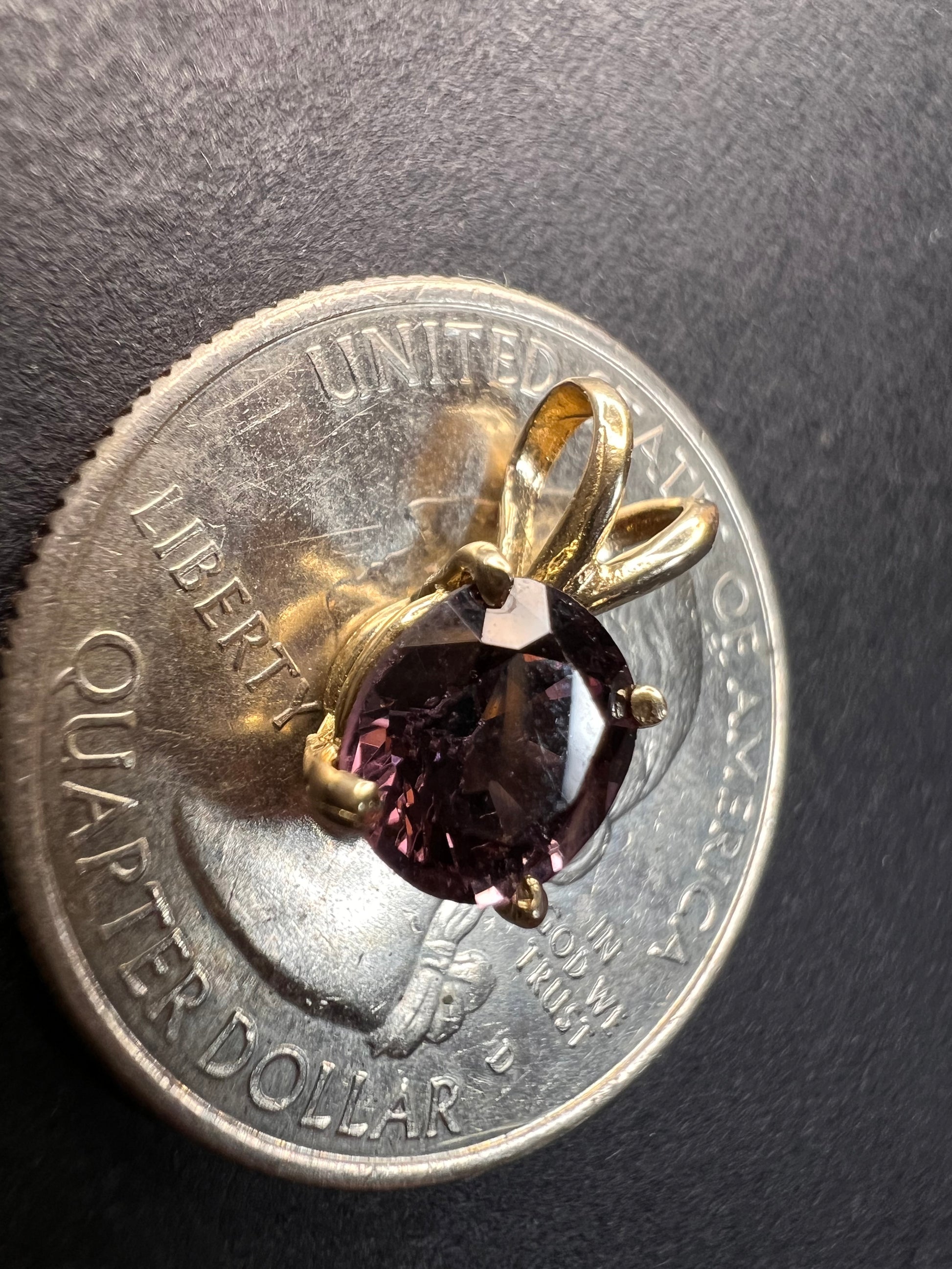 Purple spinel gemstone prong set in authentic 14k yellow gold. Stones measures roughly 6.5mm x 7mm. No purity stamp found on pendant but it has been acid tested , tested with a Kee gold tester as well as my local refinery. (See photos). Gemstone has been tested with a presidium gem tester as well as viewed under magnification and verified through a jeweler but no papers as that’s an extra costly expense. Spinel had lots of natural inclusions and glows bright red under UV light and has a total weight of .83 grams. This is for the pendant only. Chain not included.