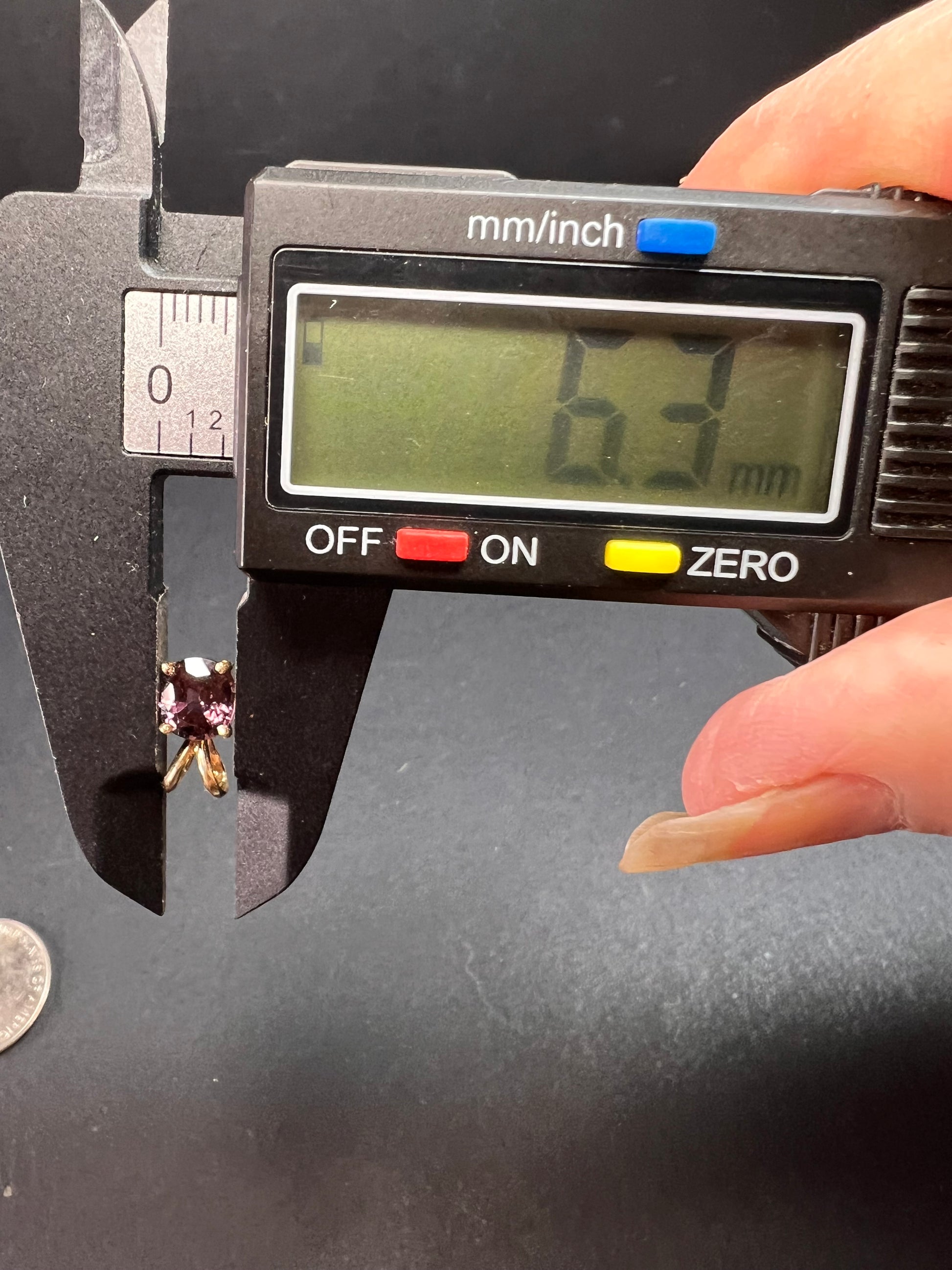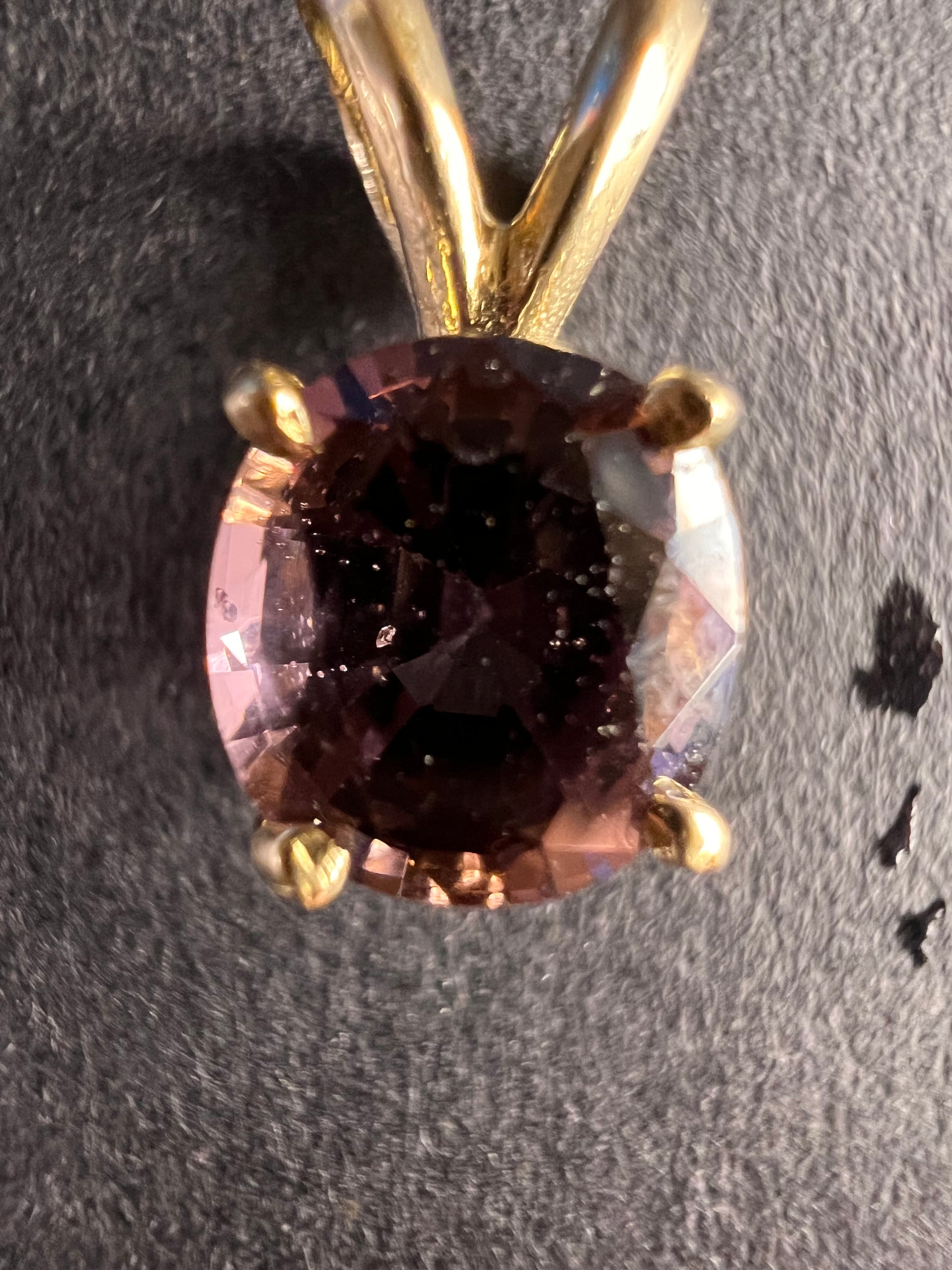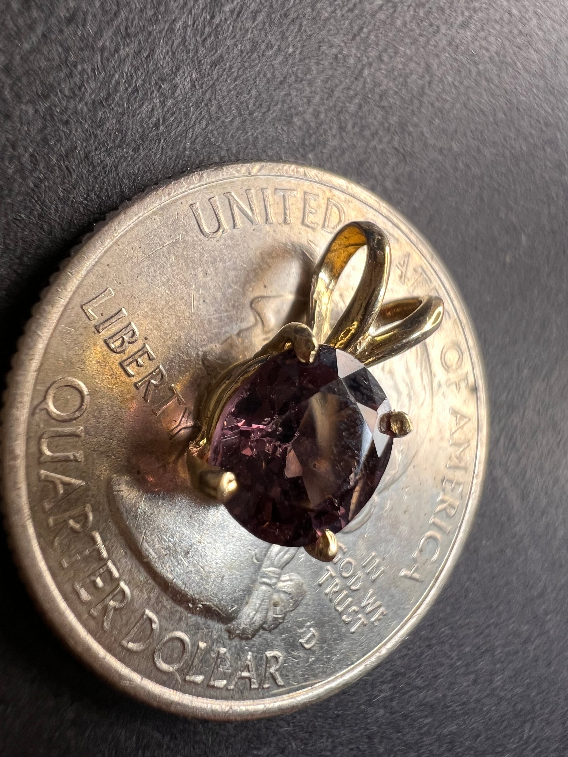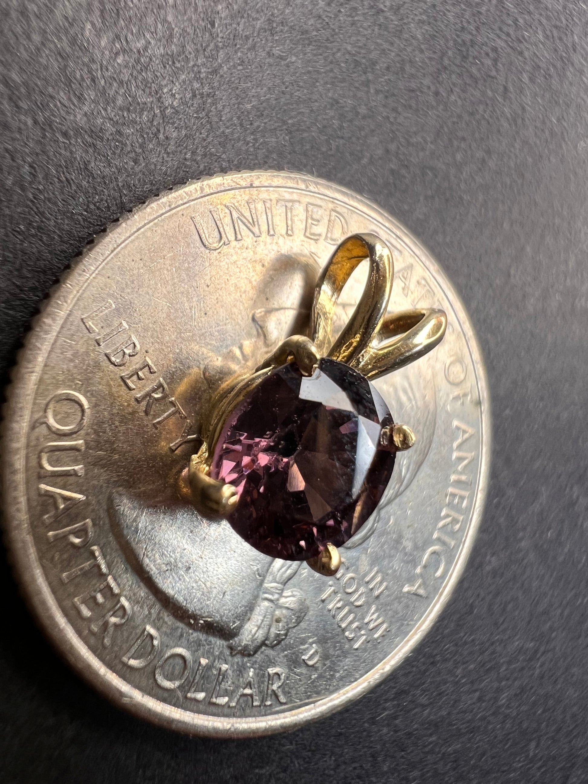 Purple spinel gemstone prong set in authentic 14k yellow gold. Stones measures roughly 6.5mm x 7mm. No purity stamp found on pendant but it has been acid tested , tested with a Kee gold tester as well as my local refinery. (See photos). Gemstone has been tested with a presidium gem tester as well as viewed under magnification and verified through a jeweler but no papers as that’s an extra costly expense. Spinel had lots of natural inclusions and glows bright red under UV light and has a total weight of .83 grams. This is for the pendant only. Chain not included.