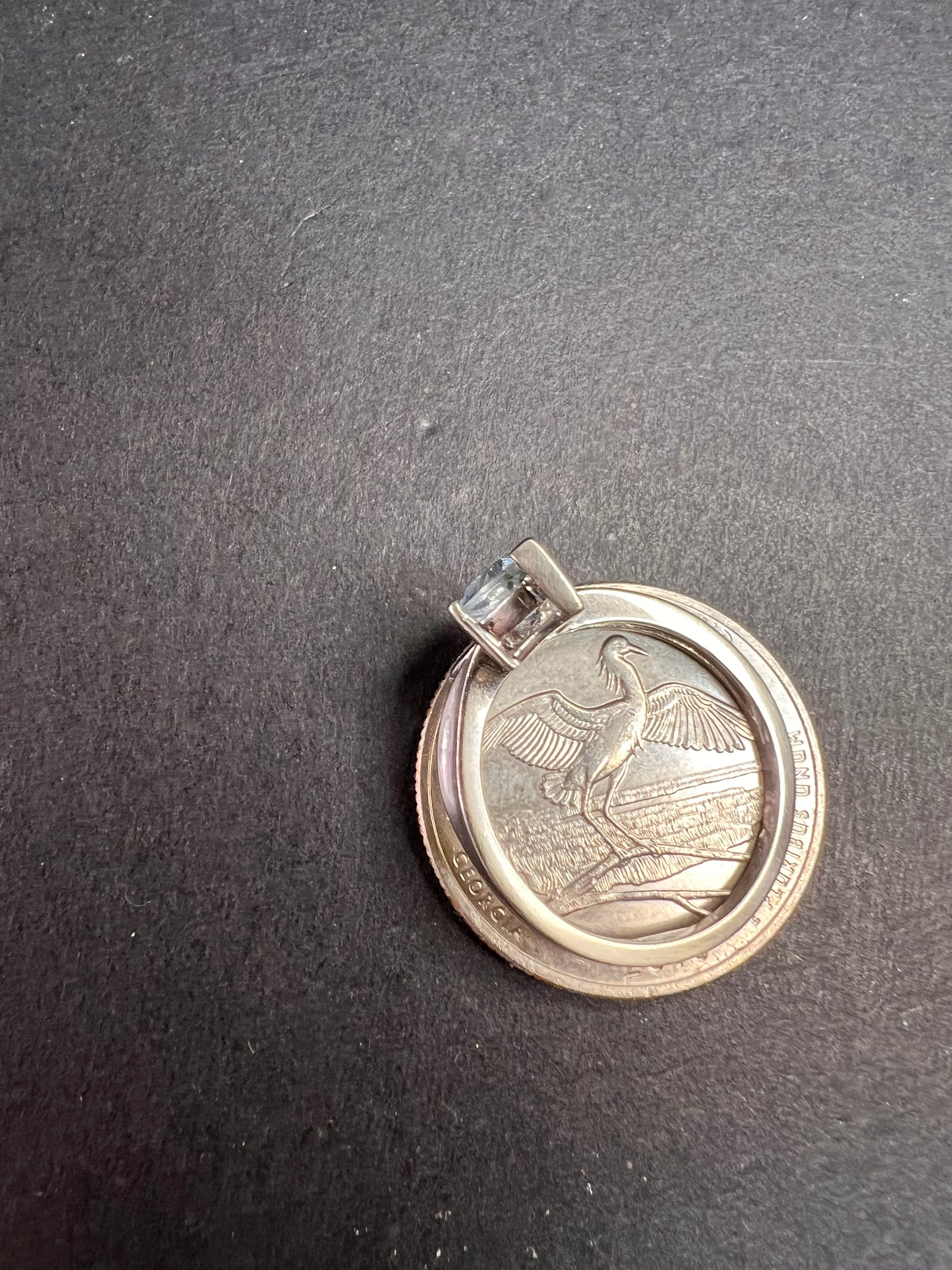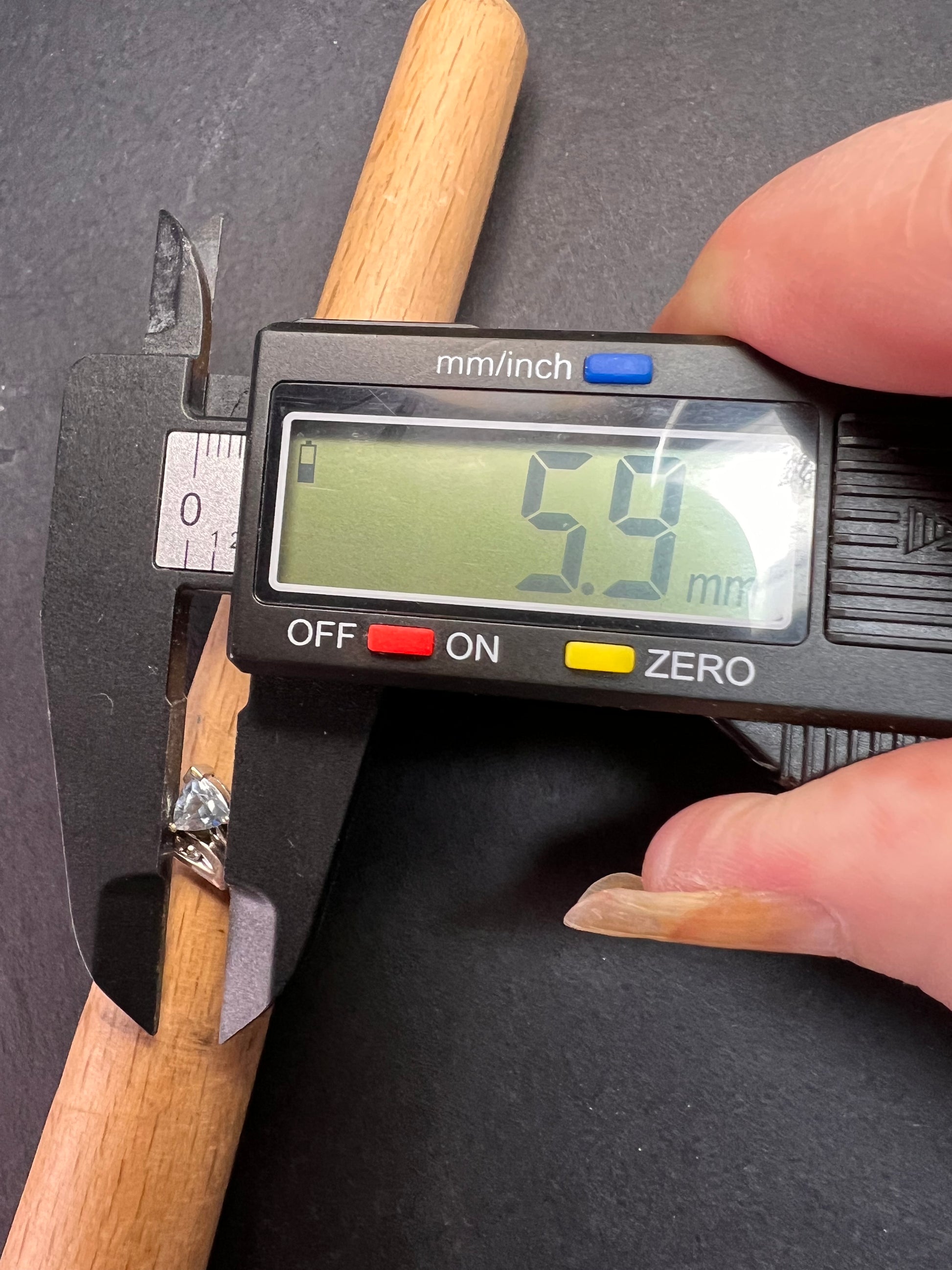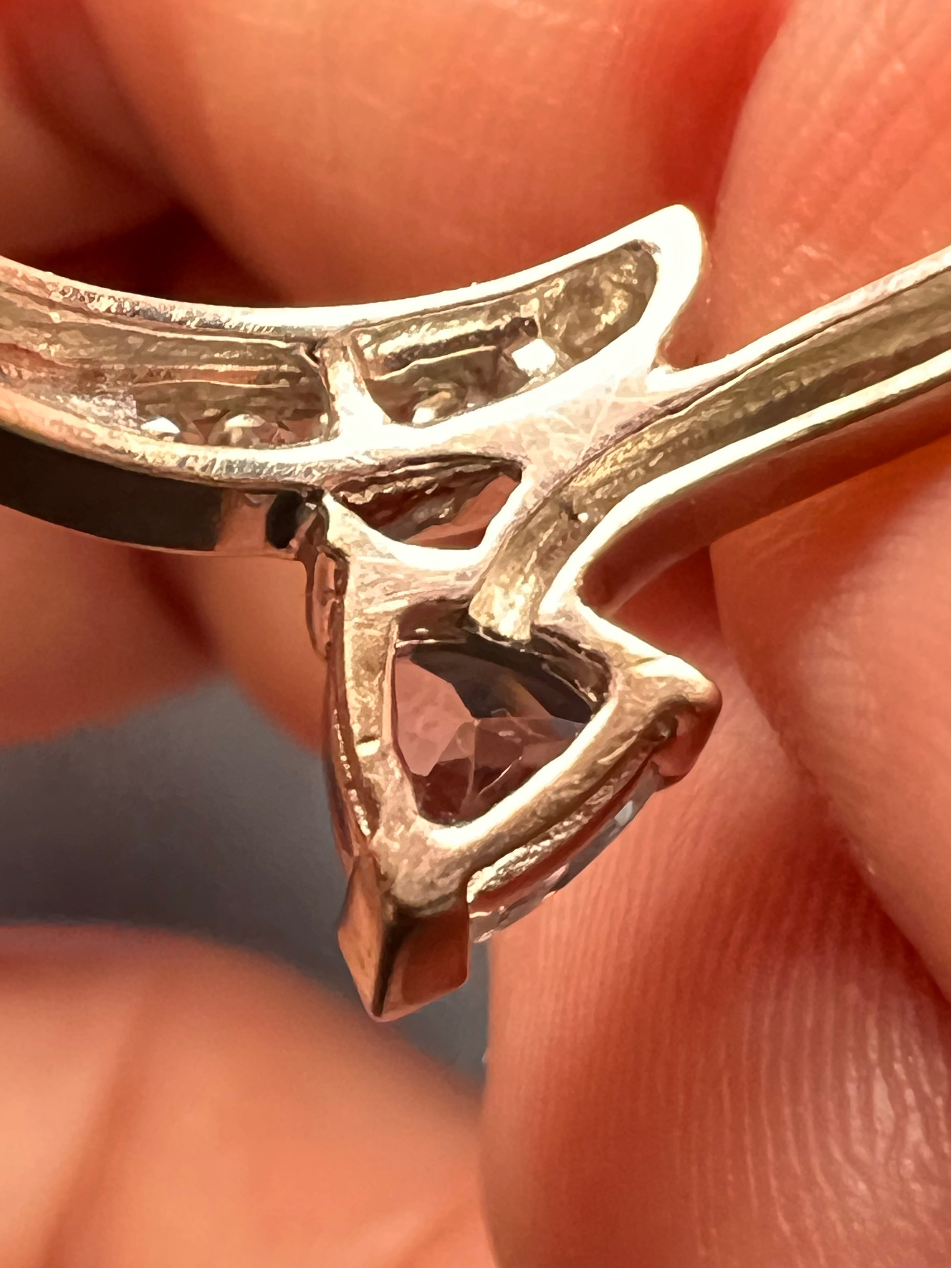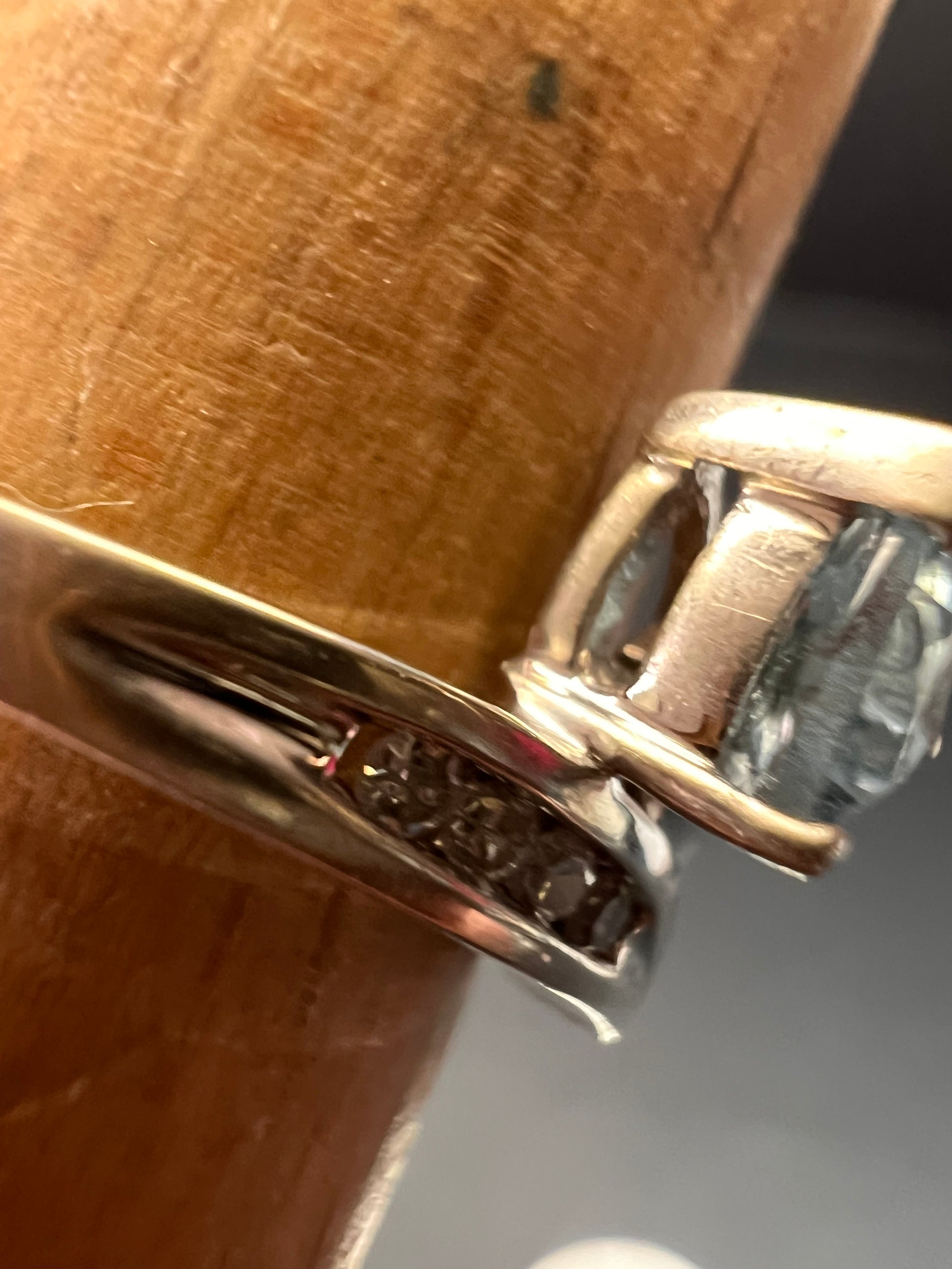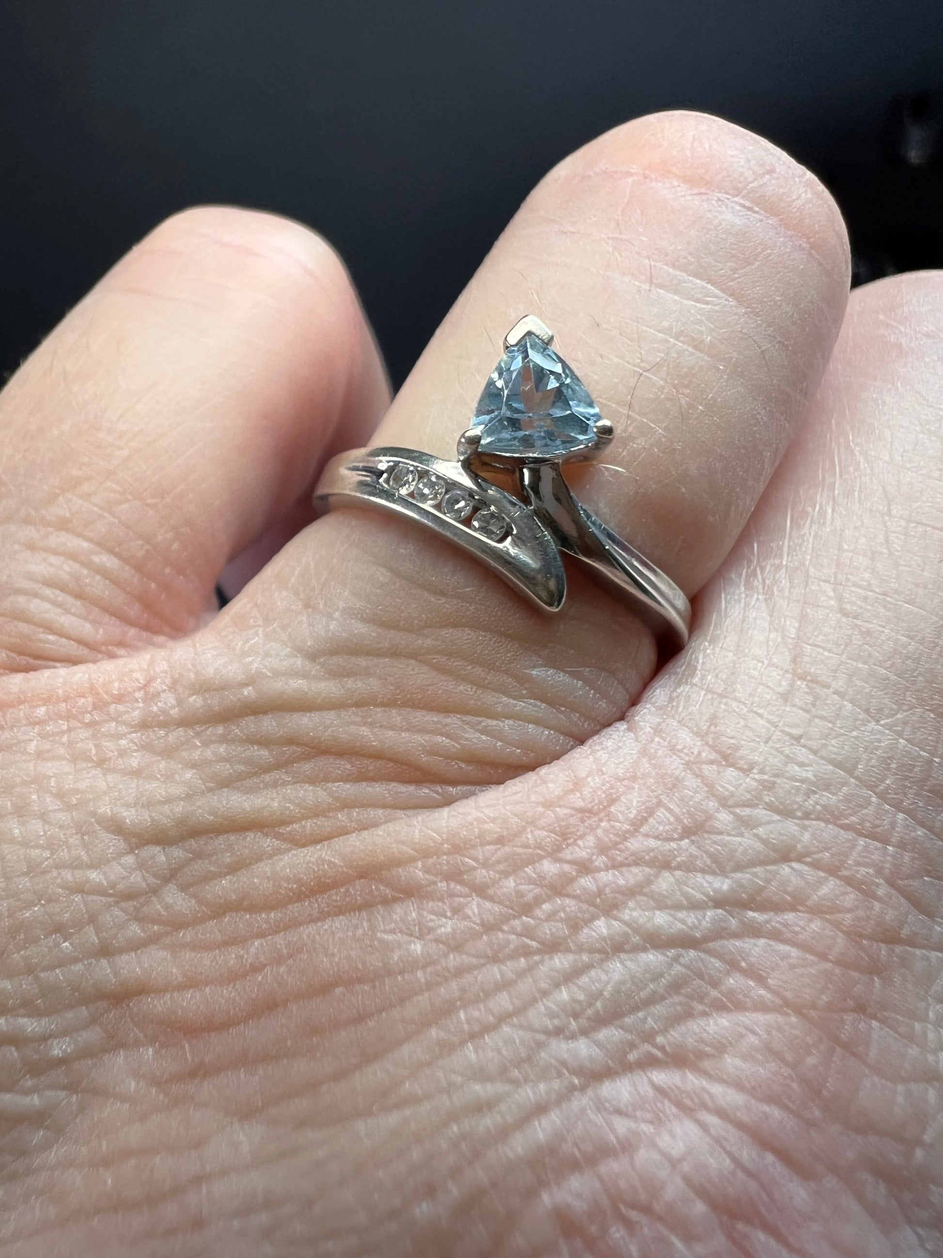 Genuine trillion / trillium cut aquamarine gemstone measuring roughly about 5.5mm around the setting on all sides. 4 earth mined diamond accents channel set that measure roughly about 1.5mm in diameter. I believe that’s about .06 total ctw in diamonds. And I believe the ctw for the aquamarine is between .55-.71 ctw. Total weight of ring is 2.29 grams. Stamped 14k THL for Samuel Aaron.