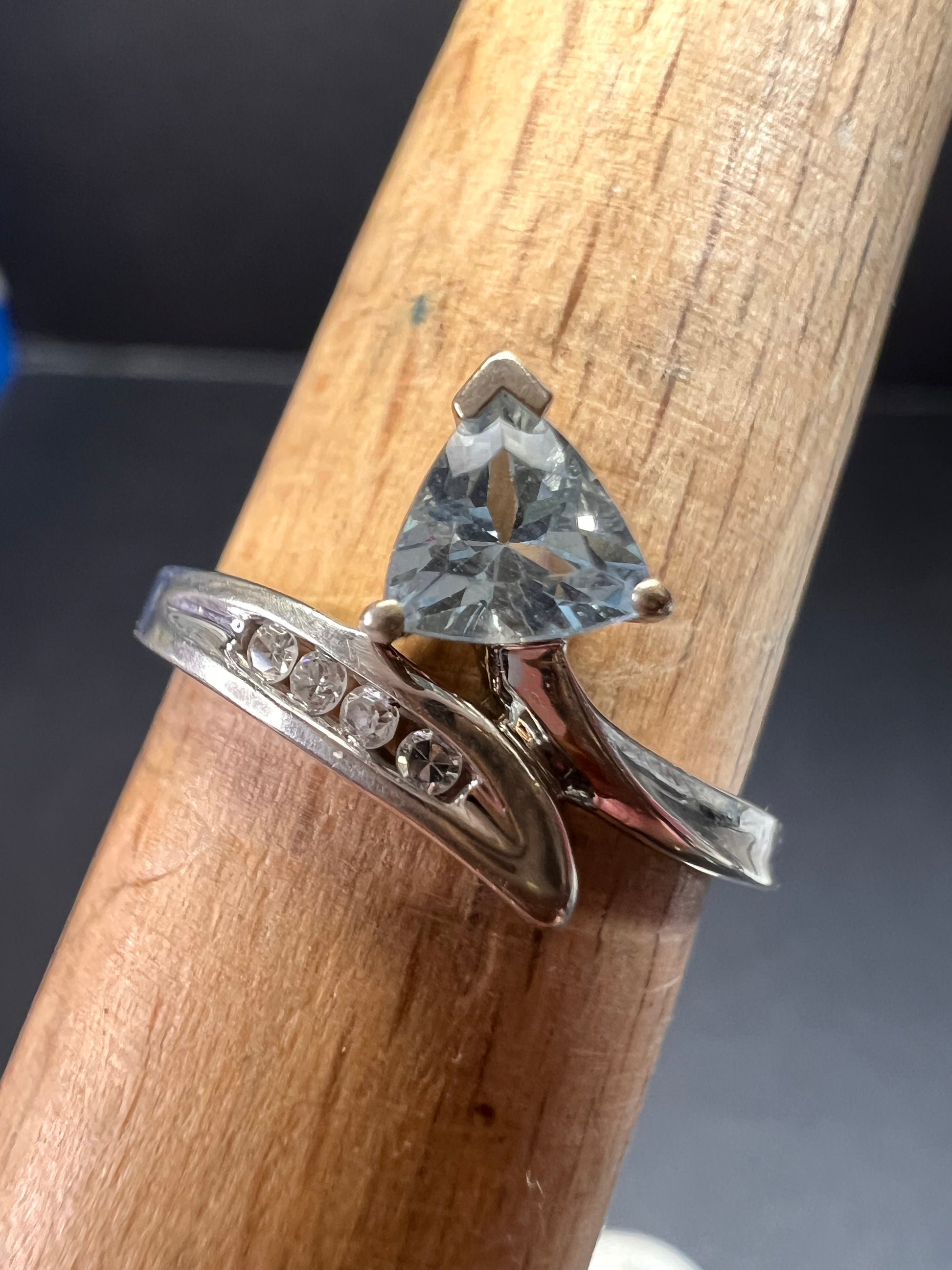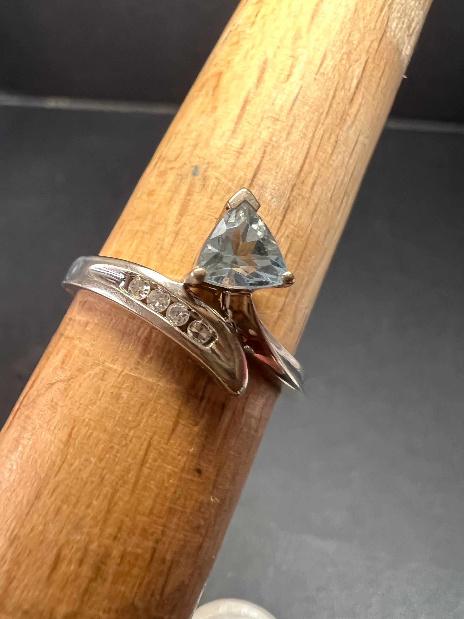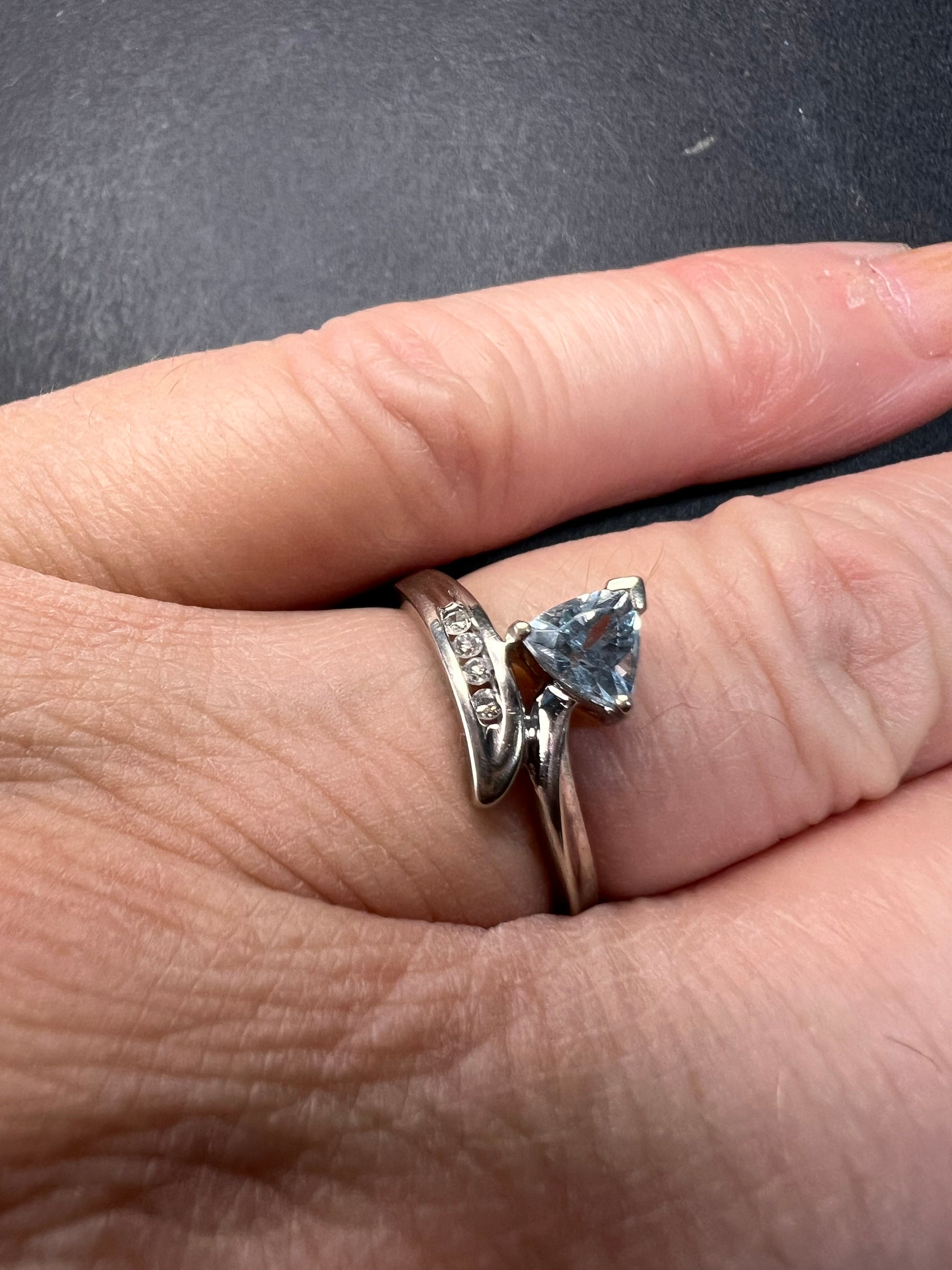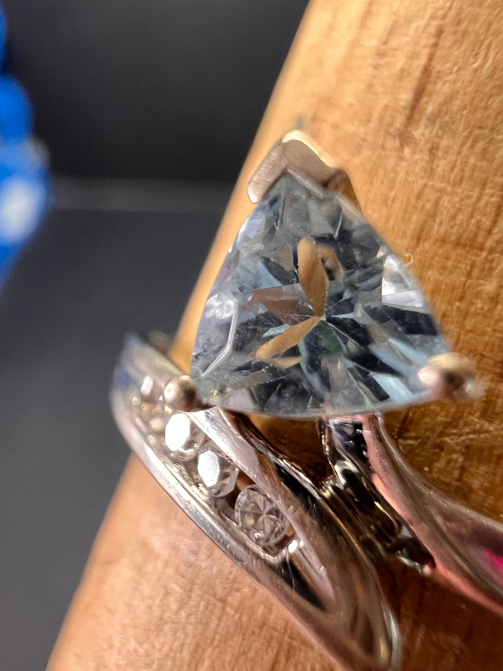 14k white gold Samuel Aaron trillion cut aquamarine and diamond ring size 6.5