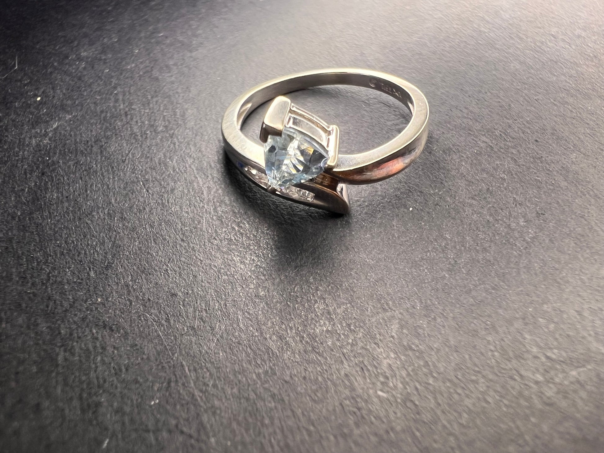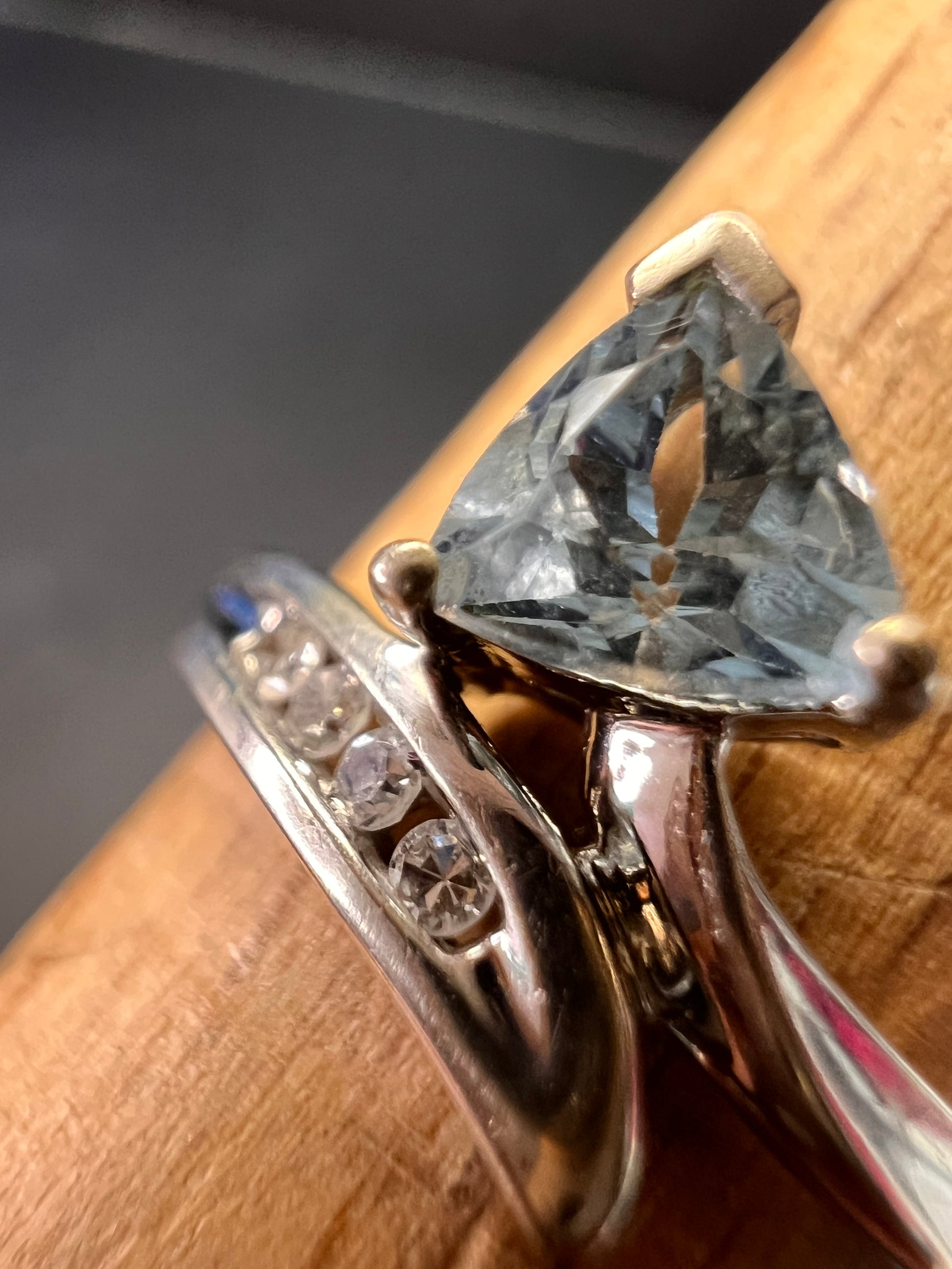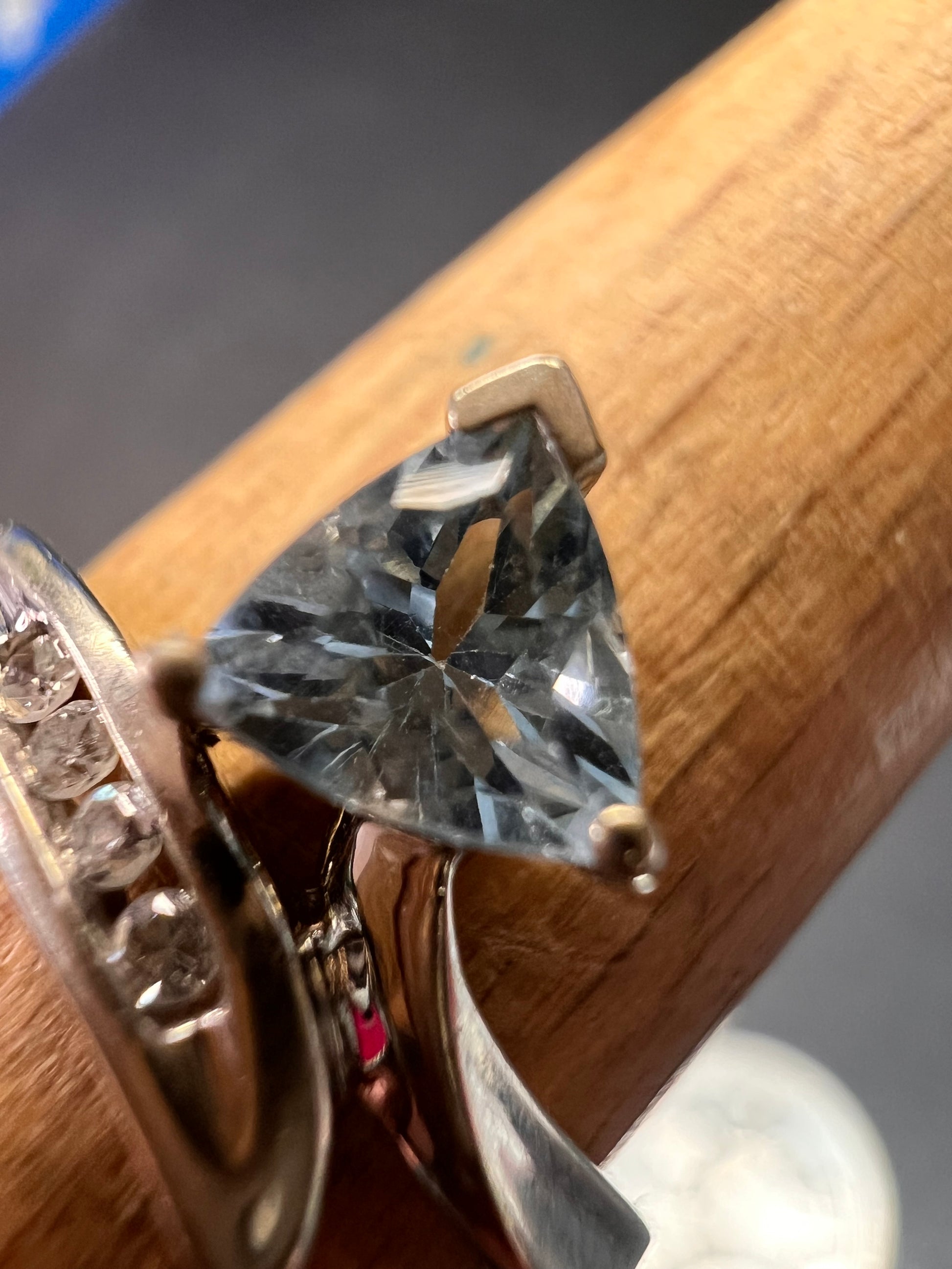 14k white gold Samuel Aaron trillion cut aquamarine and diamond ring size 6.5