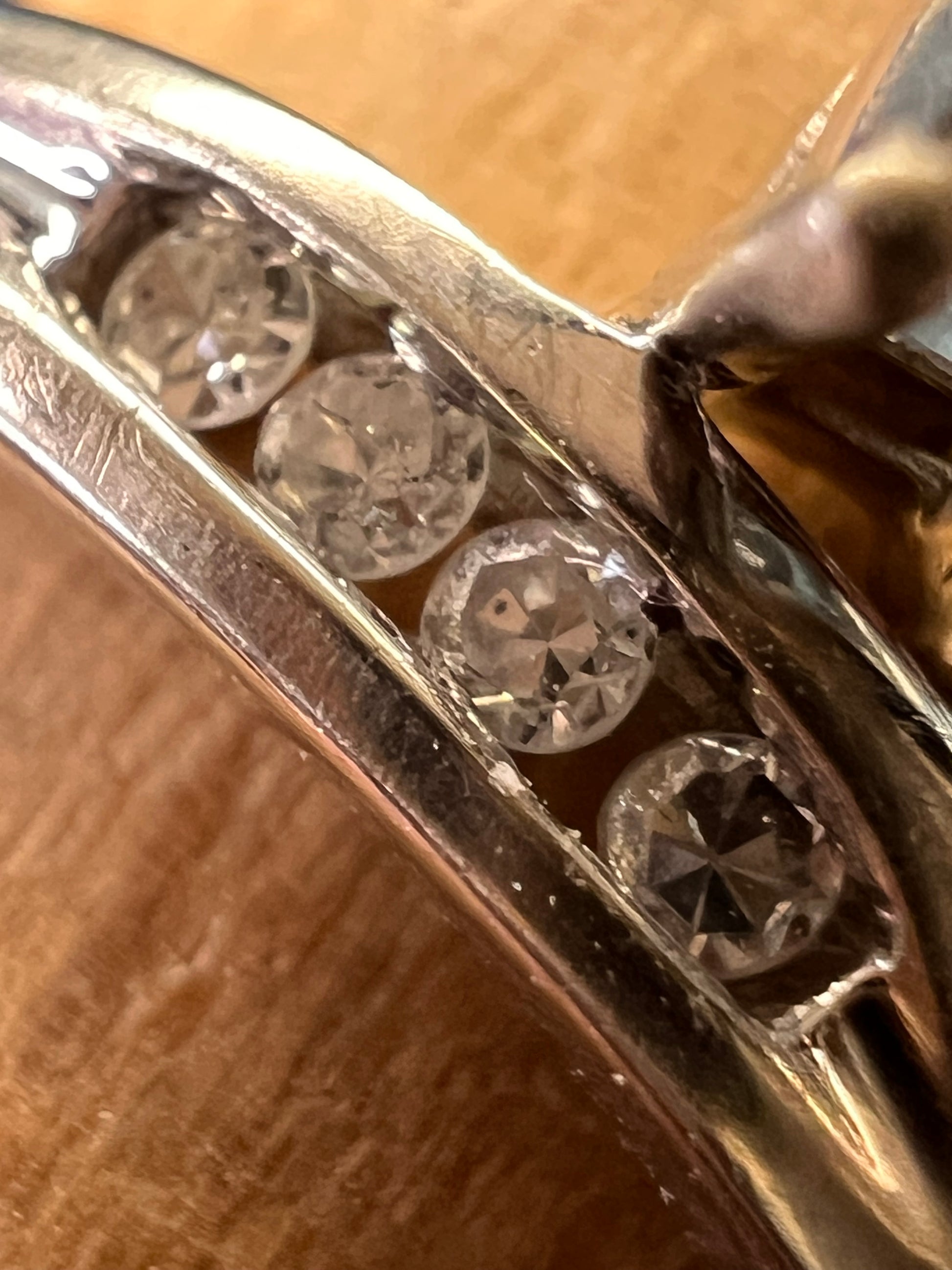 This ring is possibly vintage and definitely pre owned, with some definite signs of rugged use. I spent quite a bit of time cleaning up the stones and viewing them and they all appear to be in good condition. The white gold has some surface scratches that can be seen under magnification.
