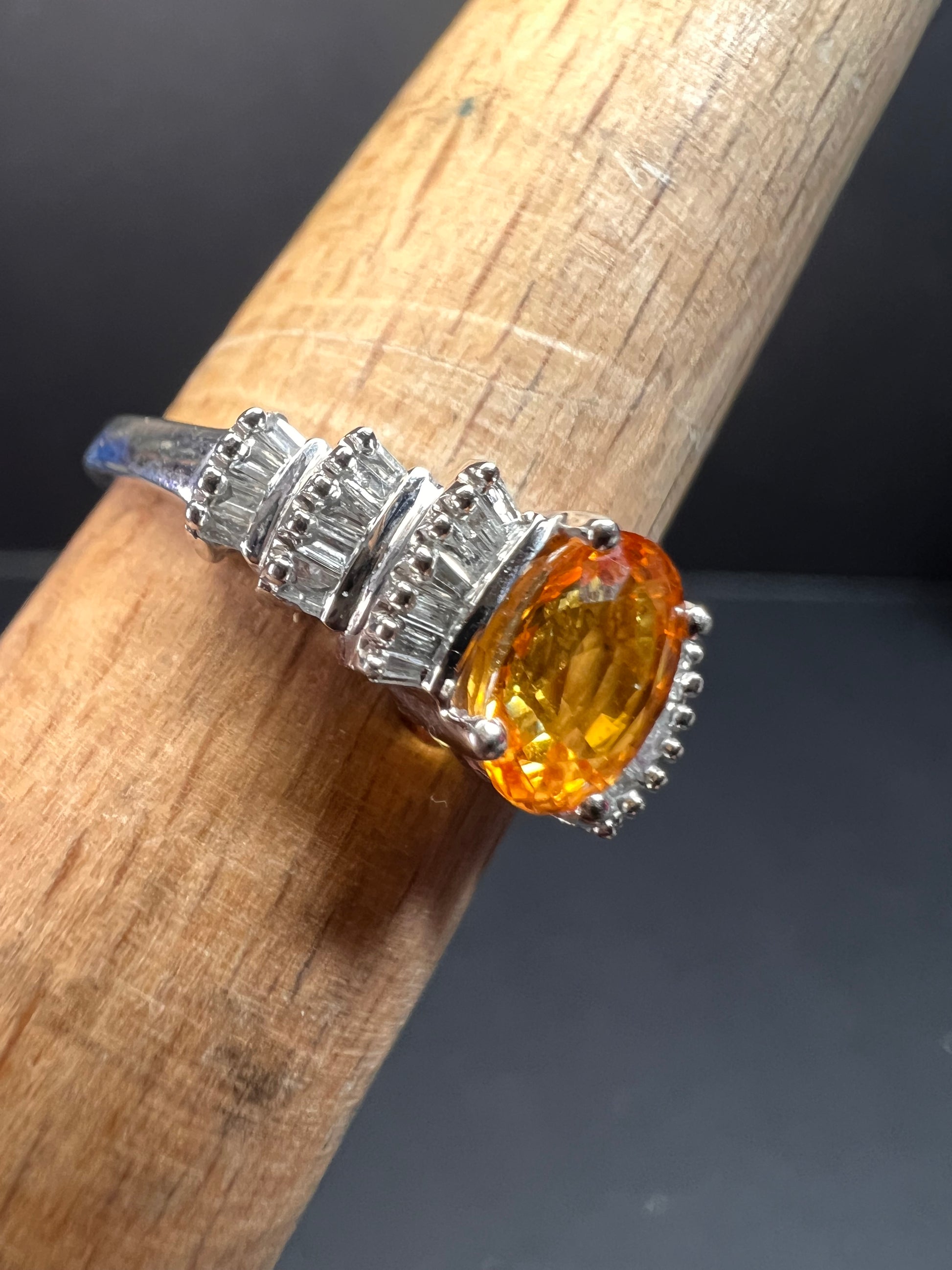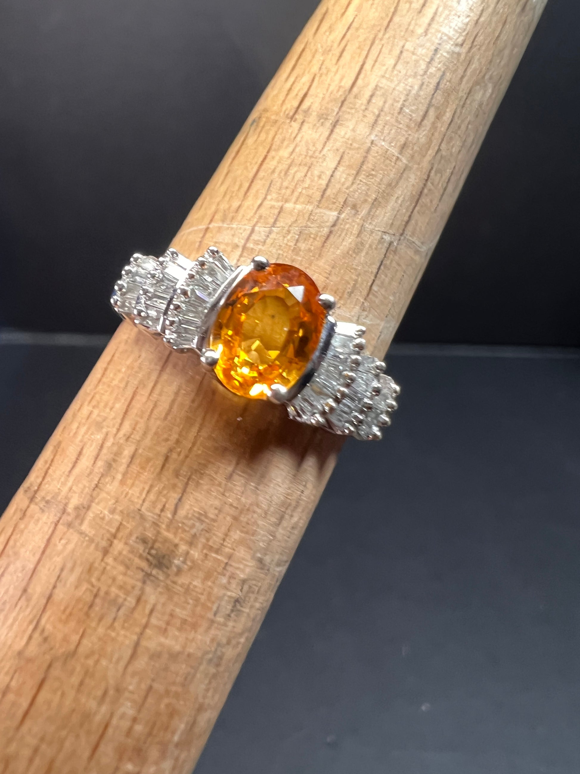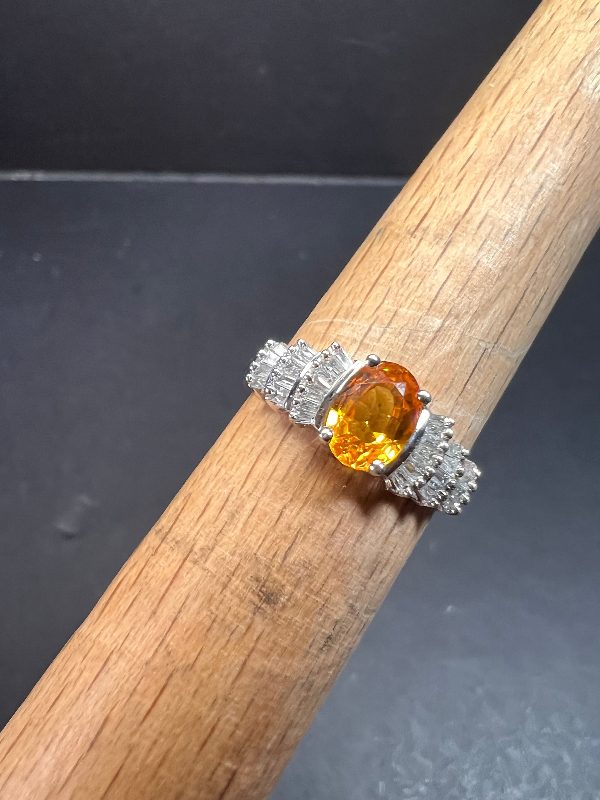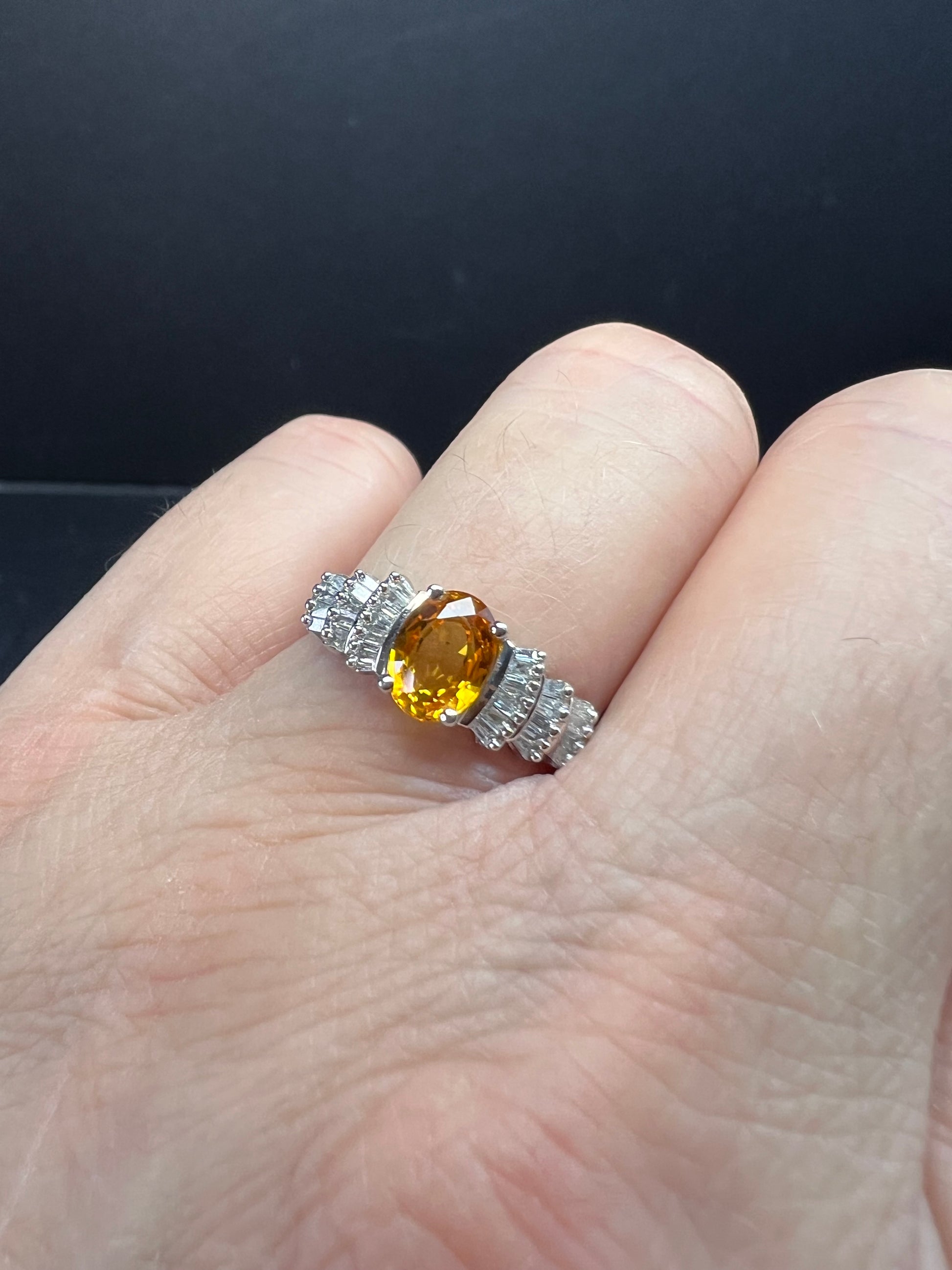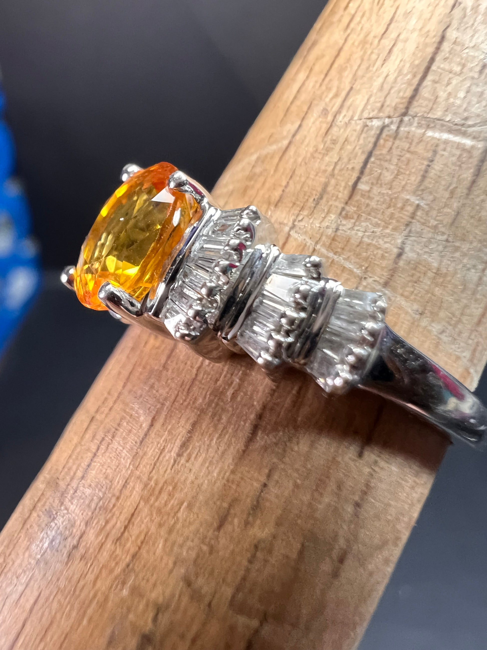 Yellow sapphire with white diamond baguette accent stones prong set in an authentic 14l white gold setting. Measures a size 7. Total weight is 2.73 grams. Yellow sapphire looks like it’s lab created or at the very least heat treated to enhance color. STS 14k.