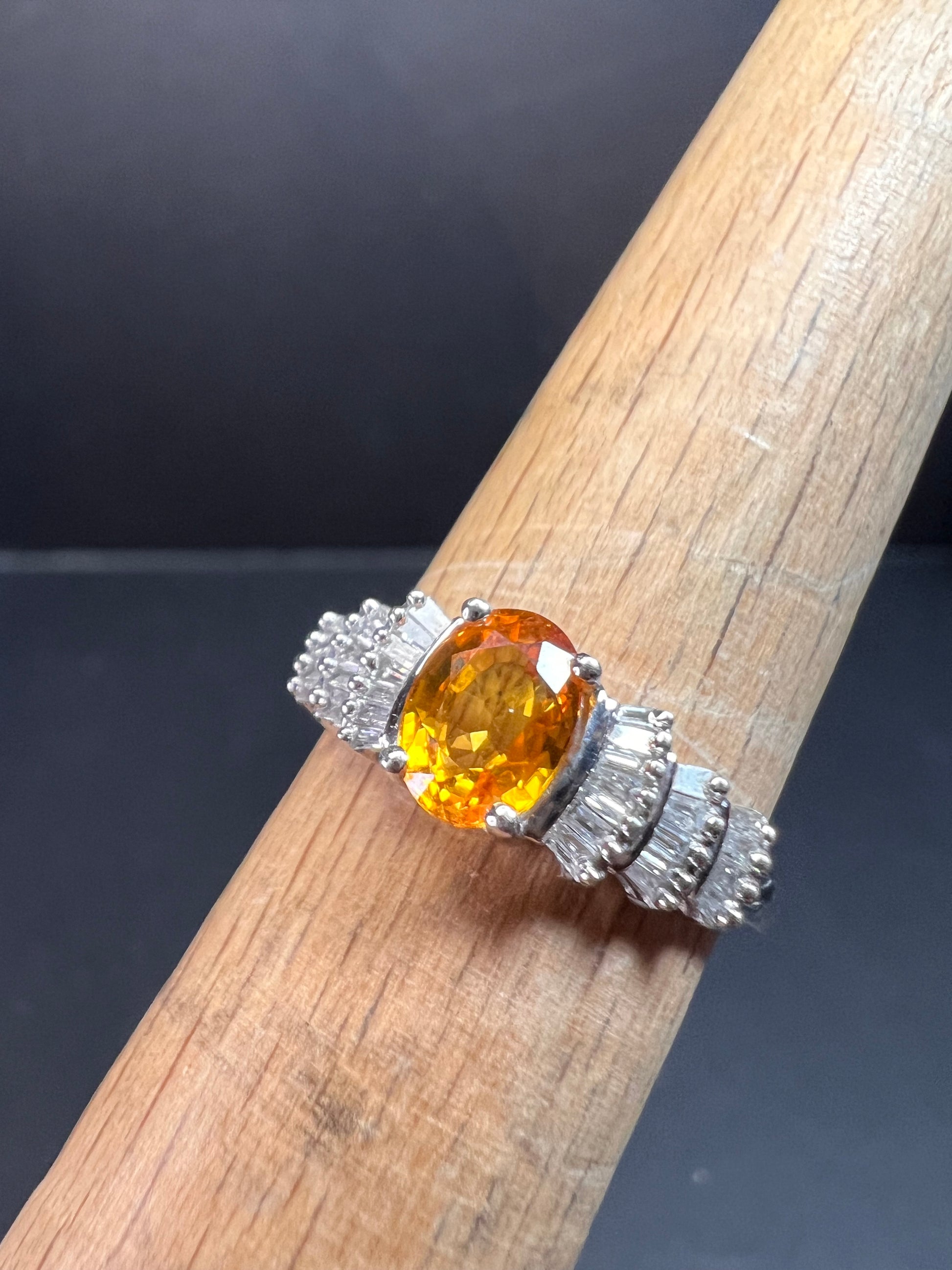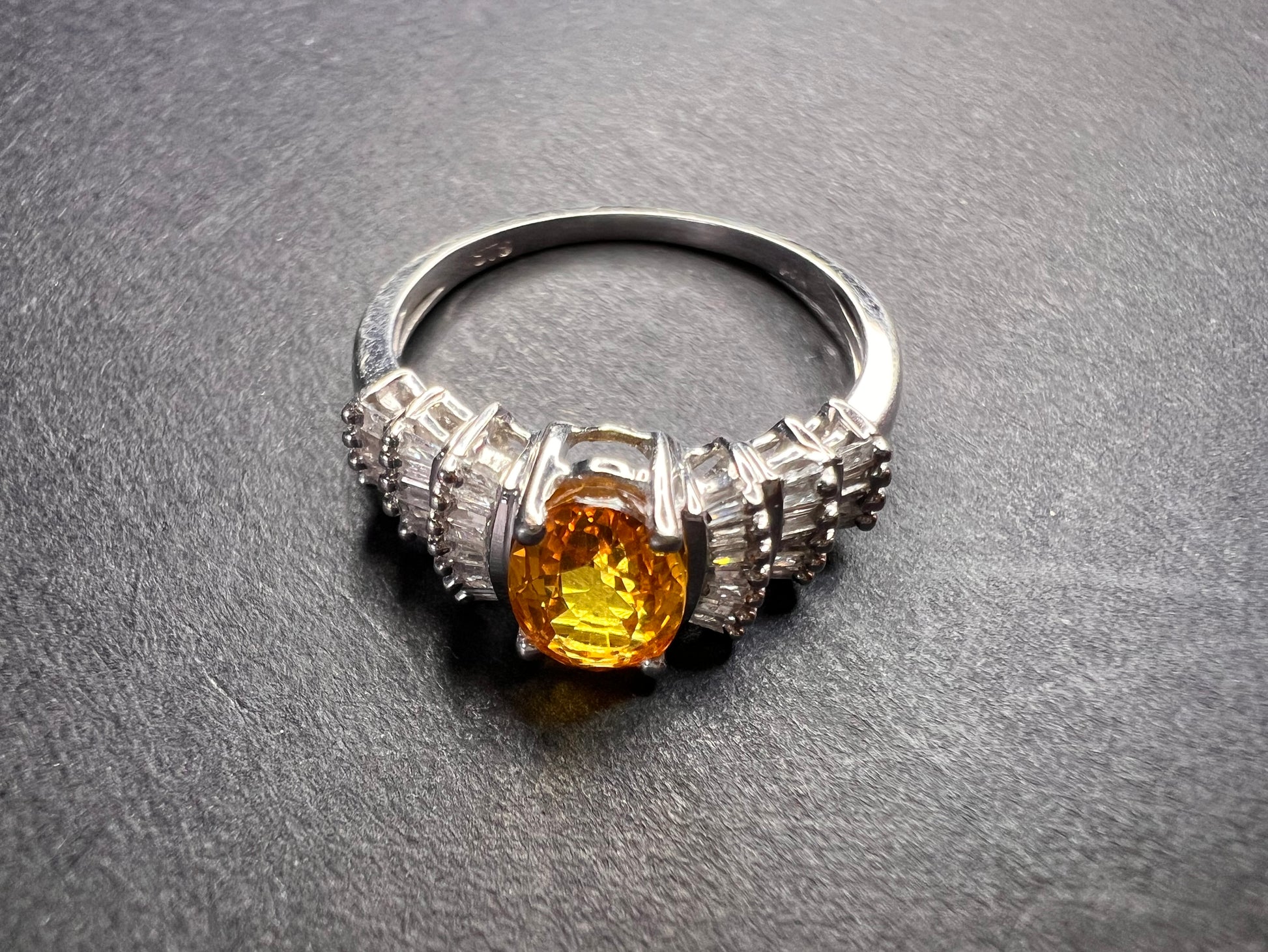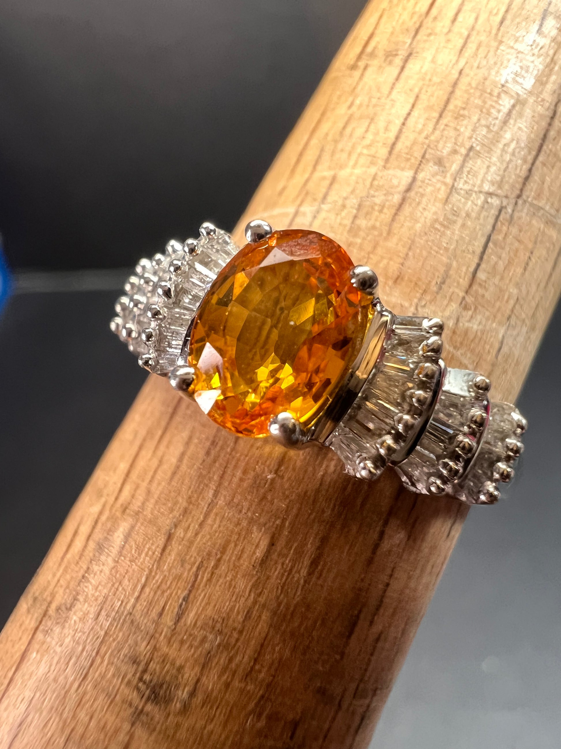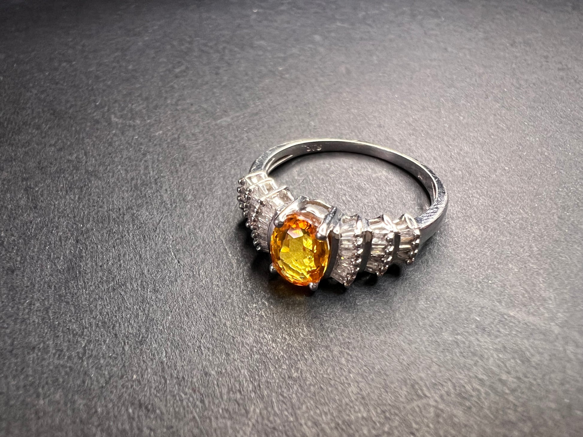 Yellow sapphire with white diamond baguette accent stones prong set in an authentic 14l white gold setting. Measures a size 7. Total weight is 2.73 grams. Yellow sapphire looks like it’s lab created or at the very least heat treated to enhance color. STS 14k.