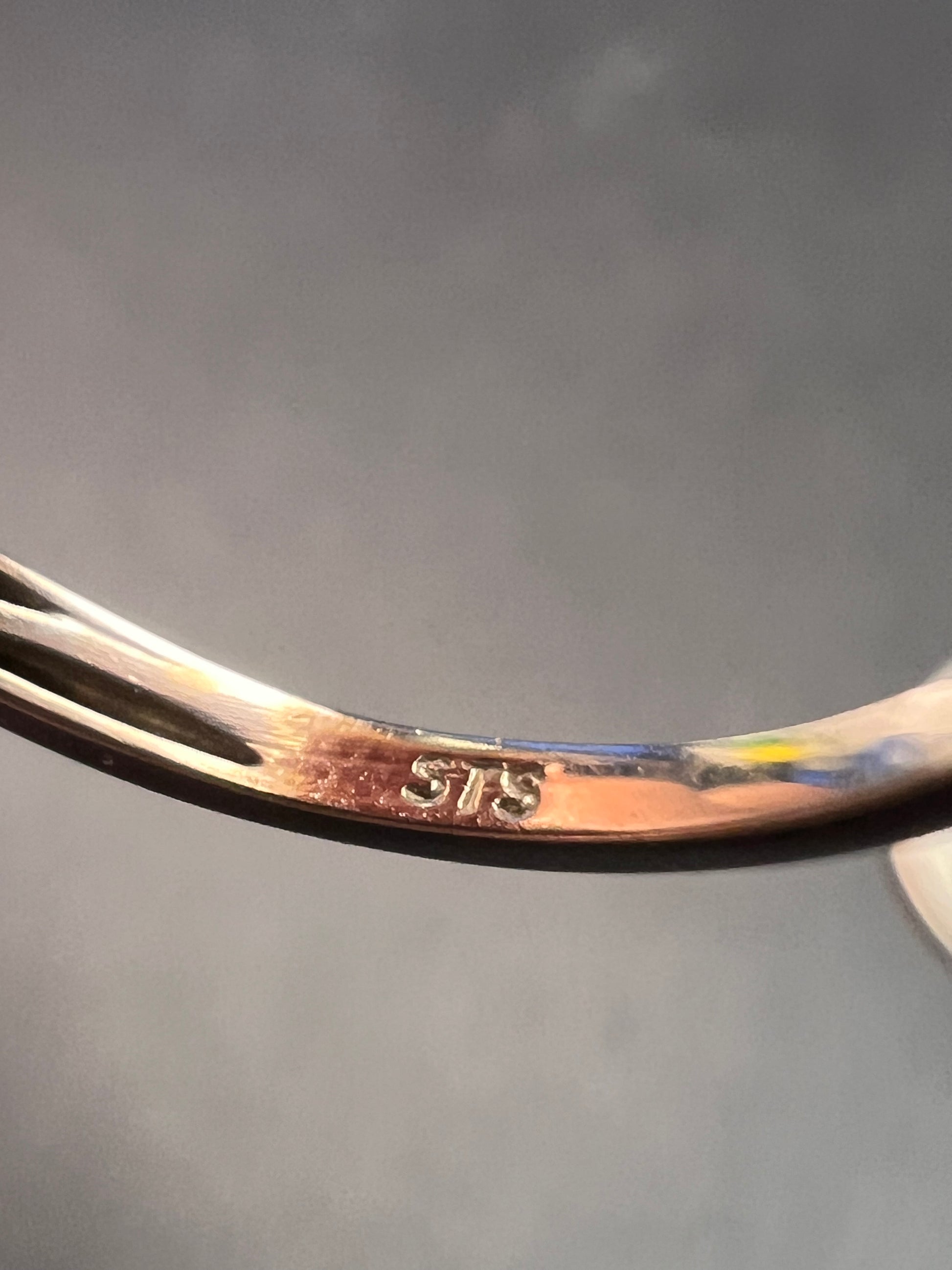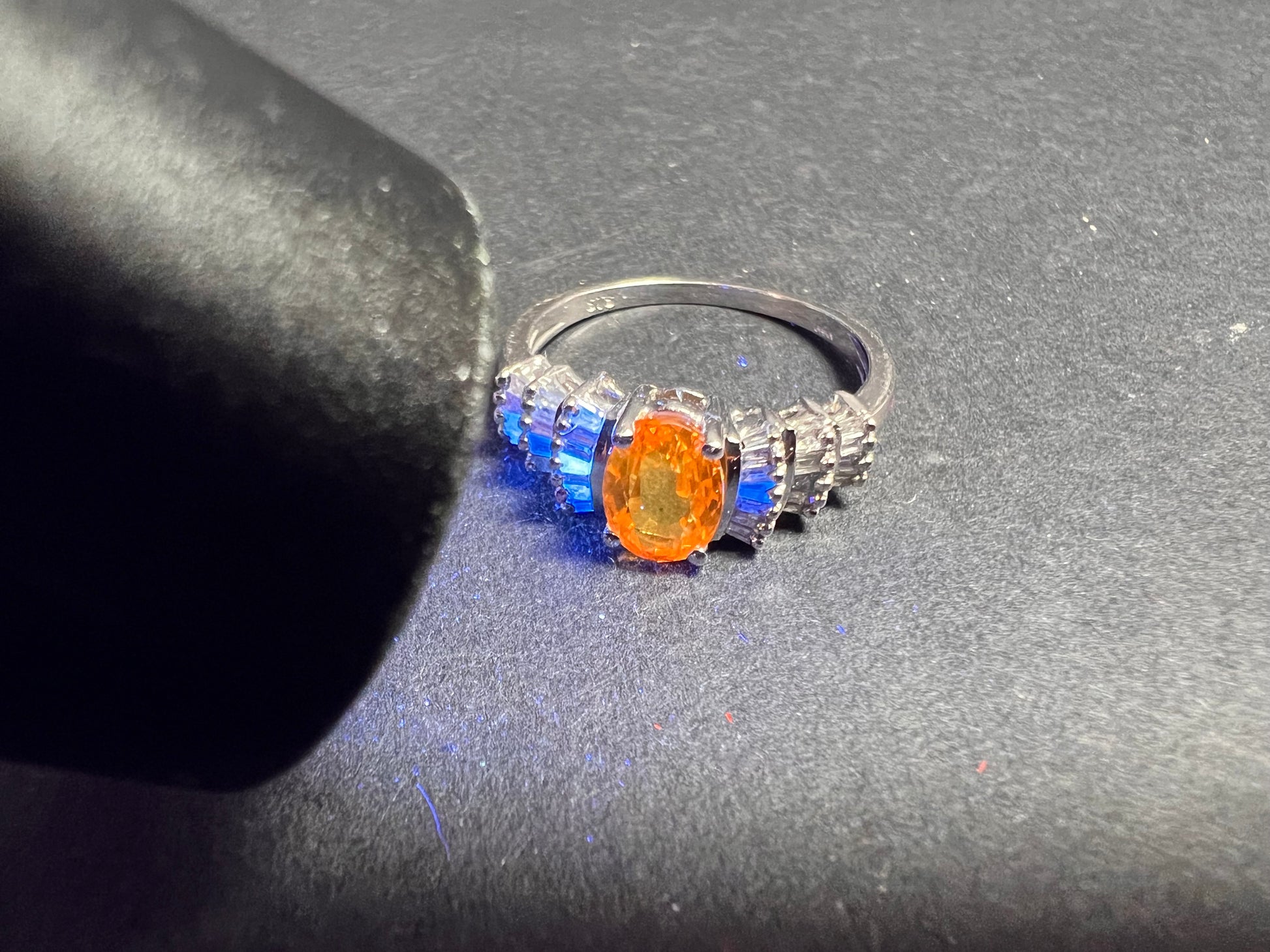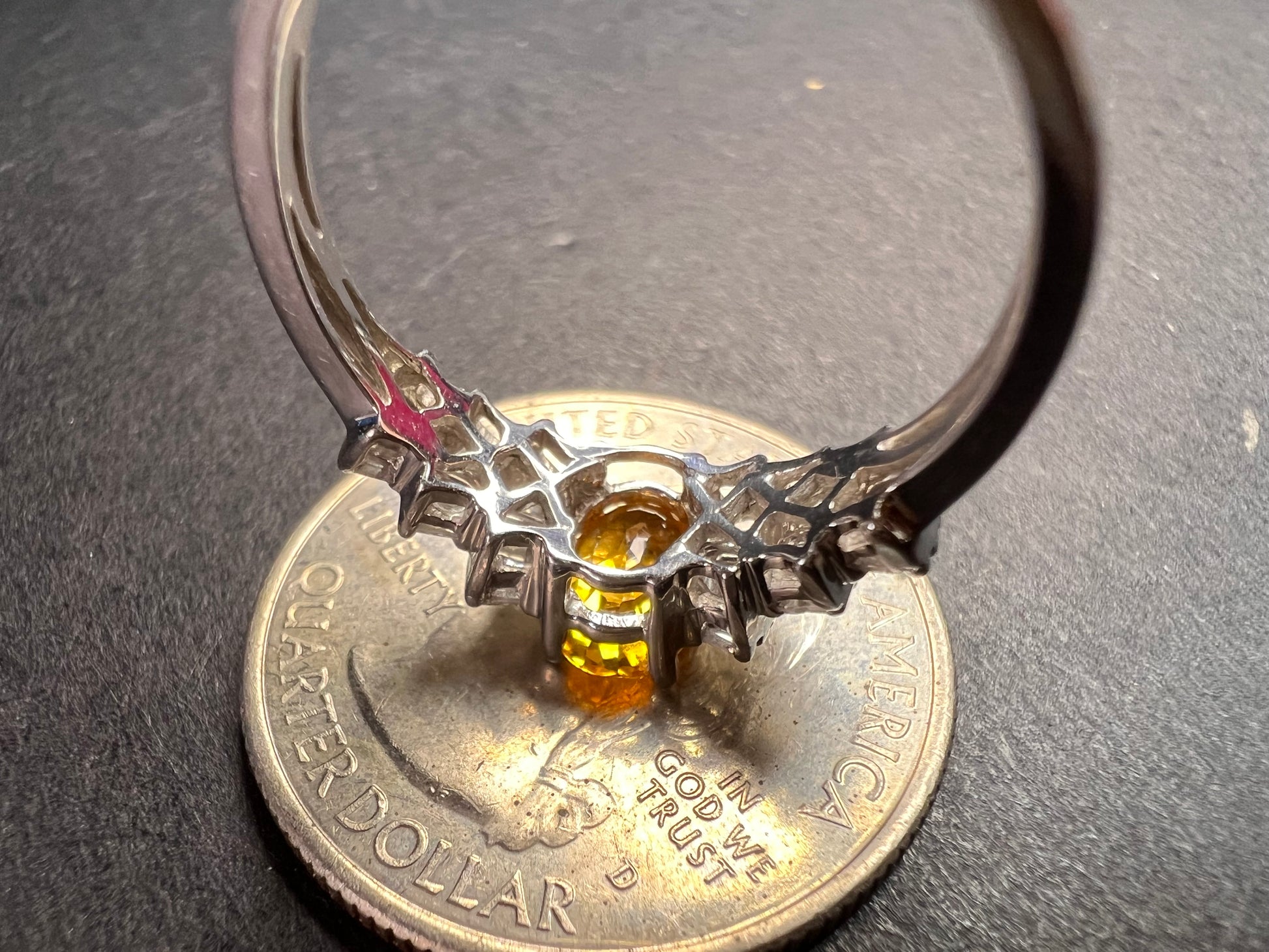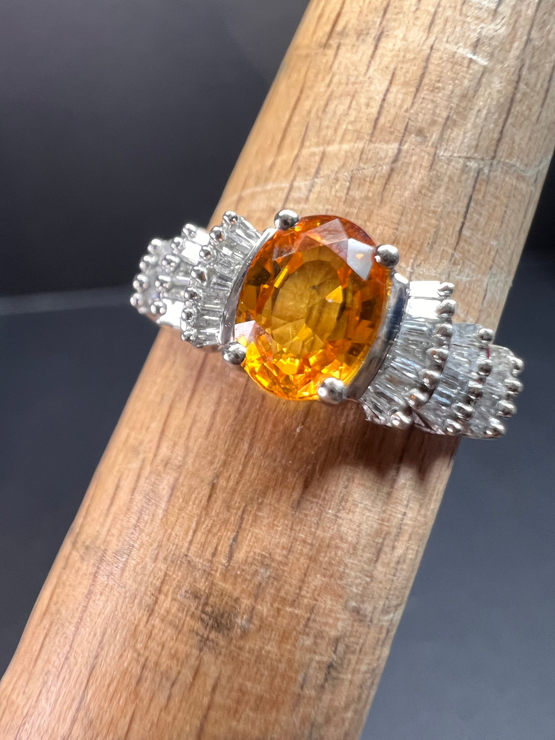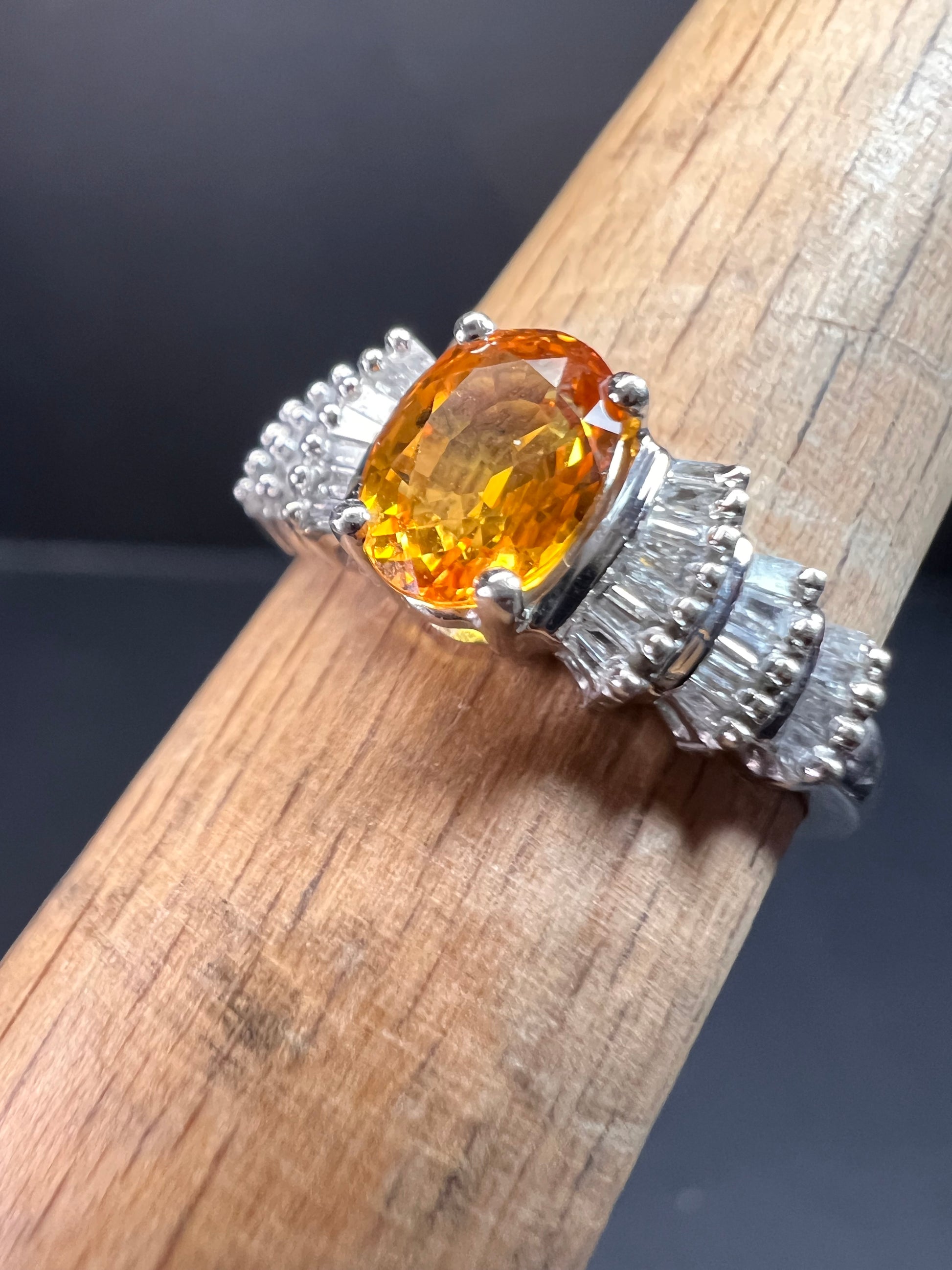 Yellow sapphire with white diamond baguette accent stones prong set in an authentic 14l white gold setting. Measures a size 7. Total weight is 2.73 grams. Yellow sapphire looks like it’s lab created or at the very least heat treated to enhance color. STS 14k.