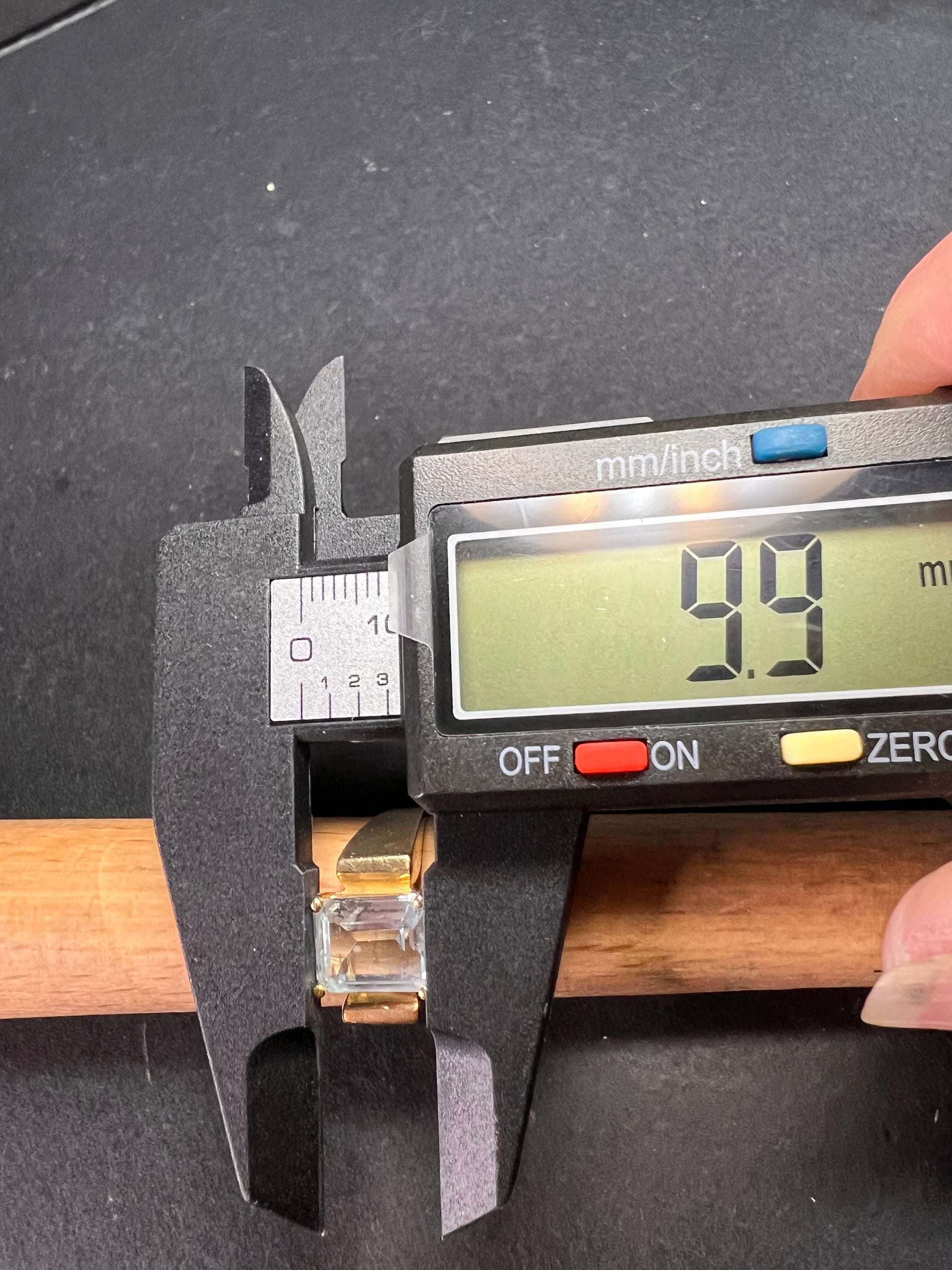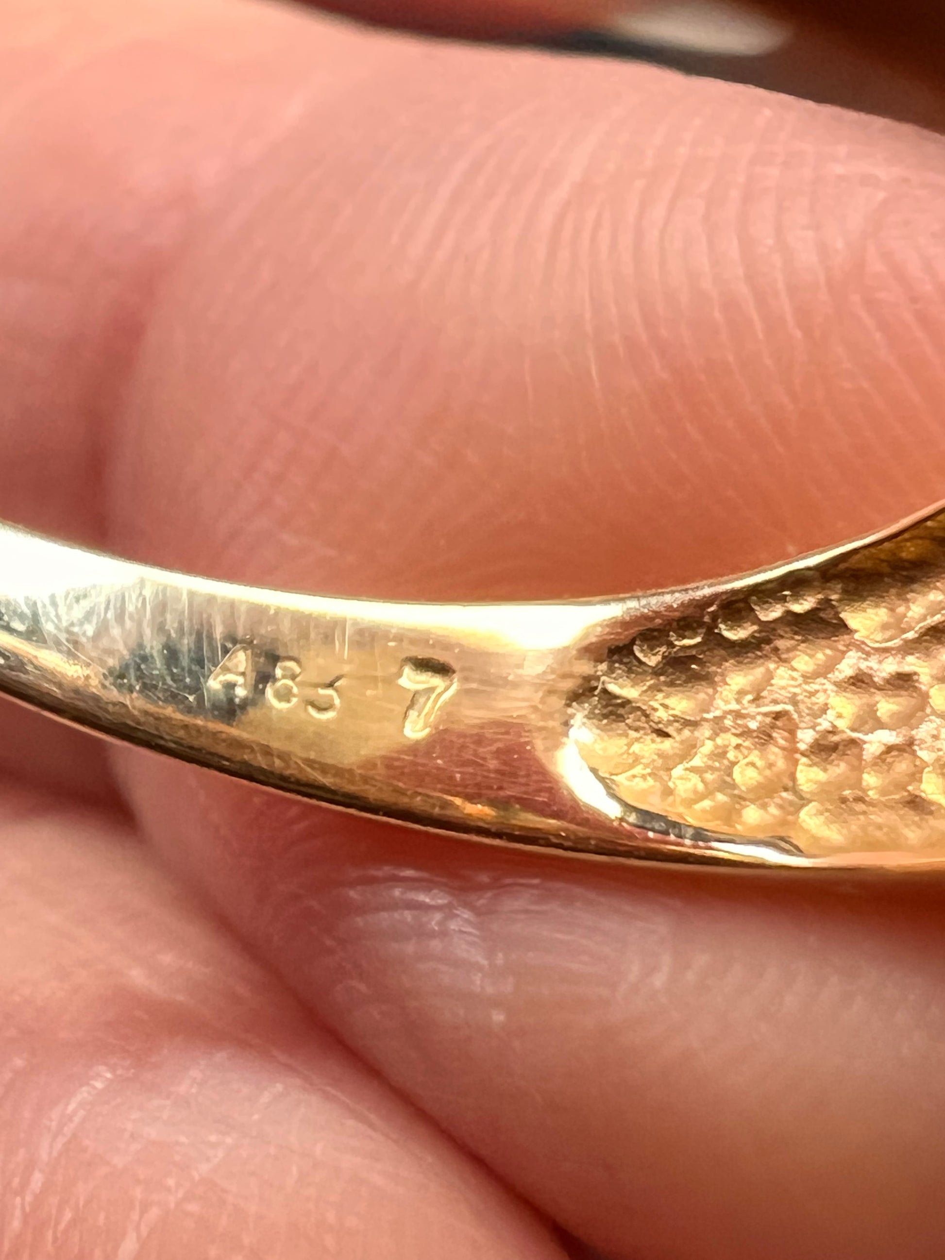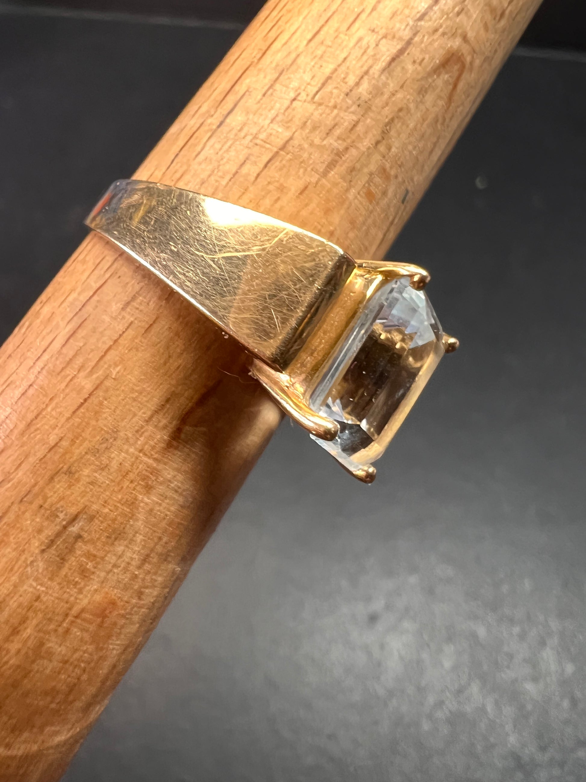 Pre-owned vintage 14K yellow gold aquamarine ring in excellent condition for its age. The ring showcases a large emerald-cut aquamarine measuring about 9.9 x 8.6 mm, held securely by four prongs atop a solid gold setting with wide geometric shoulders. The aquamarine displays a soft icy-blue hue and beautiful step-cut reflections. Light surface wear is present on the gold, consistent with gentle use. Stamped 14K with maker’s mark and internal model code inside the band. Elegant and timeless — perfect for collectors or as a statement cocktail ring.