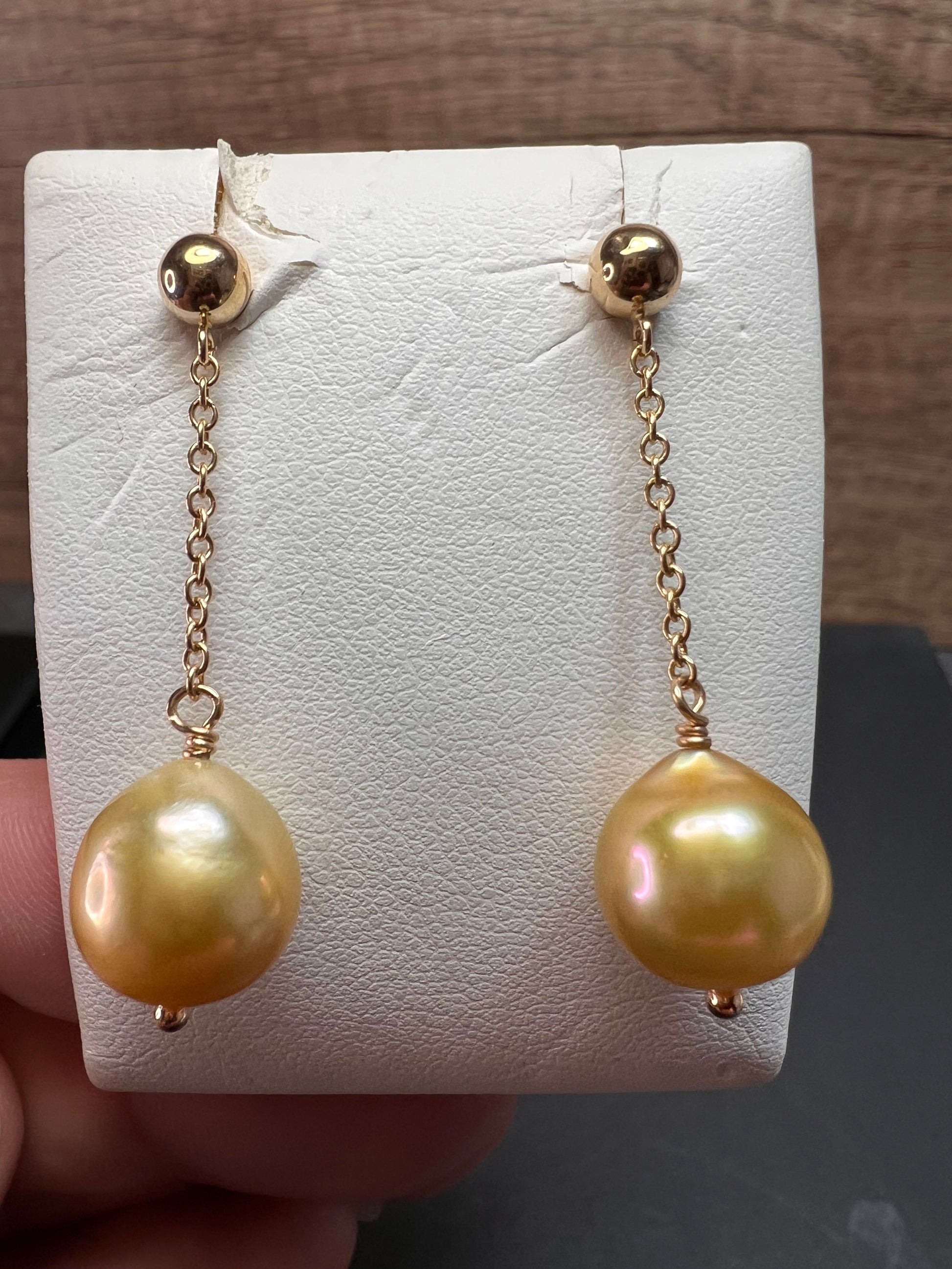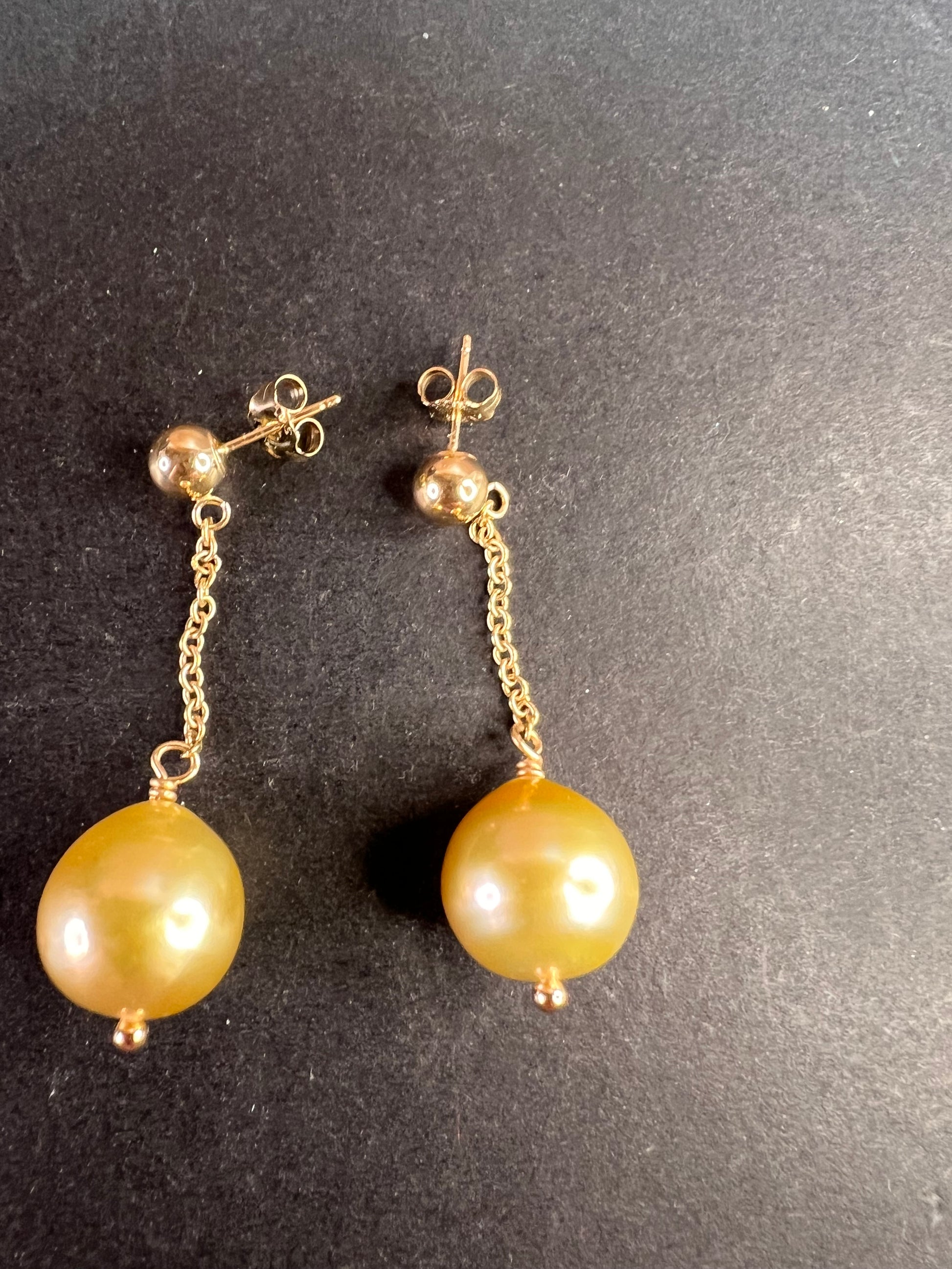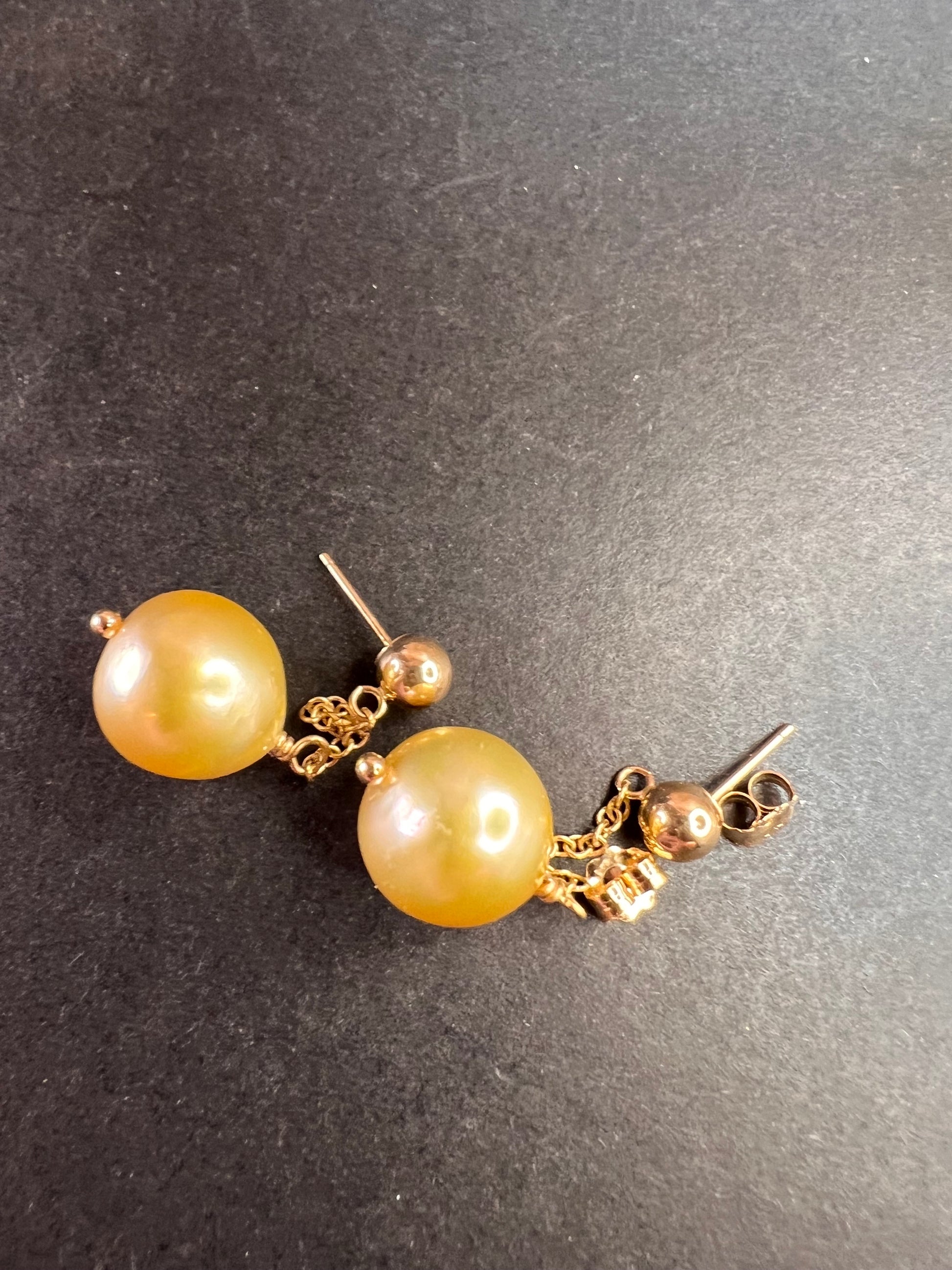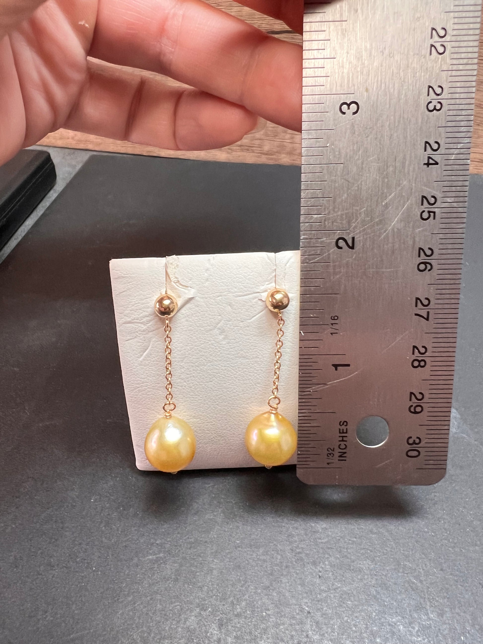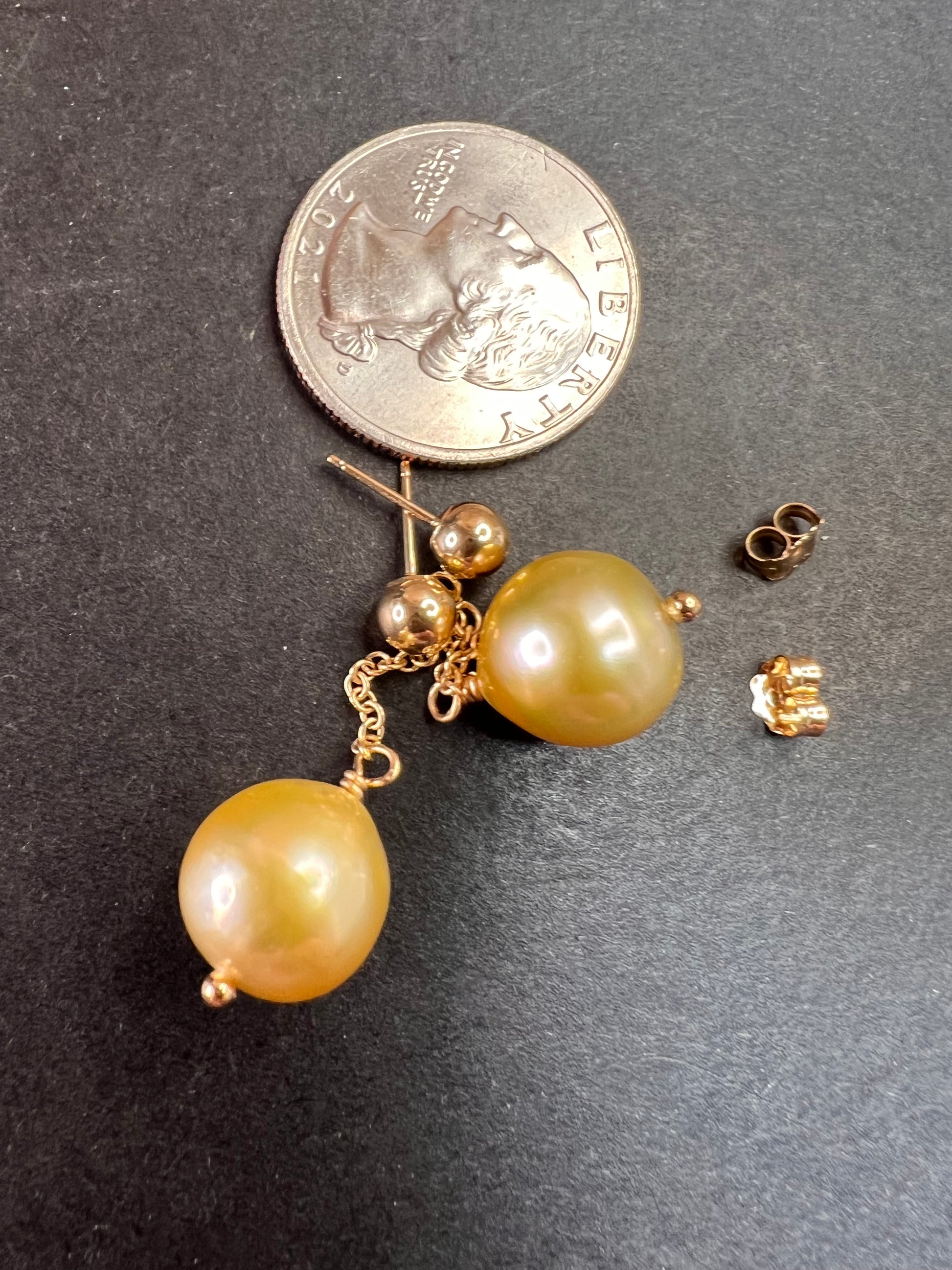 Genuine natural golden yellow South Seas Pearls measuring about 11mm in diameter, dangling from 14k authentic yellow gold chains and posts. Earring backs are also 14k gold as well. Purity stamps on backs and posts. Acid tested and tested on a KEE gold tester for purity verification. Total weight of pearls and gold is 4.71 grams. Earring length is roughly 1.5 inches. Earring balls are hollow. Pearls are cultured, of course, and not treated.