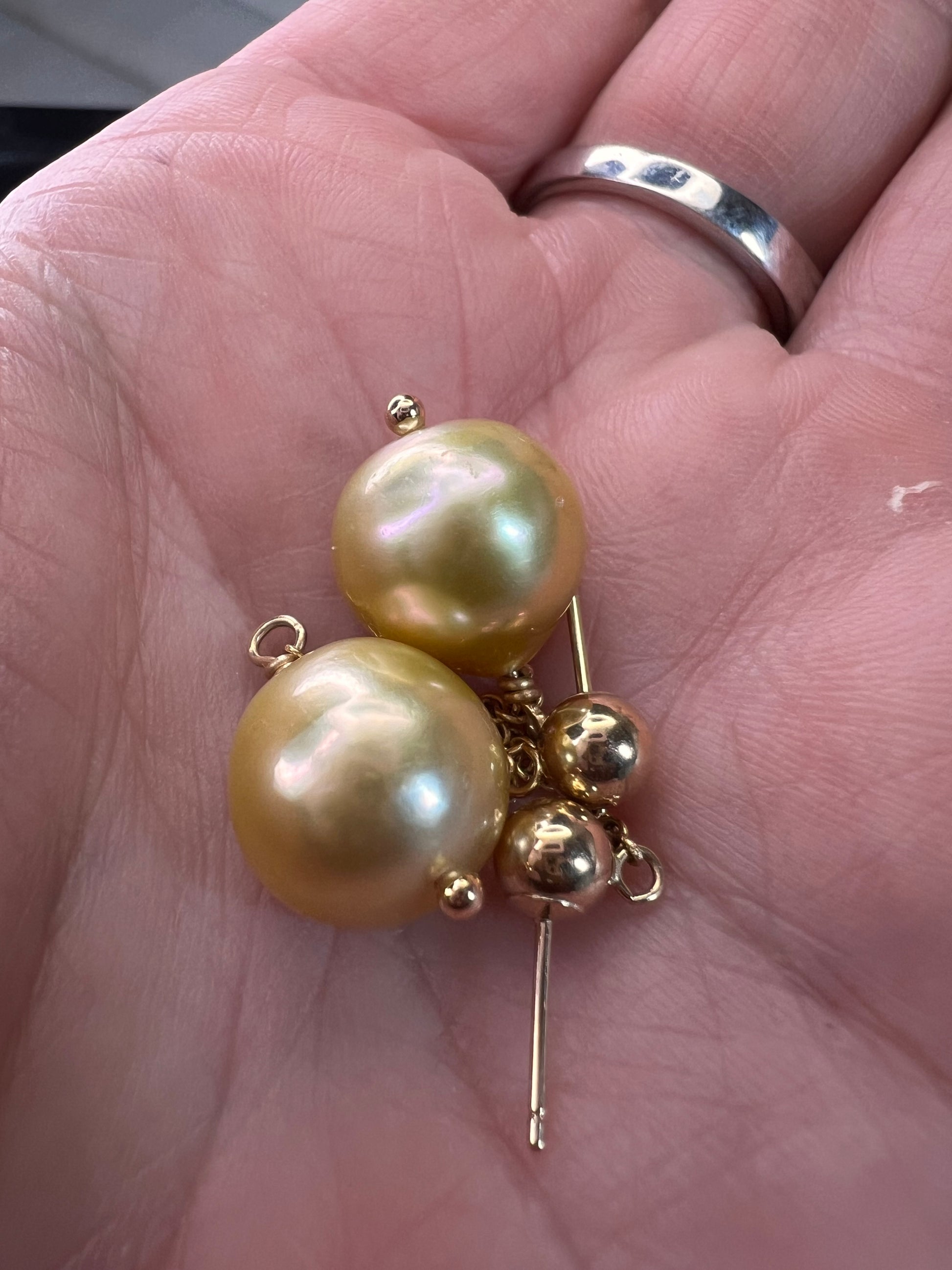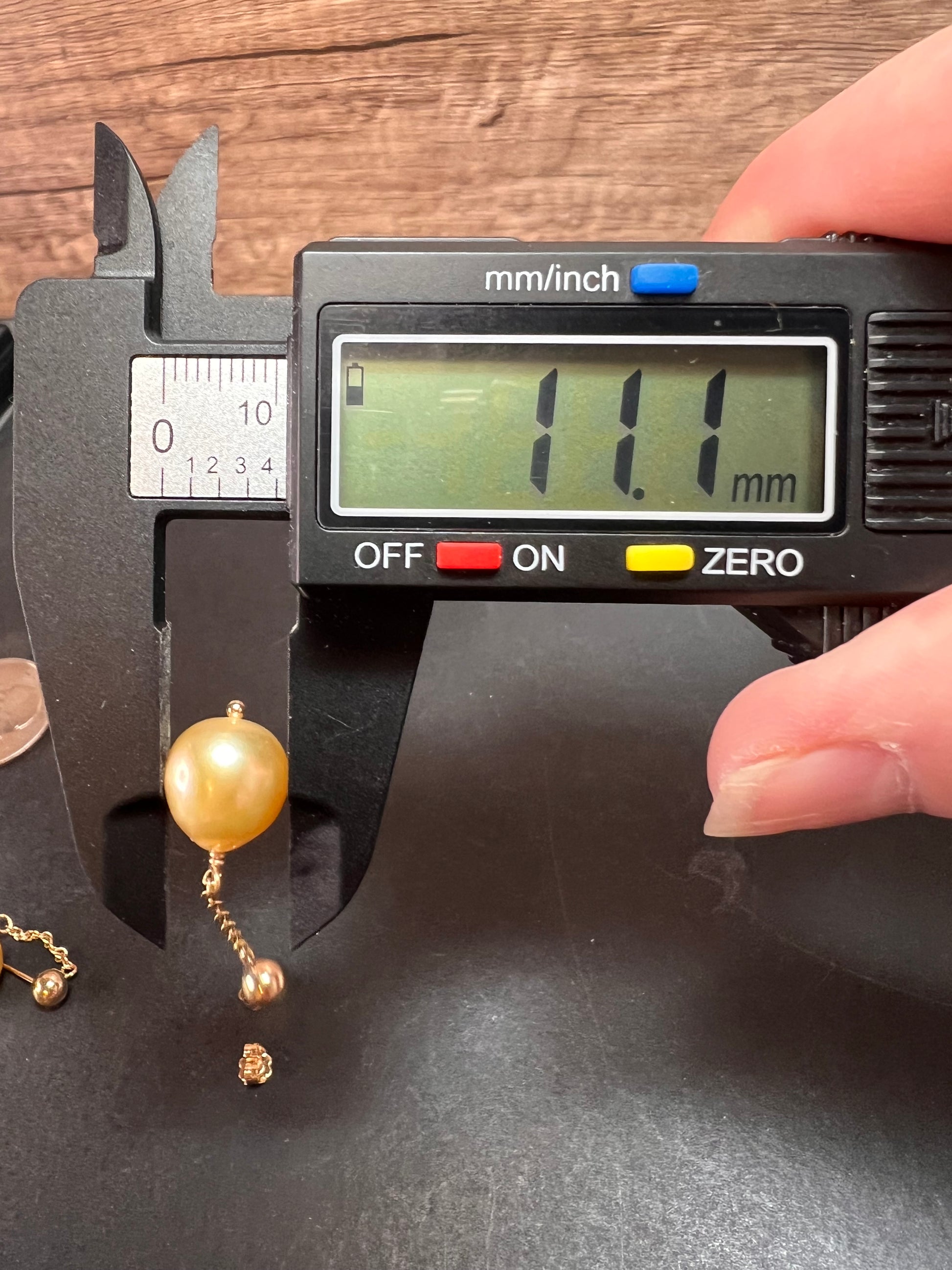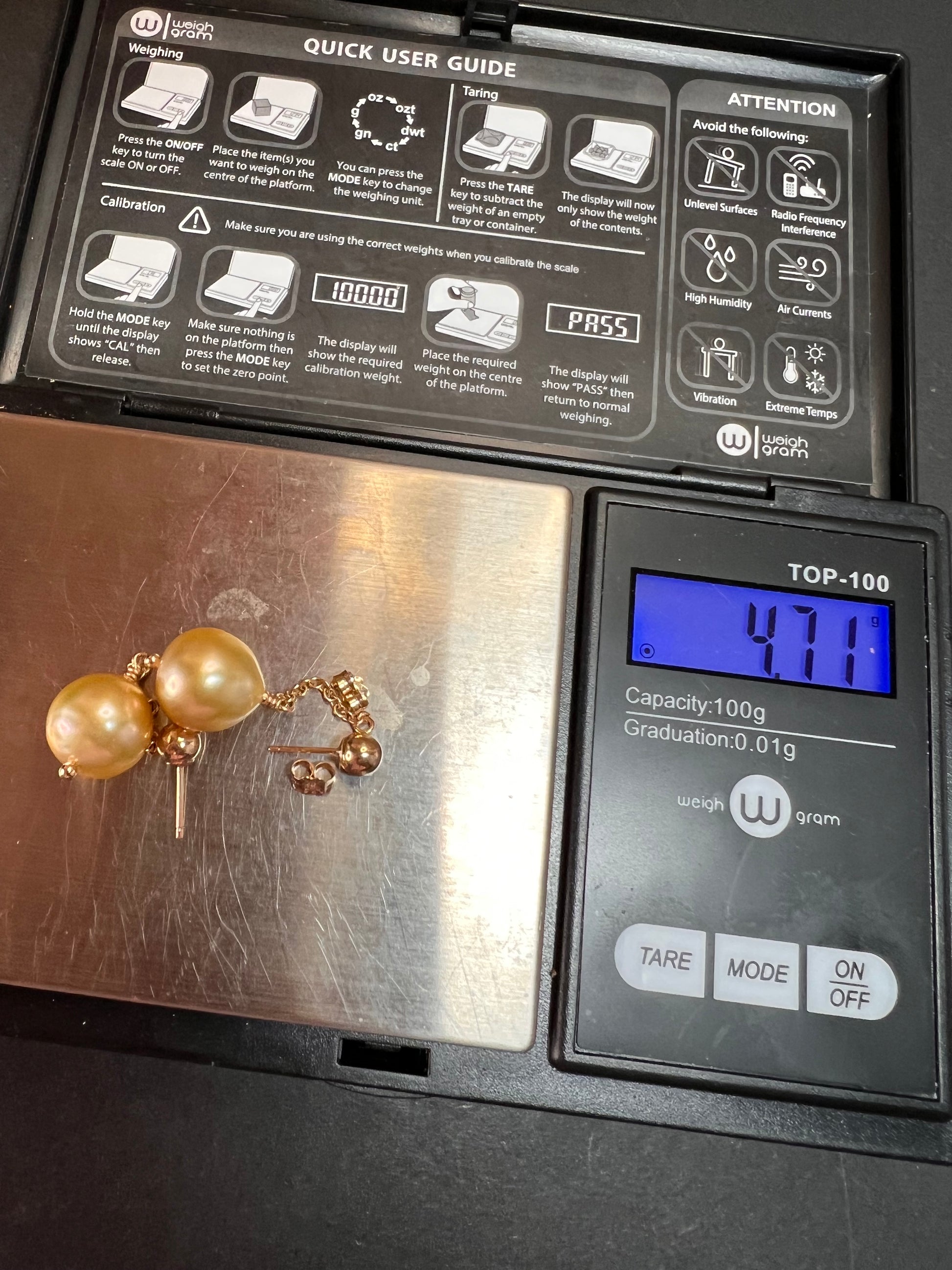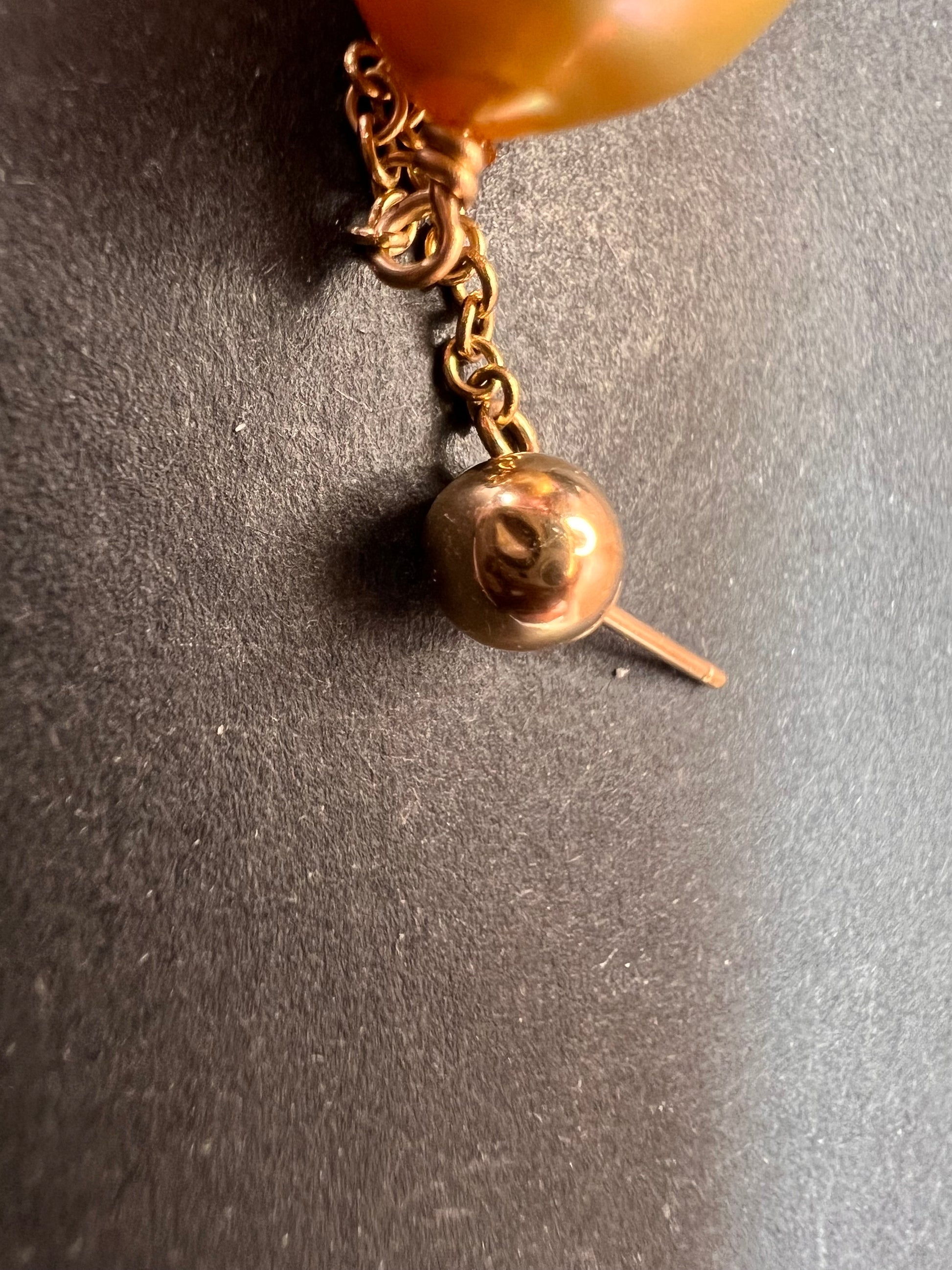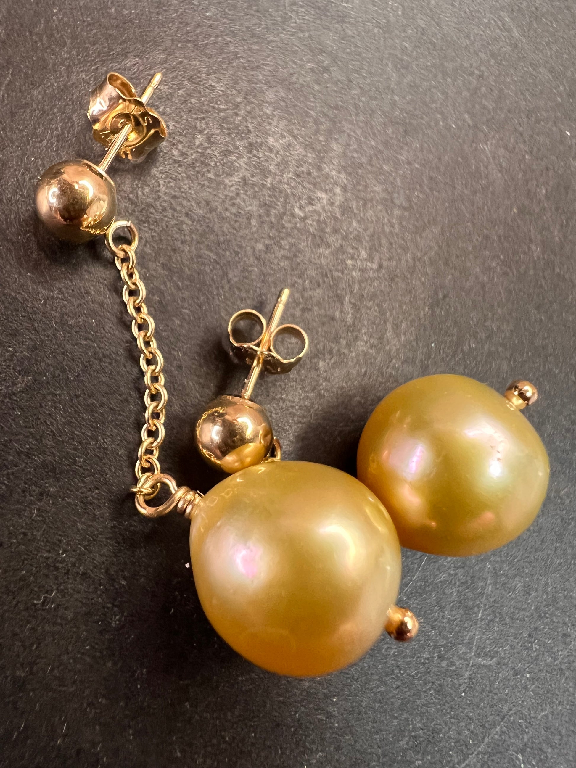 Genuine natural golden yellow South Seas Pearls measuring about 11mm in diameter, dangling from 14k authentic yellow gold chains and posts. Earring backs are also 14k gold as well. Purity stamps on backs and posts. Acid tested and tested on a KEE gold tester for purity verification. Total weight of pearls and gold is 4.71 grams. Earring length is roughly 1.5 inches. Earring balls are hollow. Pearls are cultured, of course, and not treated.
