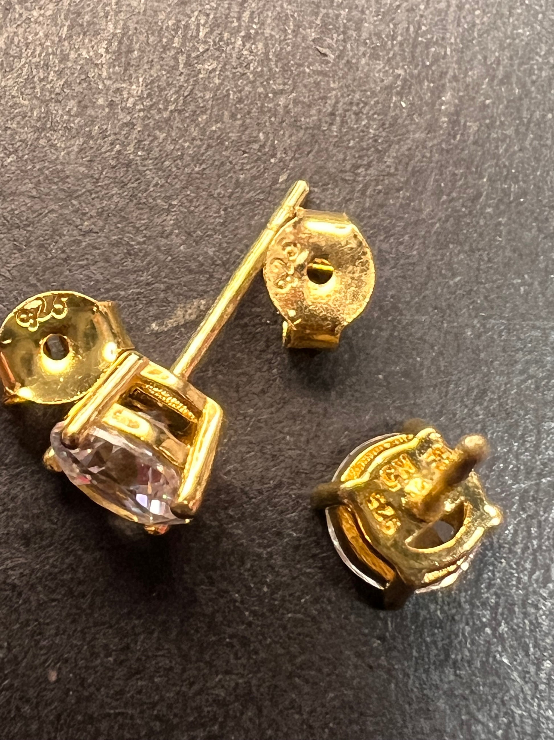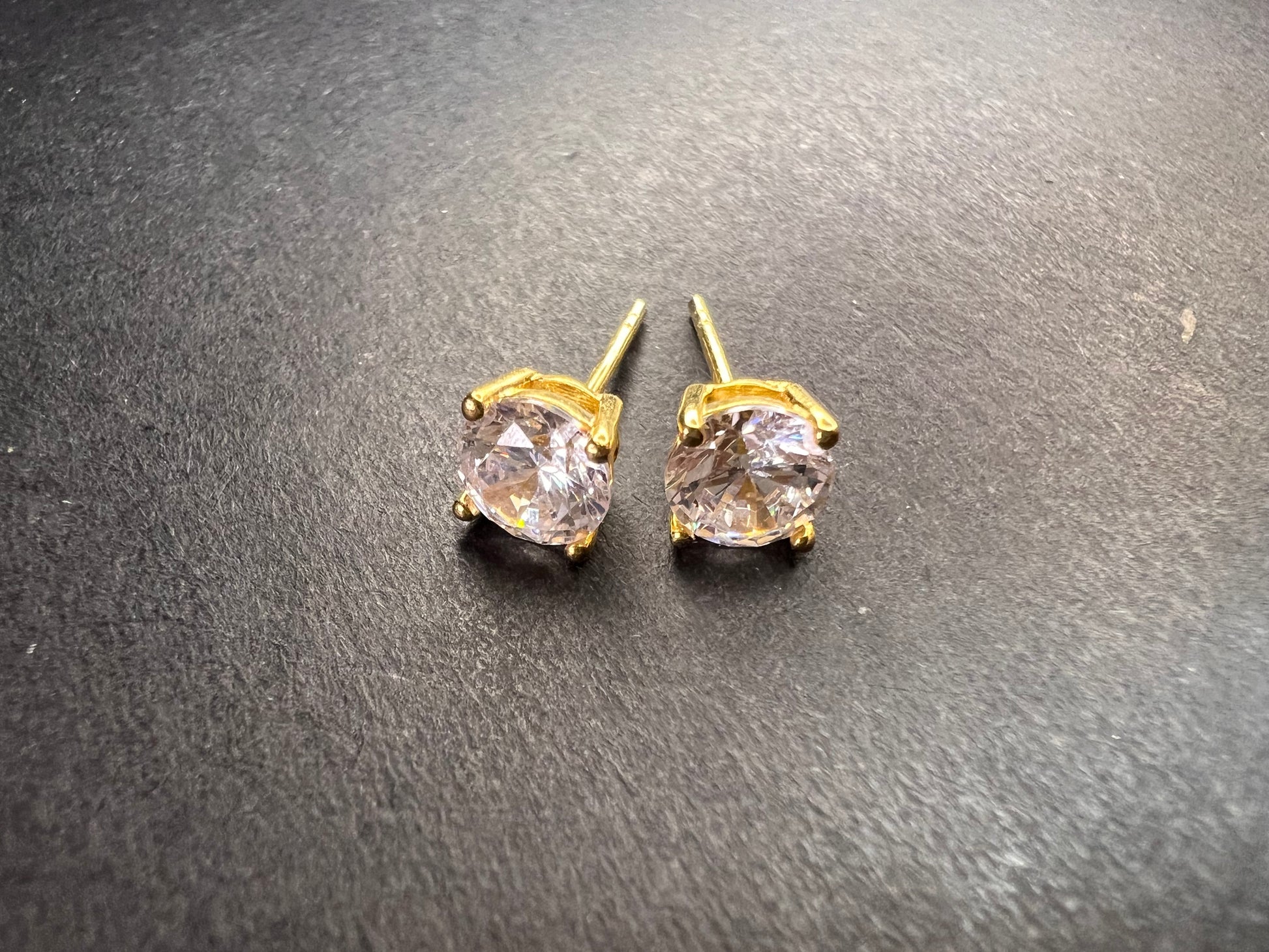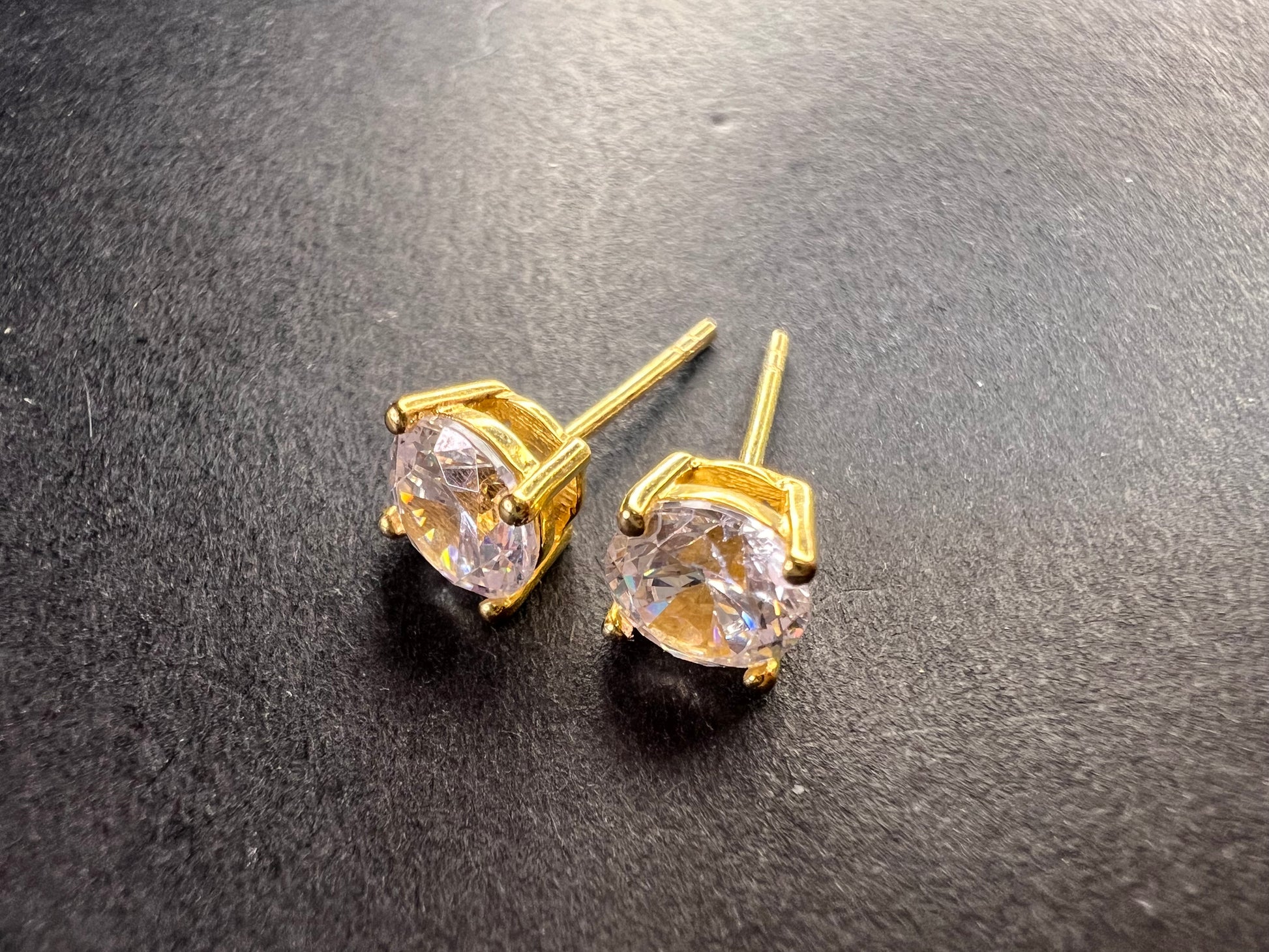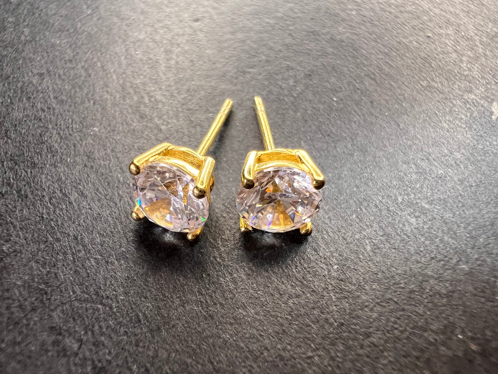 White / colorless round cut cubic zirconia gemstones measuring about 5.5-5.7mm in diameter prong set in authentic 925 sterling silver that’s plated with yellow gold. Butterfly pushbacks are also yellow gold plated over 925.