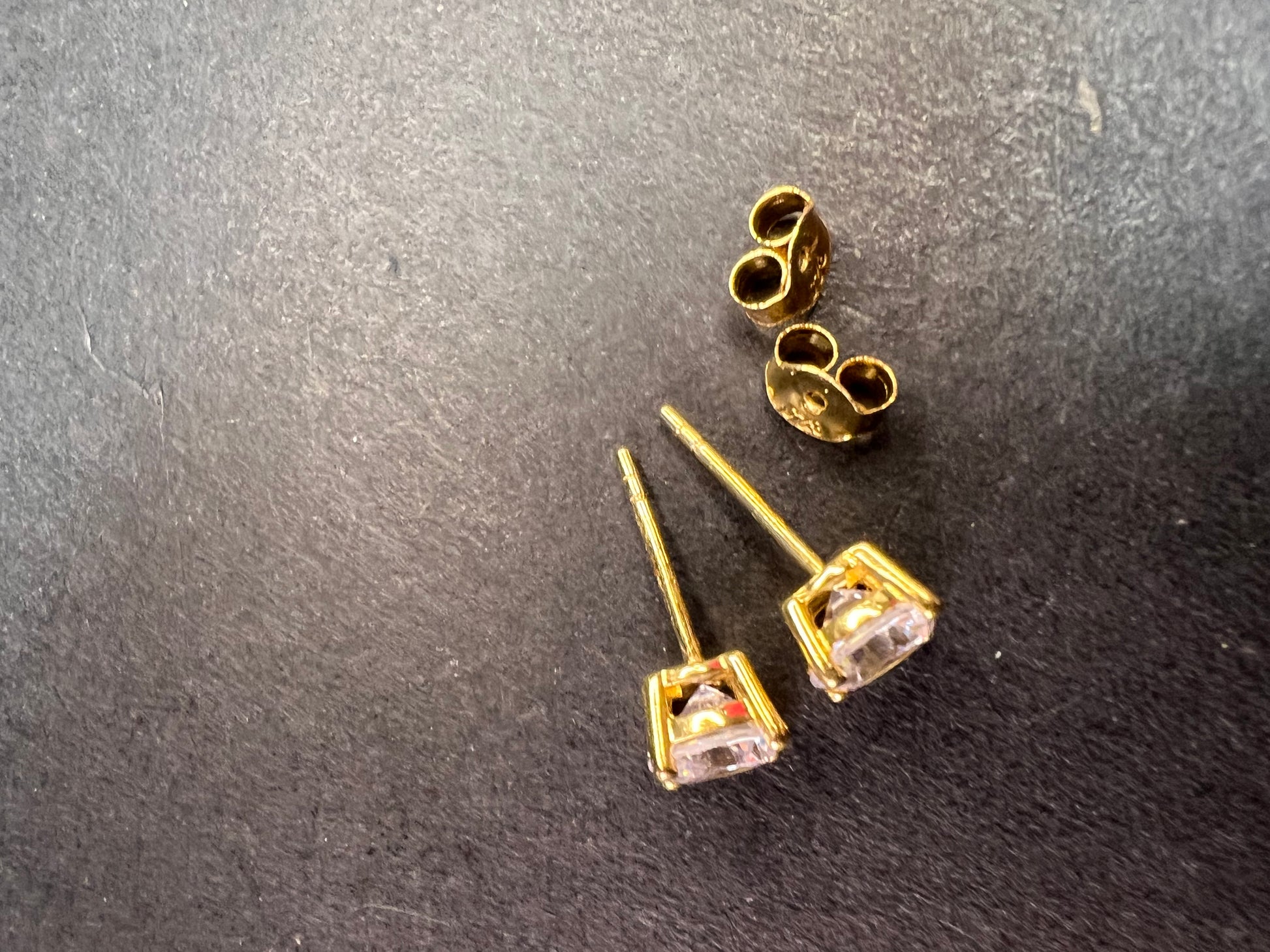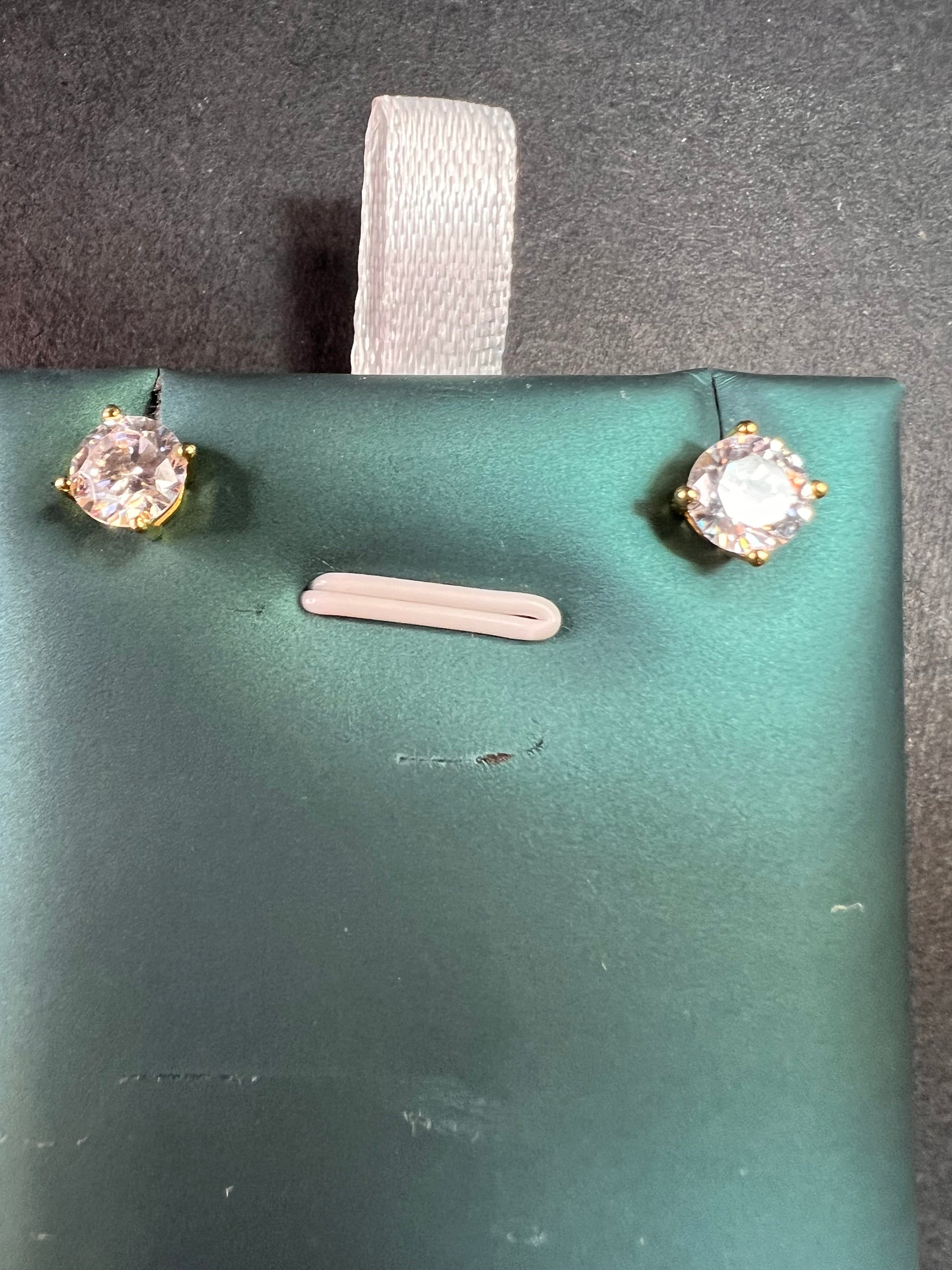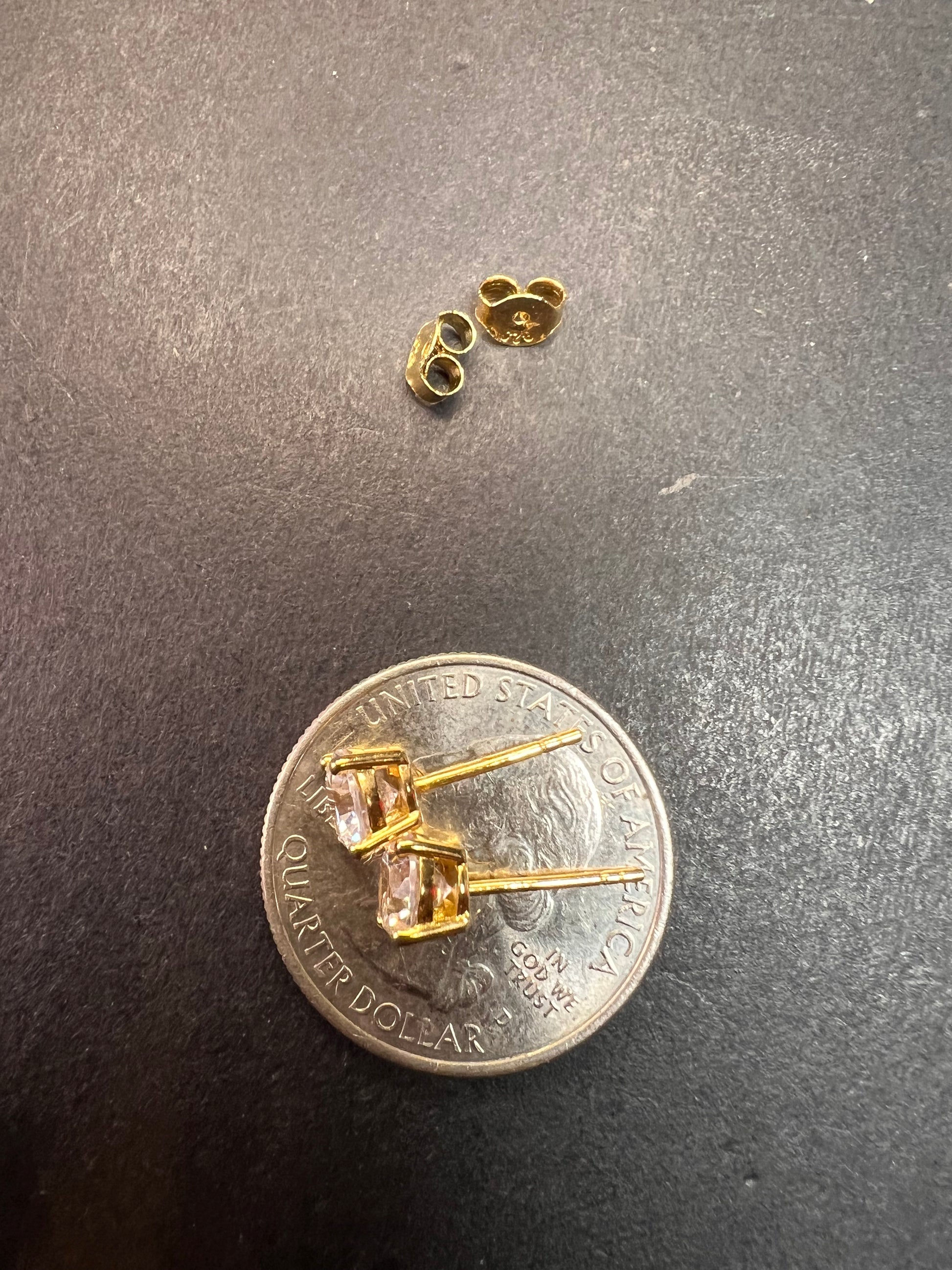 White / colorless round cut cubic zirconia gemstones measuring about 5.5-5.7mm in diameter prong set in authentic 925 sterling silver that’s plated with yellow gold. Butterfly pushbacks are also yellow gold plated over 925.