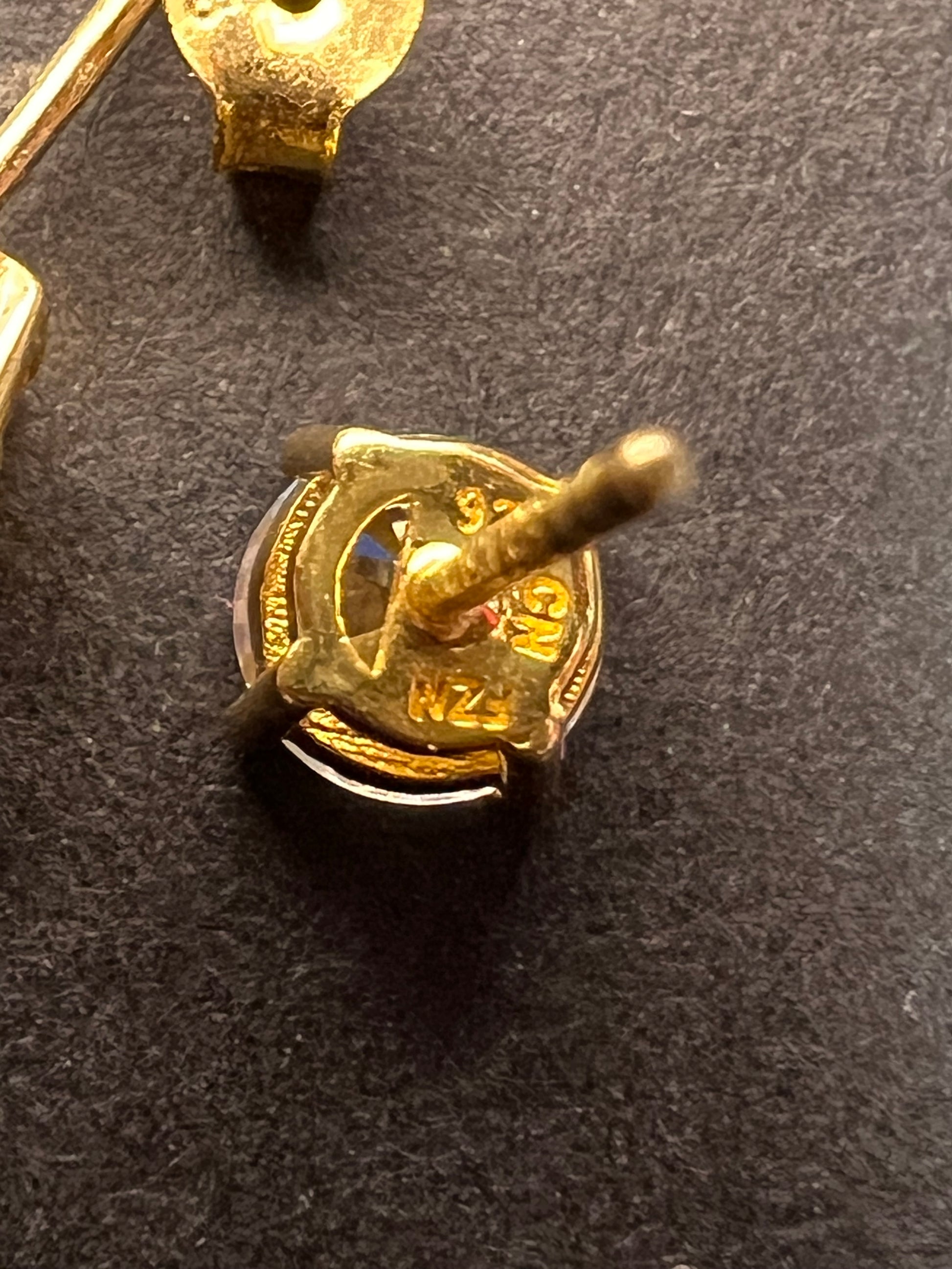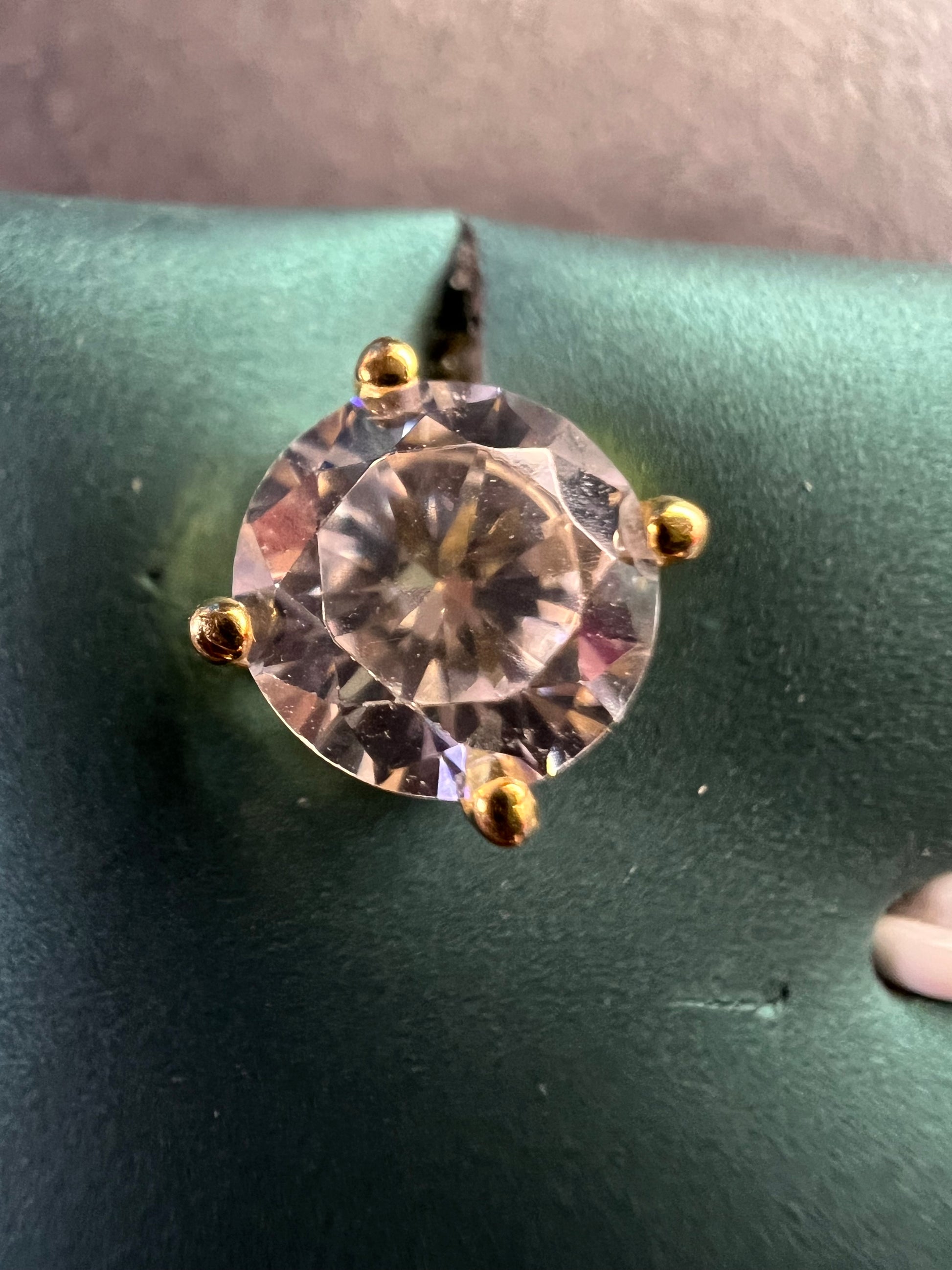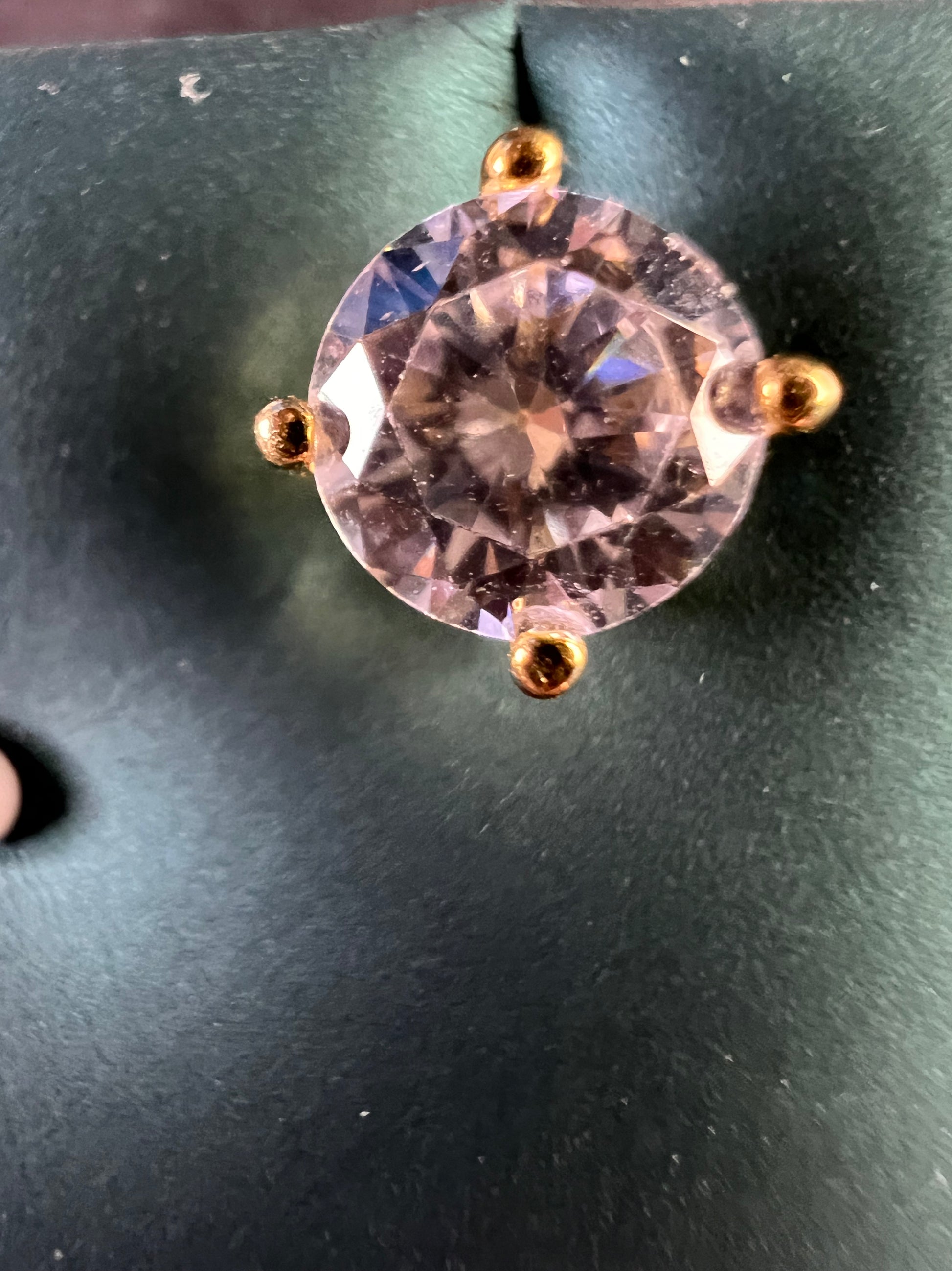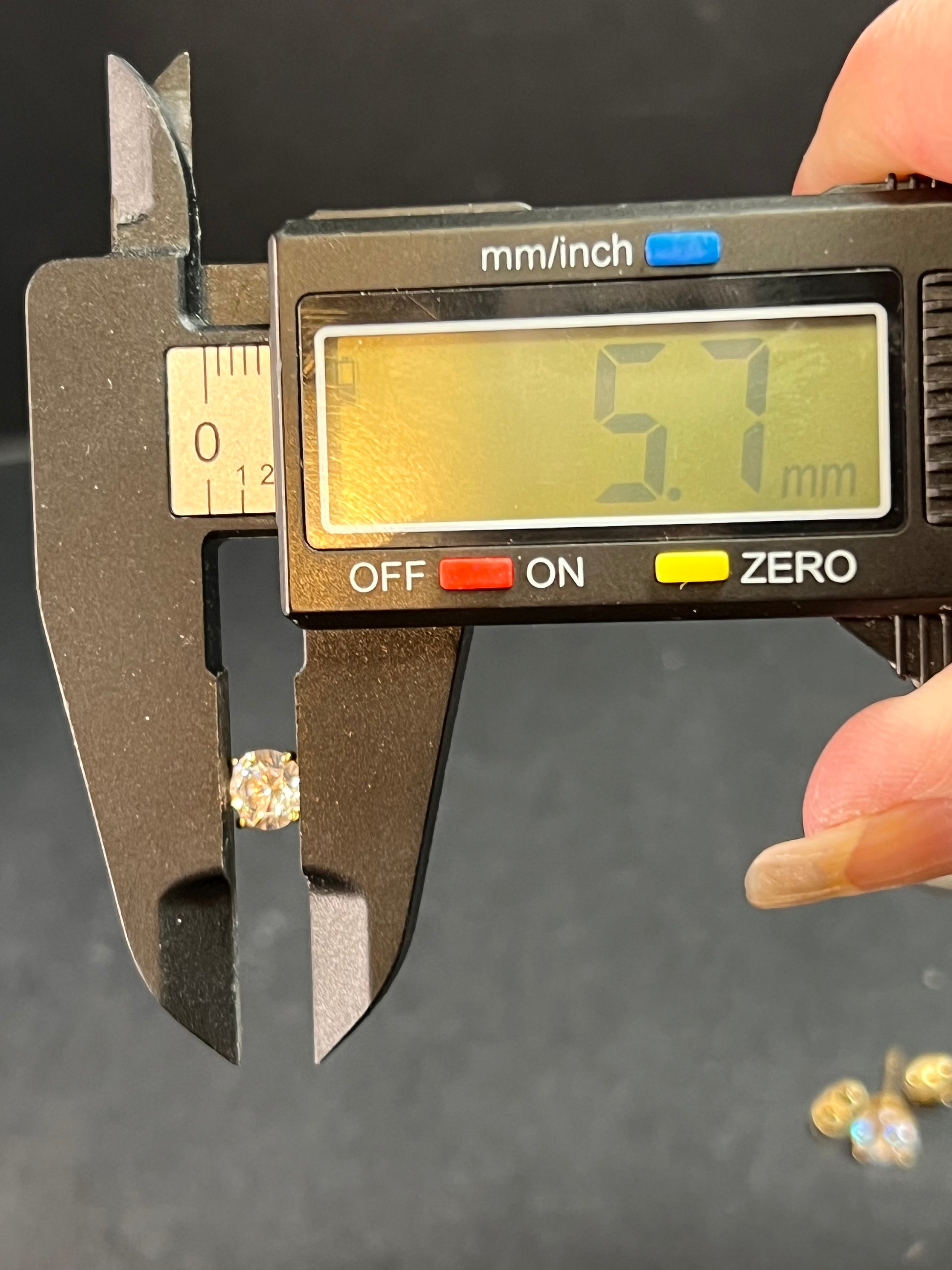 White / colorless round cut cubic zirconia gemstones measuring about 5.5-5.7mm in diameter prong set in authentic 925 sterling silver that’s plated with yellow gold. Butterfly pushbacks are also yellow gold plated over 925.
