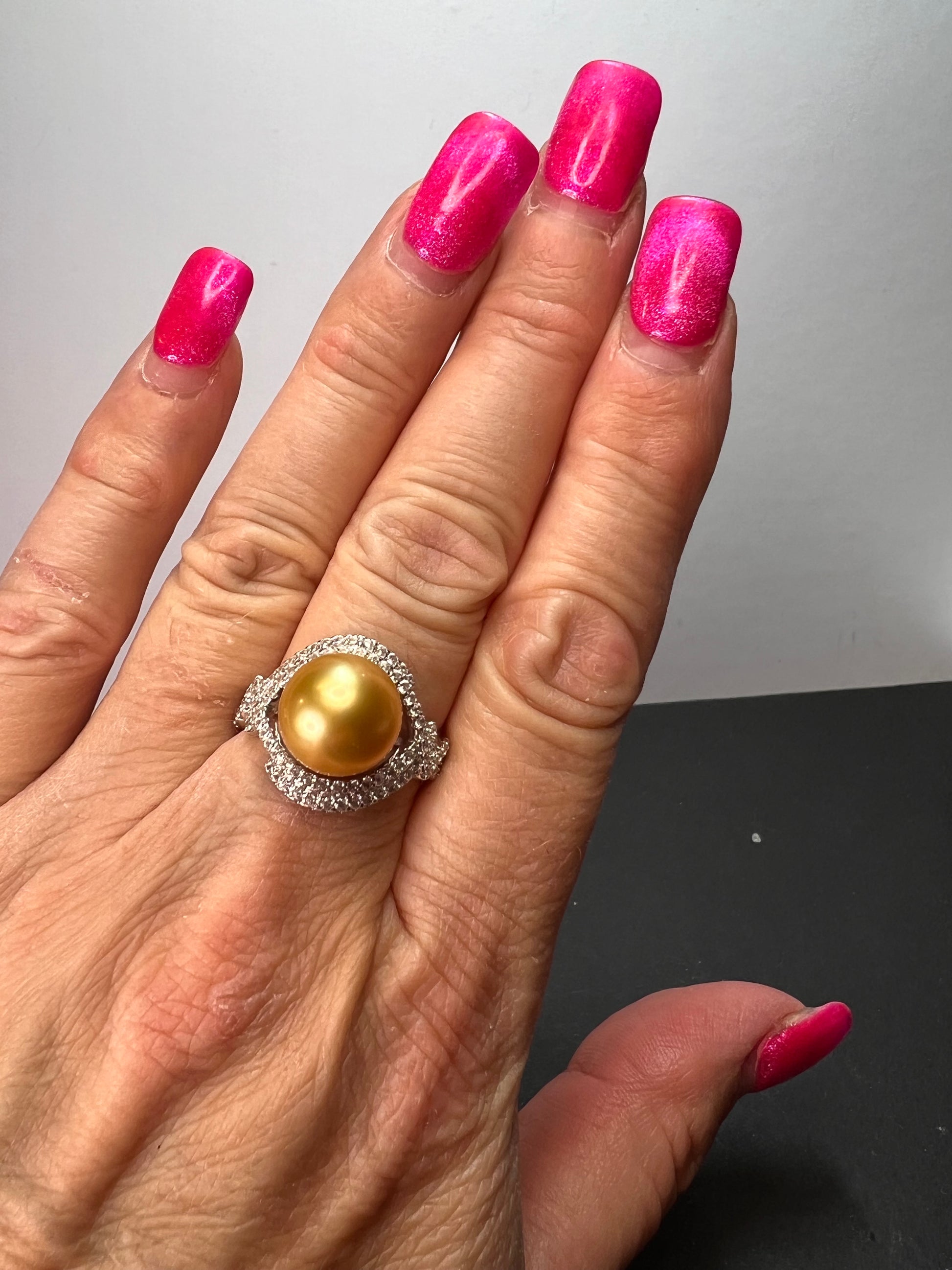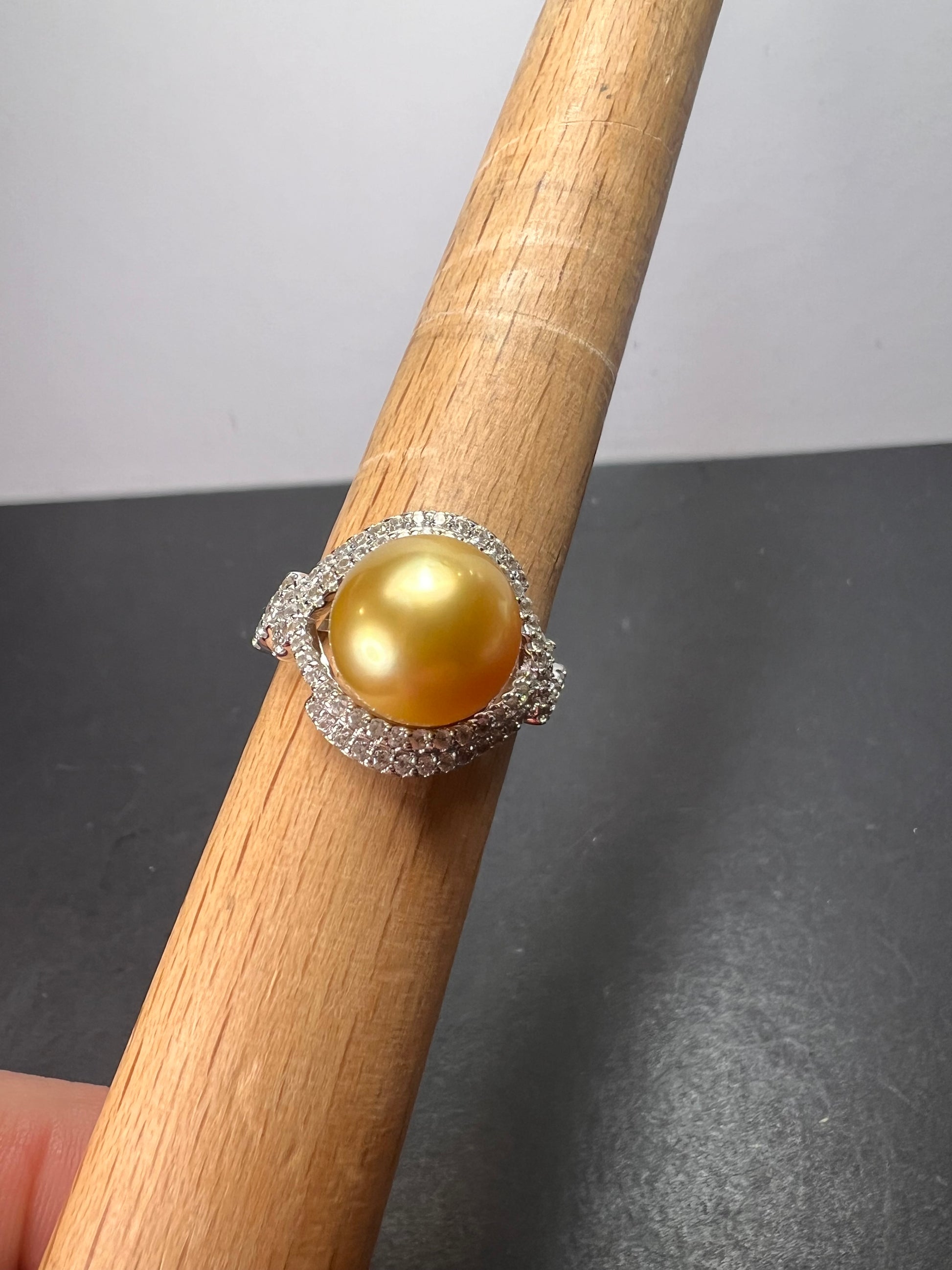 Elegant AAA1 Natural Color Deep Gold 11mm Golden South Sea Cultured Pearl Ring with White Zircon Accent.