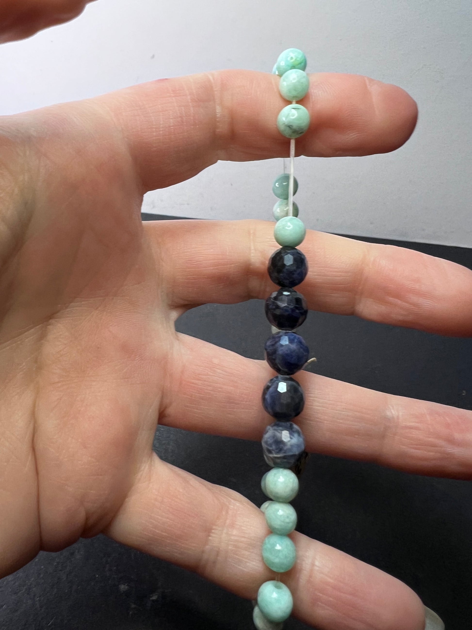 This is a new bracelet made by The Purring Buddhas. Strung on a durable stretch cord for a 7 inch wrist. Stones are 6 mm amazonite and 8mm faceted beads.