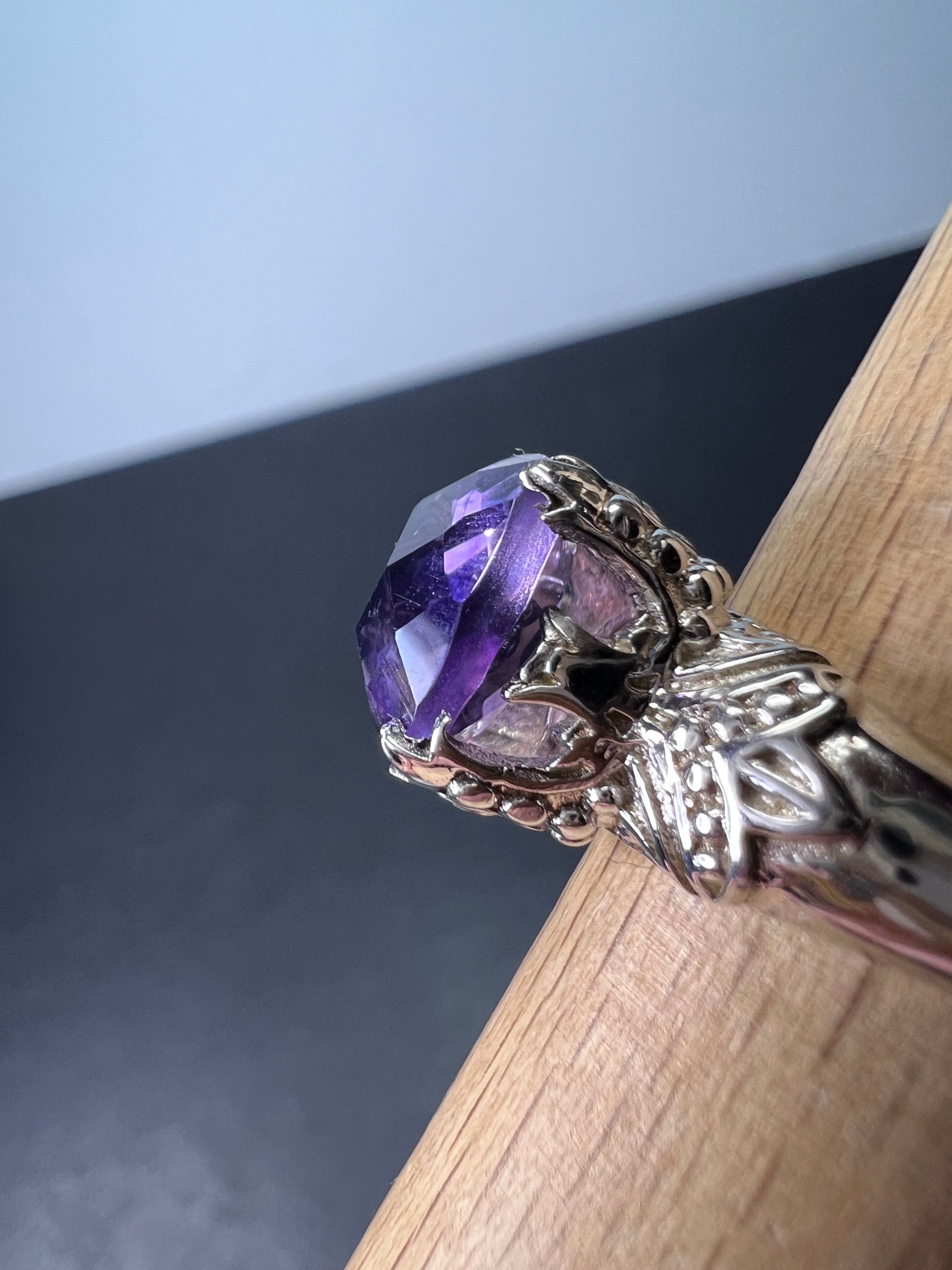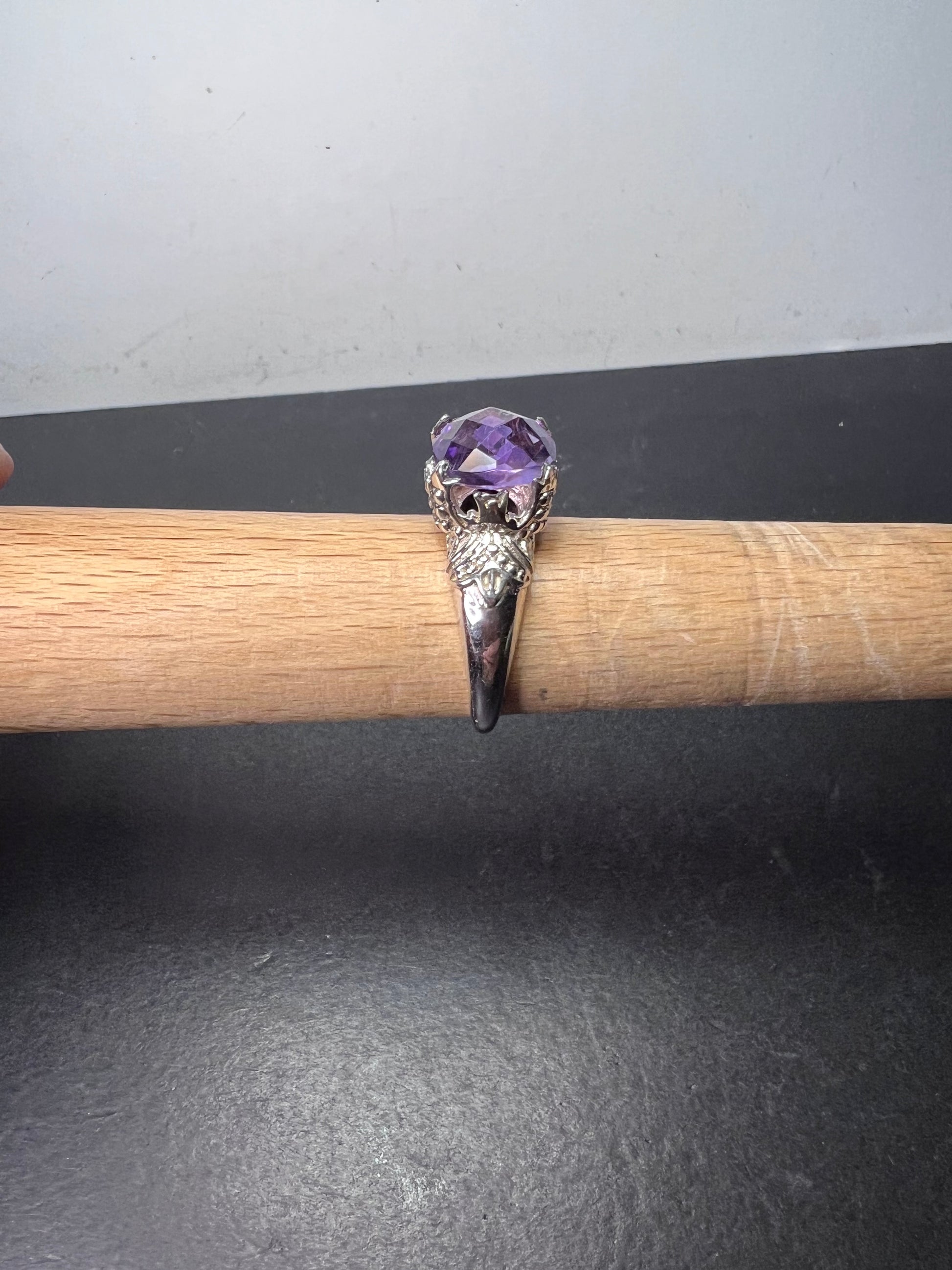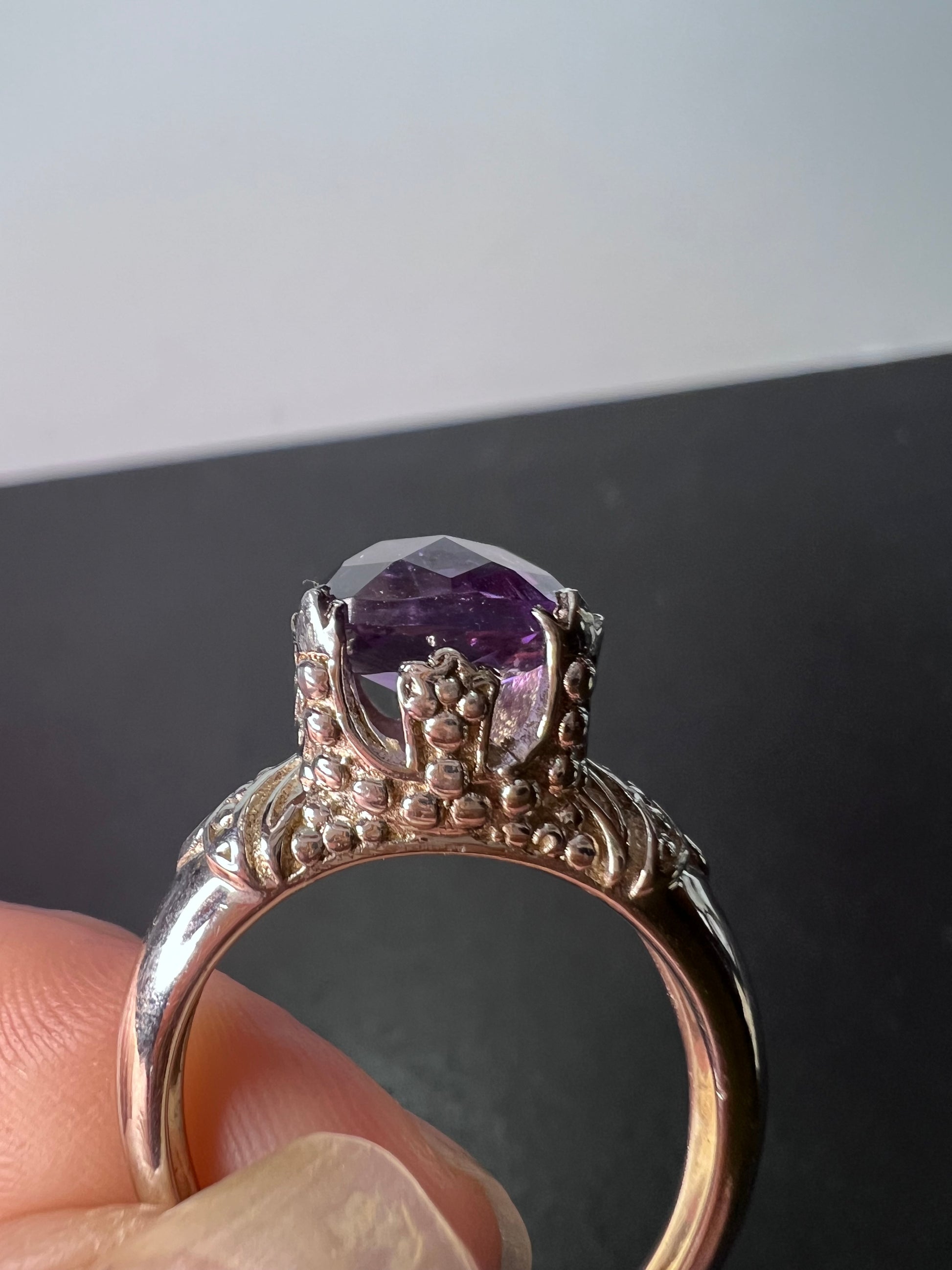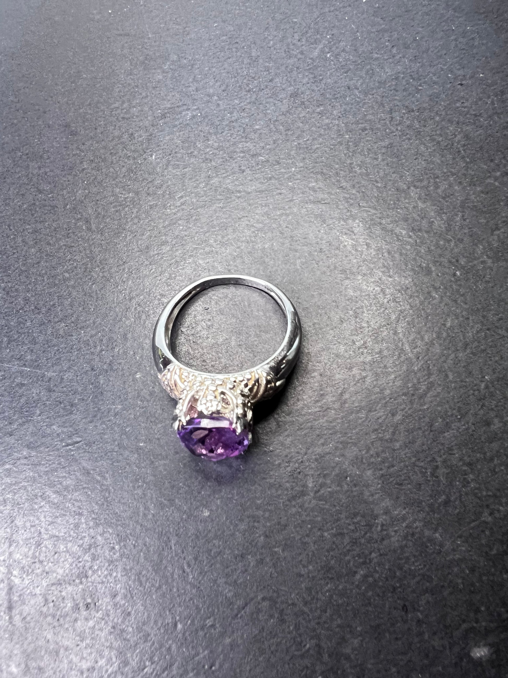 Genuine amethyst gemstone sitting on top of a crown setting. This is rhodium plated over sterling silver. Size 9. OR stamp on inside + 925