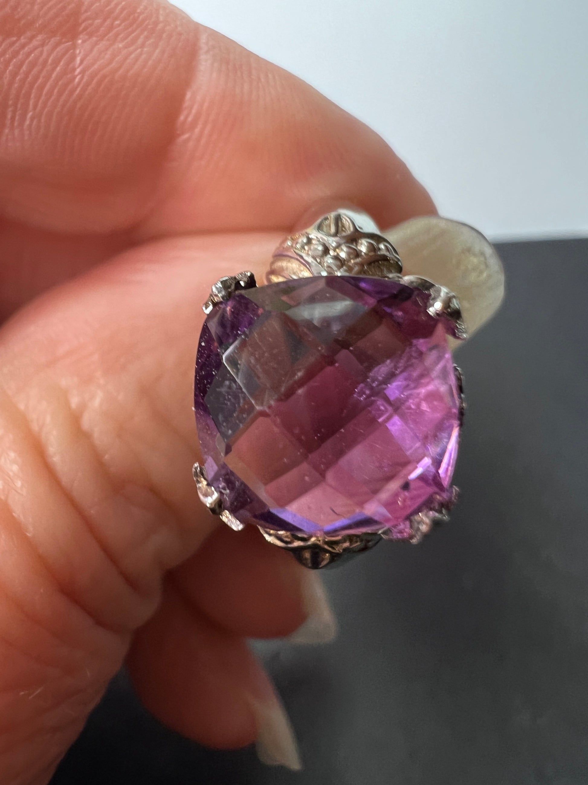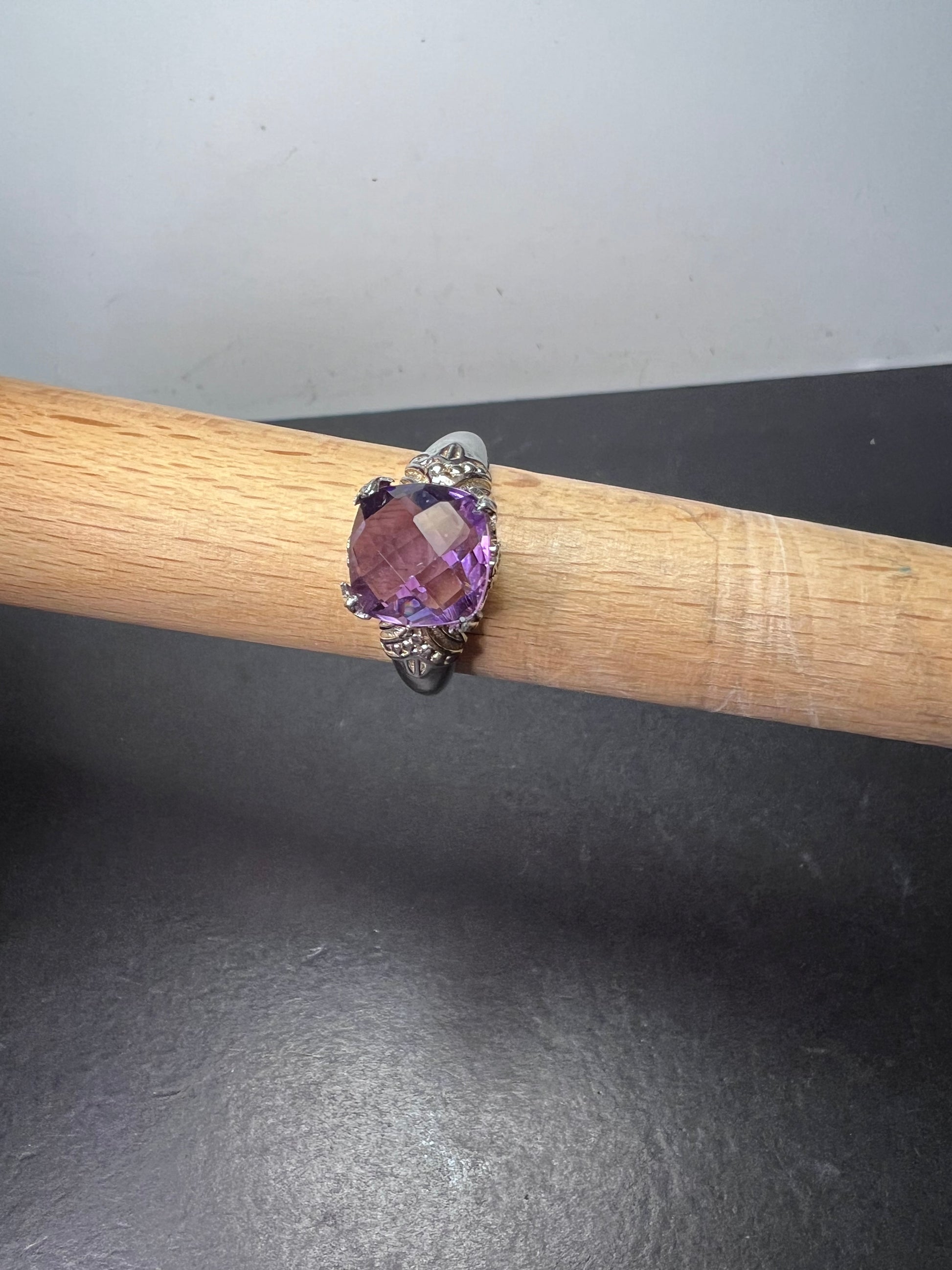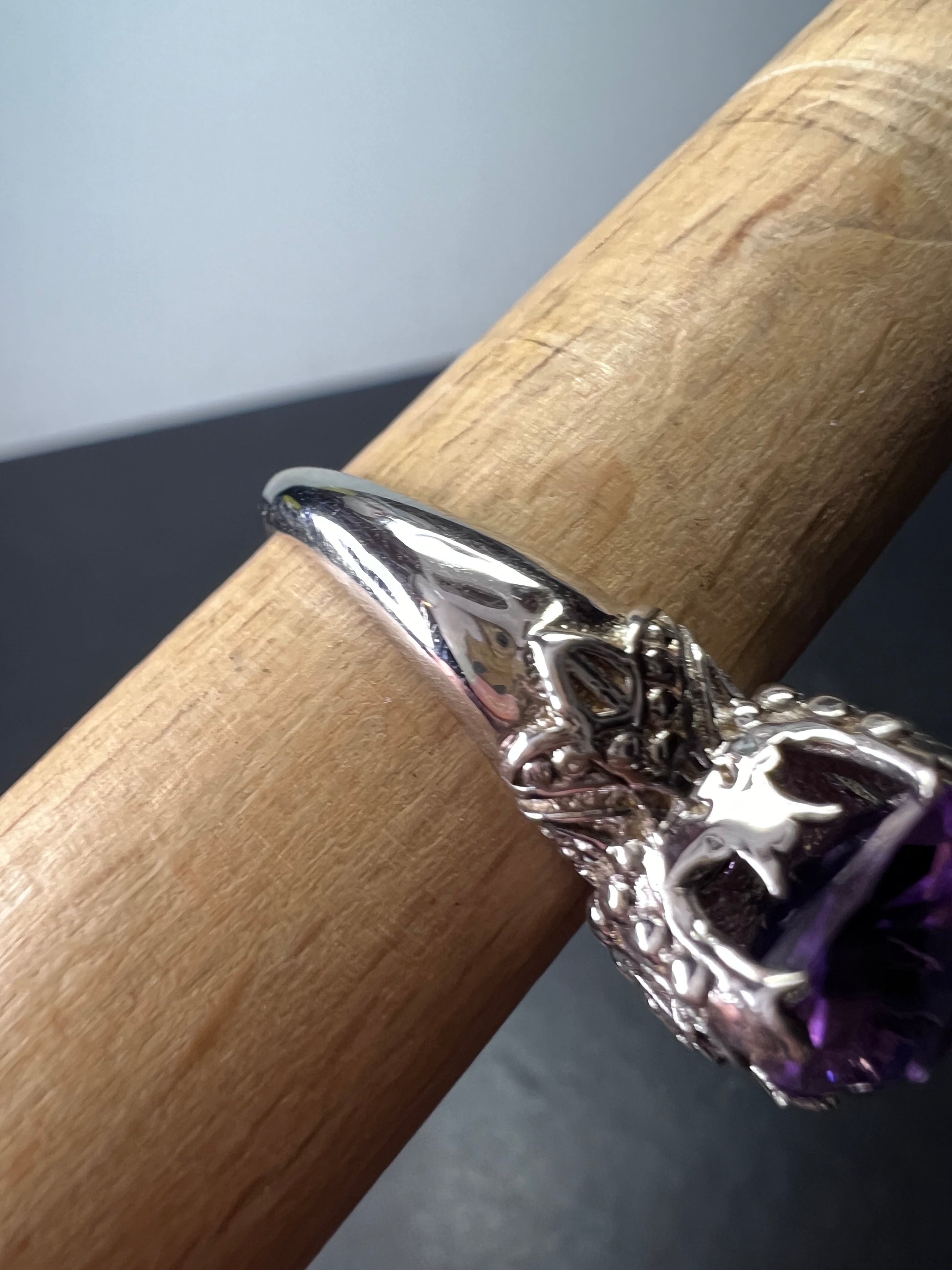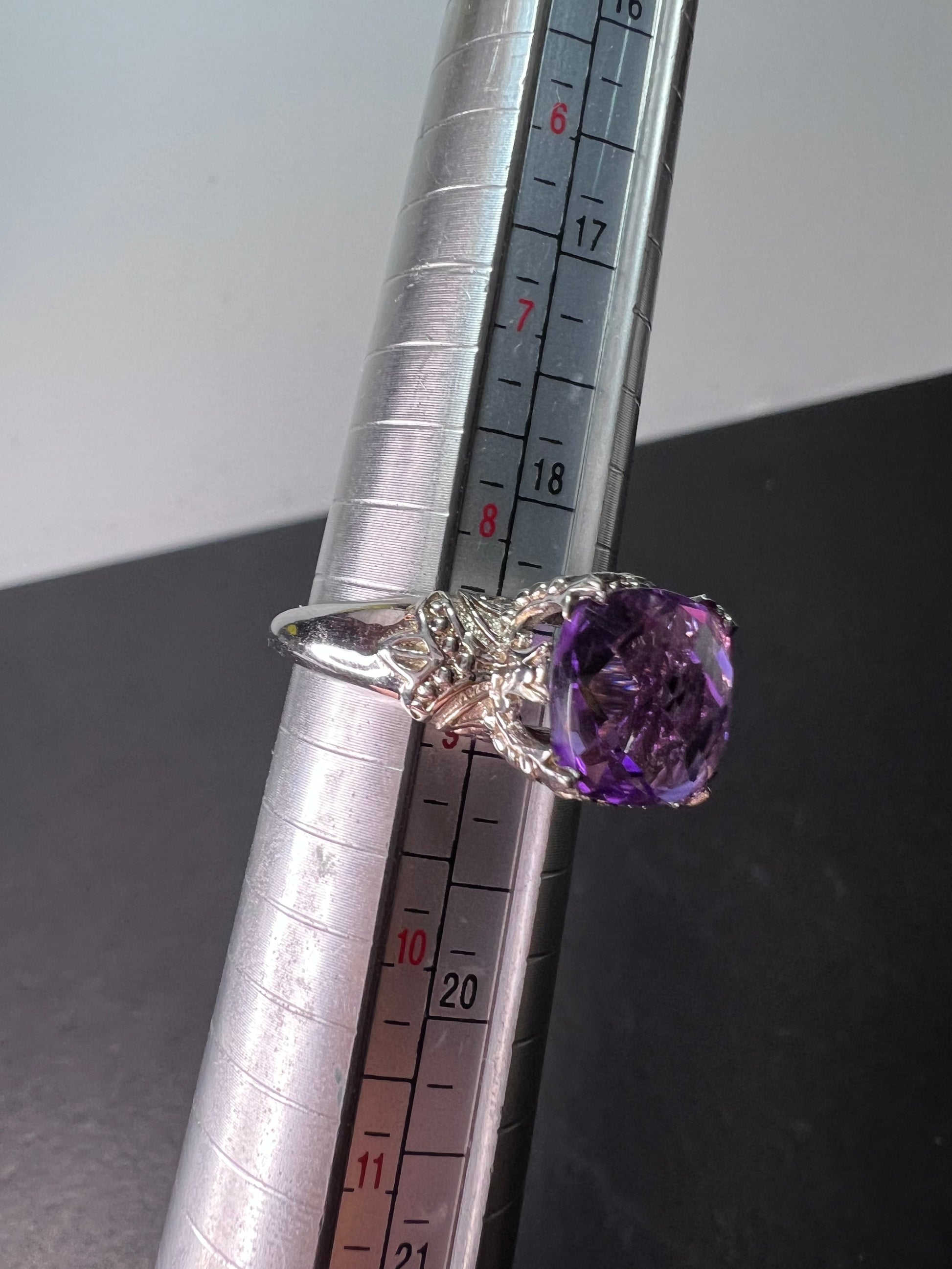 Genuine amethyst gemstone sitting on top of a crown setting. This is rhodium plated over sterling silver. Size 9. OR stamp on inside + 925