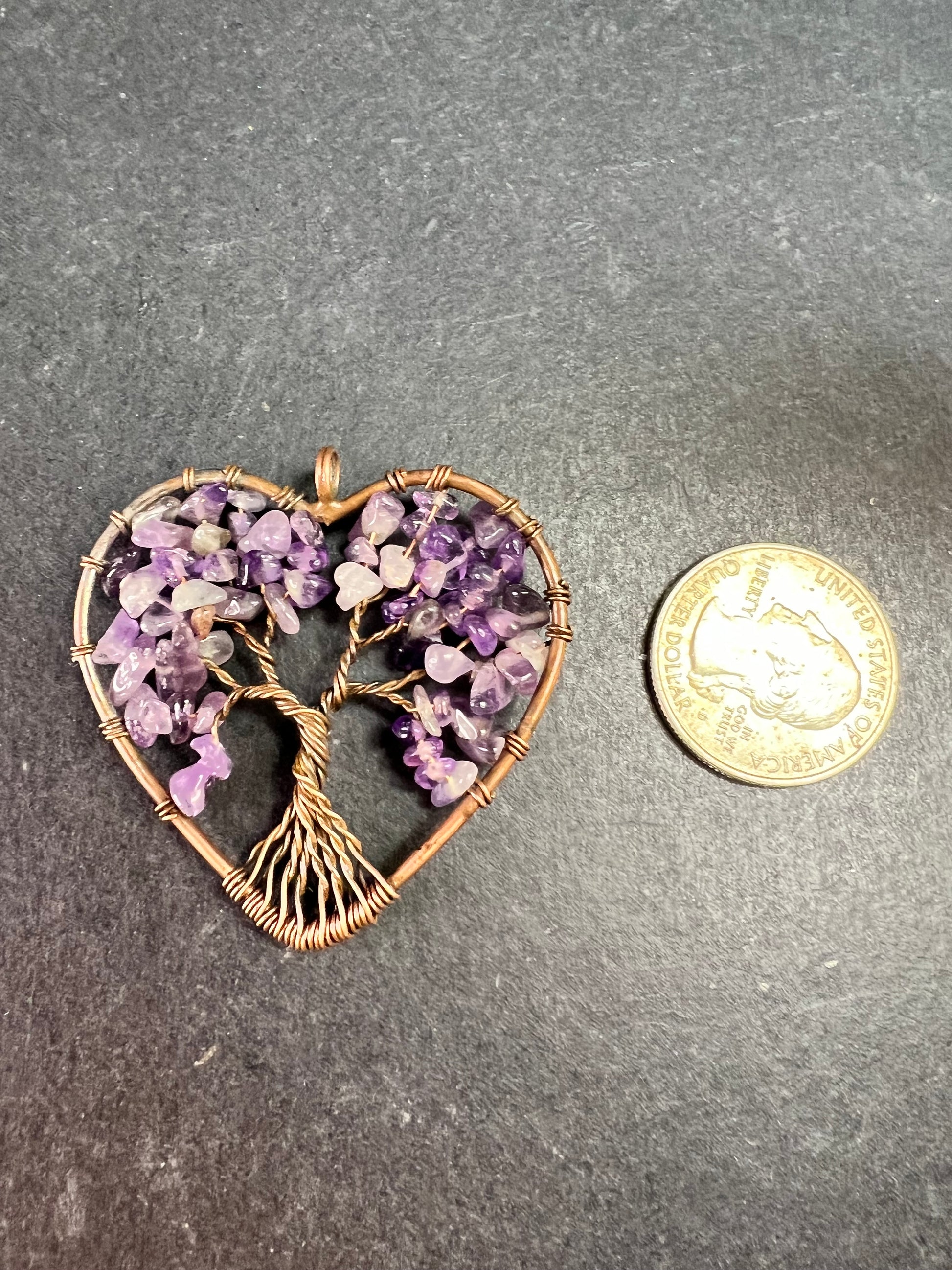 Pre-owned amethyst chip Tree of Life pendant formed in a heart shape and wrapped in warm copper wire. The design features natural purple amethyst stones arranged as leafy branches with twisted wire roots at the base, giving it an earthy, handcrafted look. Amethyst stones show natural variation in tone from pale lavender to deeper violet. Copper wire has developed a light natural patina consistent with age and wear. Pendant is unmarked and sold as costume jewelry. Please see photos for exact size, scale shown next to a U.S. quarter, and overall condition.