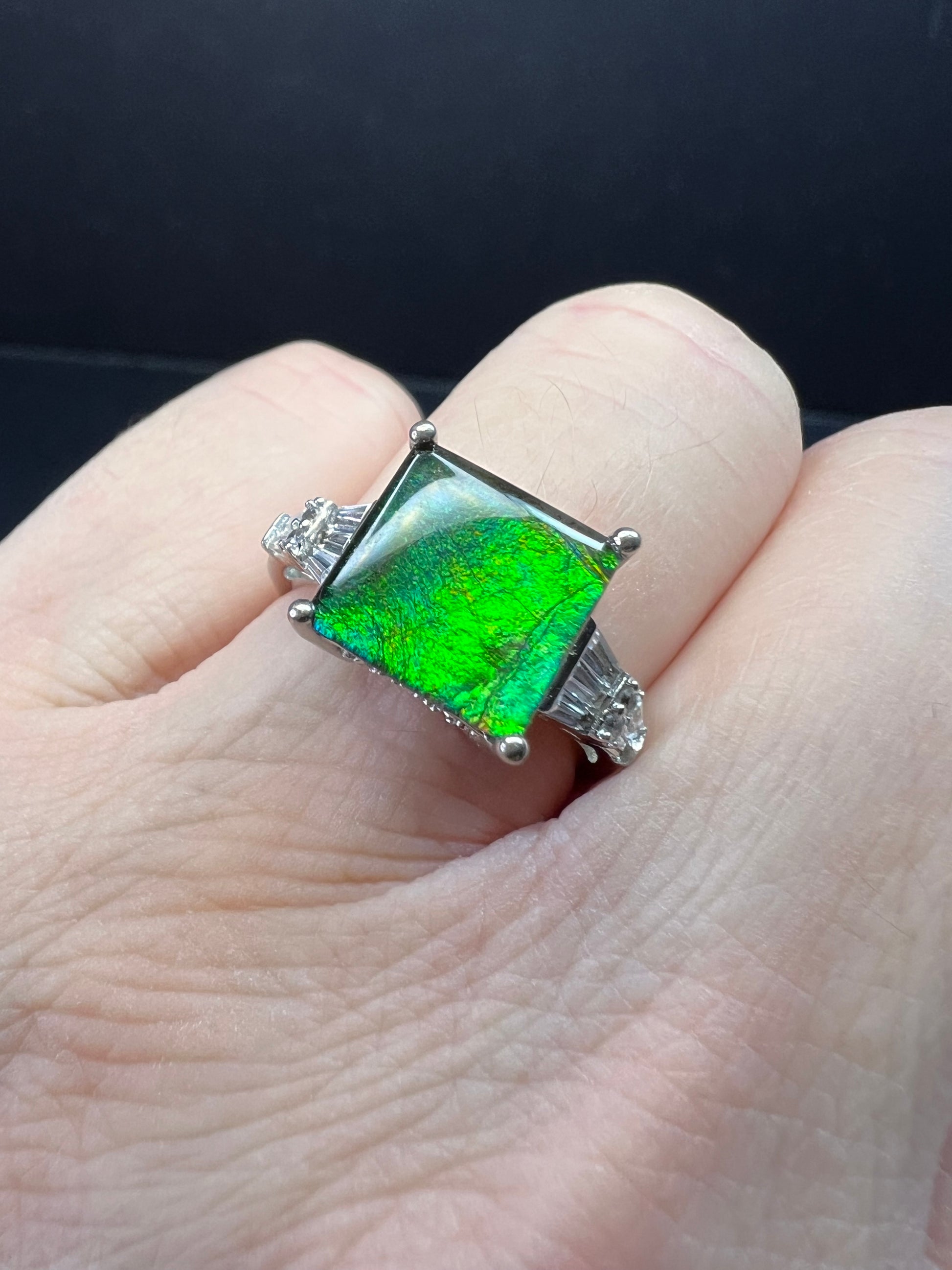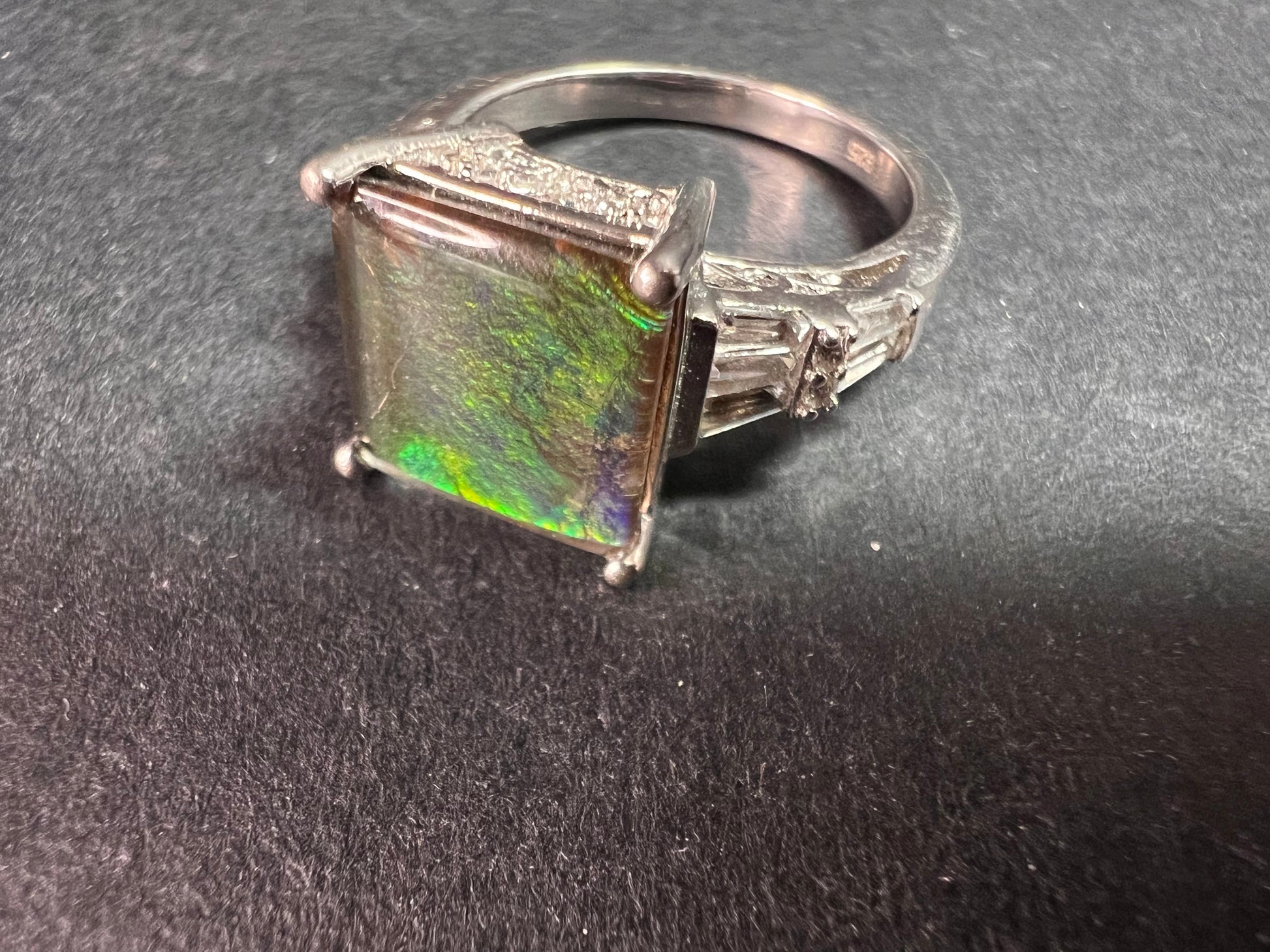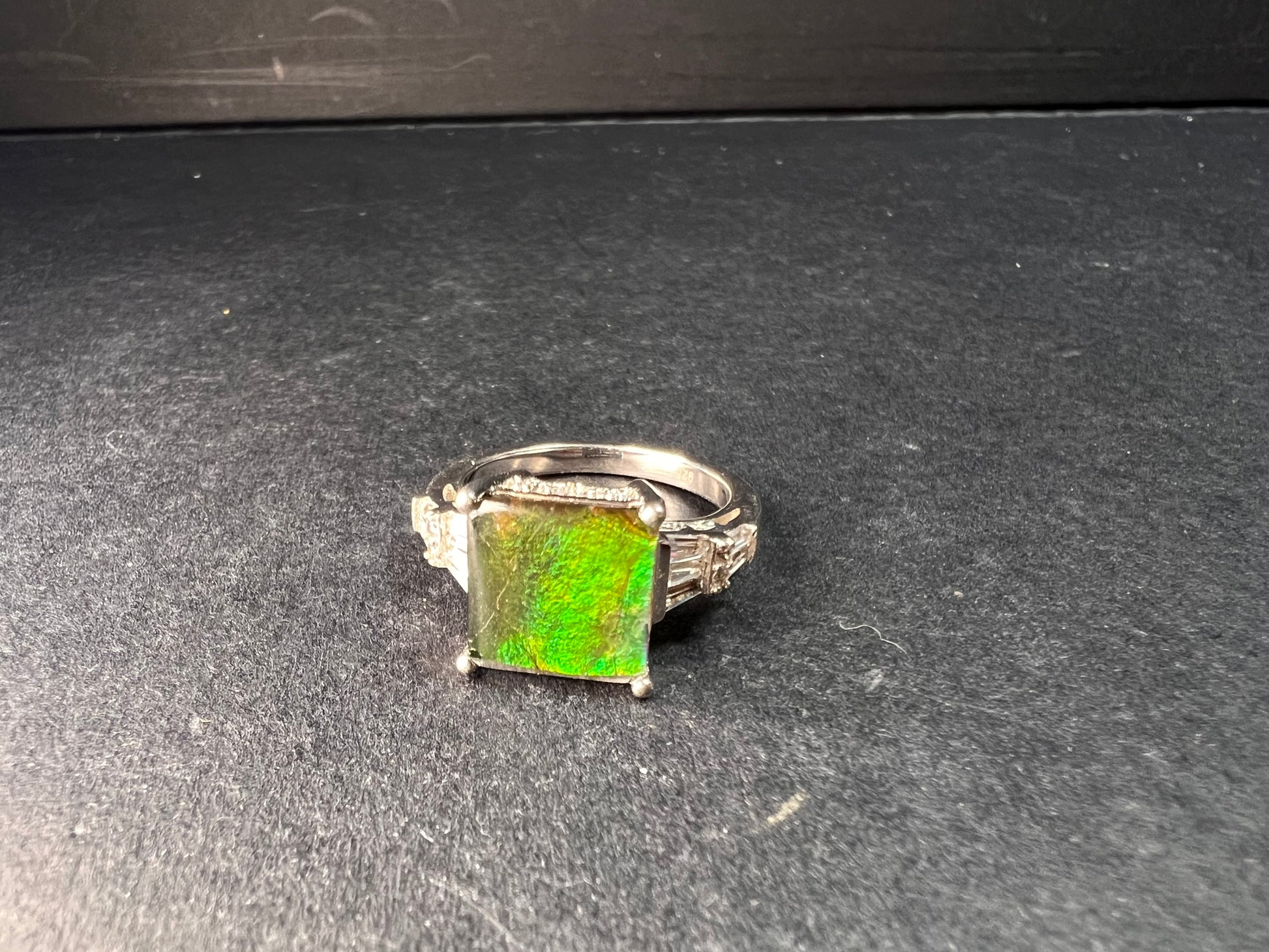 Genuine stunning ammonite square cut gemstone with mostly green and flashes of blue , turquoise, orange and a hint of red. White accent baguette stones test as topaz. Prong set in 925 sterling silver that’s plated with platinum or rhodium. Measures a size 7. Total weight is 4.02 grams. No found makers mark. Ammolite stone is likely from Canada and measures 11mm on each side. Photos don’t do this ammolite enough justice. Just when you think you’ve seen all the colors it offers , it flashes new hidden colors depending on the lighting. This is what I’d call an heirloom ring.