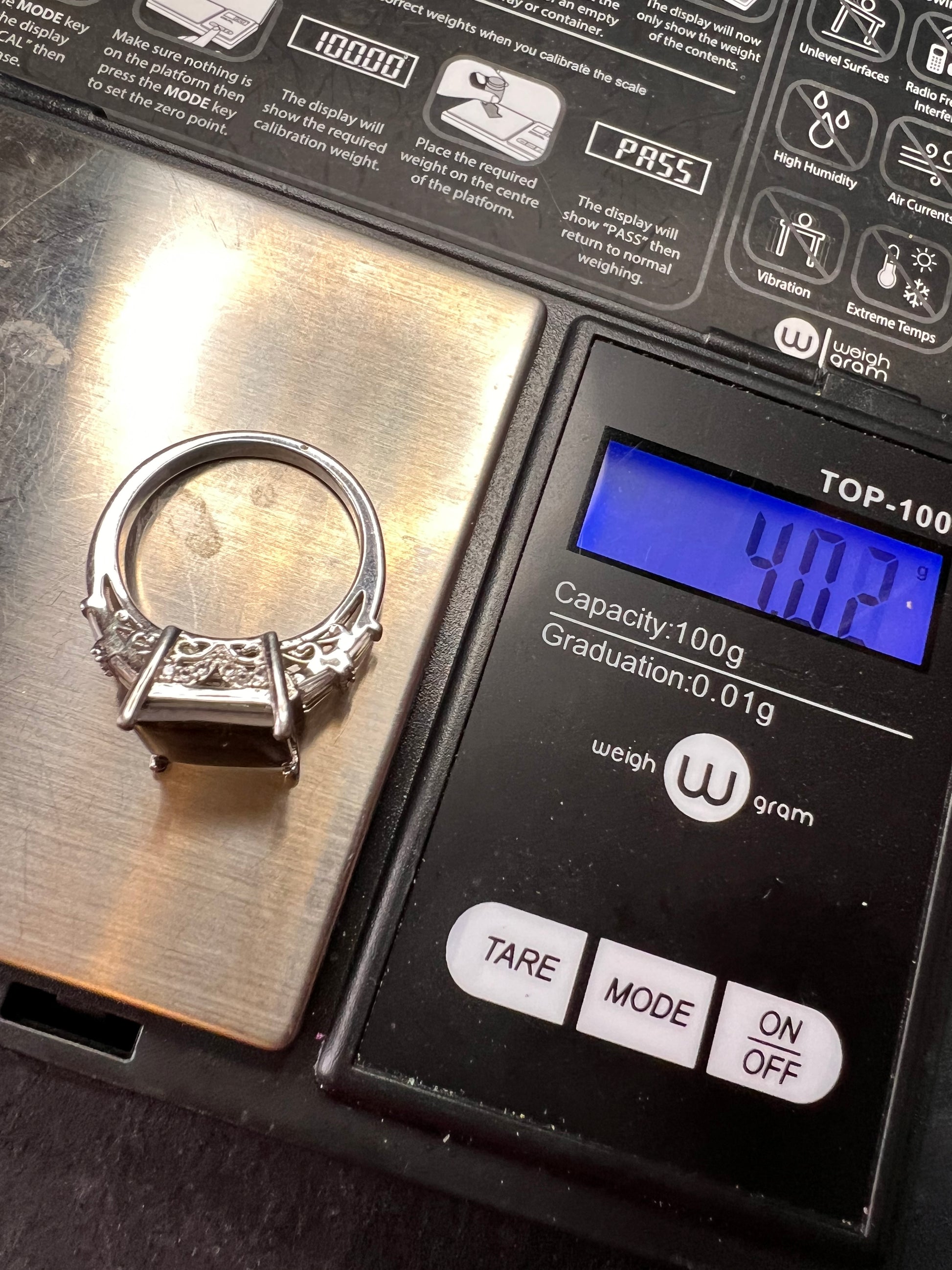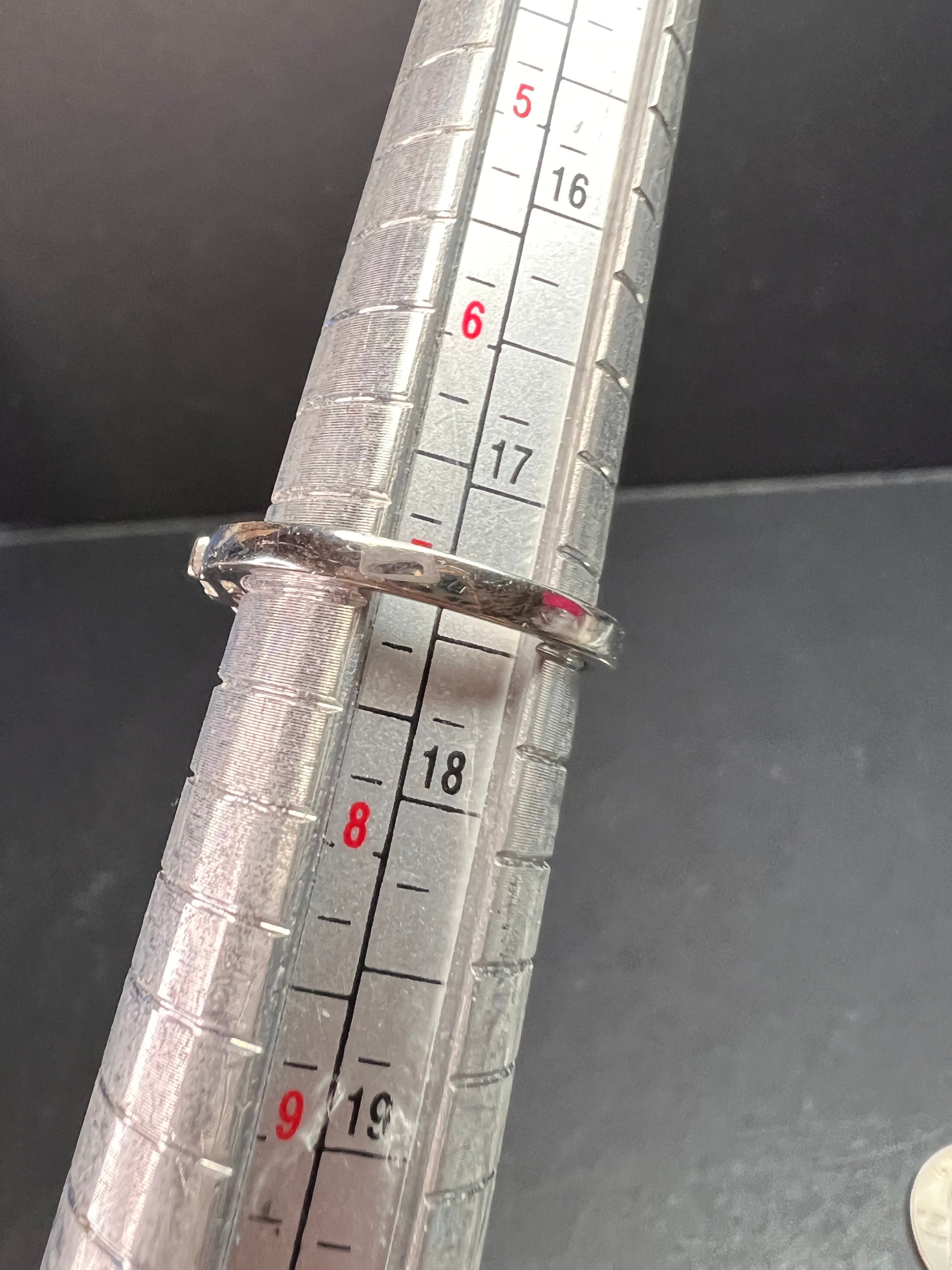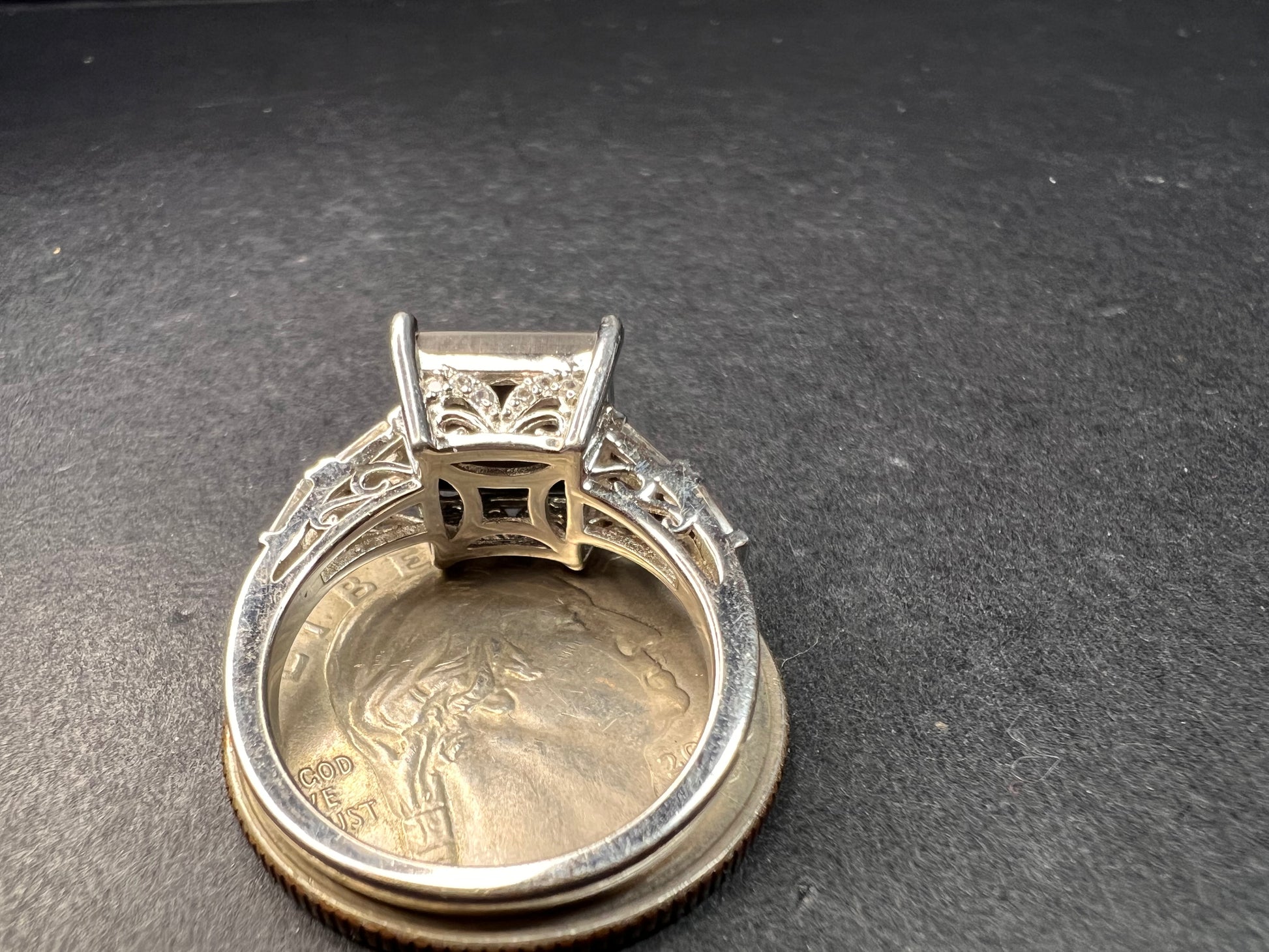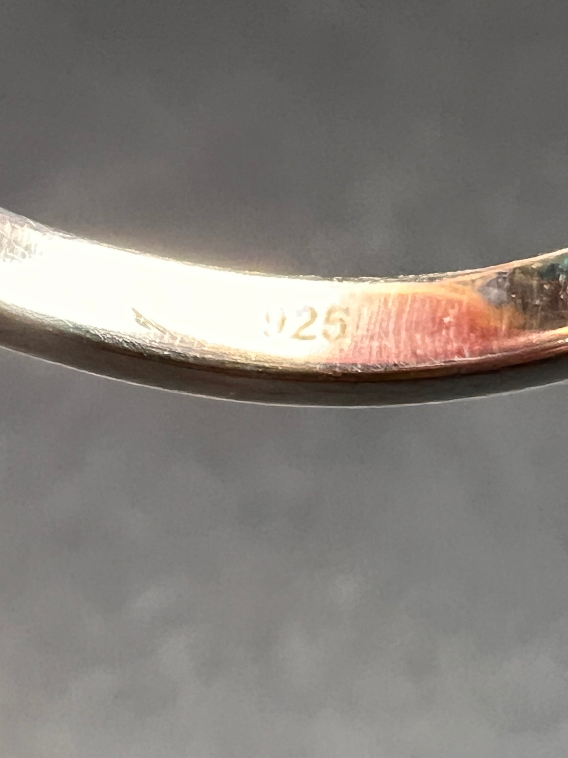 Genuine stunning ammonite square cut gemstone with mostly green and flashes of blue , turquoise, orange and a hint of red. White accent baguette stones test as topaz. Prong set in 925 sterling silver that’s plated with platinum or rhodium. Measures a size 7. Total weight is 4.02 grams. No found makers mark. Ammolite stone is likely from Canada and measures 11mm on each side. Photos don’t do this ammolite enough justice. Just when you think you’ve seen all the colors it offers , it flashes new hidden colors depending on the lighting. This is what I’d call an heirloom ring.