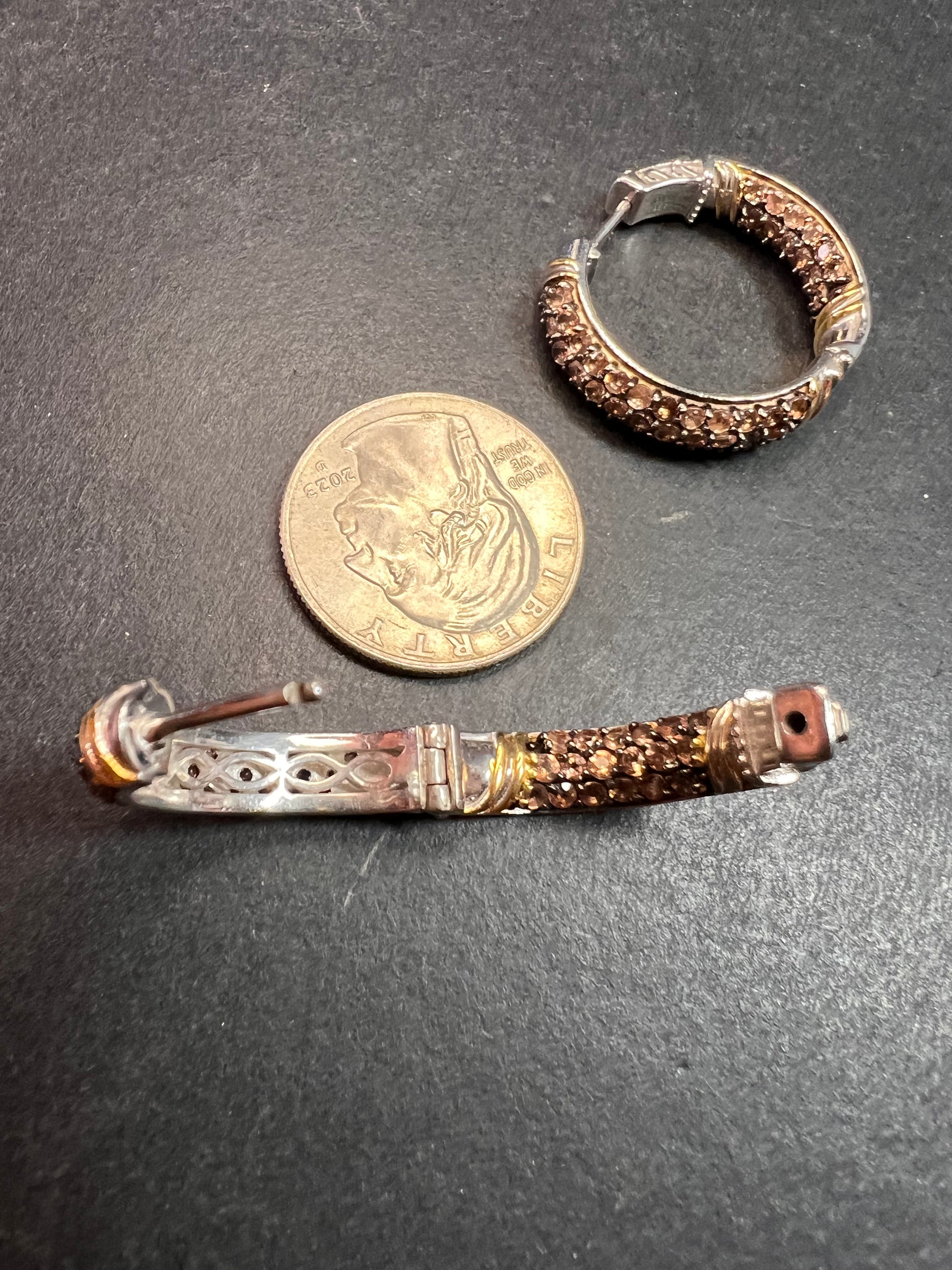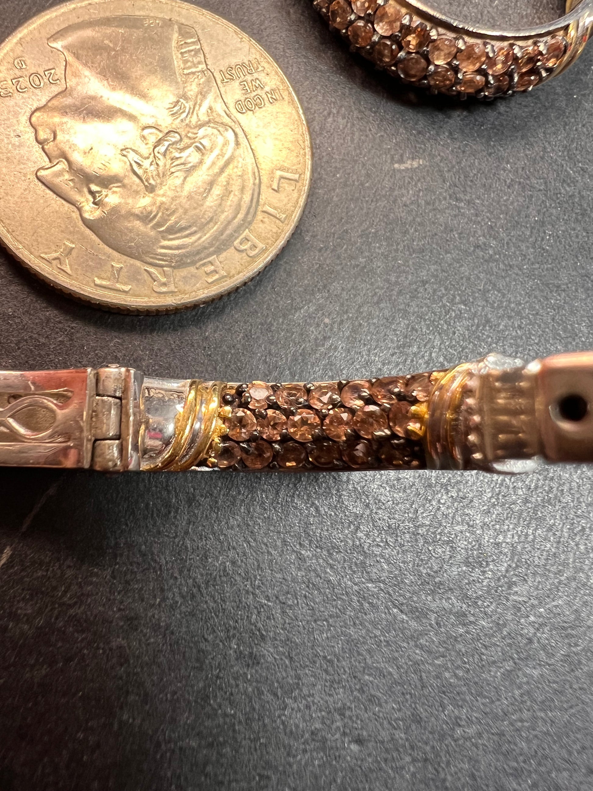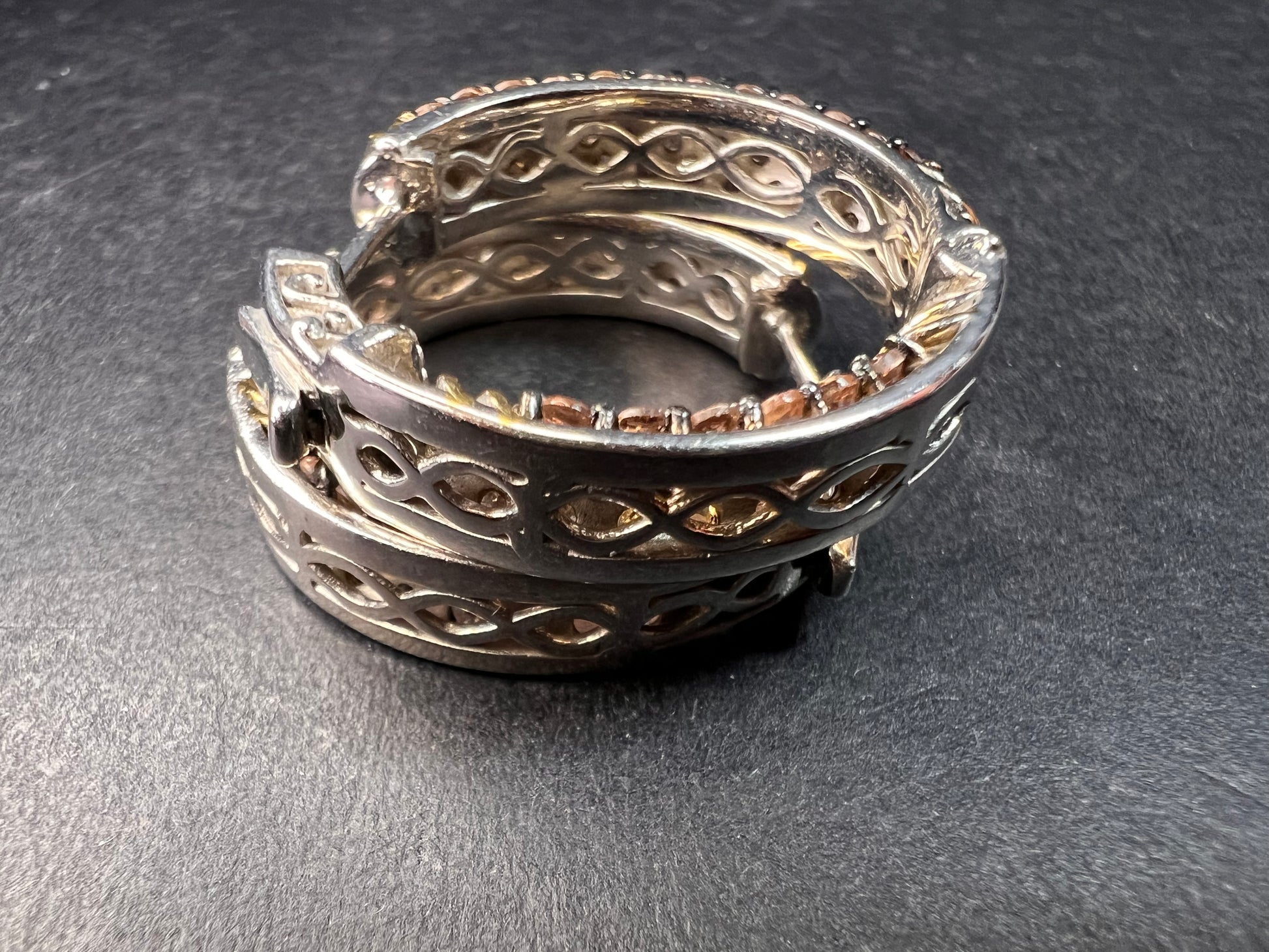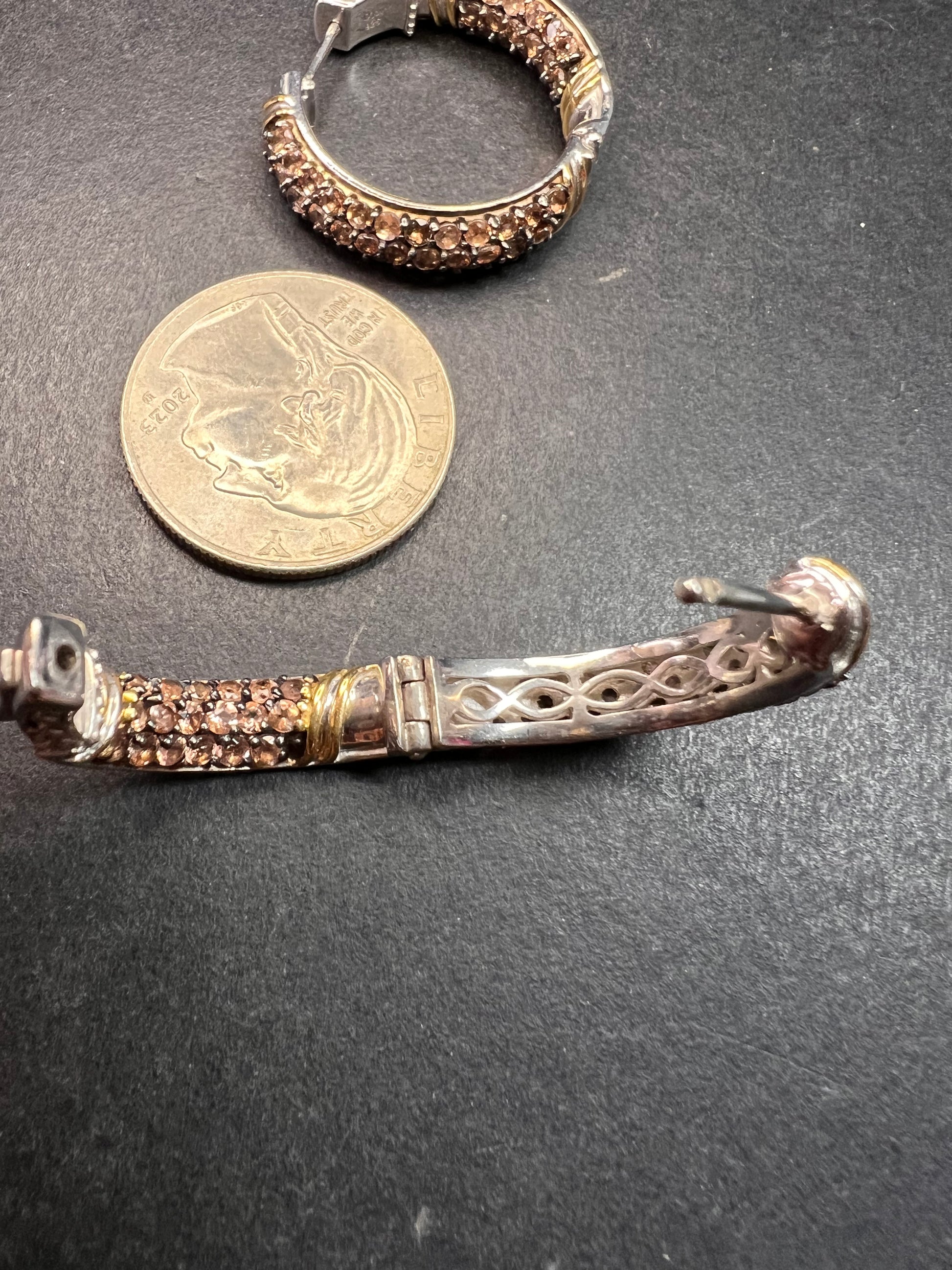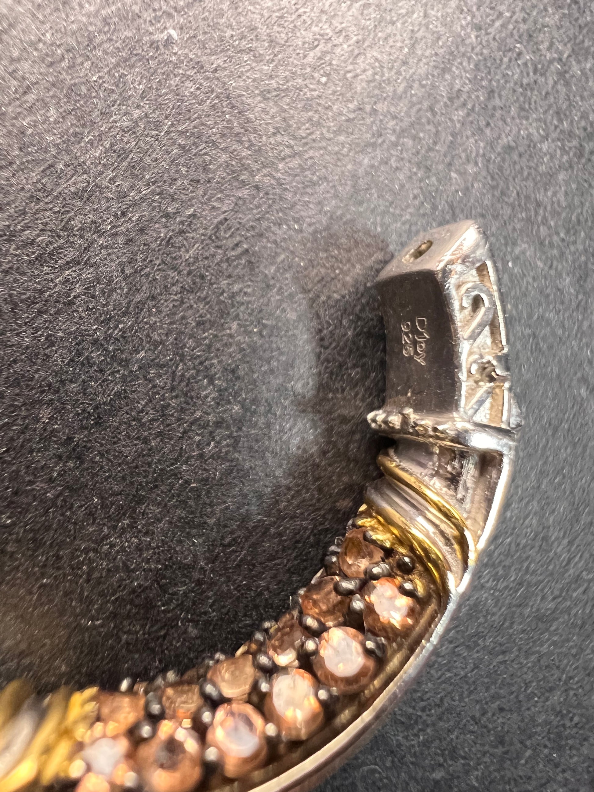 Andalusite gemstones prong set in authentic 925 sterling silver that’s plated with yellow gold and rhodium or platinum. Prong tips are plated with black rhodium for a 3 toned finish. Secure latch opening with hinges for easy removal and security. 925 Djoy. Estimated retail value is between $500-$1,200.