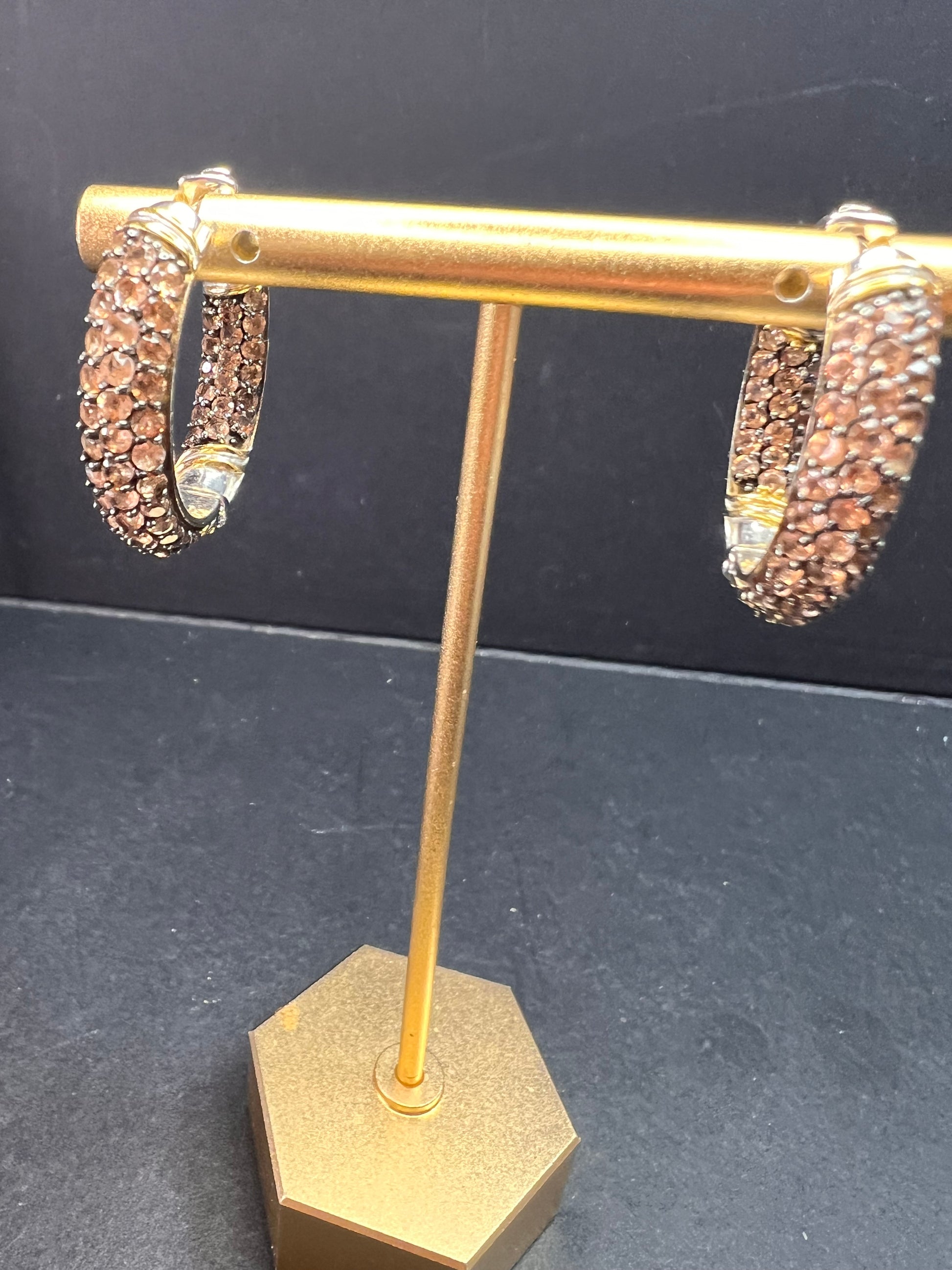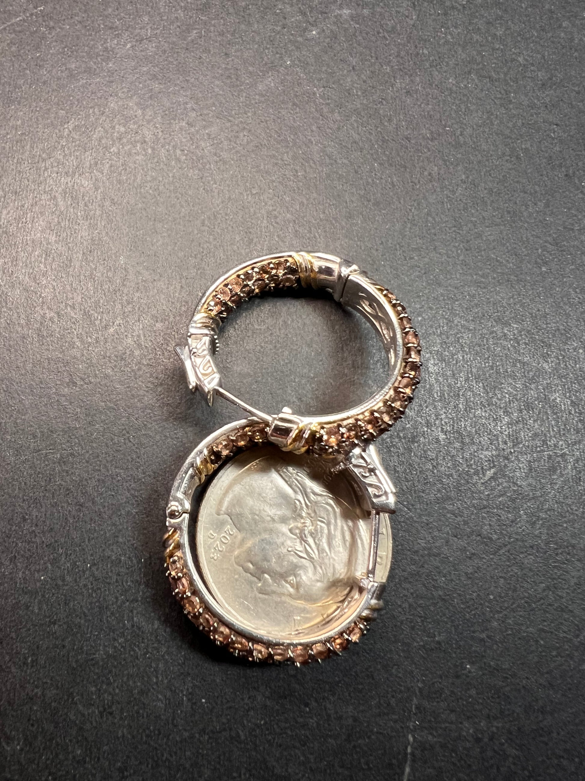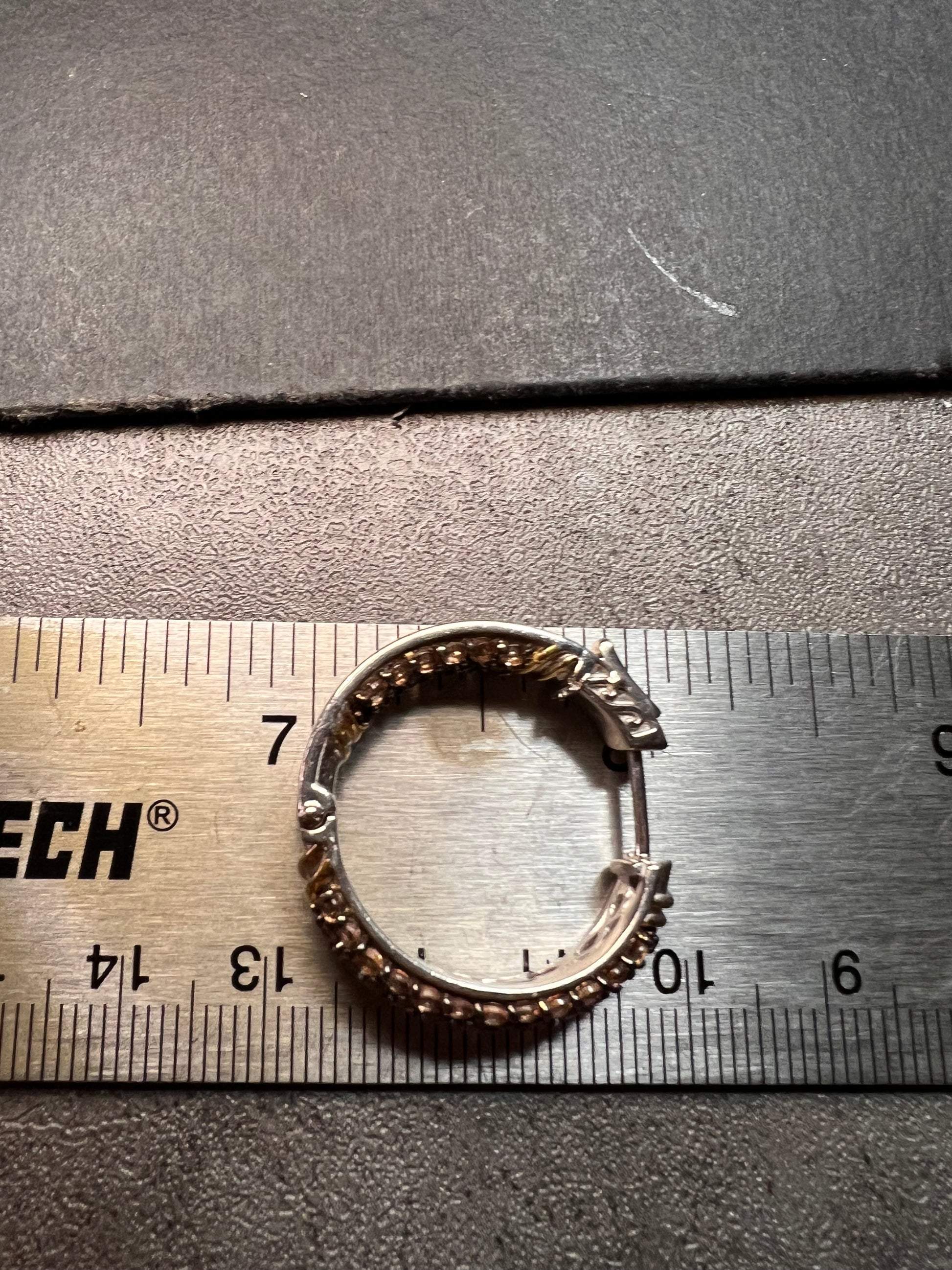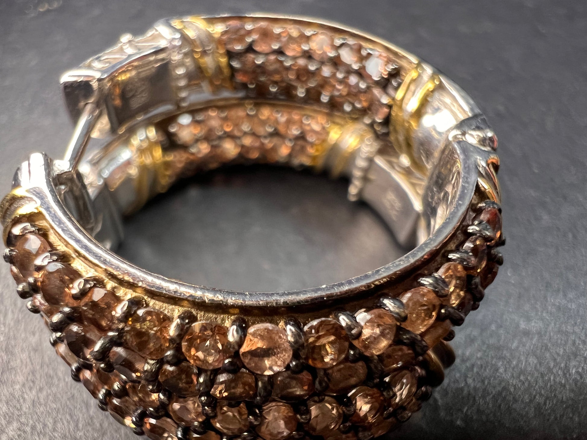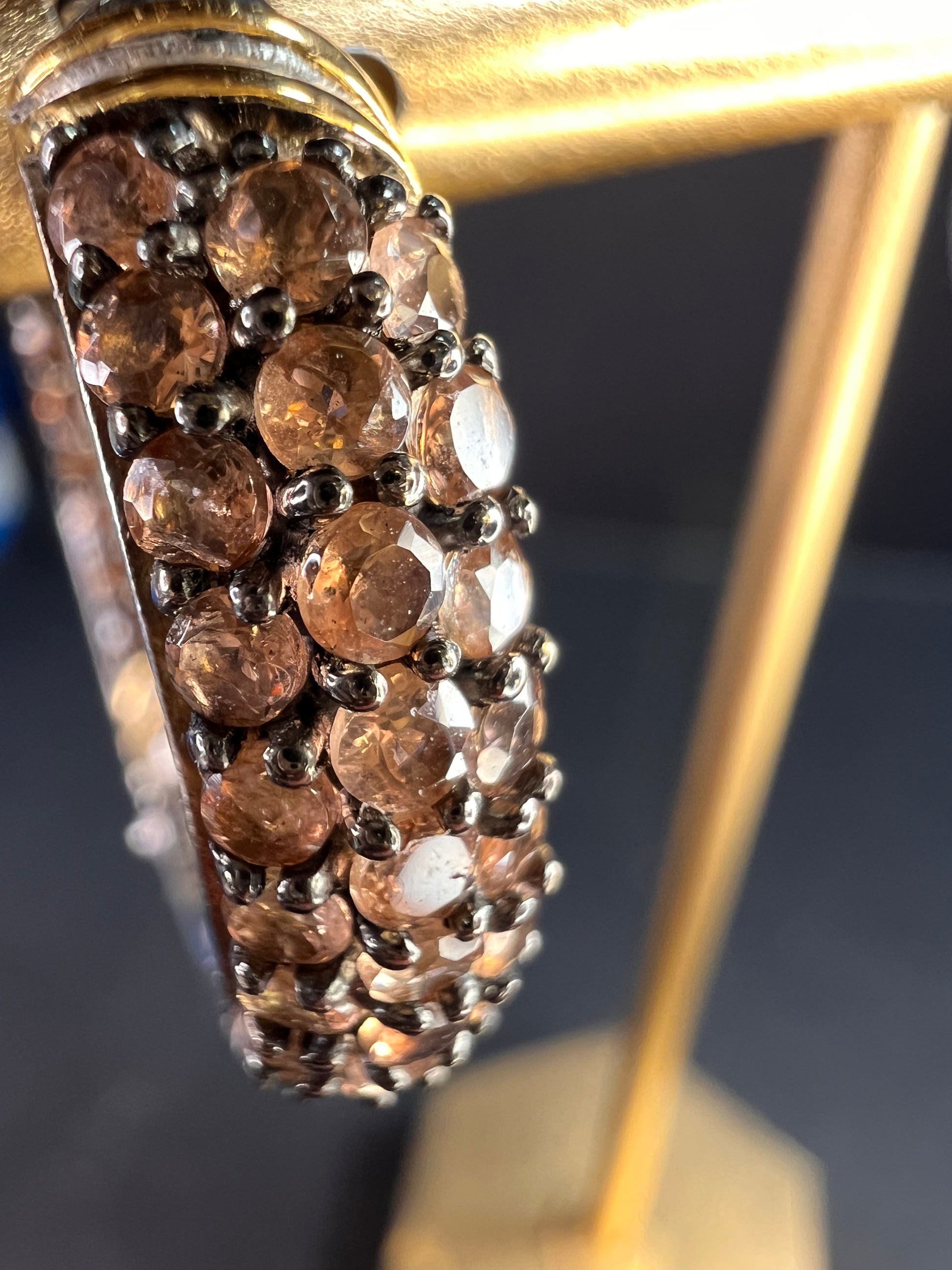 Andalusite gemstones prong set in authentic 925 sterling silver that’s plated with yellow gold and rhodium or platinum. Prong tips are plated with black rhodium for a 3 toned finish. Secure latch opening with hinges for easy removal and security. 925 Djoy. Estimated retail value is between $500-$1,200.
