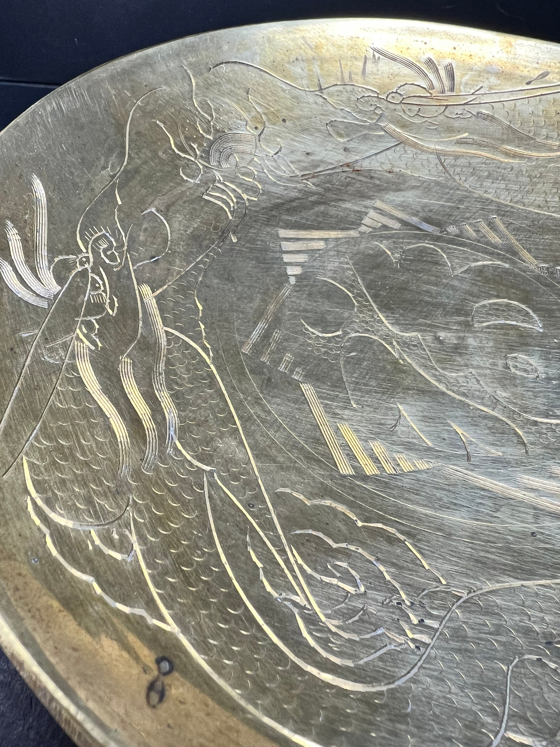 Antique 1920s Chinese Etched Brass Dragon Bowl - 10” Hand Engraved MCM Decor