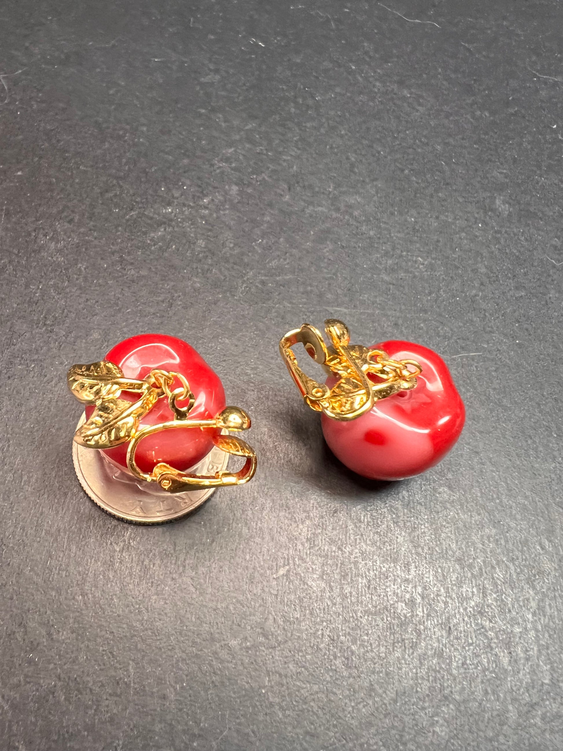 This Vintage, pre-owned set is in excellent condition, with clips functioning securely and only minor surface wear consistent with age. This charming pair of dangle earrings is the iconic Avon "Apple A Day" design, dating from the early 1990s. The apples are crafted from glossy, deep red marbled lucite topped with bright gold-tone metal leaves and secure clip-back hardware. As costume jewelry, the materials are Lucite (Acrylic Resin) and Gold-Tone Base Metal, with no CTW applicable. The earrings measure a total drop length of 3.1 \text{ cm} (\approx 1.2 \text{ inches}), and the apple width is 1.8 \text{ cm} (\approx 0.7 \text{ inches}). They are a perfect piece of retro style ready to wear.