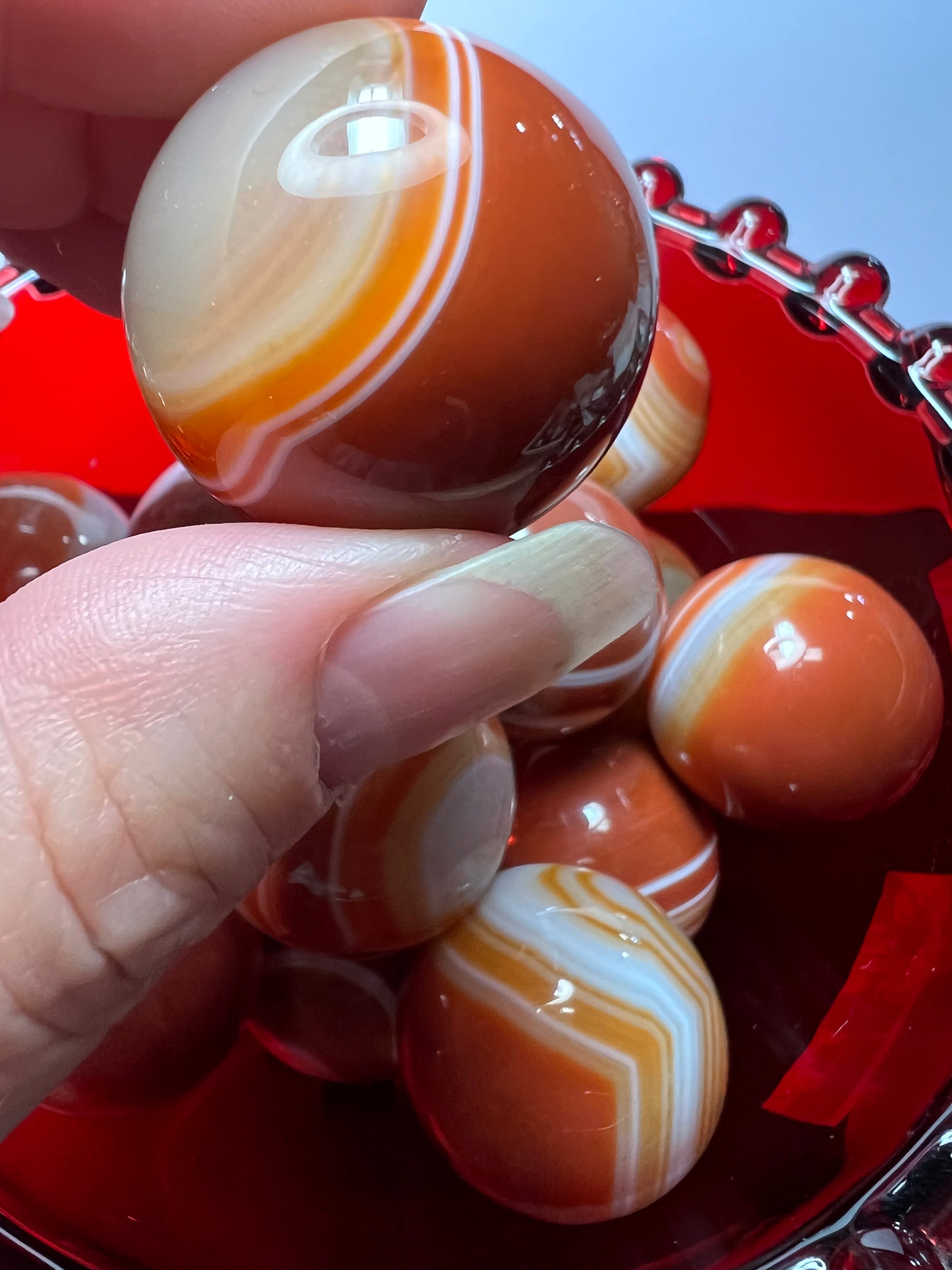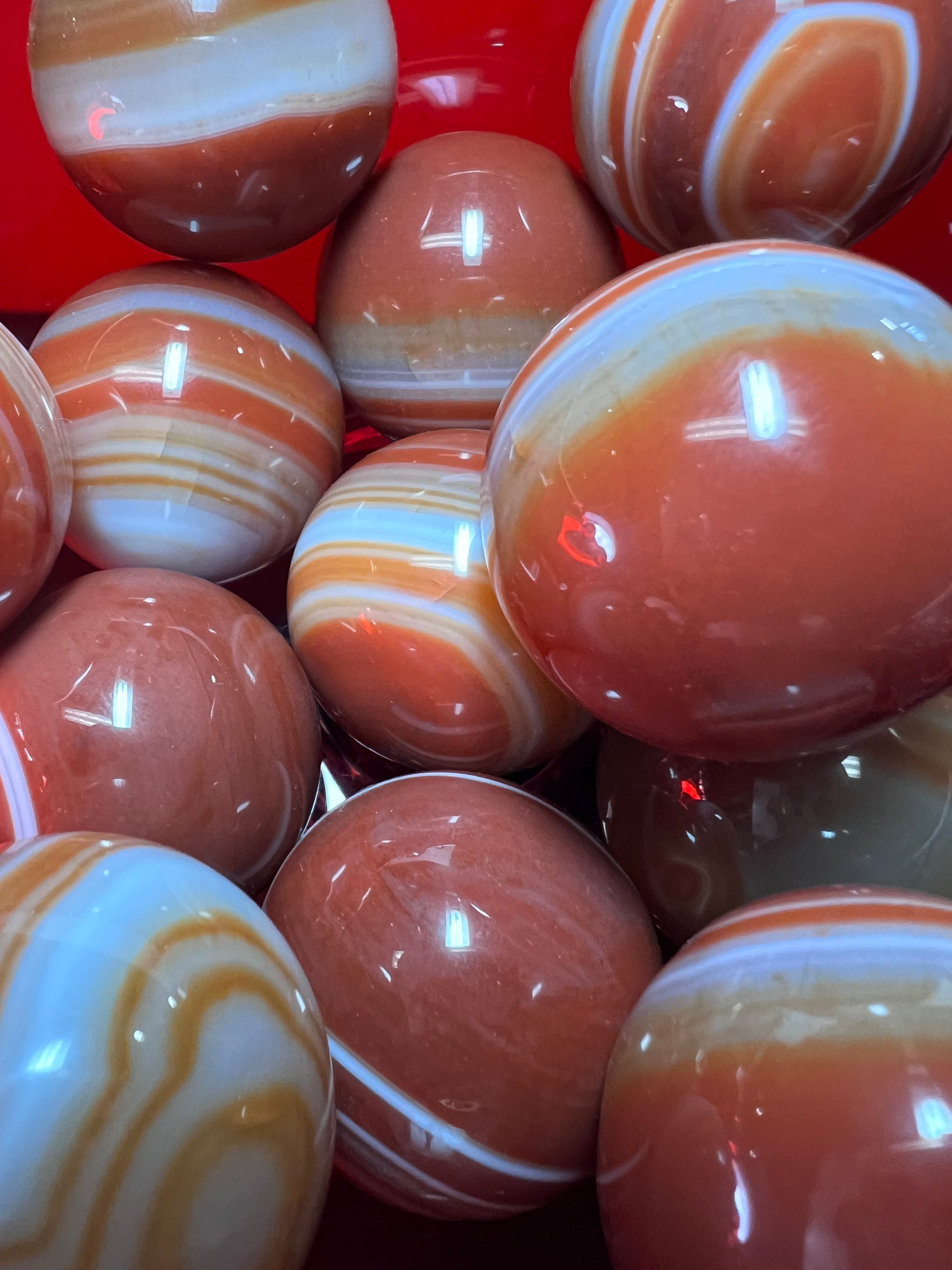 Incredibly beautiful banded carnelian spheres that average around 30mm in diameter.