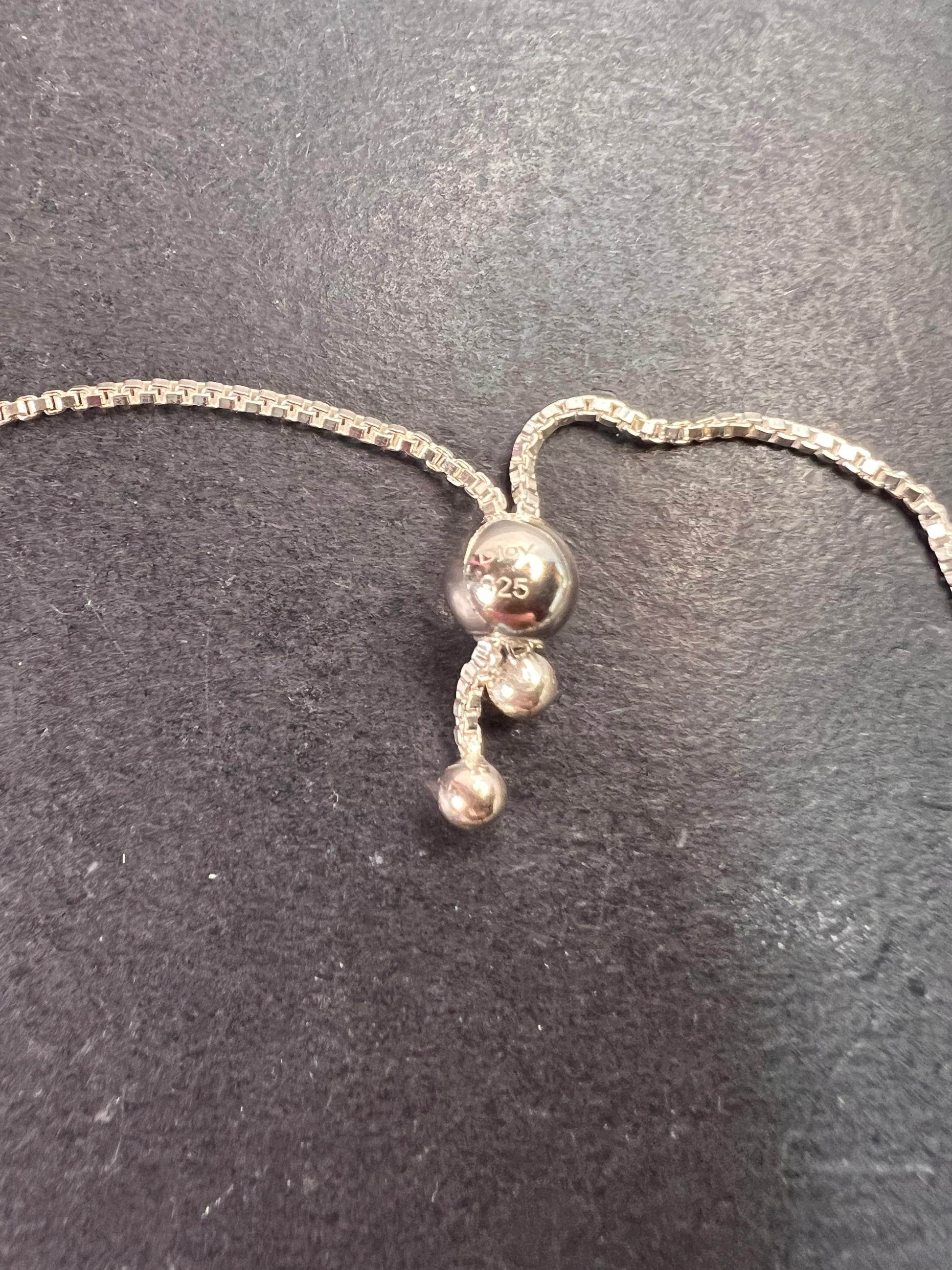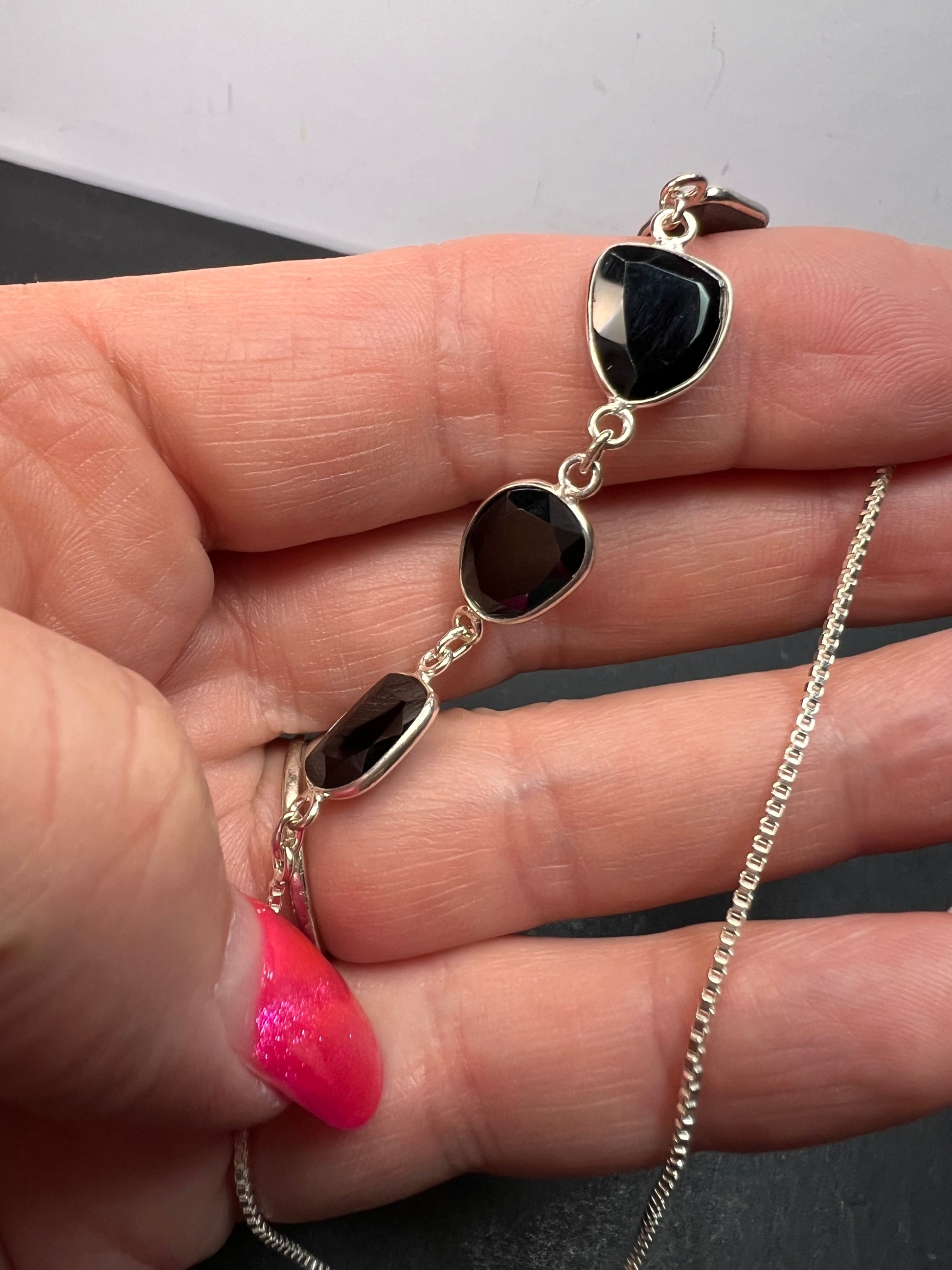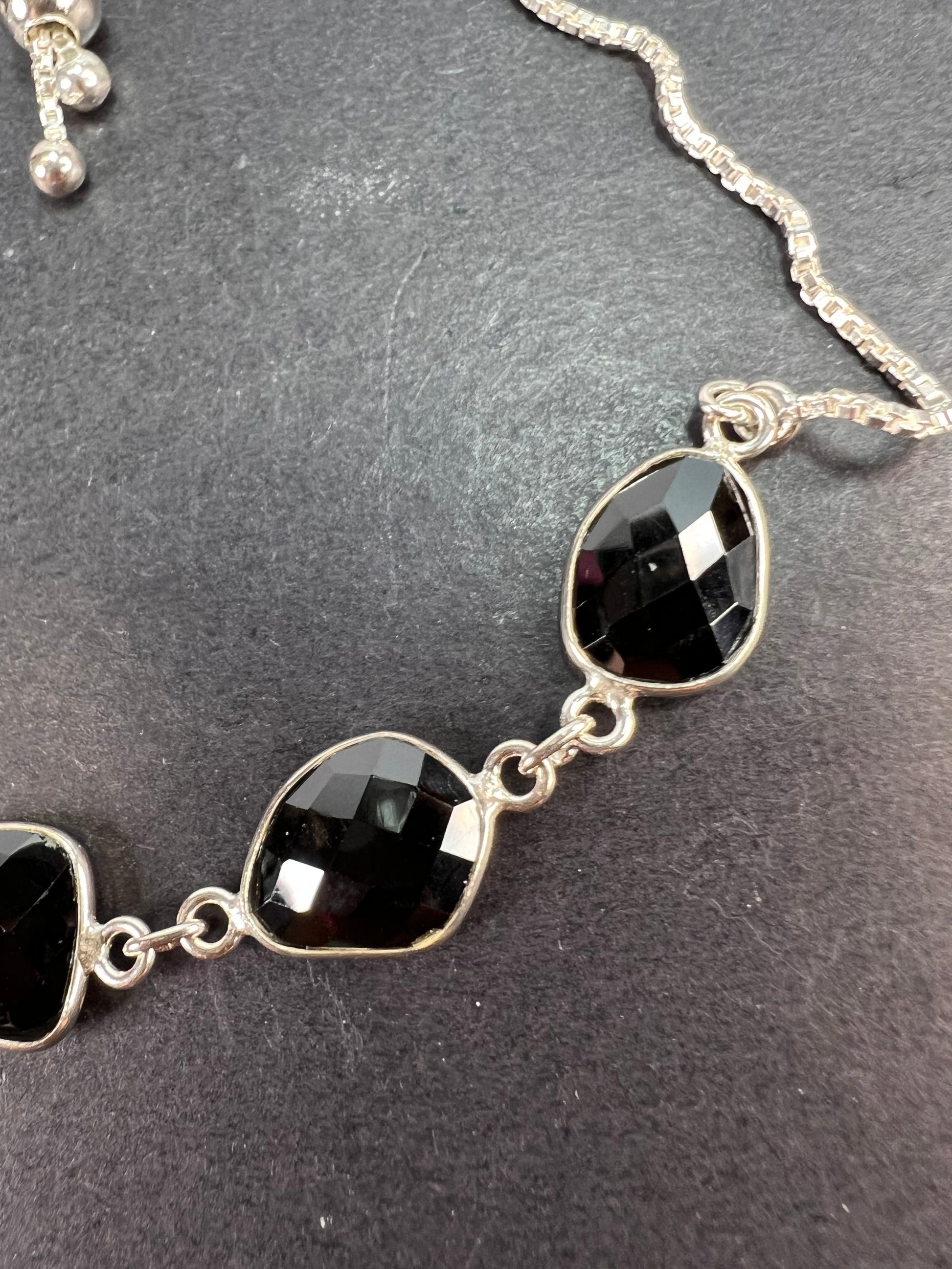 5 black spinel stones bezel set in a sterling silver setting. Bolo chain and slide are also sterling silver. Slide adjustment can be loosened or tightened with ease for bigger and smaller wrists. 10 inches max. 17.75 ctw