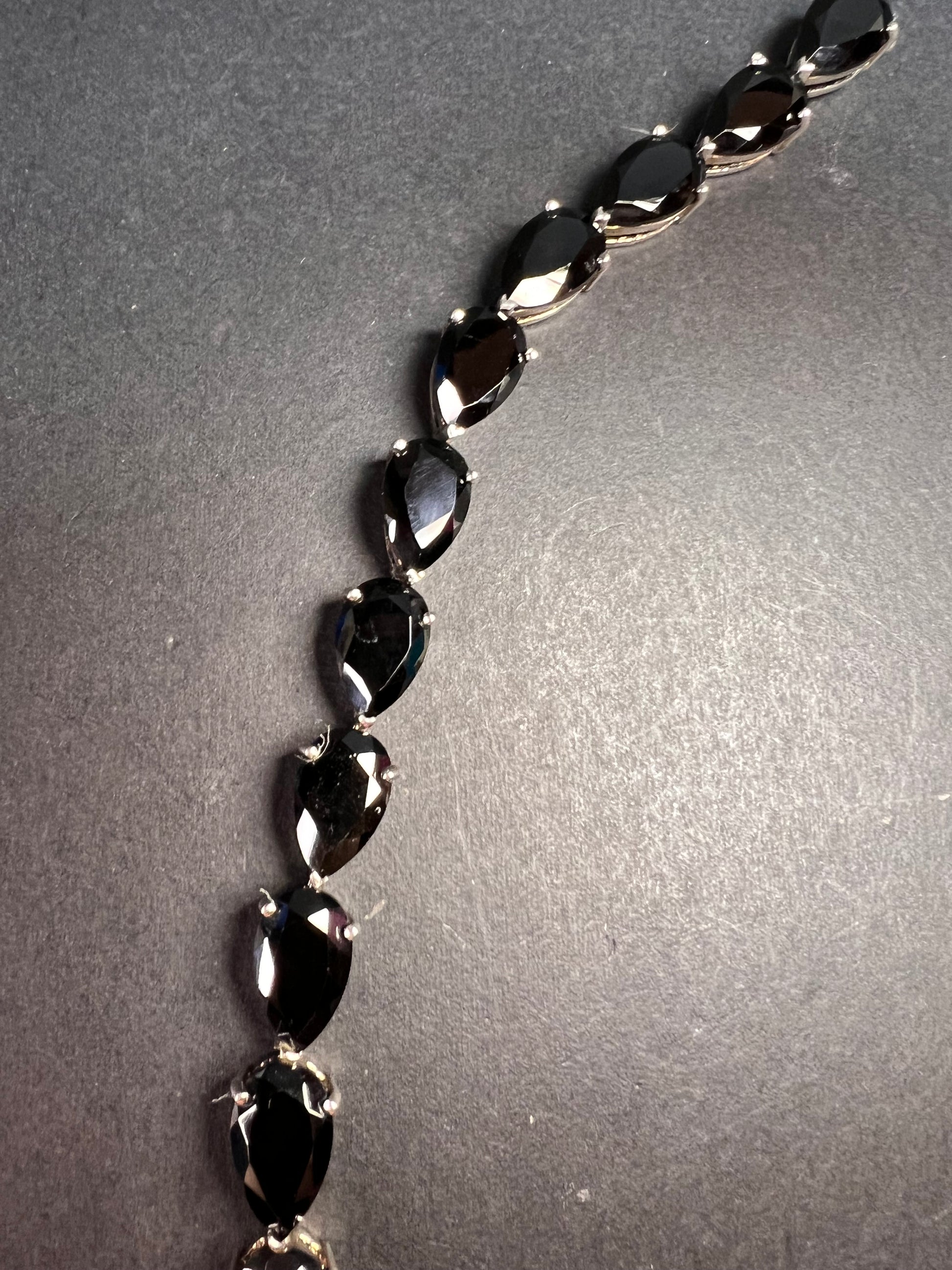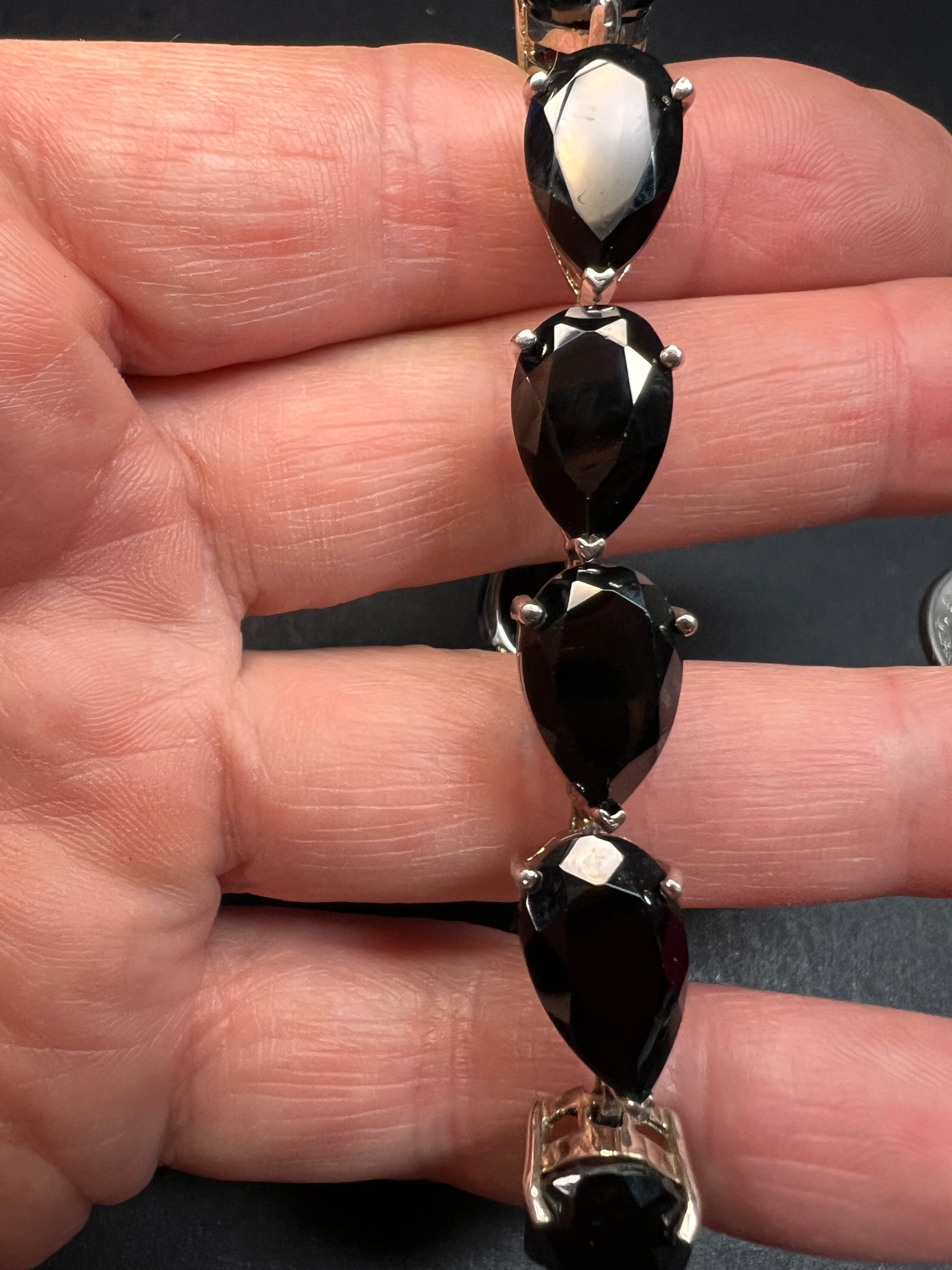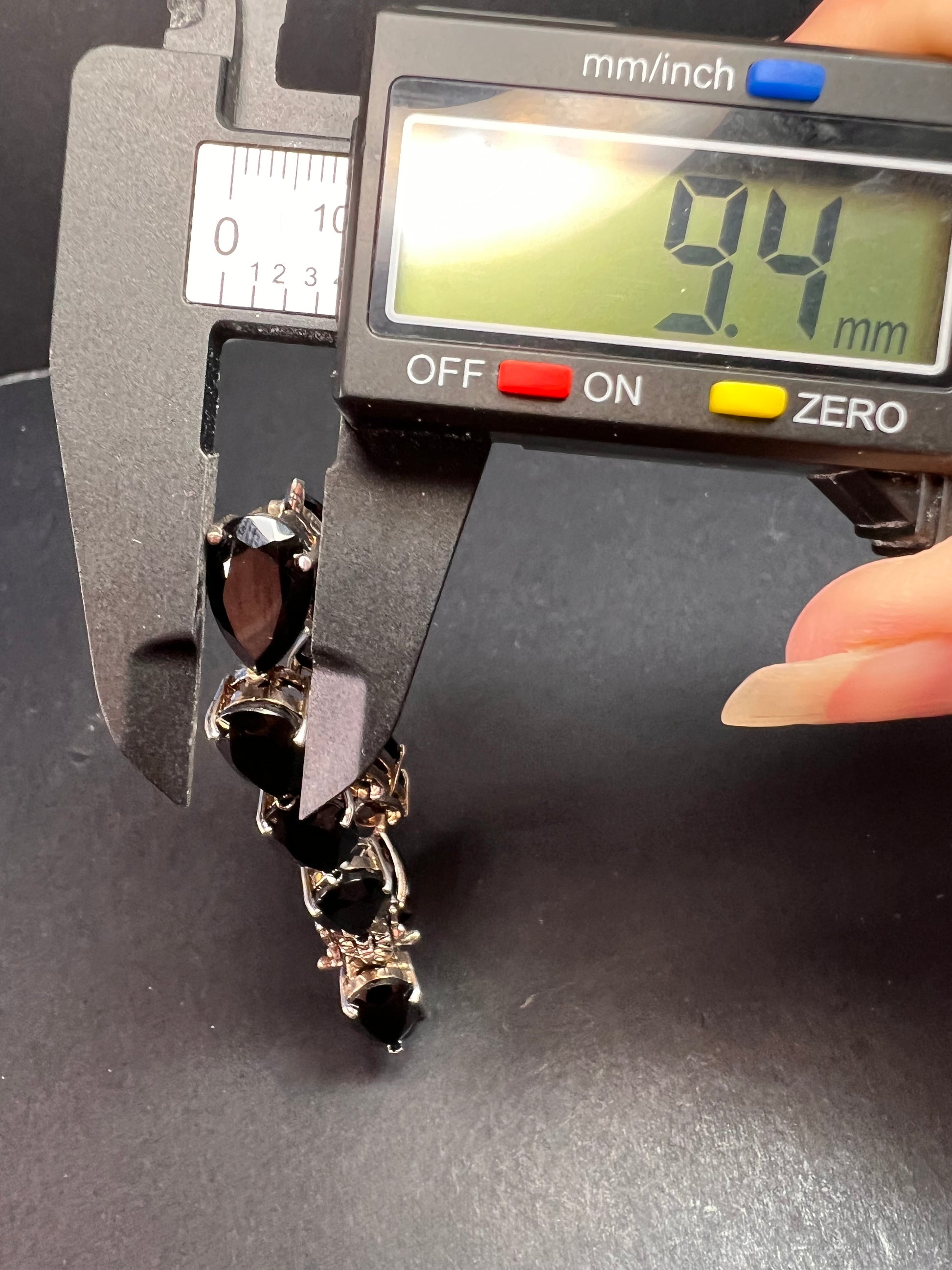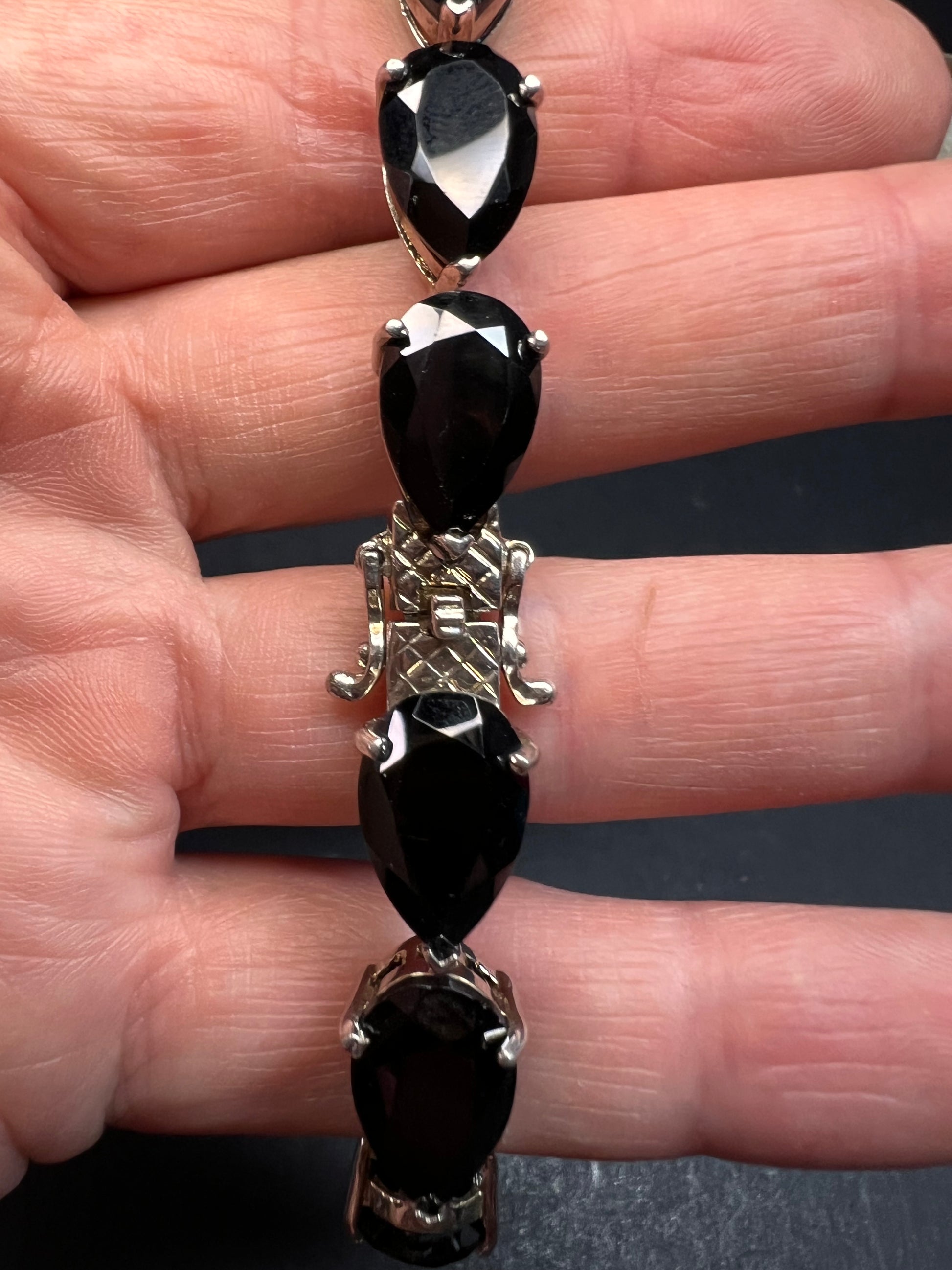 Thai black spinel pear shaped gemstones prong set in authentic 925 sterling silver that’s likely plated with platinum or possibly rhodium. Box clasp with two safety snaps in working order. Measures about 7.5 inches in length. Stamped STS for Chuck Clemency, 925. Total weight is 26.77 grams. Spinel gemstones measure roughly 9.5x13.5mm in setting.