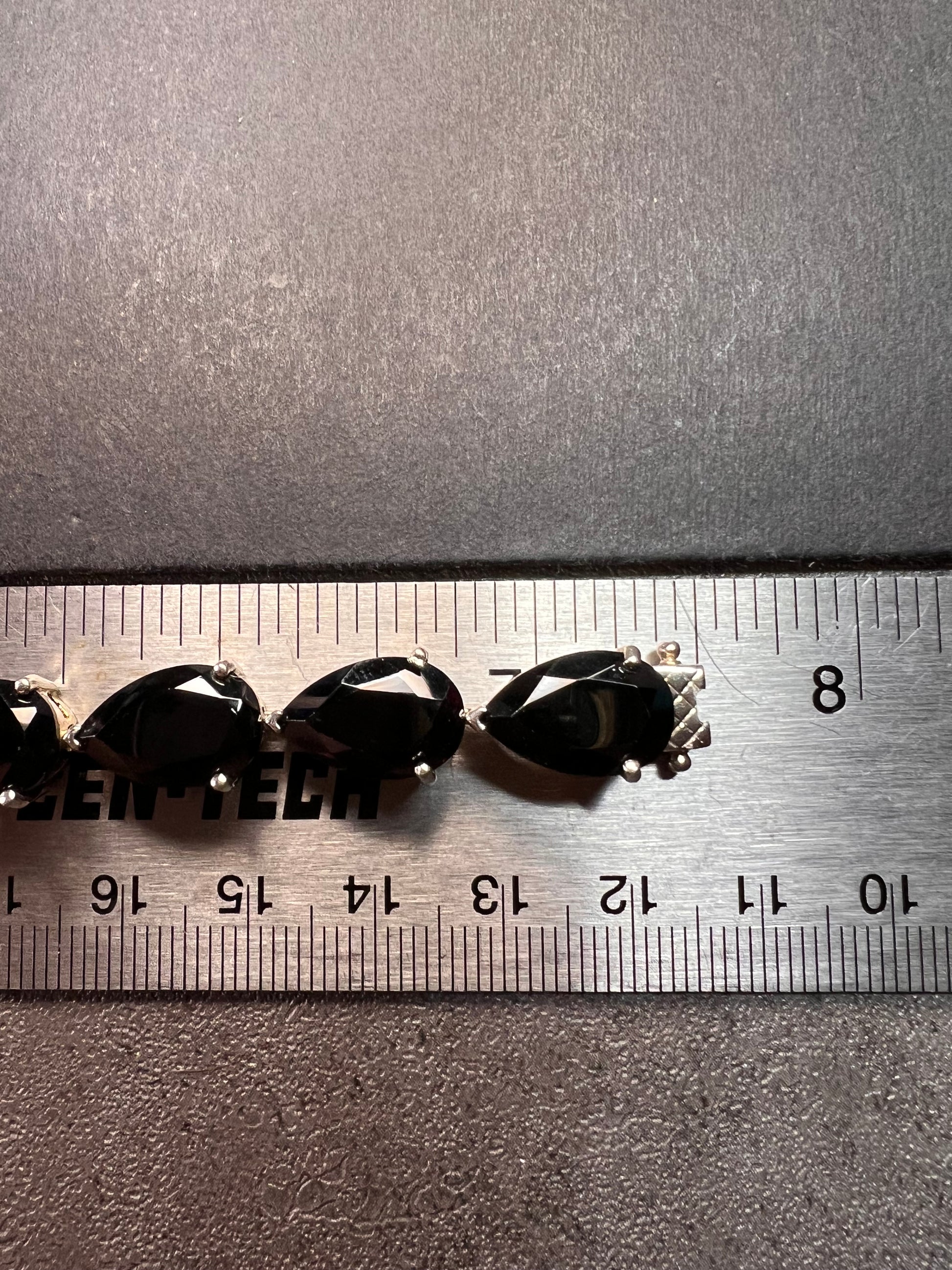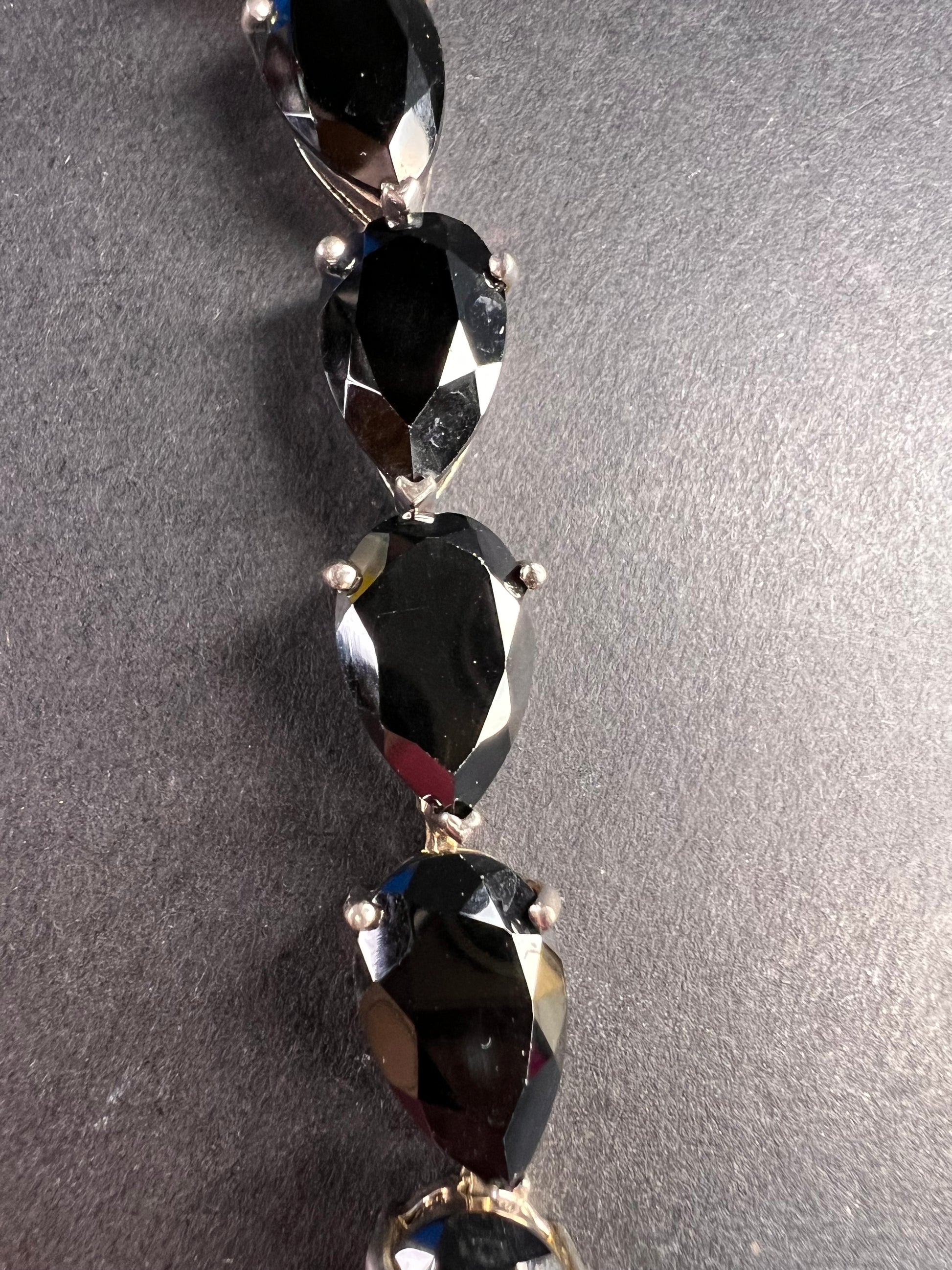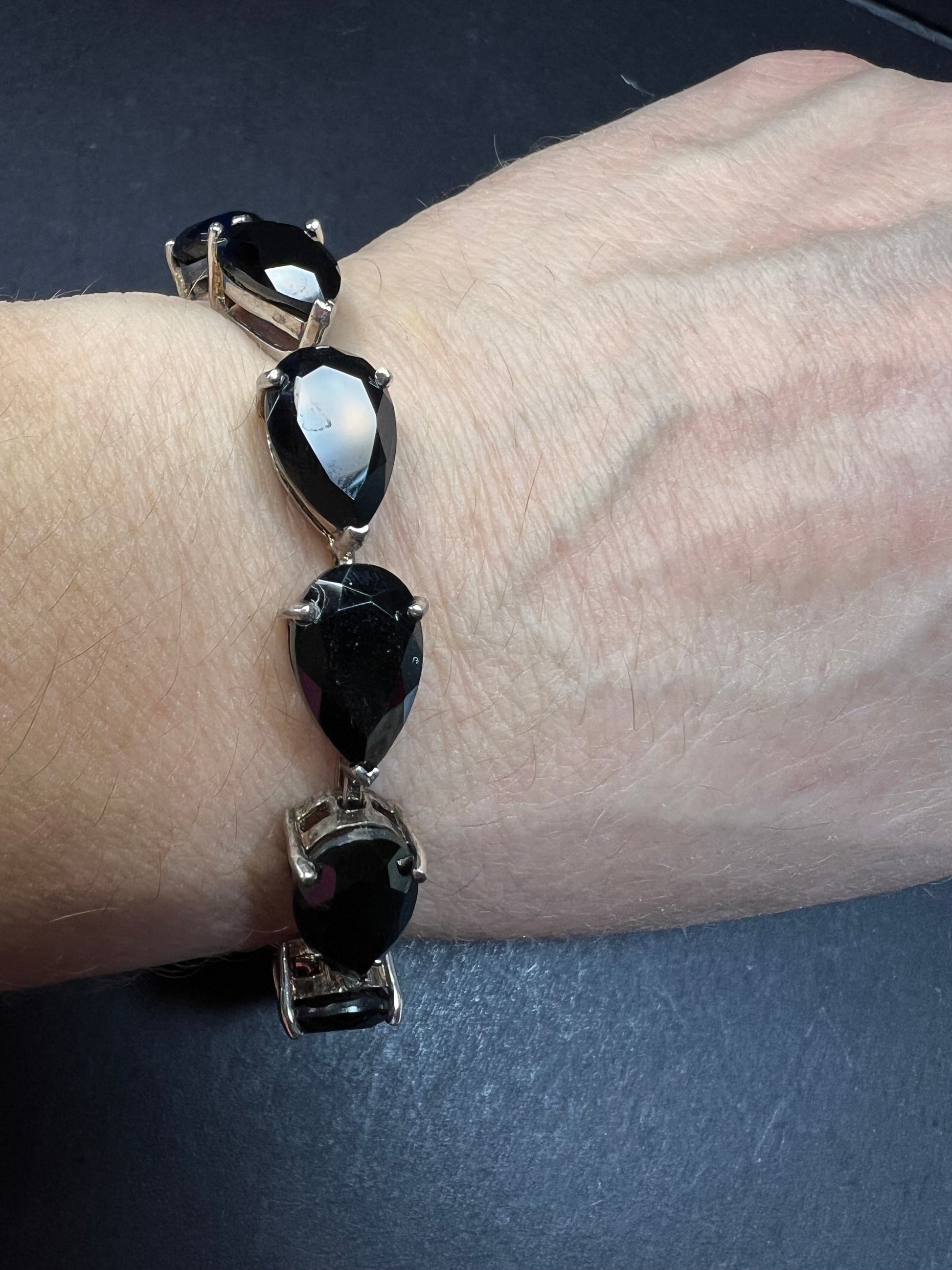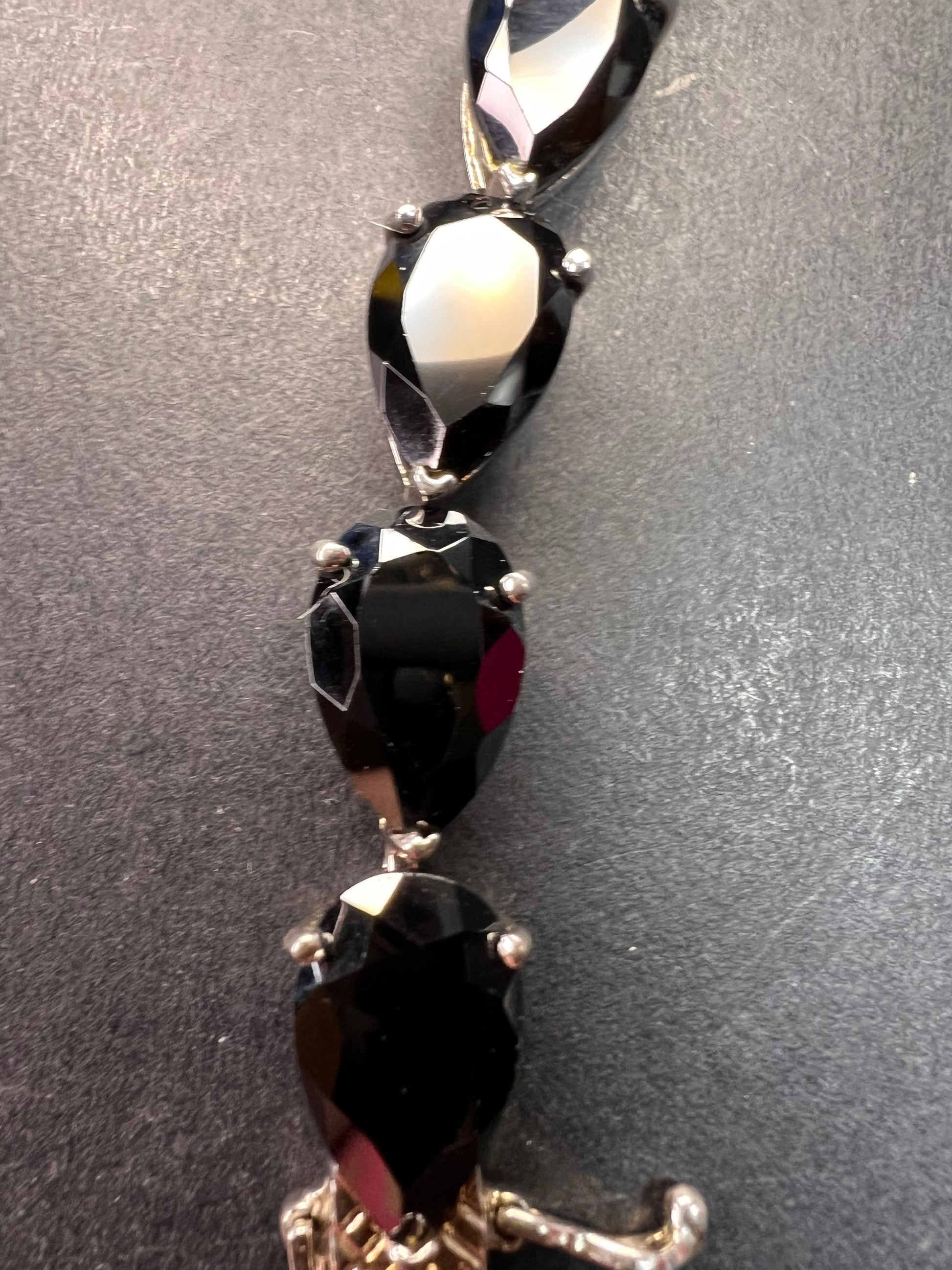 Thai black spinel pear shaped gemstones prong set in authentic 925 sterling silver that’s likely plated with platinum or possibly rhodium. Box clasp with two safety snaps in working order. Measures about 7.5 inches in length. Stamped STS for Chuck Clemency, 925. Total weight is 26.77 grams. Spinel gemstones measure roughly 9.5x13.5mm in setting.