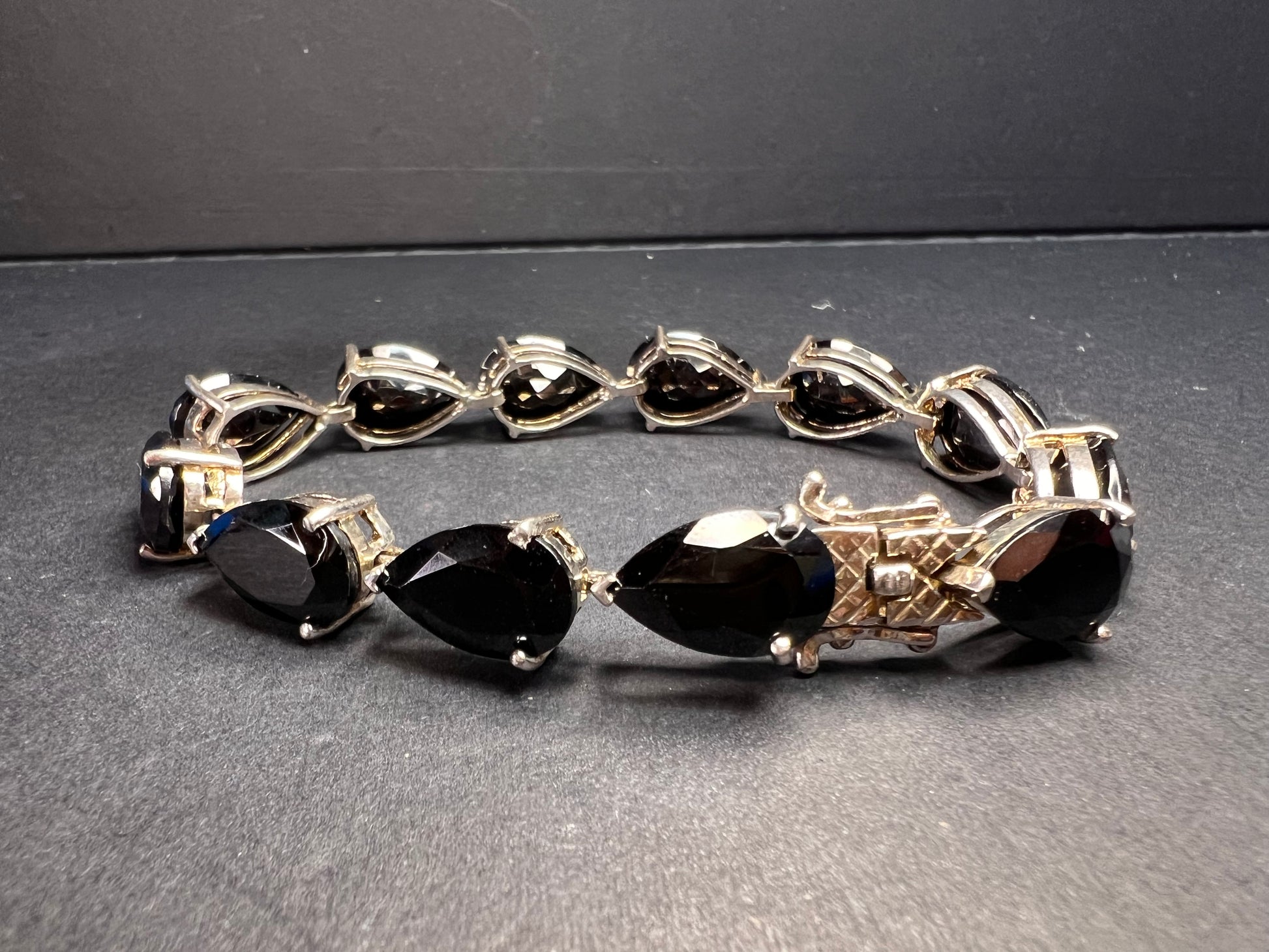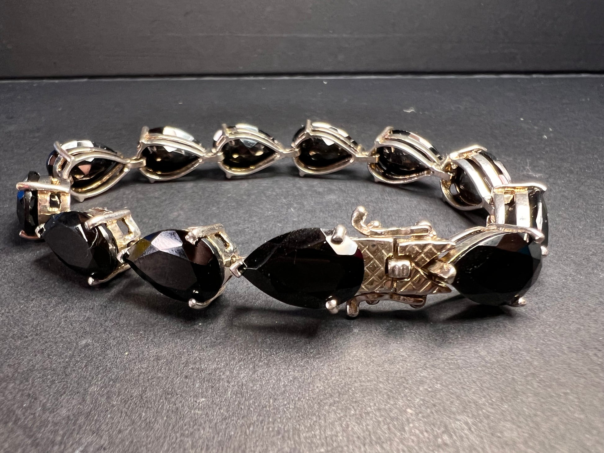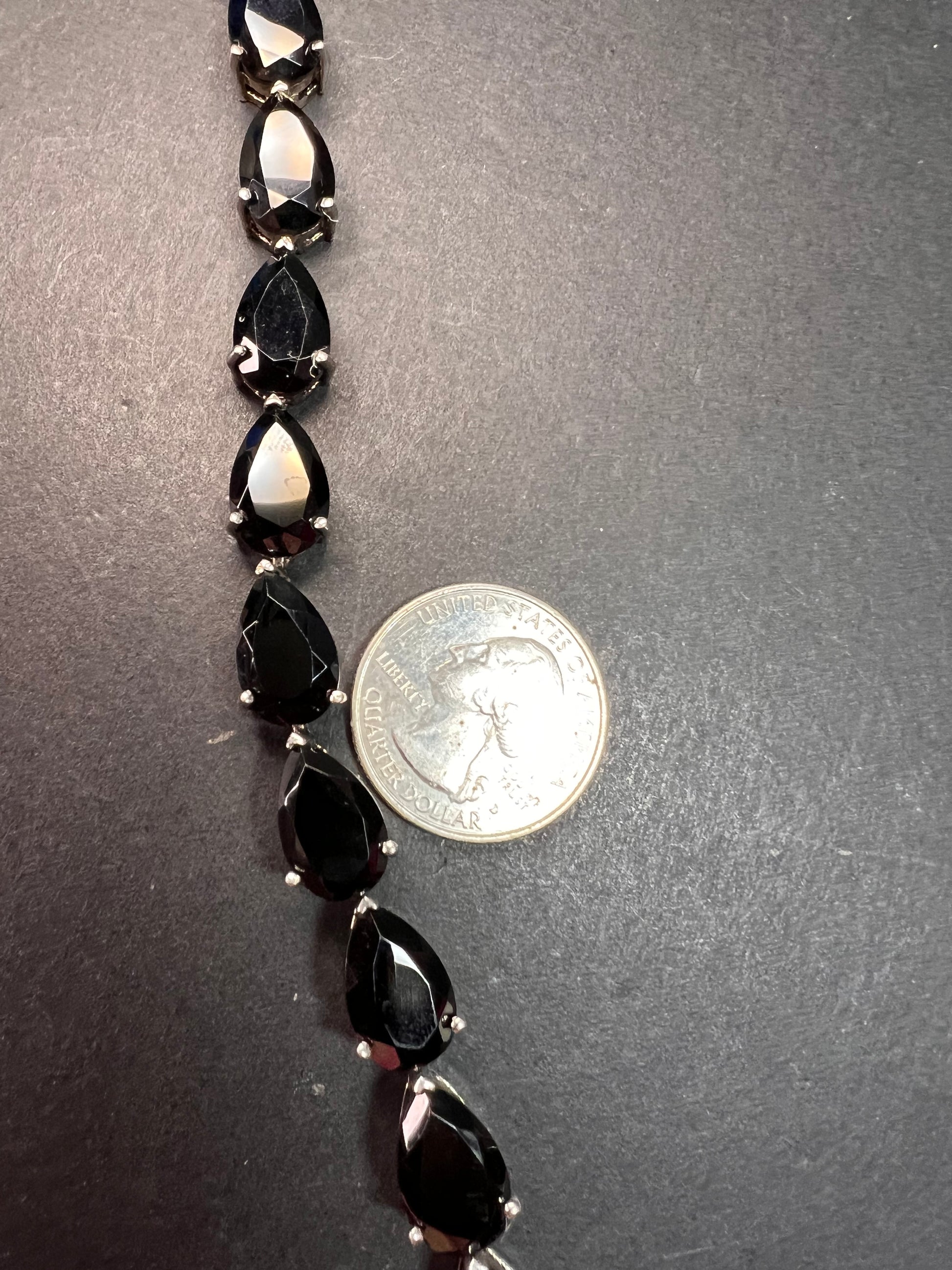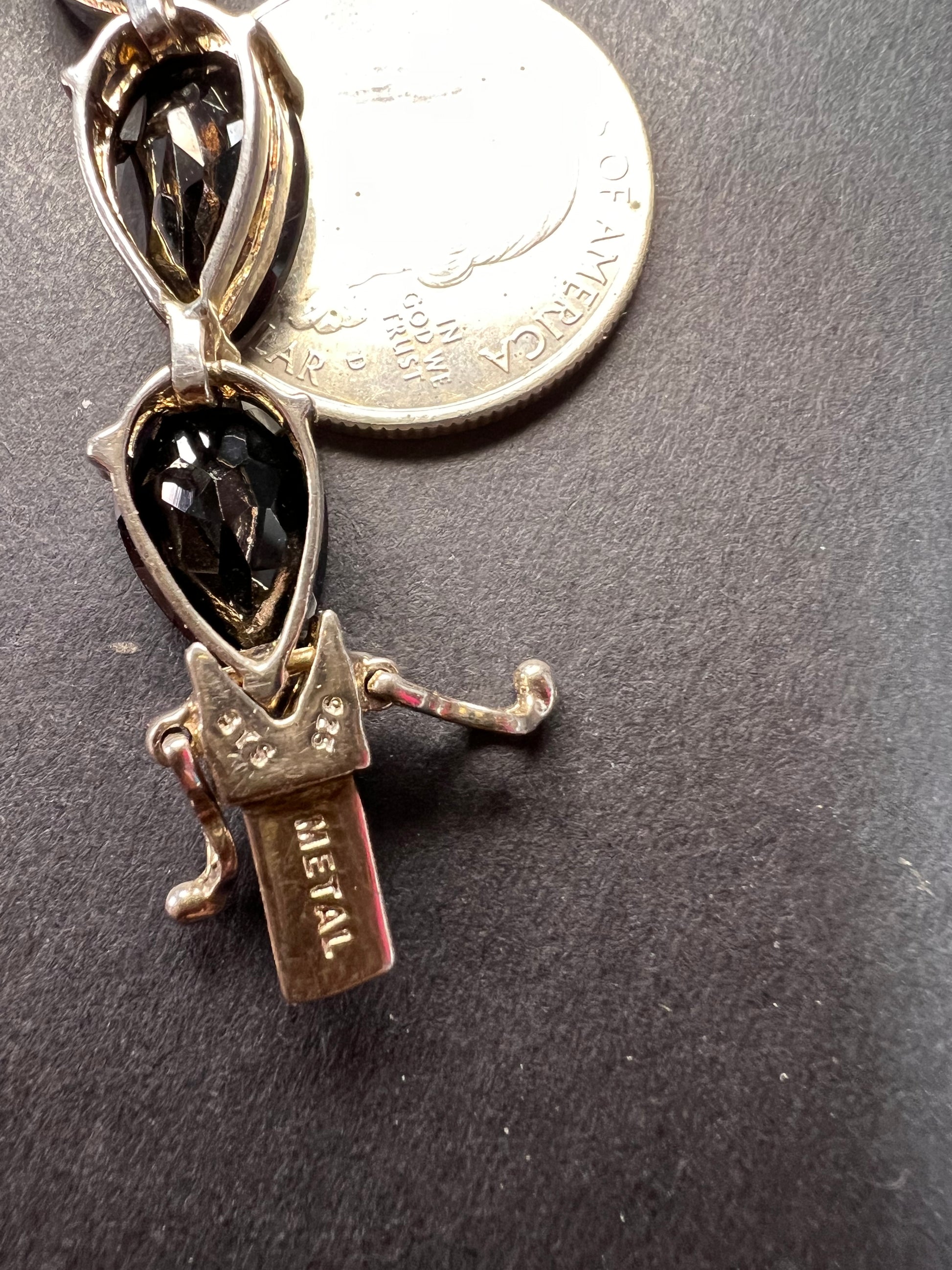 Thai black spinel pear shaped gemstones prong set in authentic 925 sterling silver that’s likely plated with platinum or possibly rhodium. Box clasp with two safety snaps in working order. Measures about 7.5 inches in length. Stamped STS for Chuck Clemency, 925. Total weight is 26.77 grams. Spinel gemstones measure roughly 9.5x13.5mm in setting.