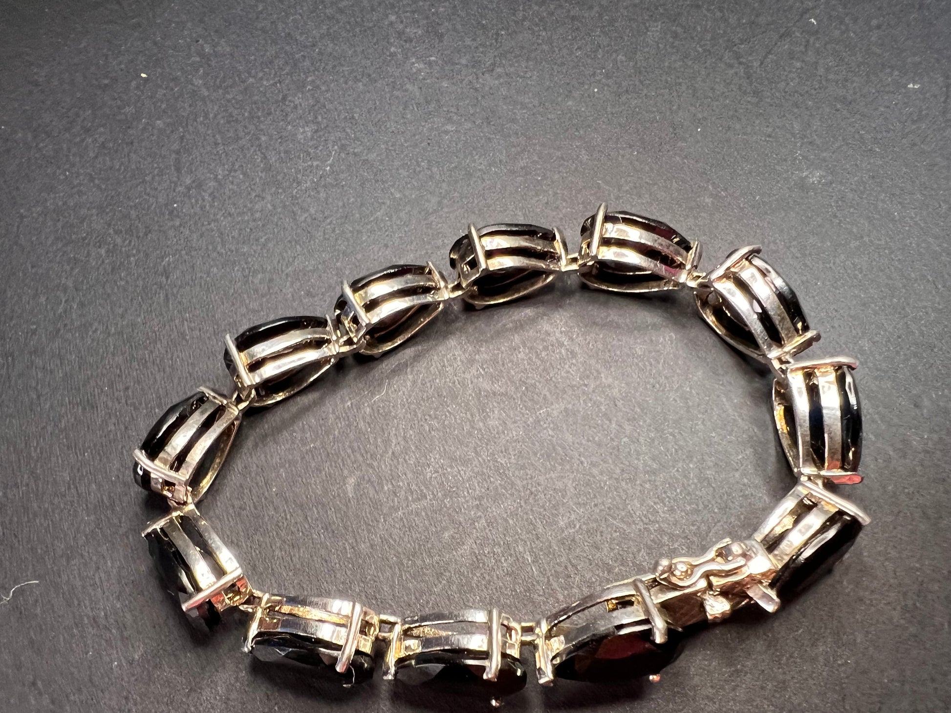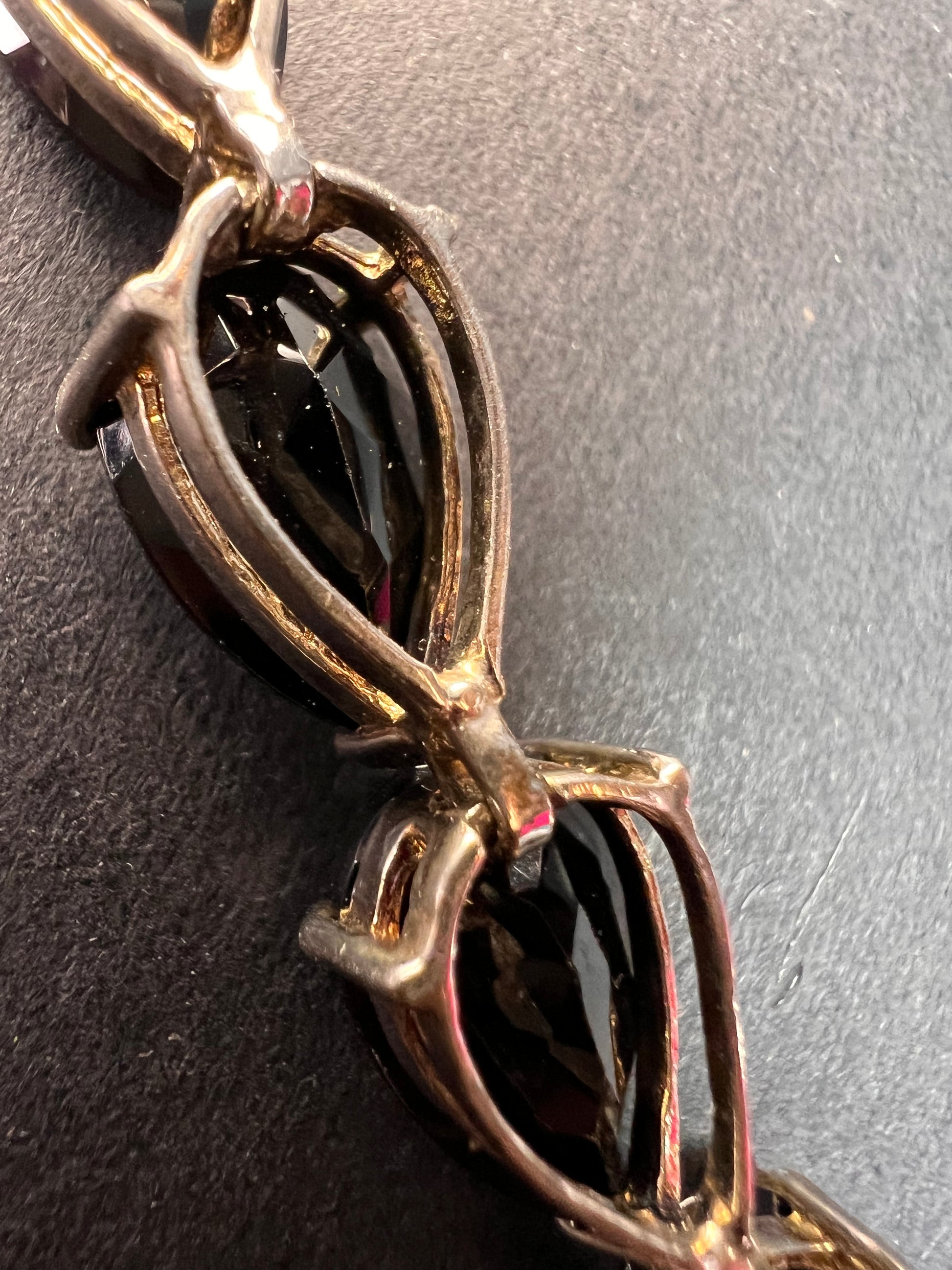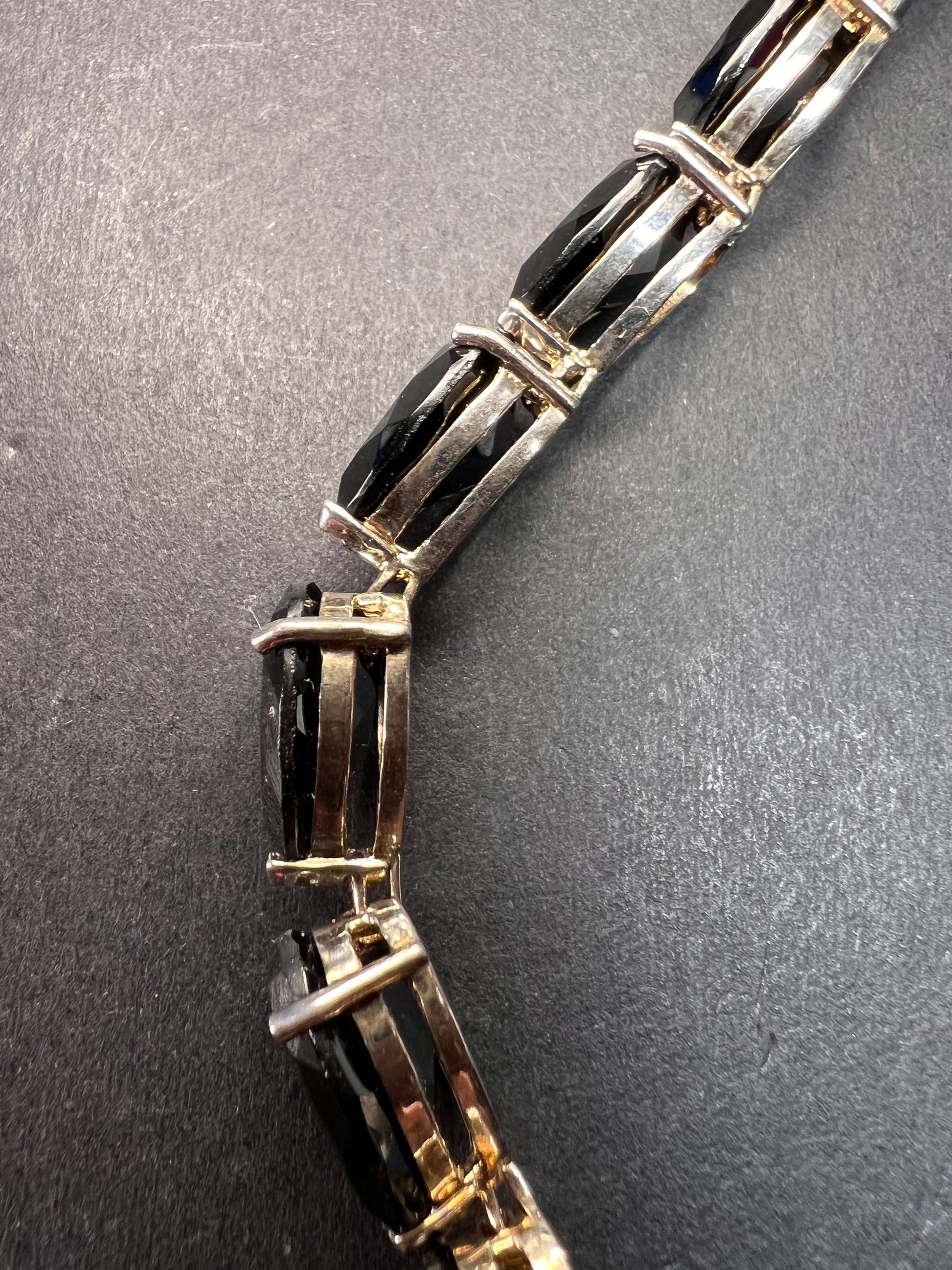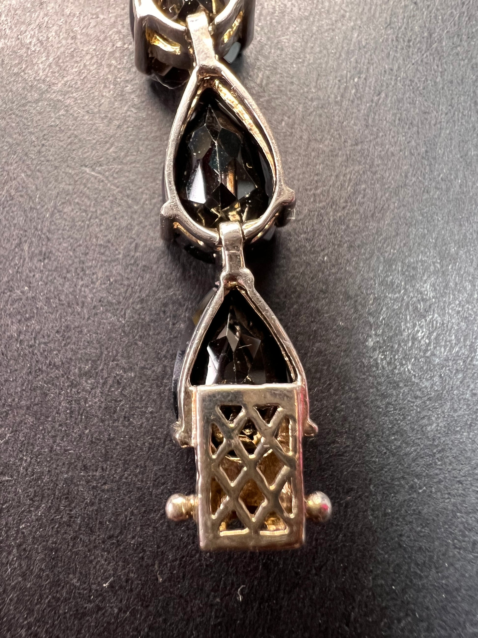 Thai black spinel pear shaped gemstones prong set in authentic 925 sterling silver that’s likely plated with platinum or possibly rhodium. Box clasp with two safety snaps in working order. Measures about 7.5 inches in length. Stamped STS for Chuck Clemency, 925. Total weight is 26.77 grams. Spinel gemstones measure roughly 9.5x13.5mm in setting.