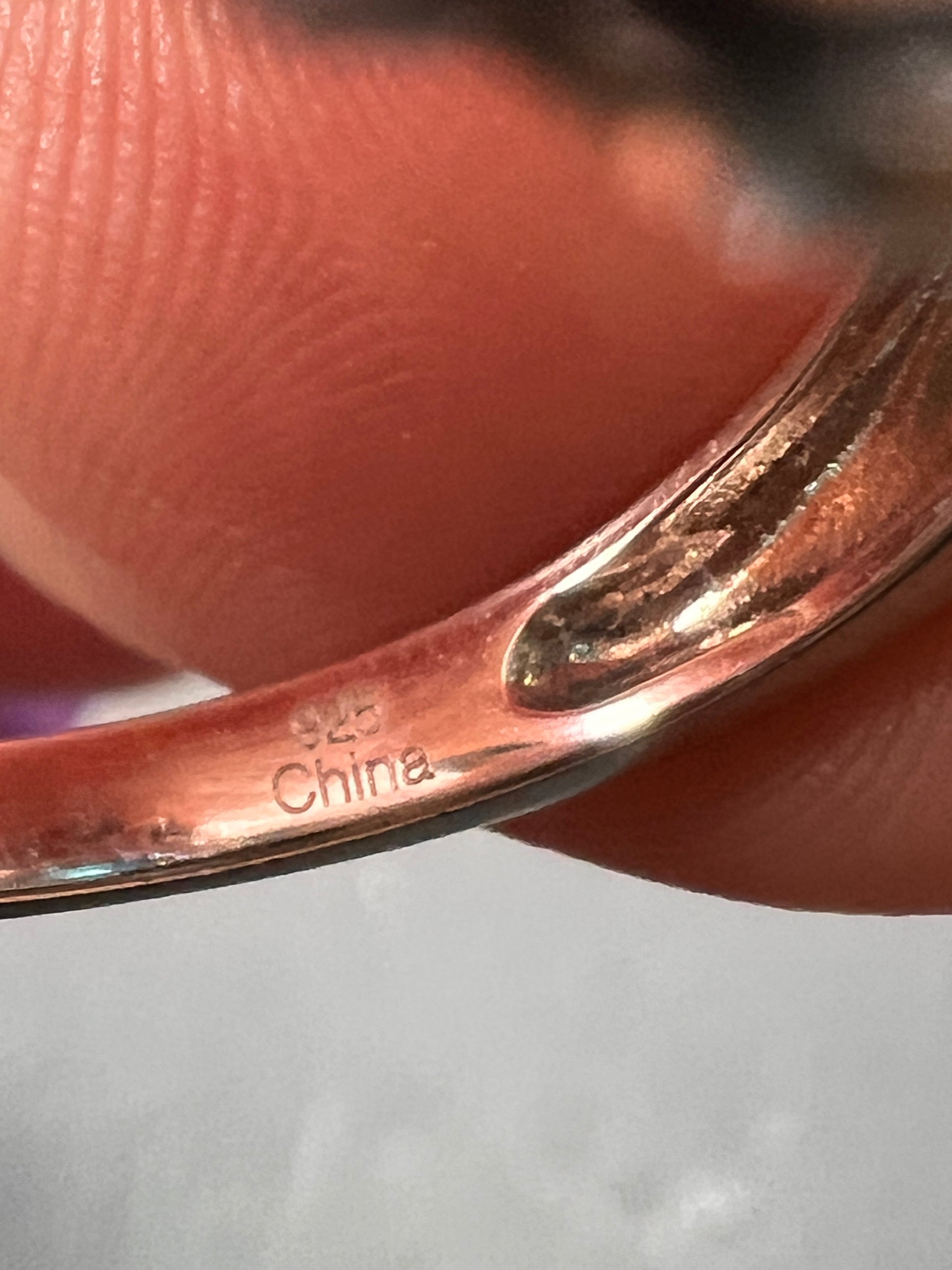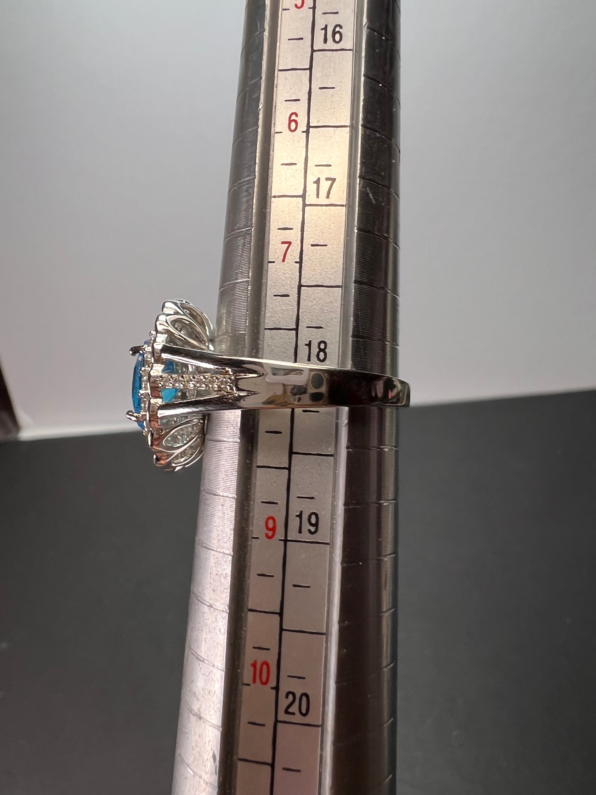 Stones test as cubic zirconia but the big blue stone could possibly be some other kind of gemstone. Priced accordingly. Measures a size 8. Rhodium plated over sterling silver.
