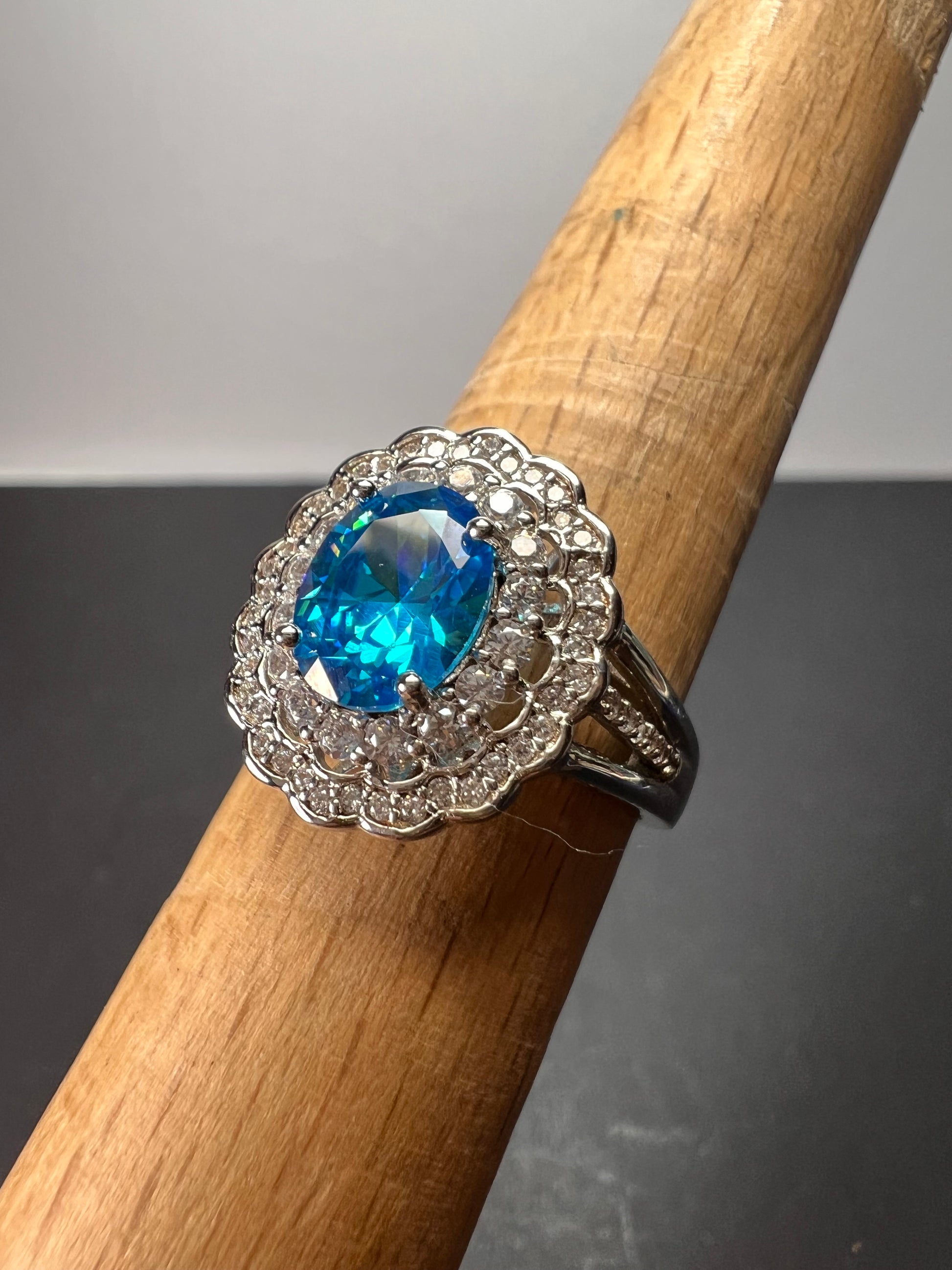 Blue and white CZ halo sterling silver ring size 8