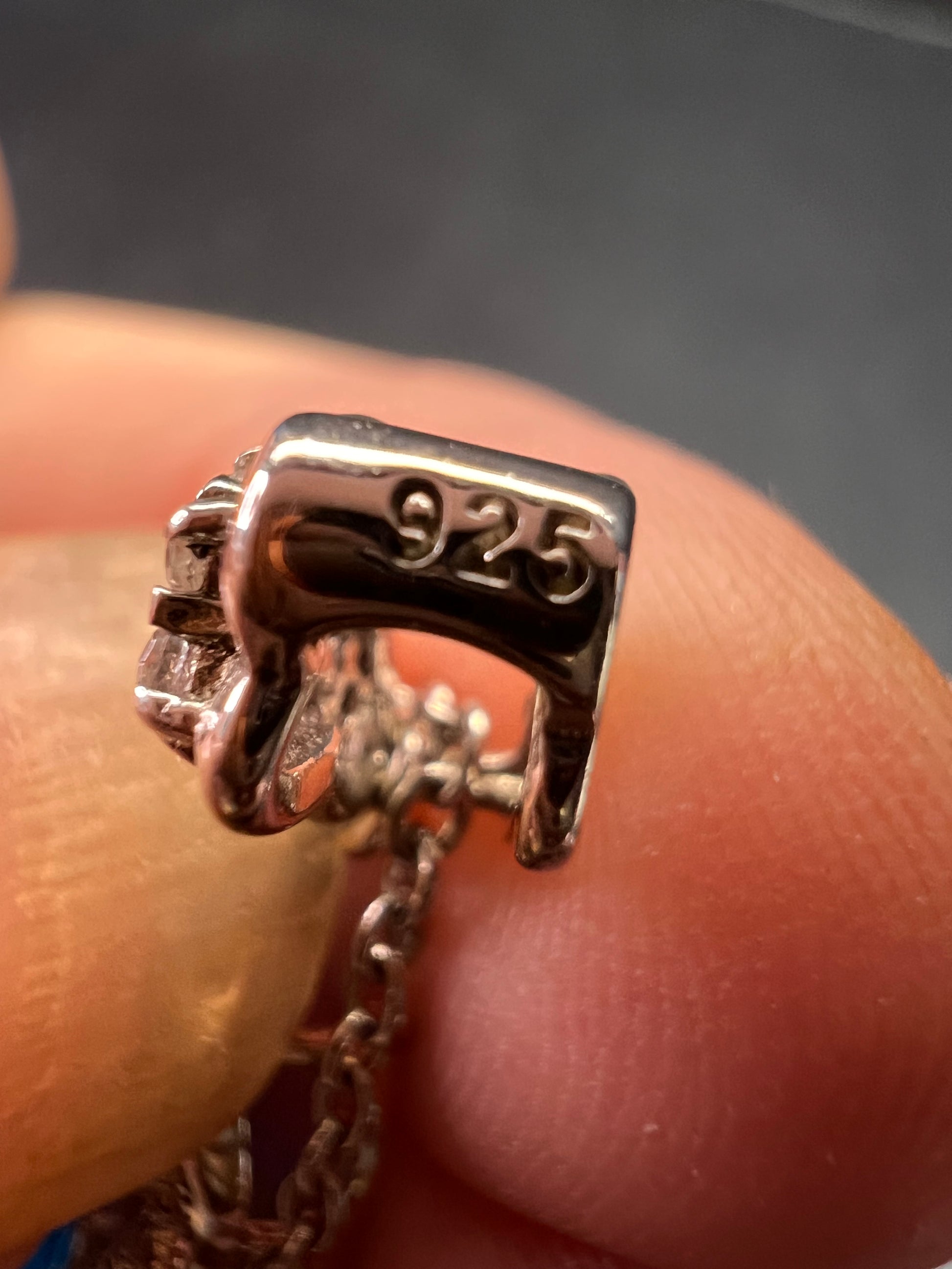 Deep aqua blue cubic zirconia oval cut gemstone prong set in an authentic 925 sterling silver halo setting surrounded by white / colorless cubic zirconia accent stones. Pendant is plated with rhodium over sterling silver. Chain measures 20 inches and is not sterling silver but made of stainless steel with a lobster claw clasp.