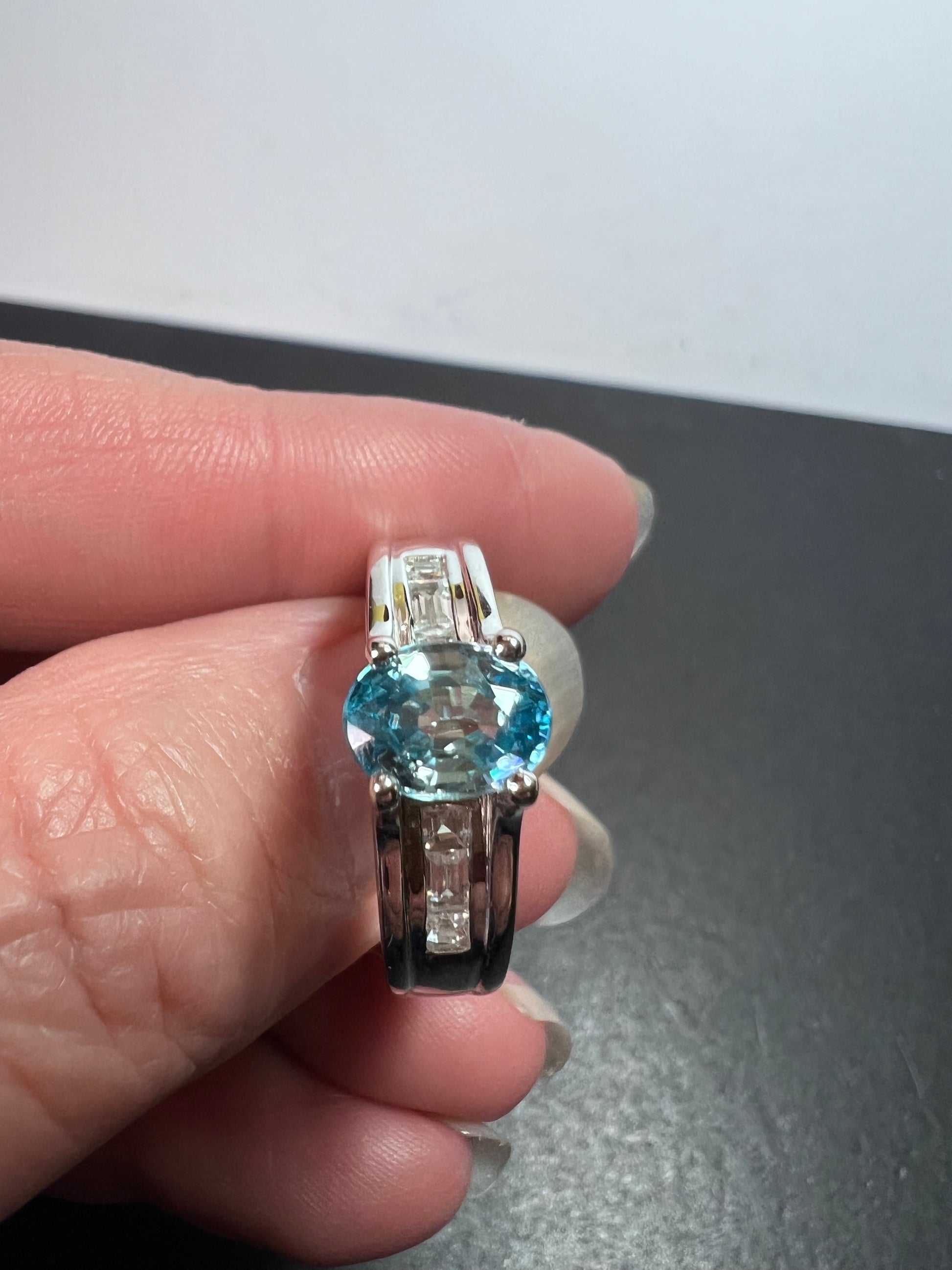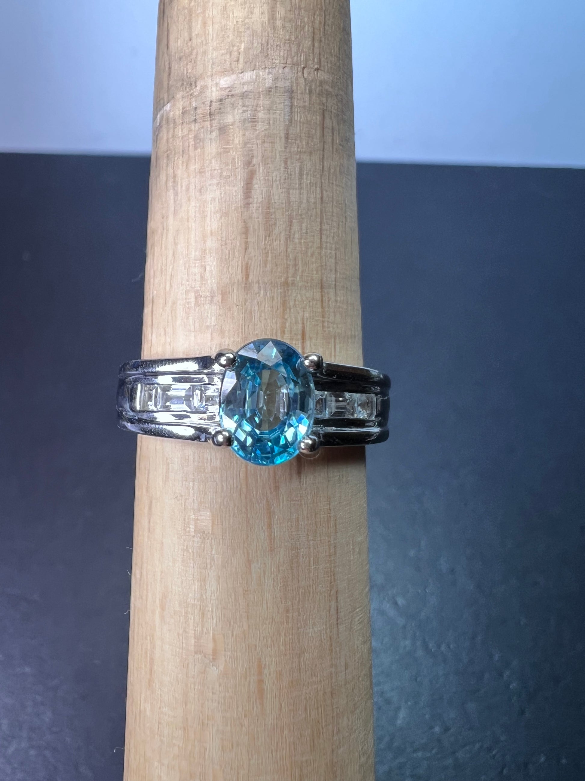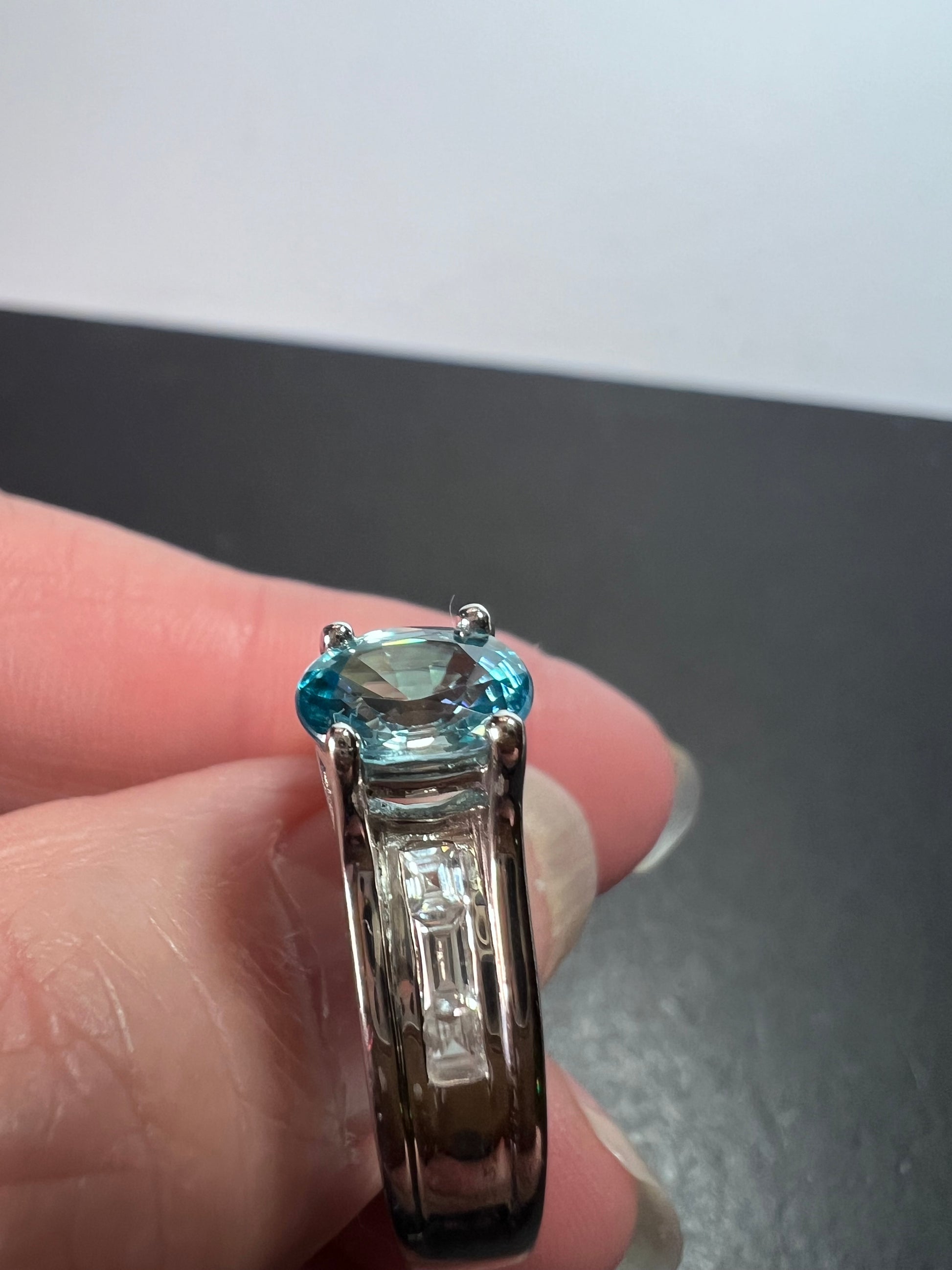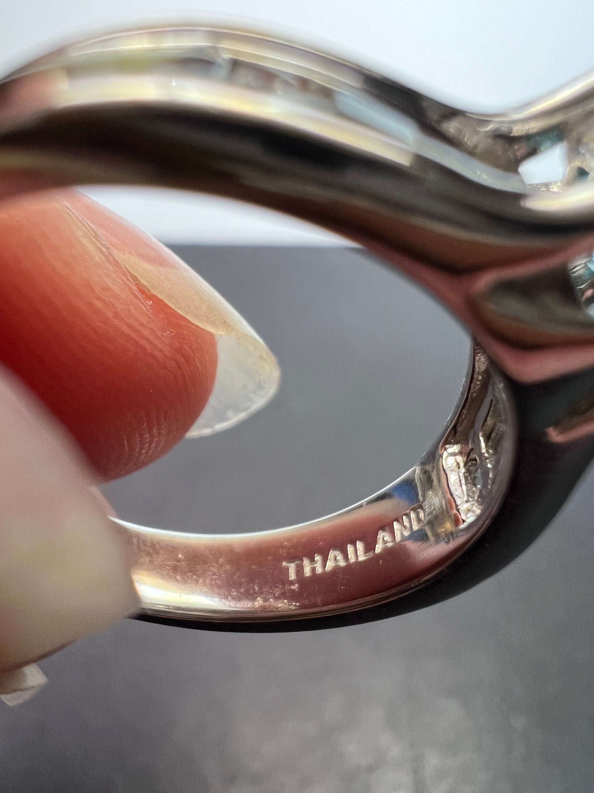 Stones test as blue and white zircon. Prong set in either rhodium or platinum plated over sterling silver. Feels more like platinum. Measures a size 10. Not resizeable. 925 Thailand.