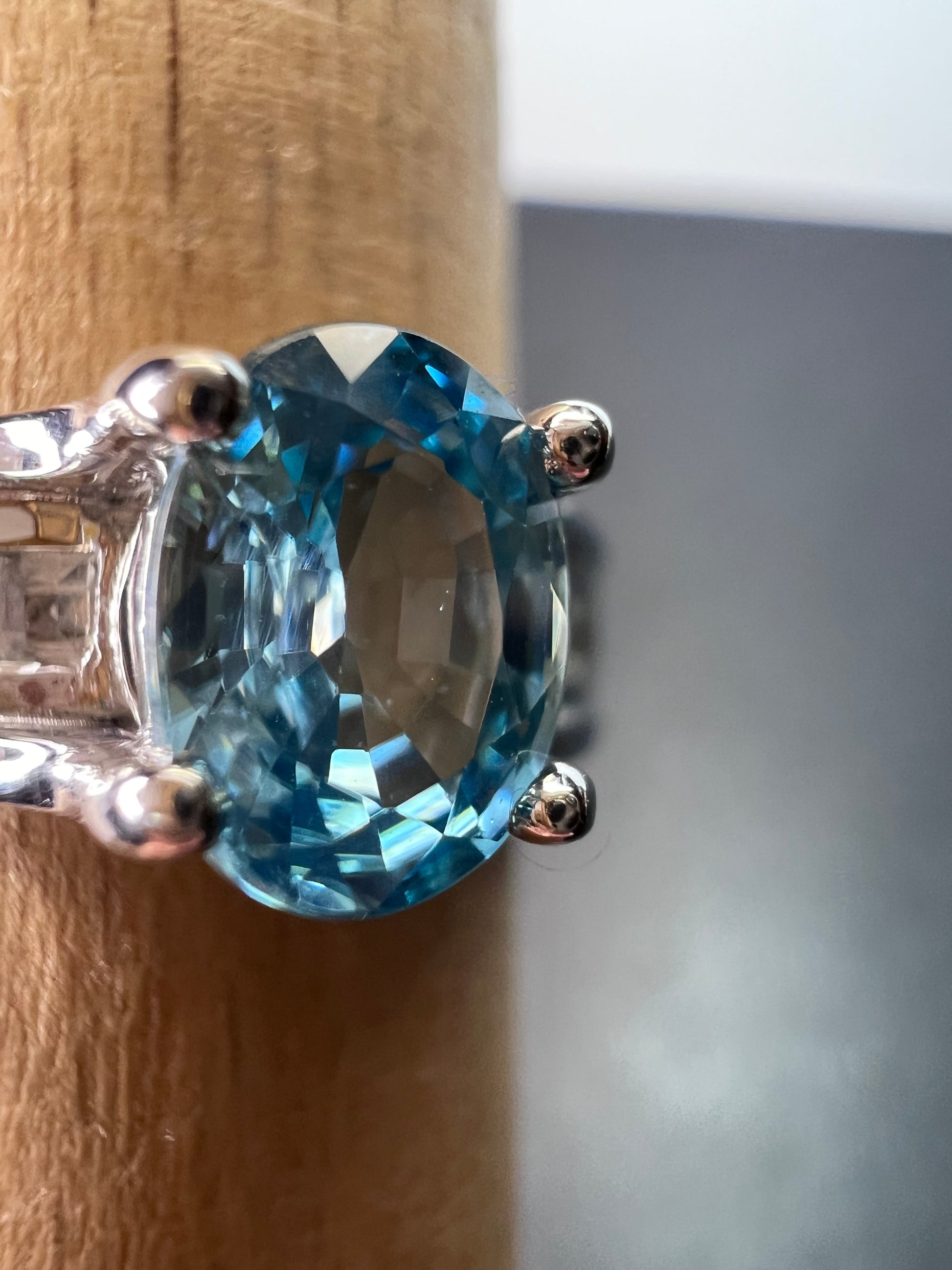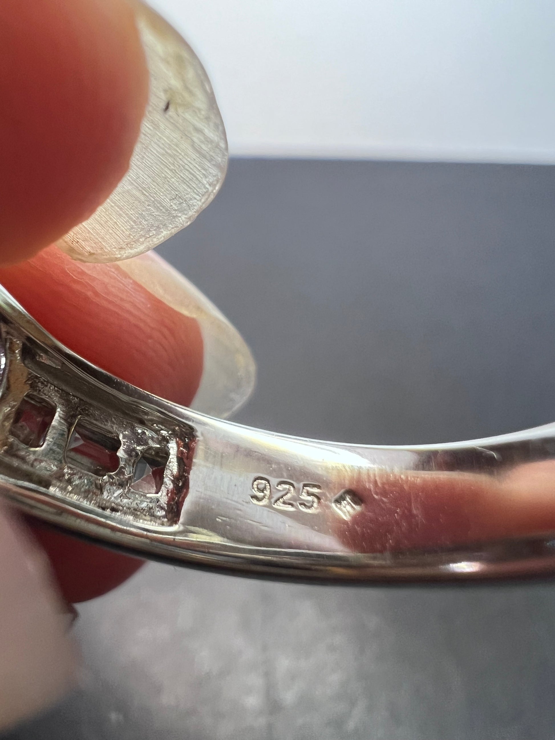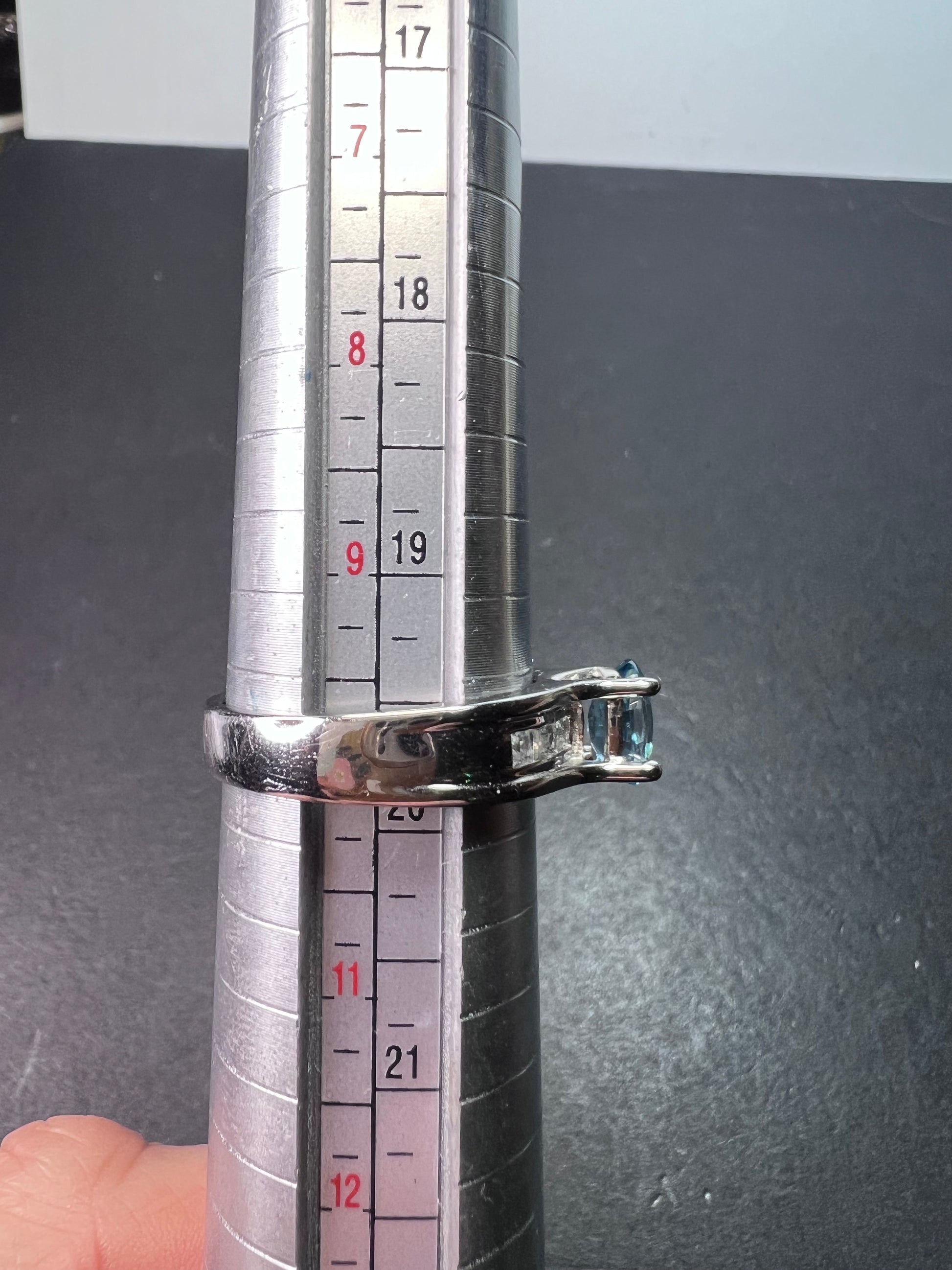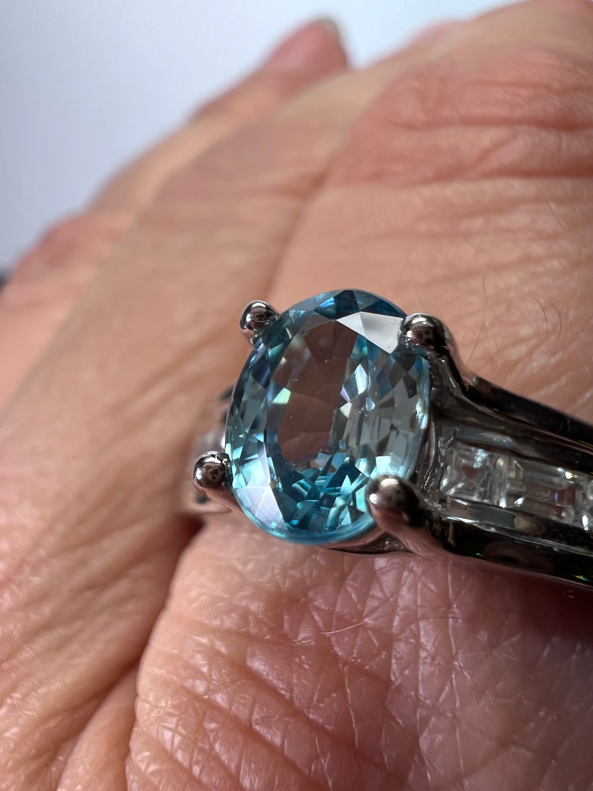 Stones test as blue and white zircon. Prong set in either rhodium or platinum plated over sterling silver. Feels more like platinum. Measures a size 10. Not resizeable. 925 Thailand.